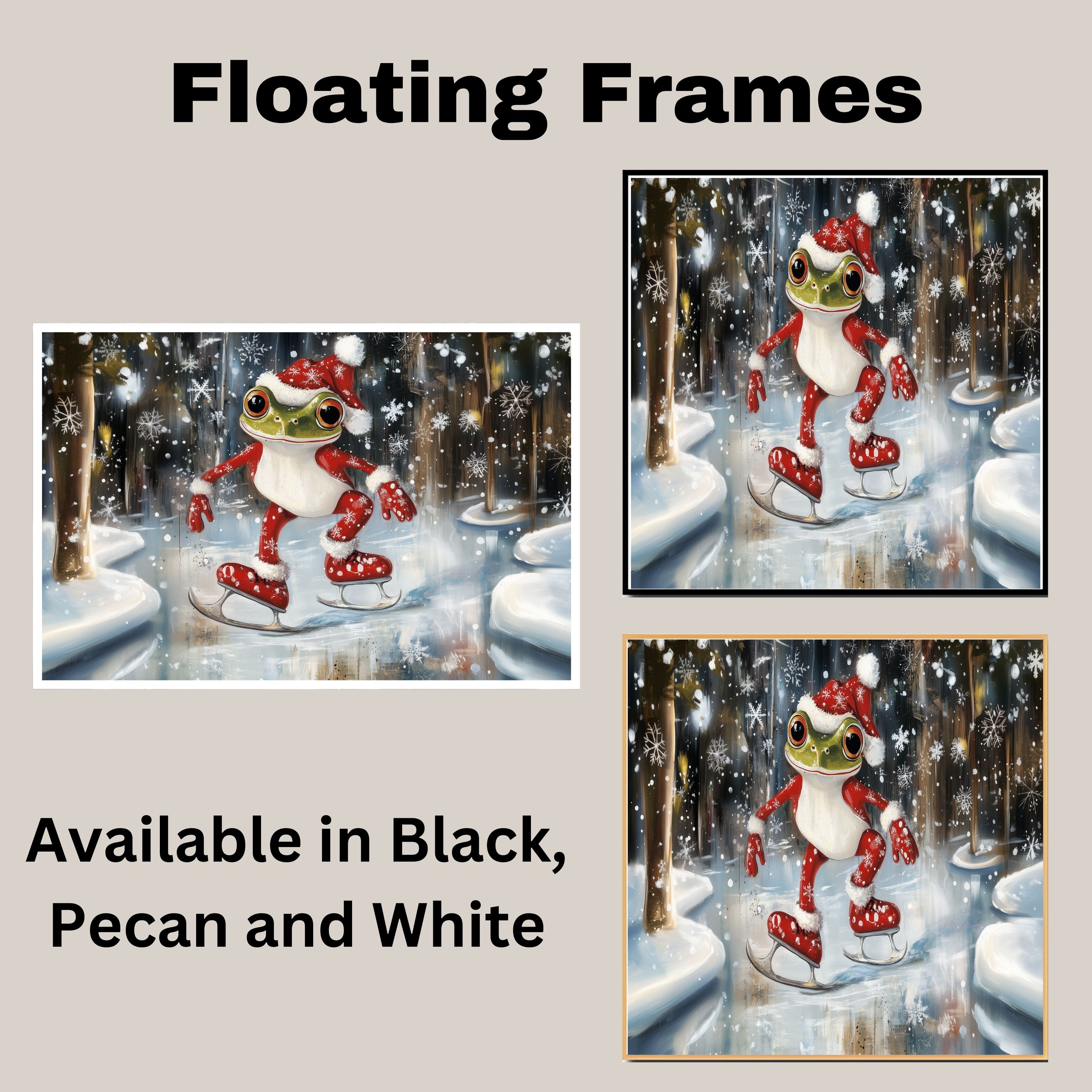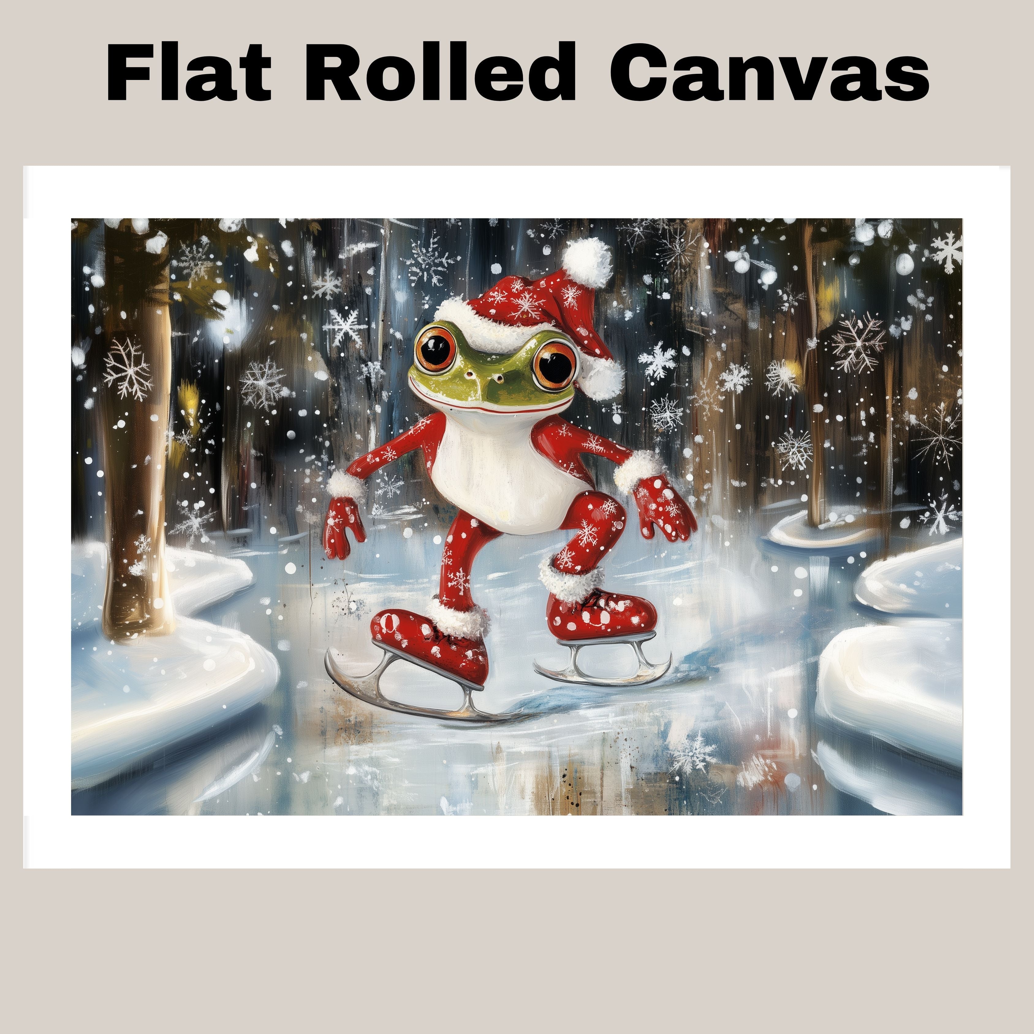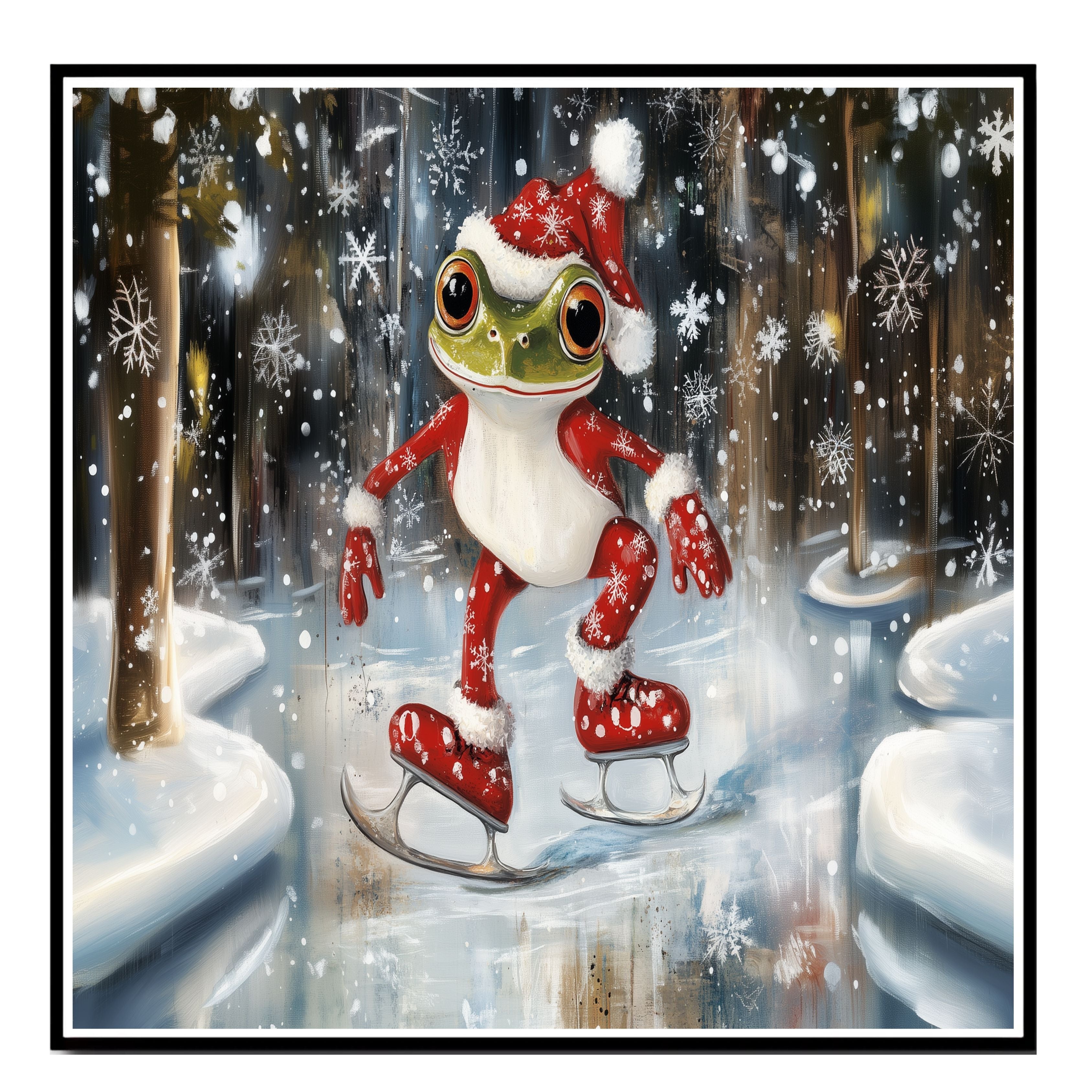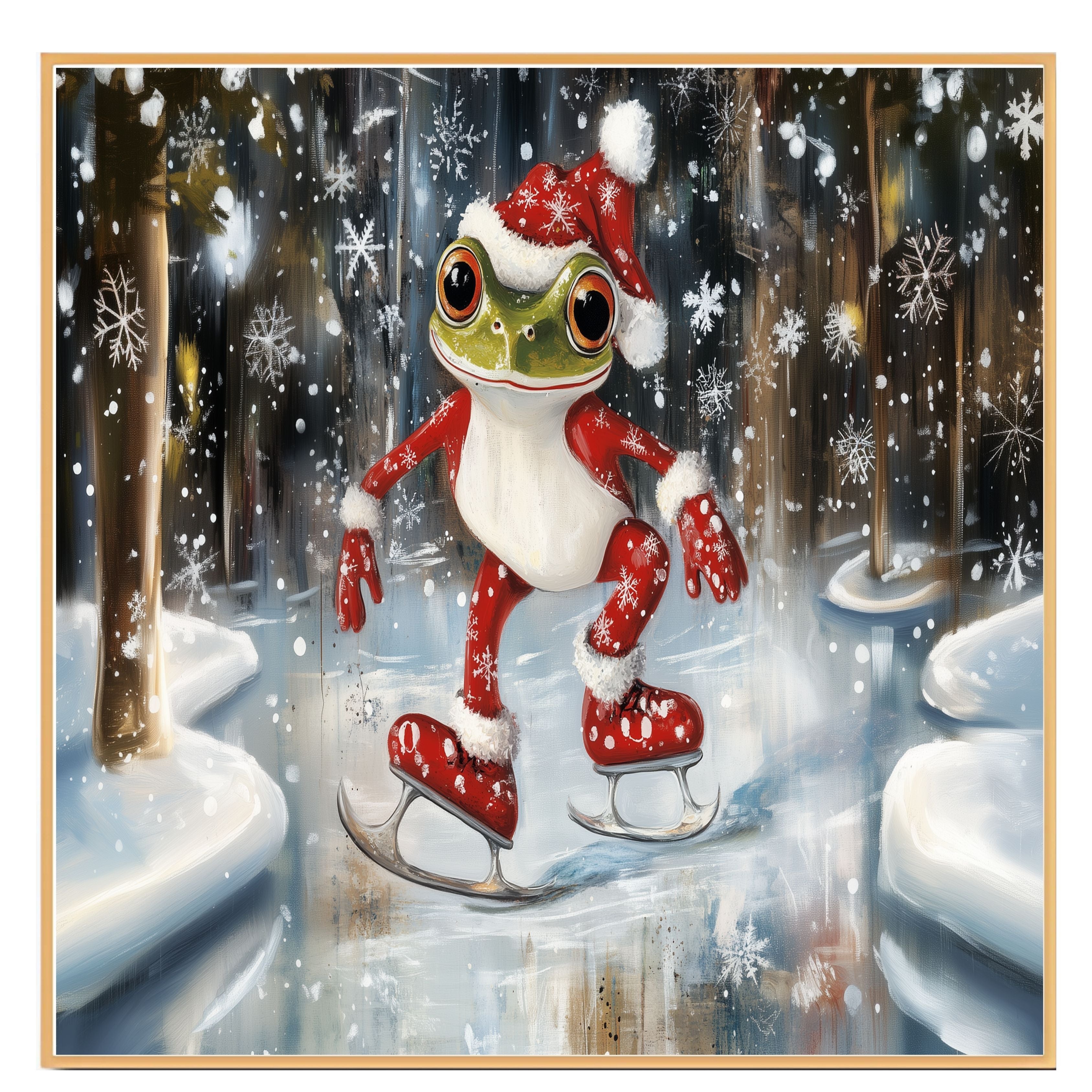 This delightful illustration features a cheerful green frog dressed in a cozy Santa suit, gliding across an icy pond. With snowflakes dancing around, it brings festive joy and whimsical winter vibes, perfect for spreading holiday cheer in any room.