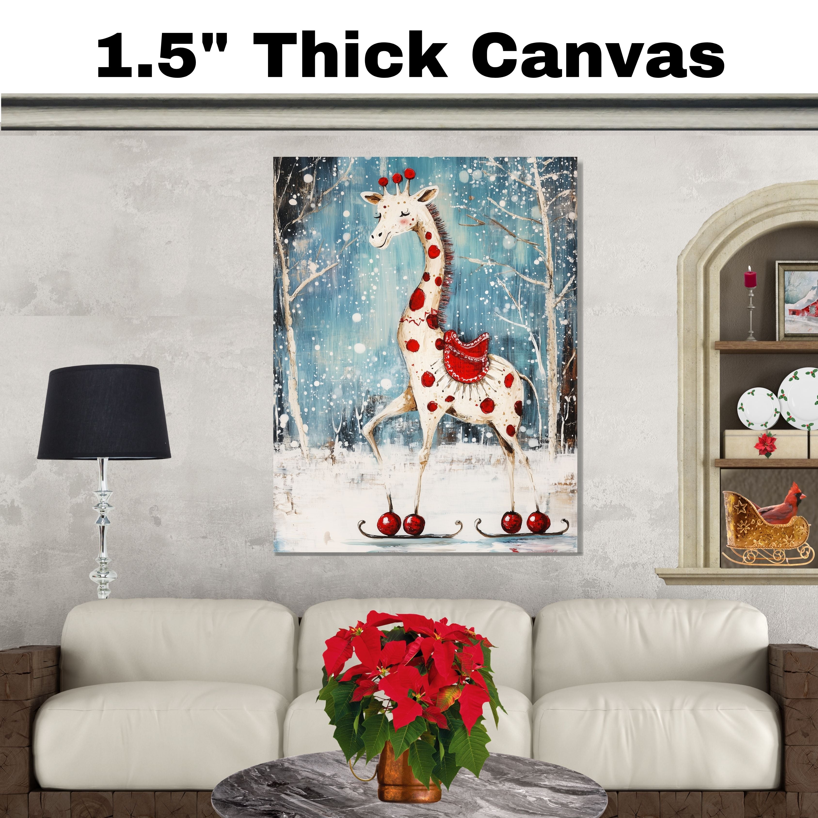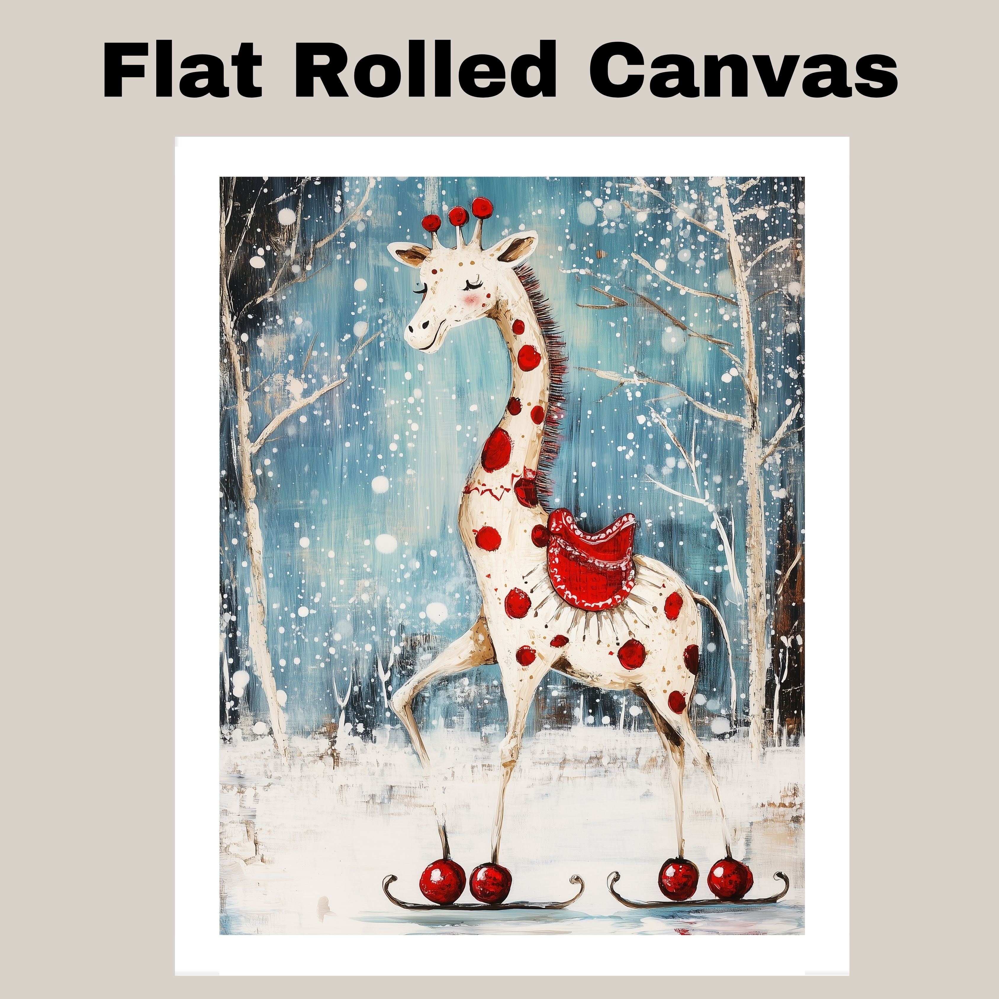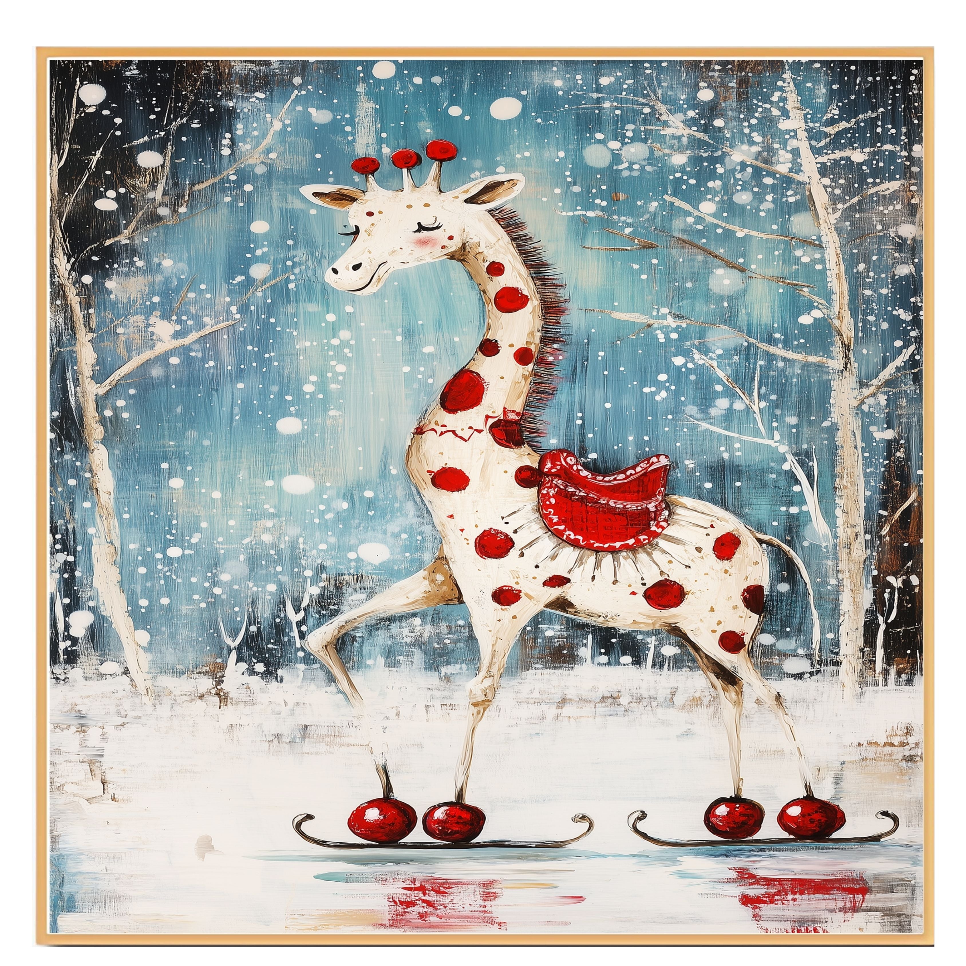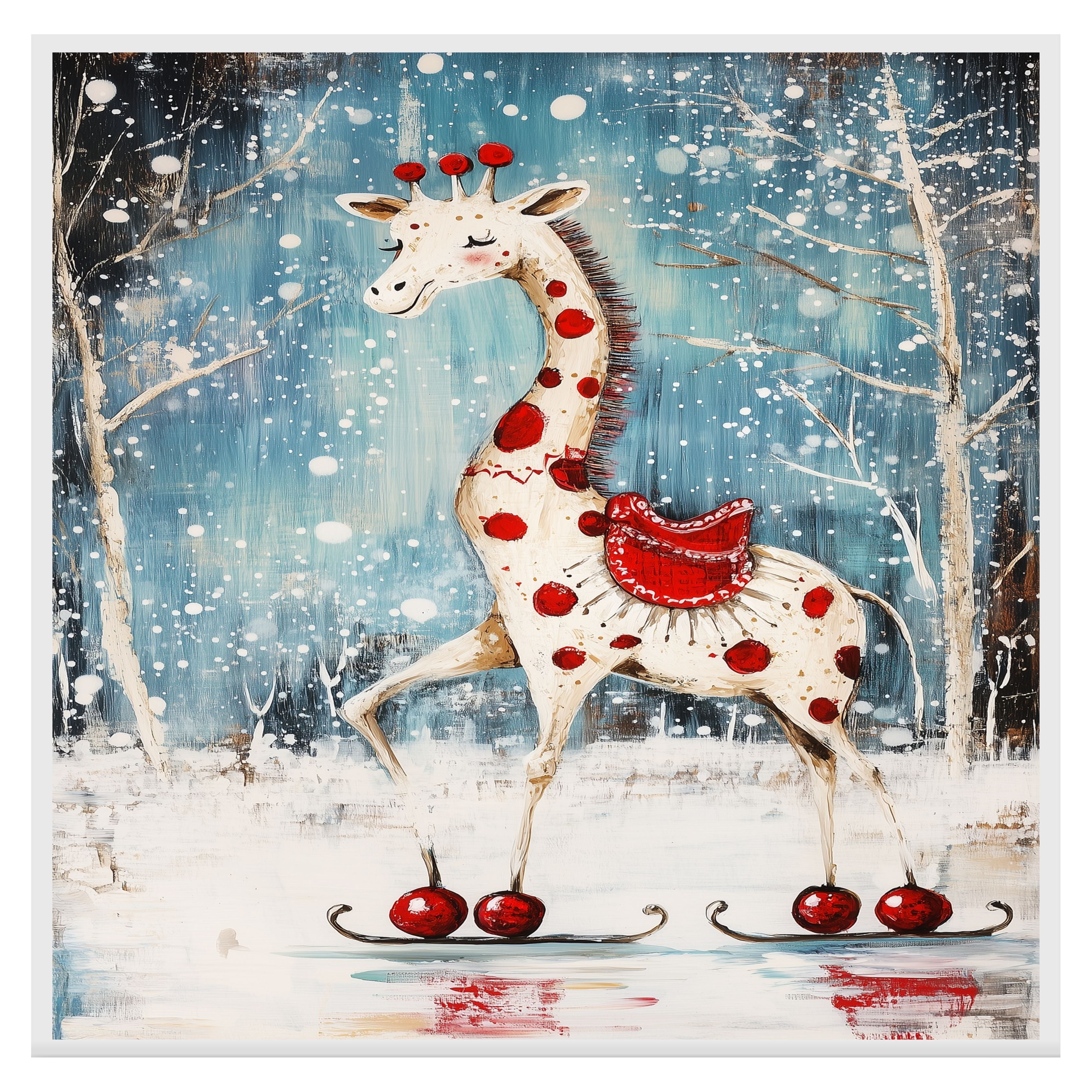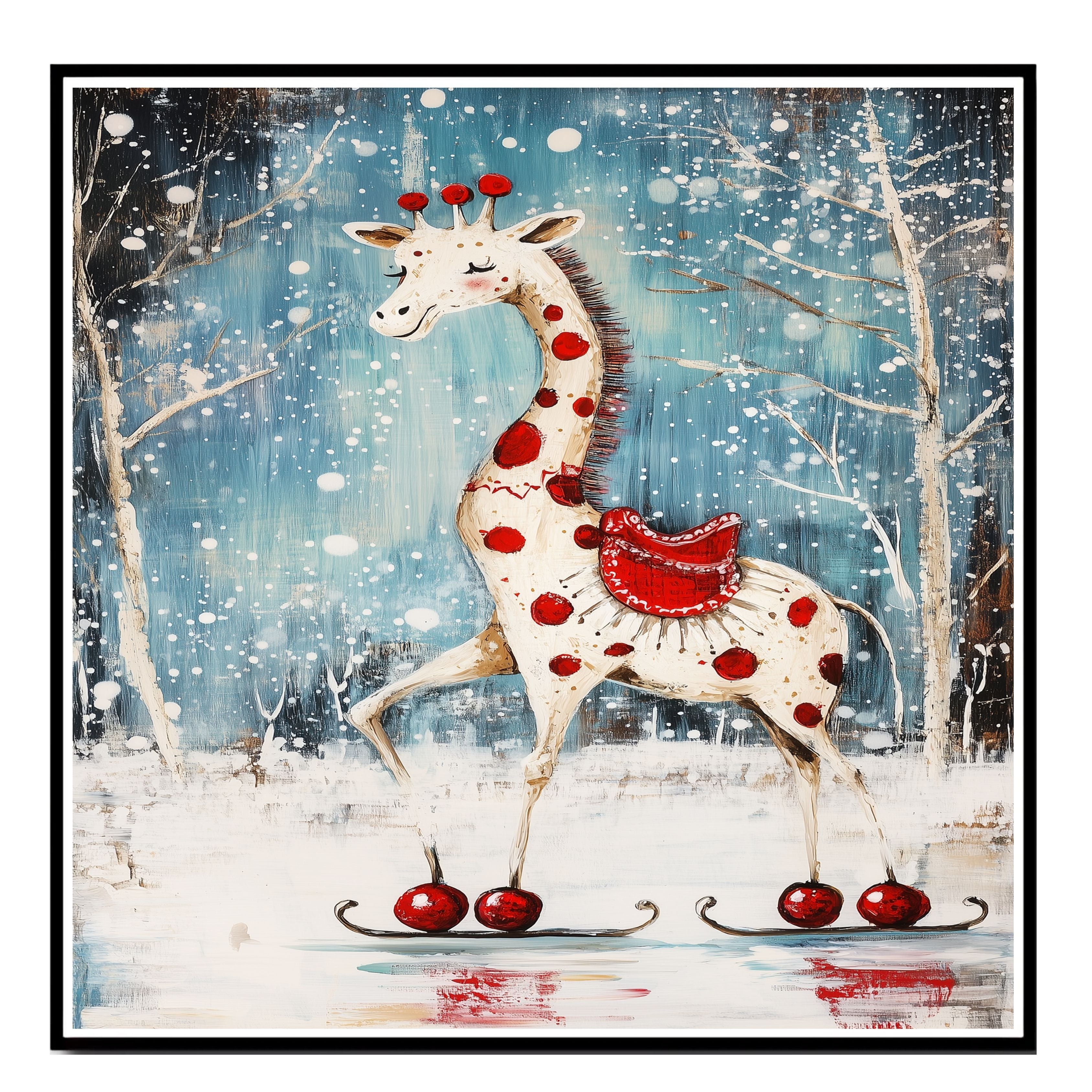 A charming and whimsical illustration of a graceful giraffe ice skating through a snowy forest, adorned in red polka dots and a festive saddle. This joyful piece of winter art radiates playful holiday spirit and is perfect for seasonal decor or gift-giving.