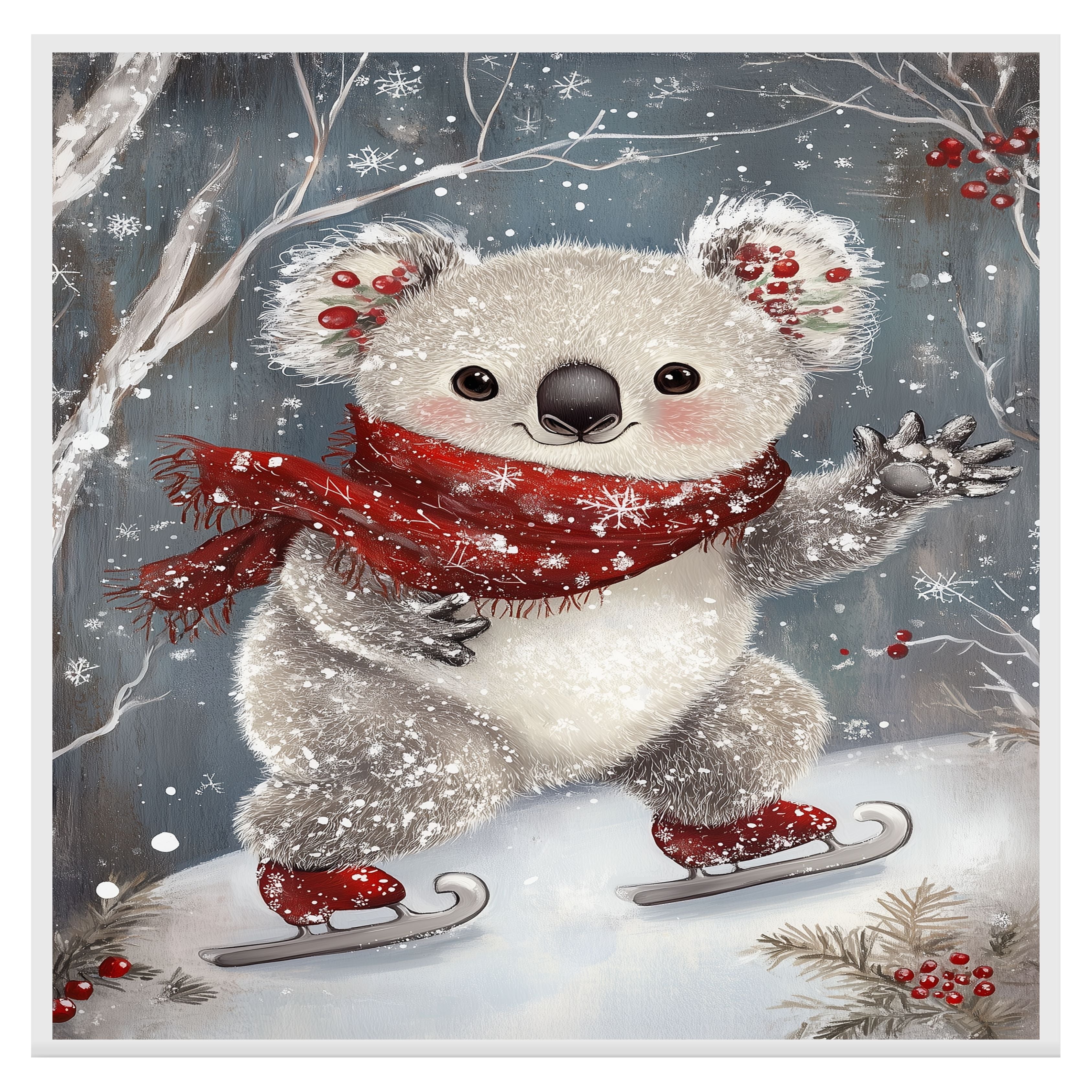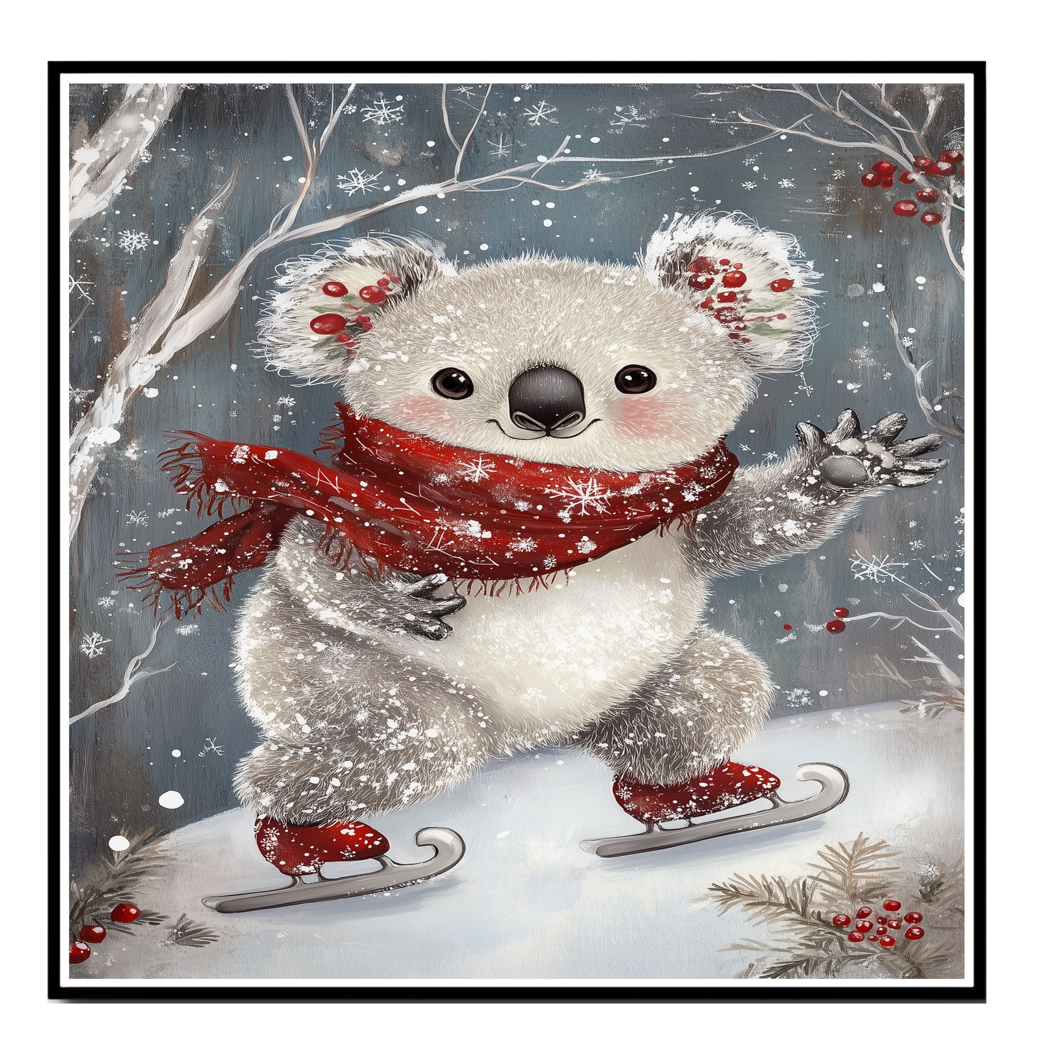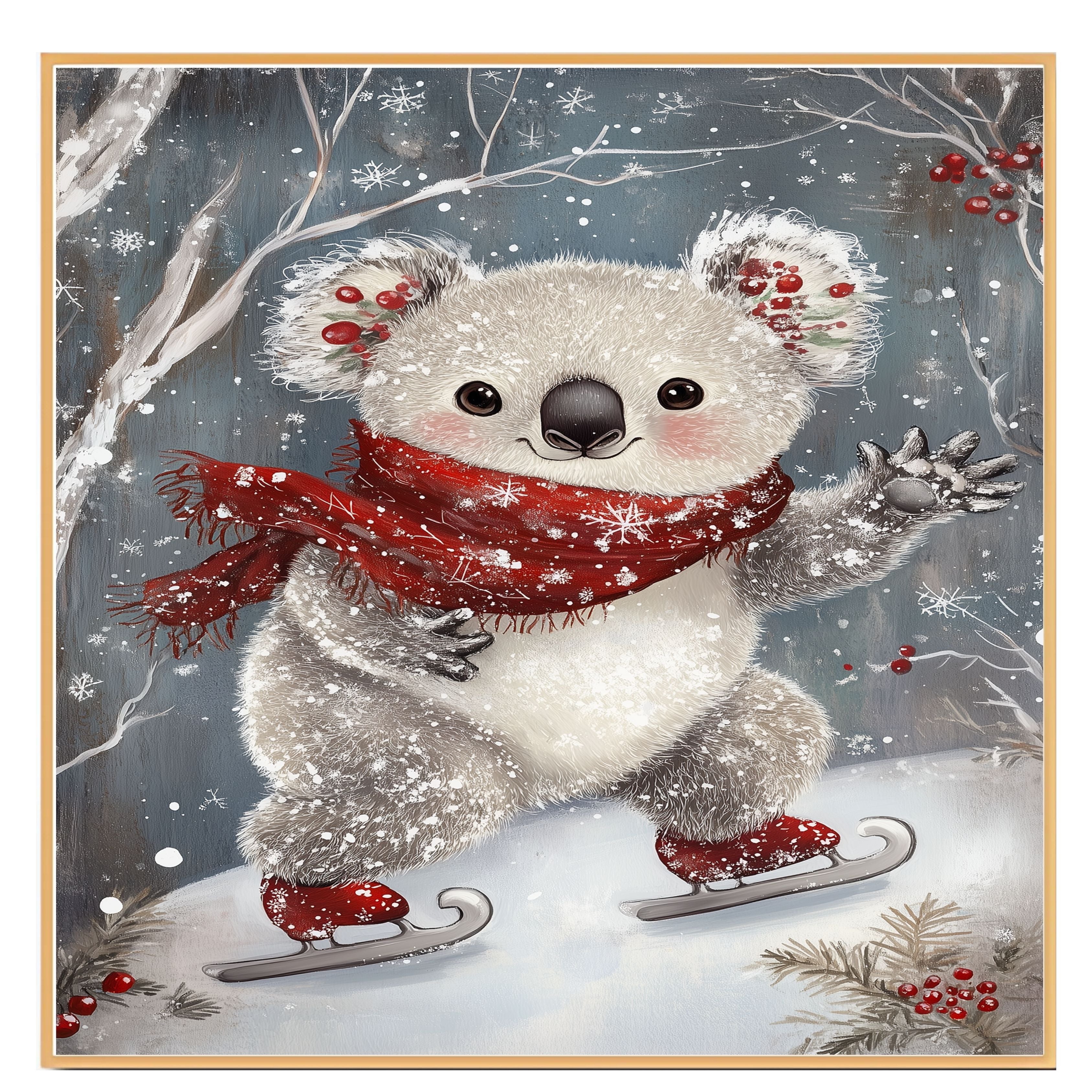 This heartwarming holiday artwork showcases an adorable koala ice skating with rosy cheeks, festive holly in its ears, and a red snowflake scarf. A magical blend of winter wonder and cuteness, it’s perfect for nursery decor, holiday displays, or seasonal gifts.