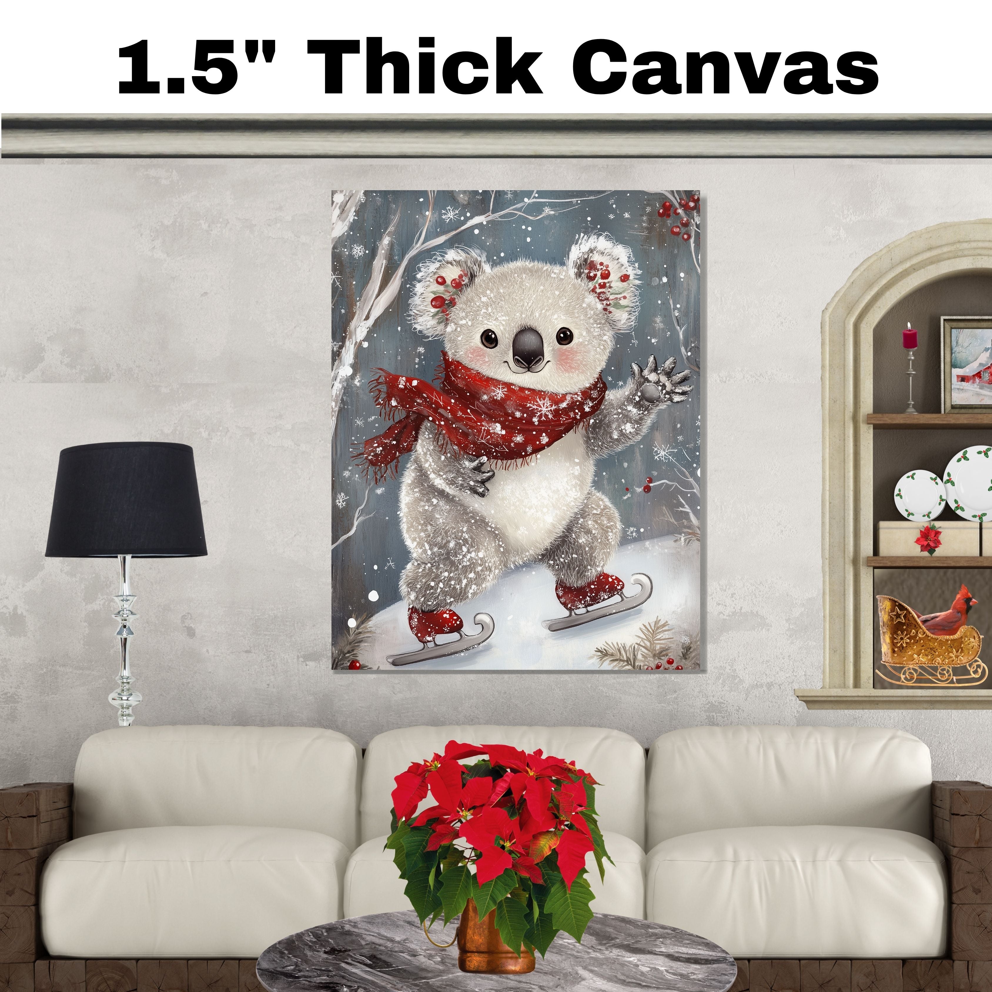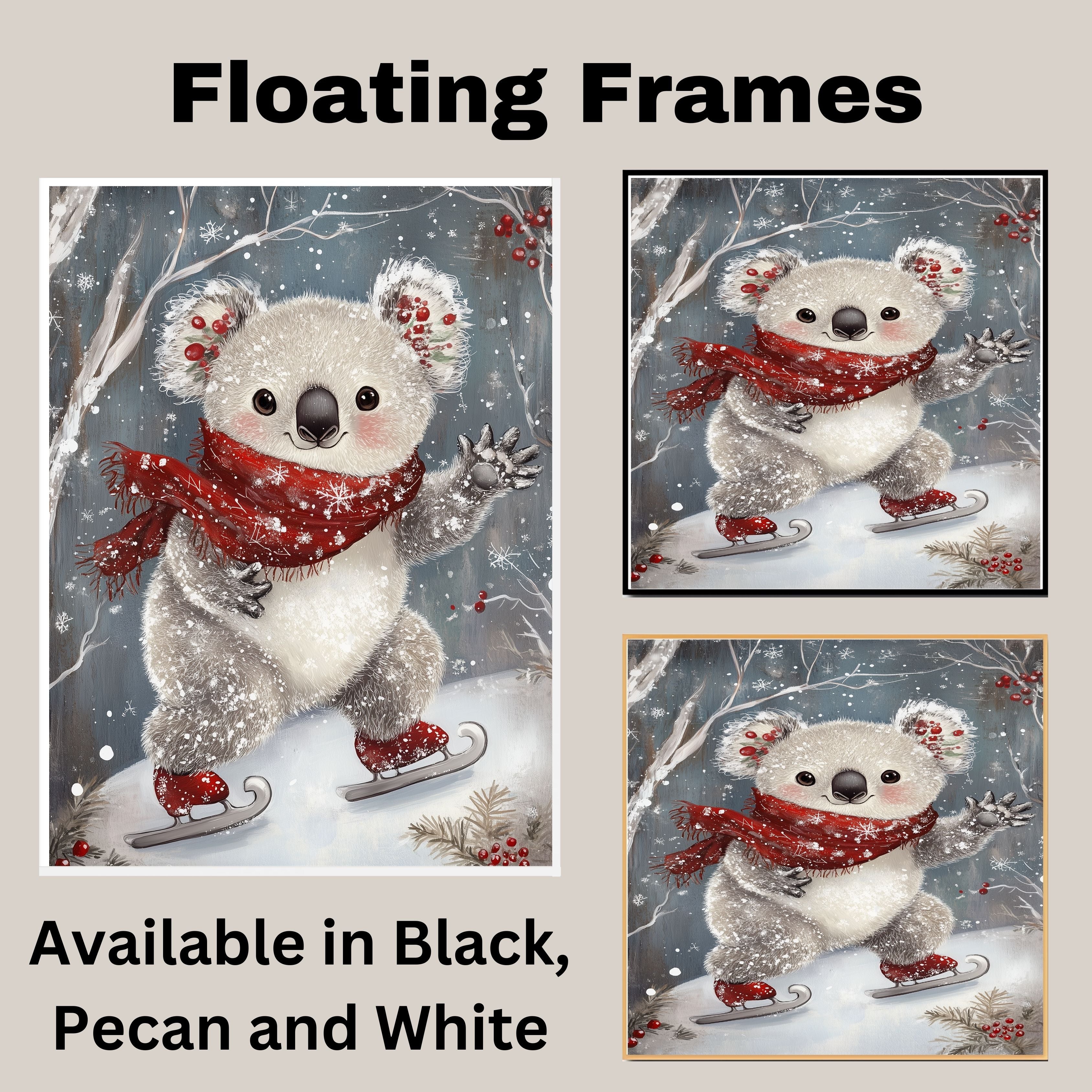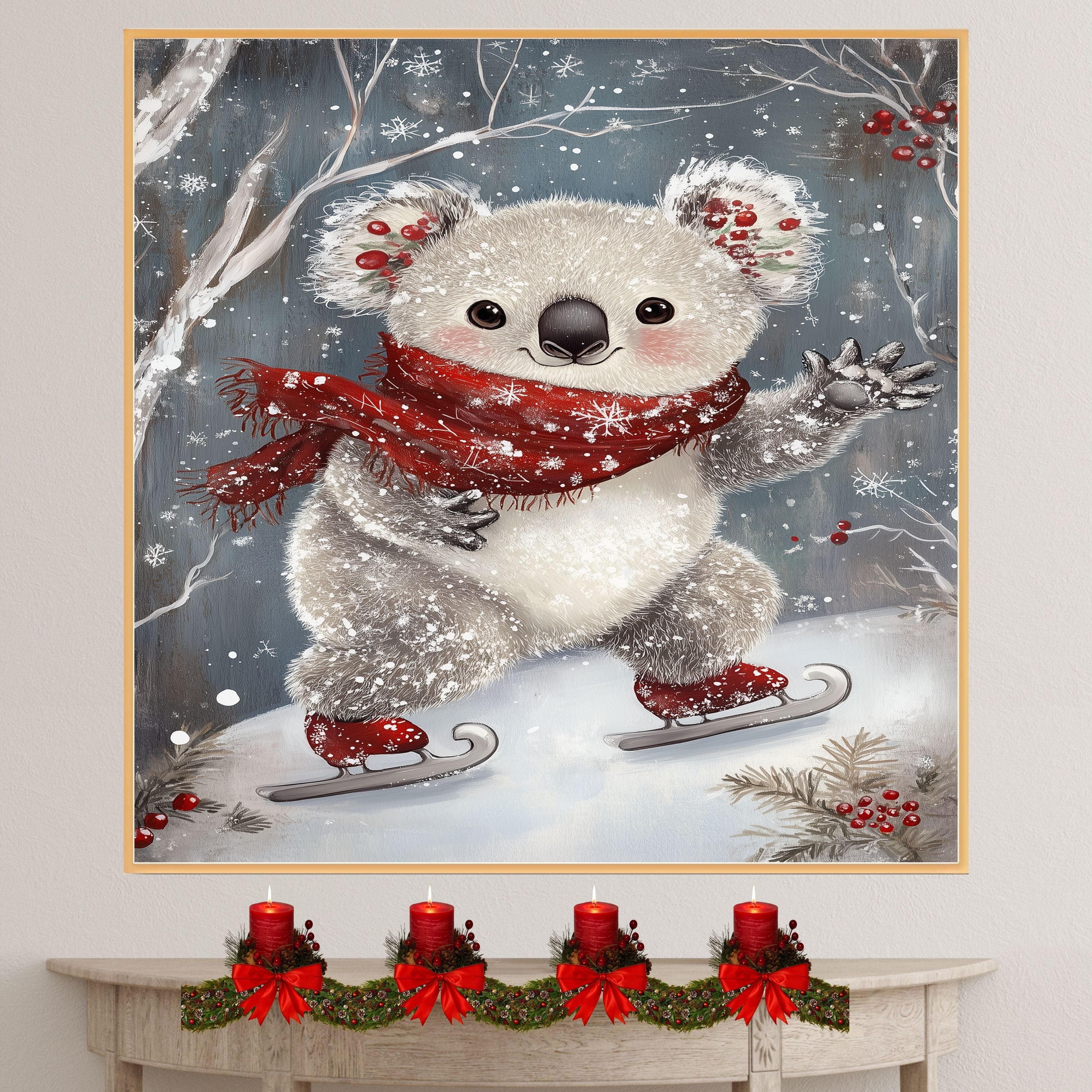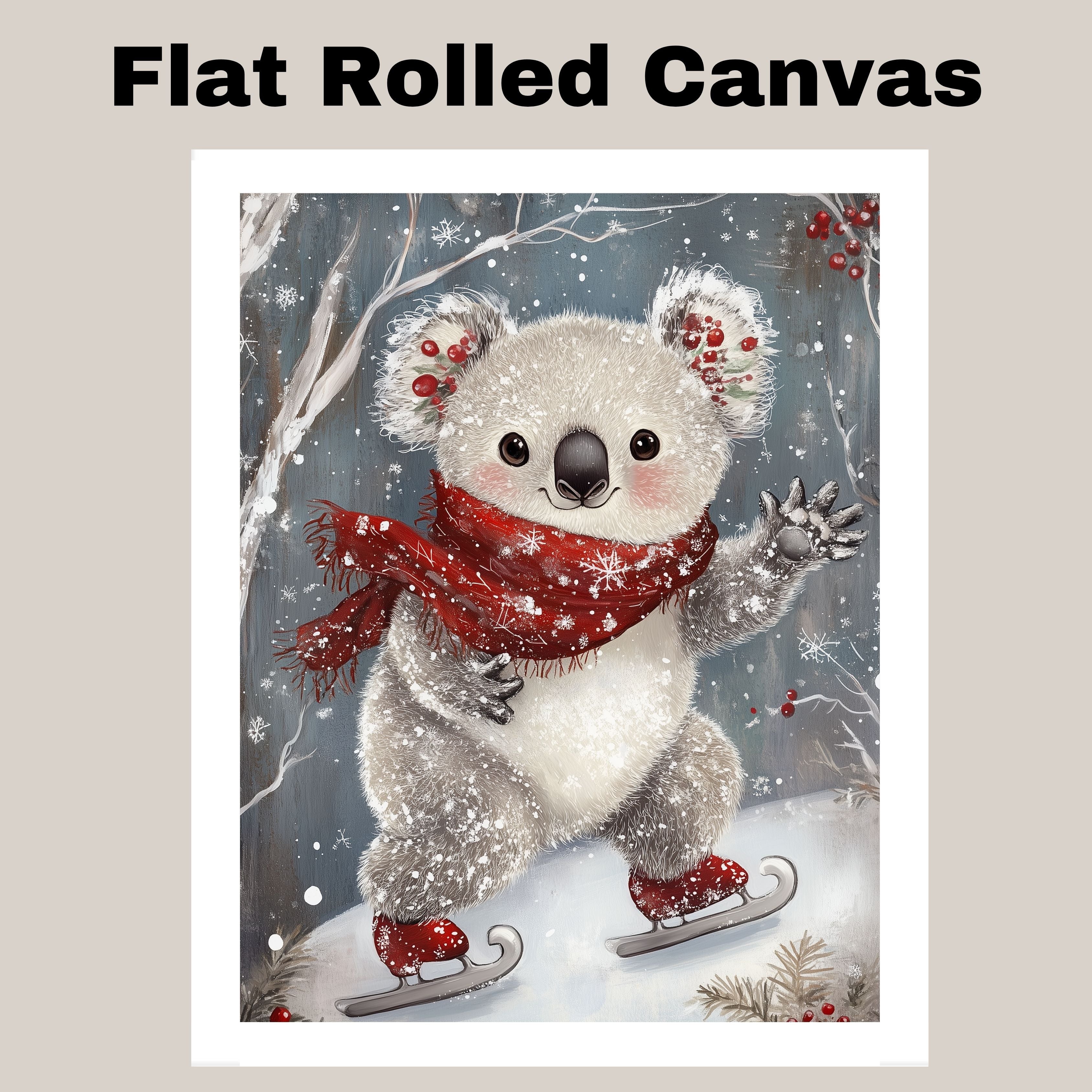 This heartwarming holiday artwork showcases an adorable koala ice skating with rosy cheeks, festive holly in its ears, and a red snowflake scarf. A magical blend of winter wonder and cuteness, it’s perfect for nursery decor, holiday displays, or seasonal gifts.