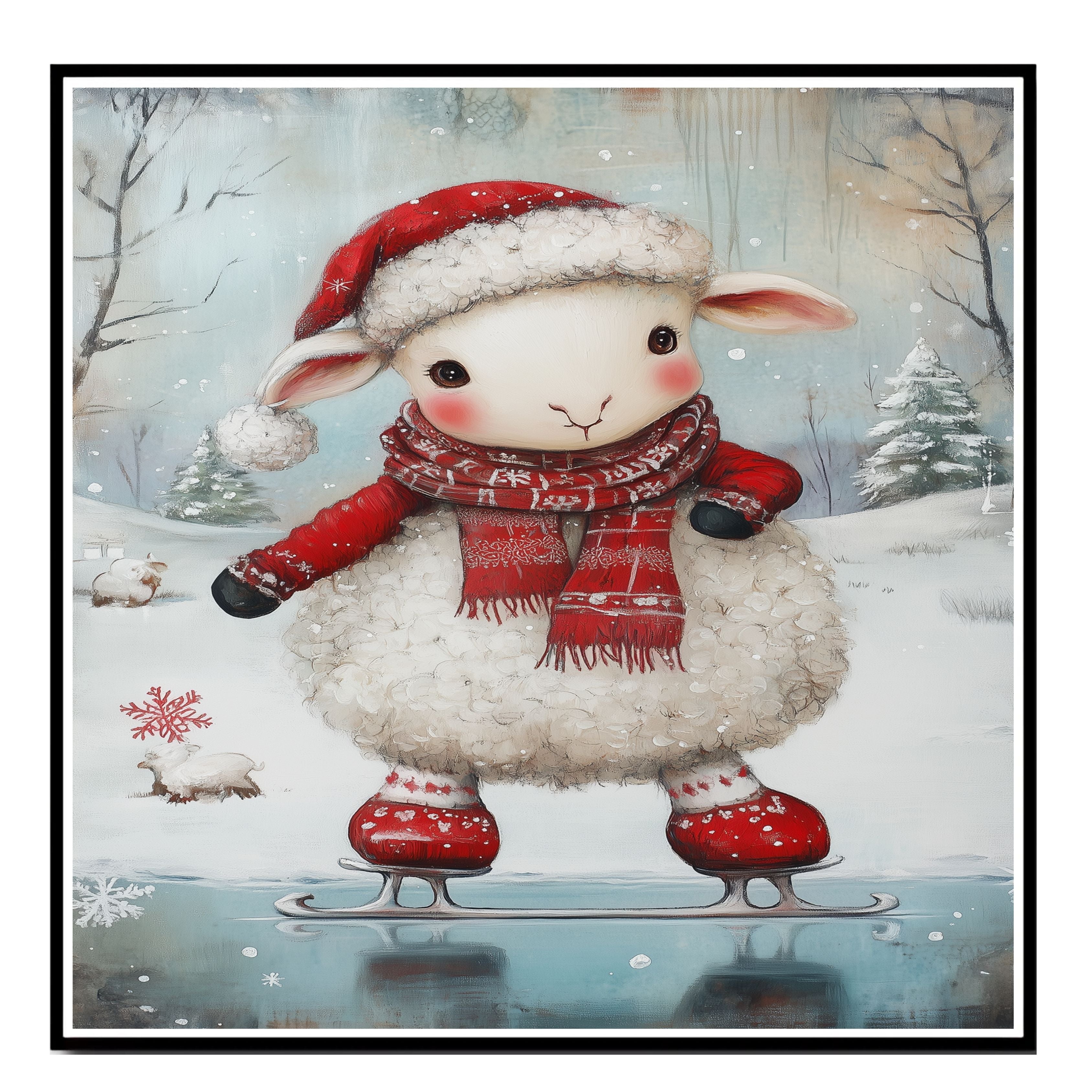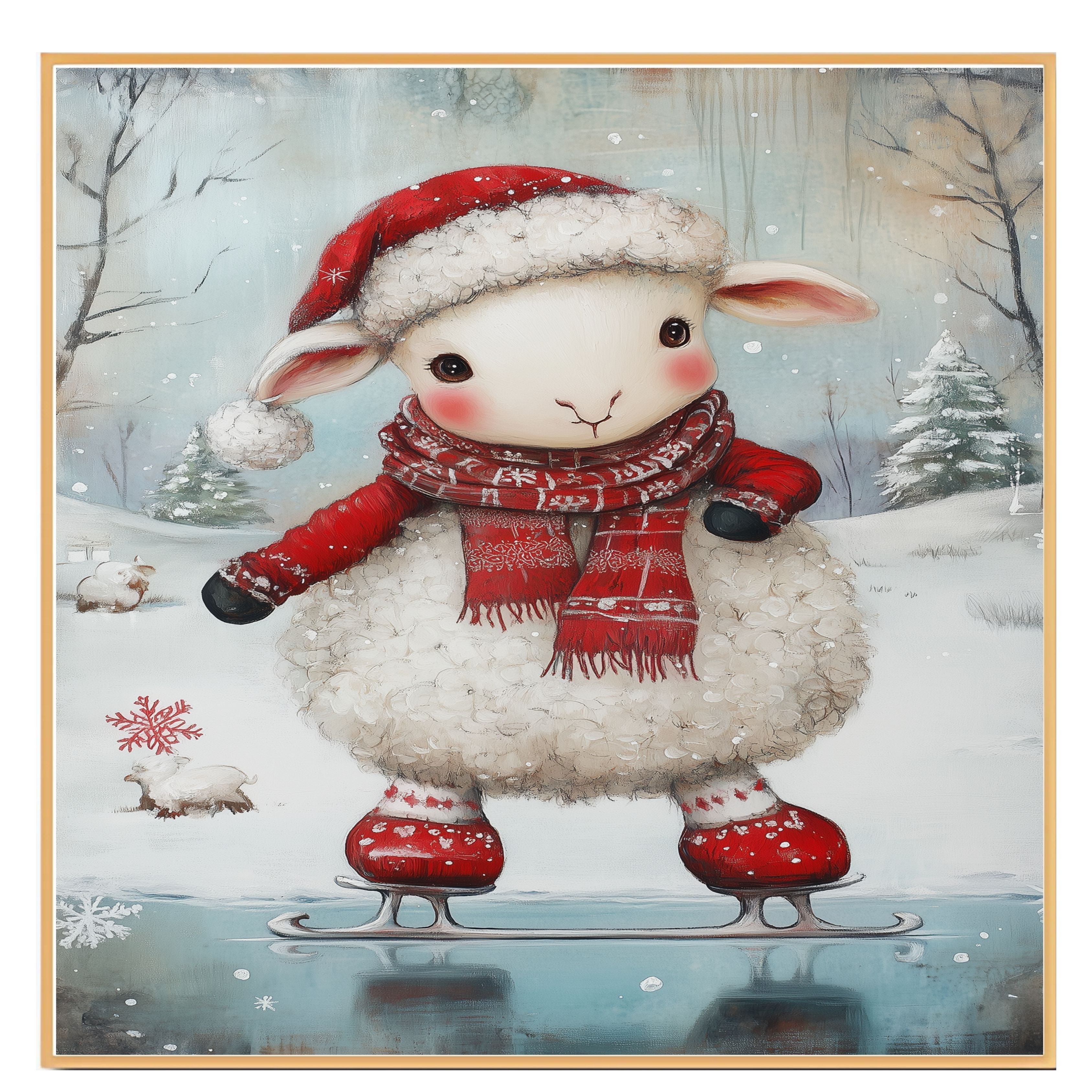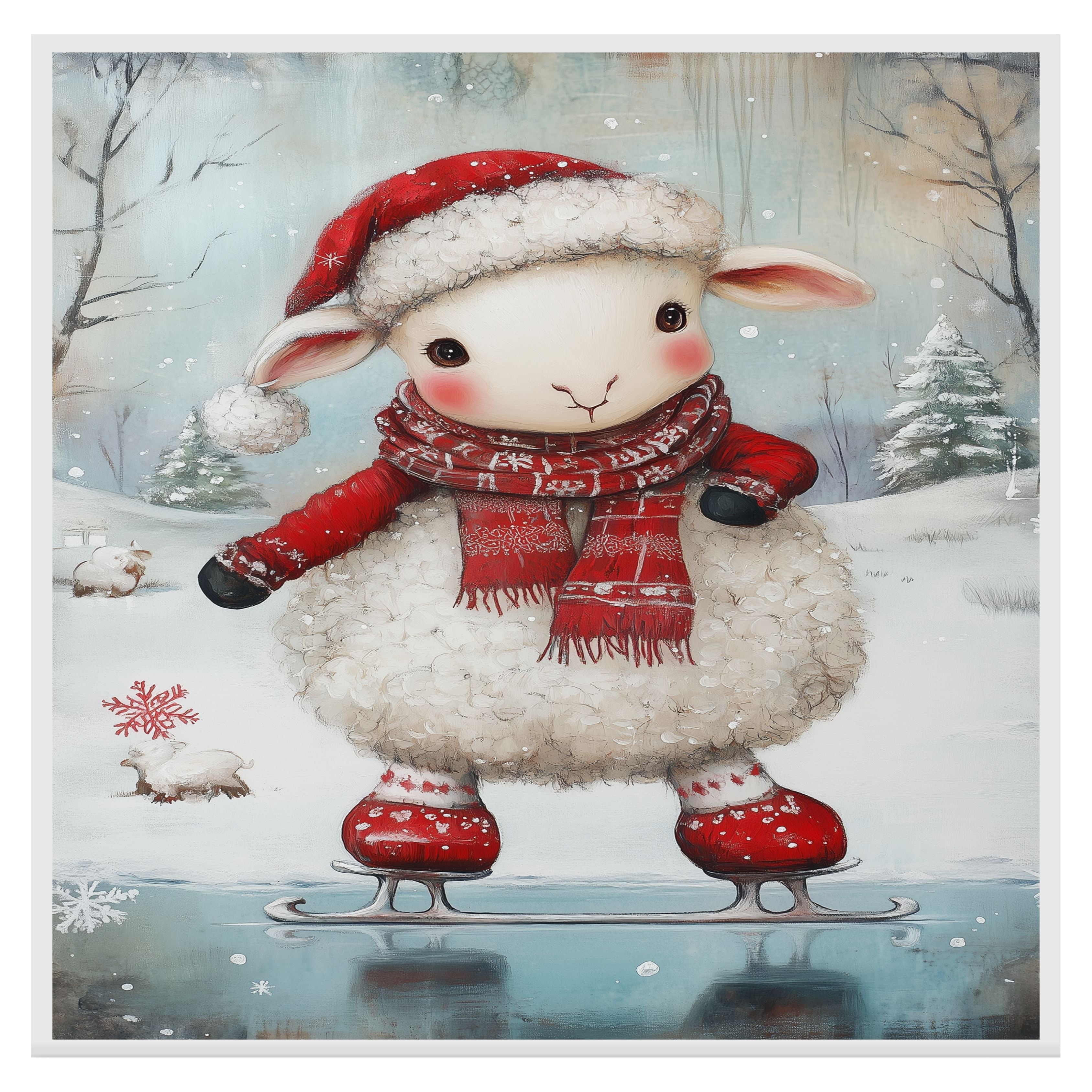 Whimsical Christmas Lamb Ice Skating in Red Santa Hat and Scarf – Cute Holiday Animal Artwork for Winter Nursery Decor, Christmas Gifts, or Seasonal Displays on Ready to Hang 1.5" Thick Canvas Wrap, Floating Framed Canvas, Flat Rolled Canvas