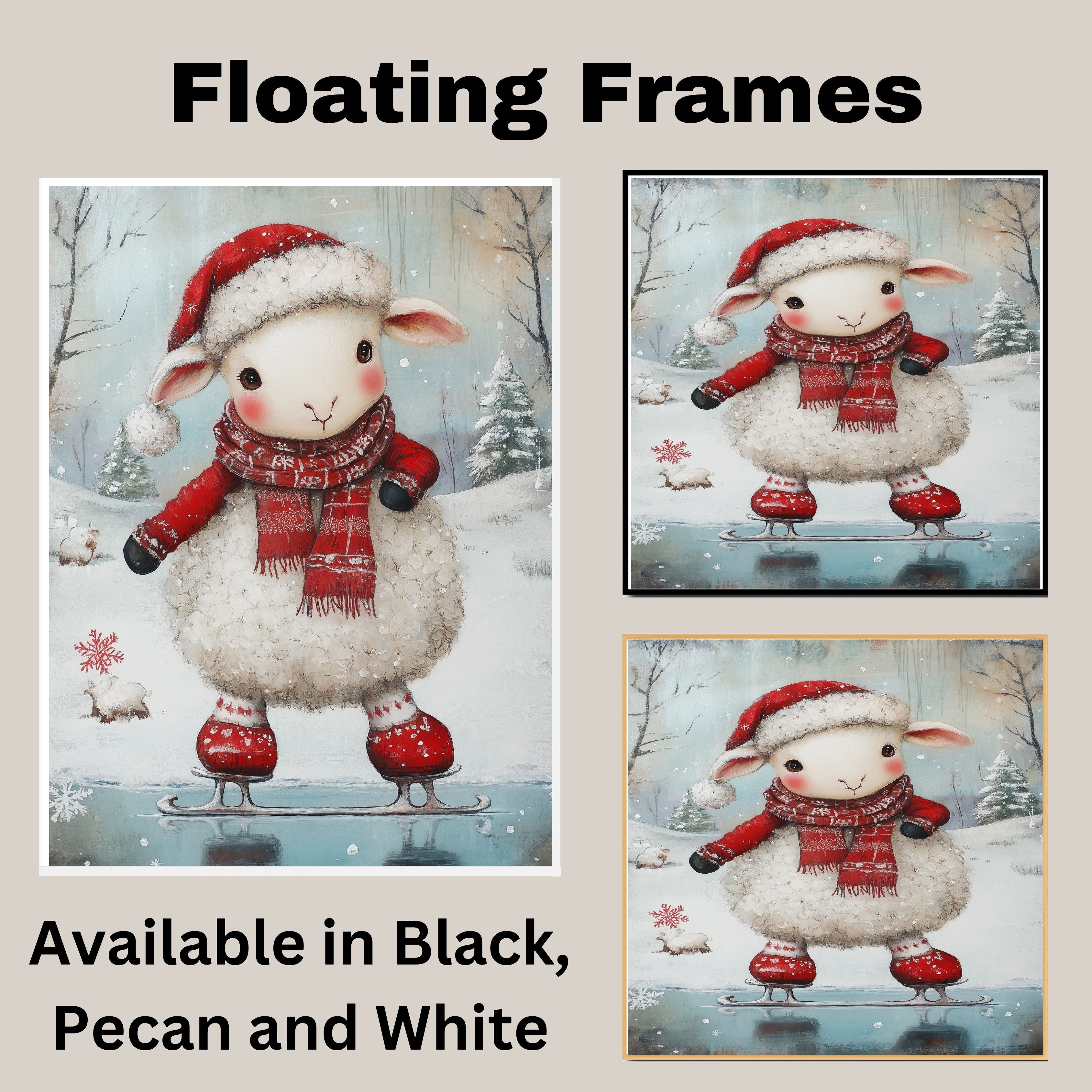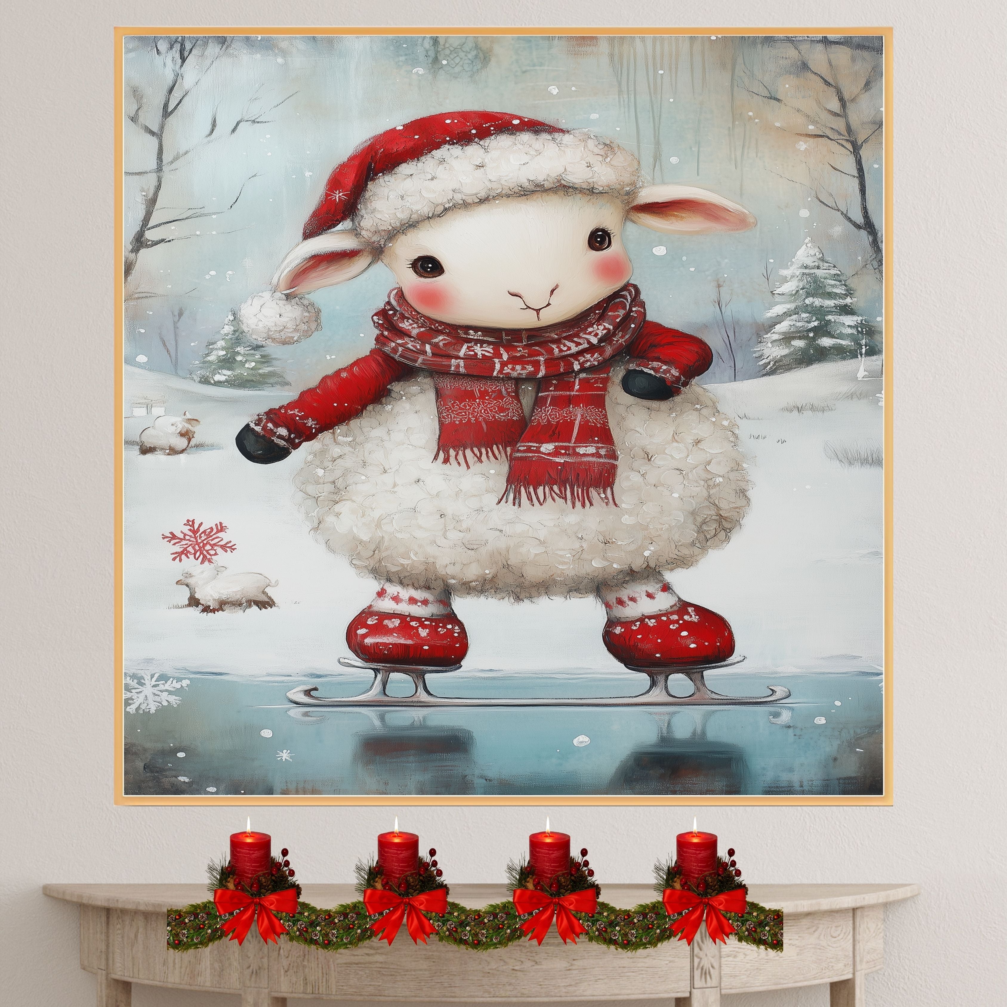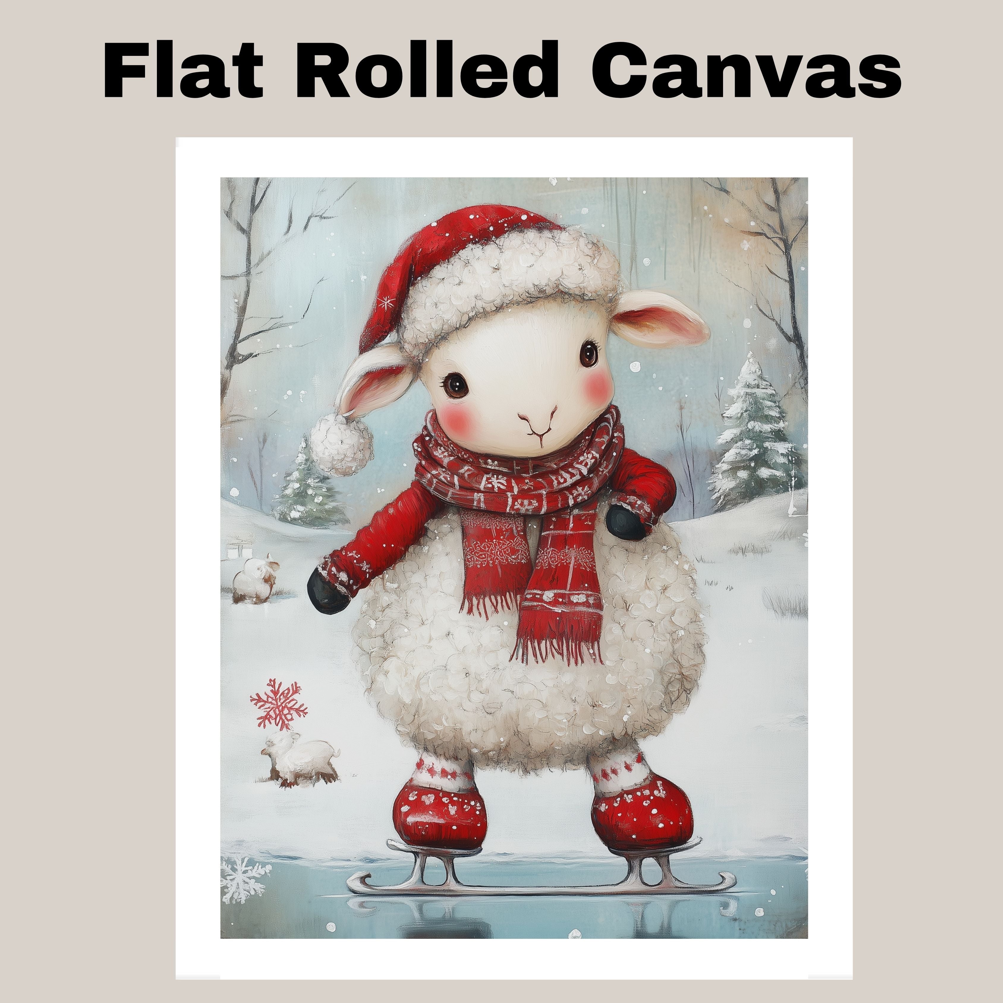 Whimsical Christmas Lamb Ice Skating in Red Santa Hat and Scarf – Cute Holiday Animal Artwork for Winter Nursery Decor, Christmas Gifts, or Seasonal Displays on Ready to Hang 1.5" Thick Canvas Wrap, Floating Framed Canvas, Flat Rolled Canvas