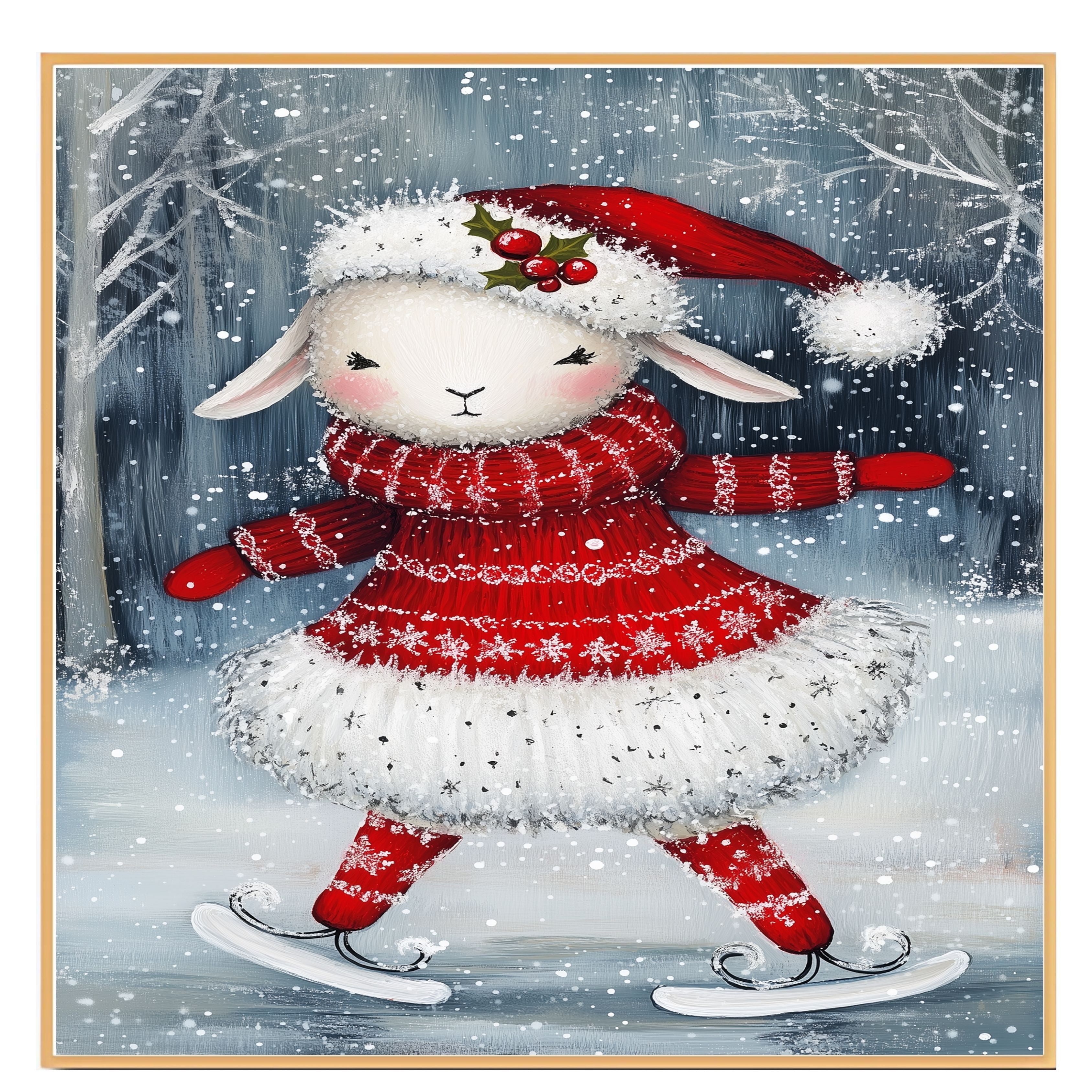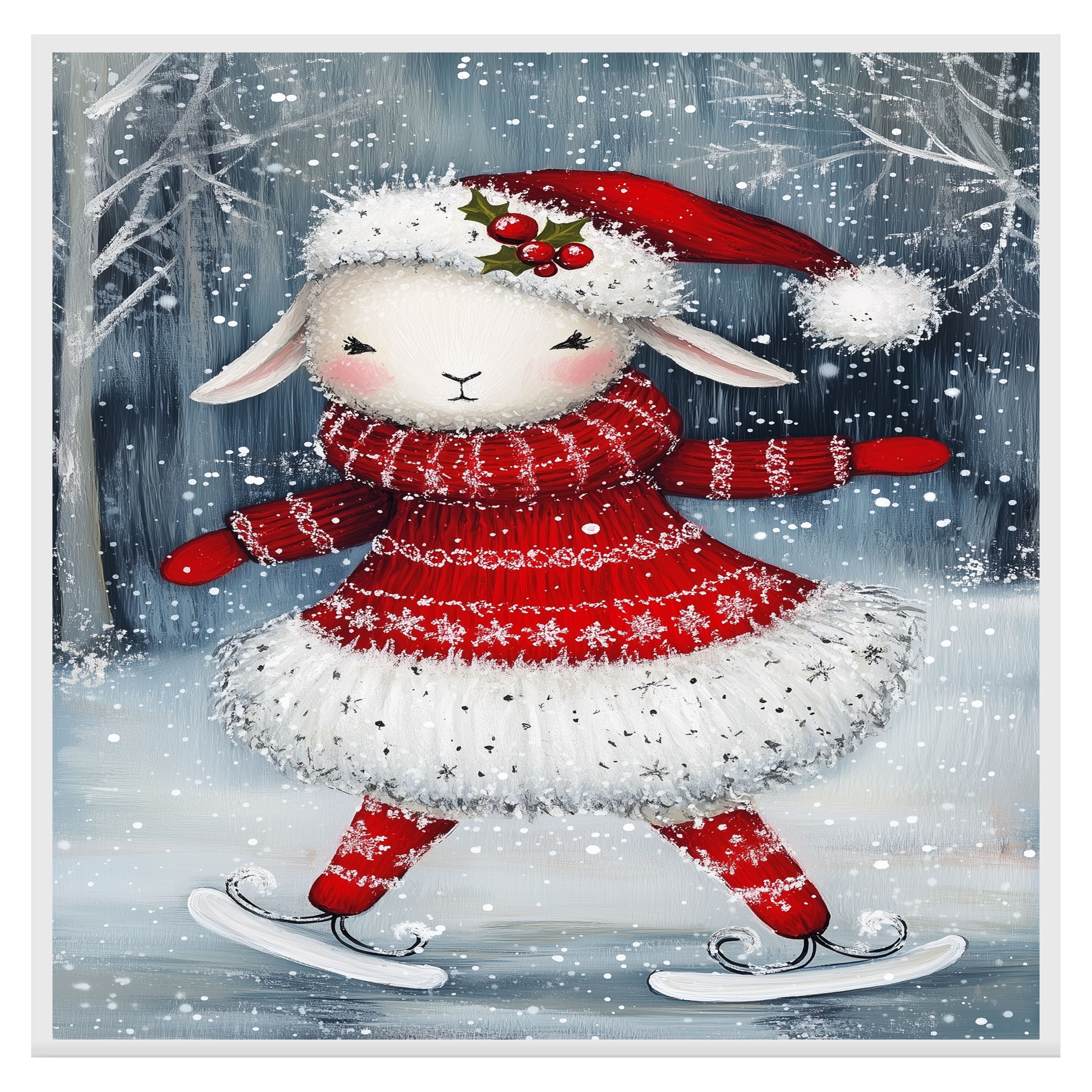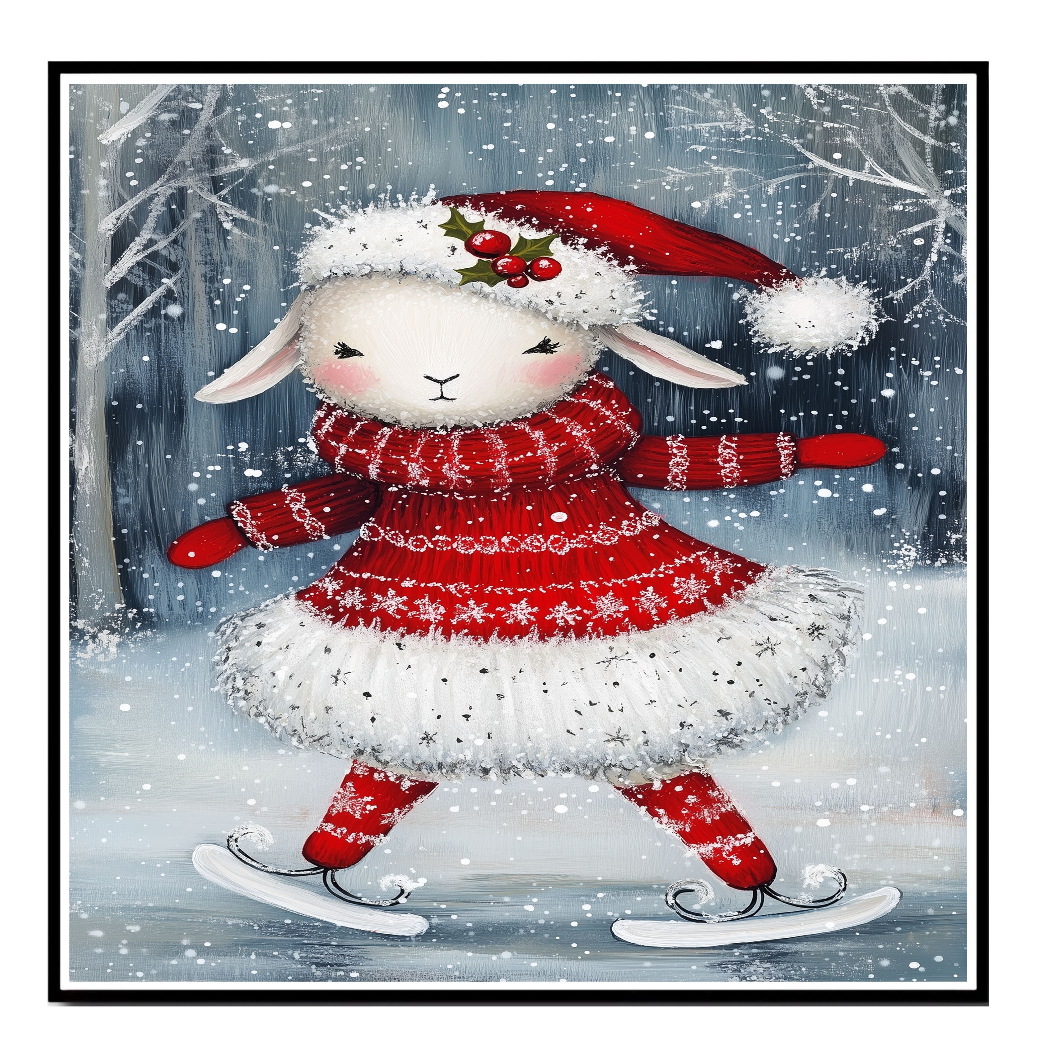 This enchanting holiday illustration features a sweet little lamb twirling on ice in a cozy red sweater dress and Santa hat, surrounded by softly falling snow. With its soft textures and charming details, it’s perfect for Christmas decor, nursery walls, or heartfelt winter gifts.