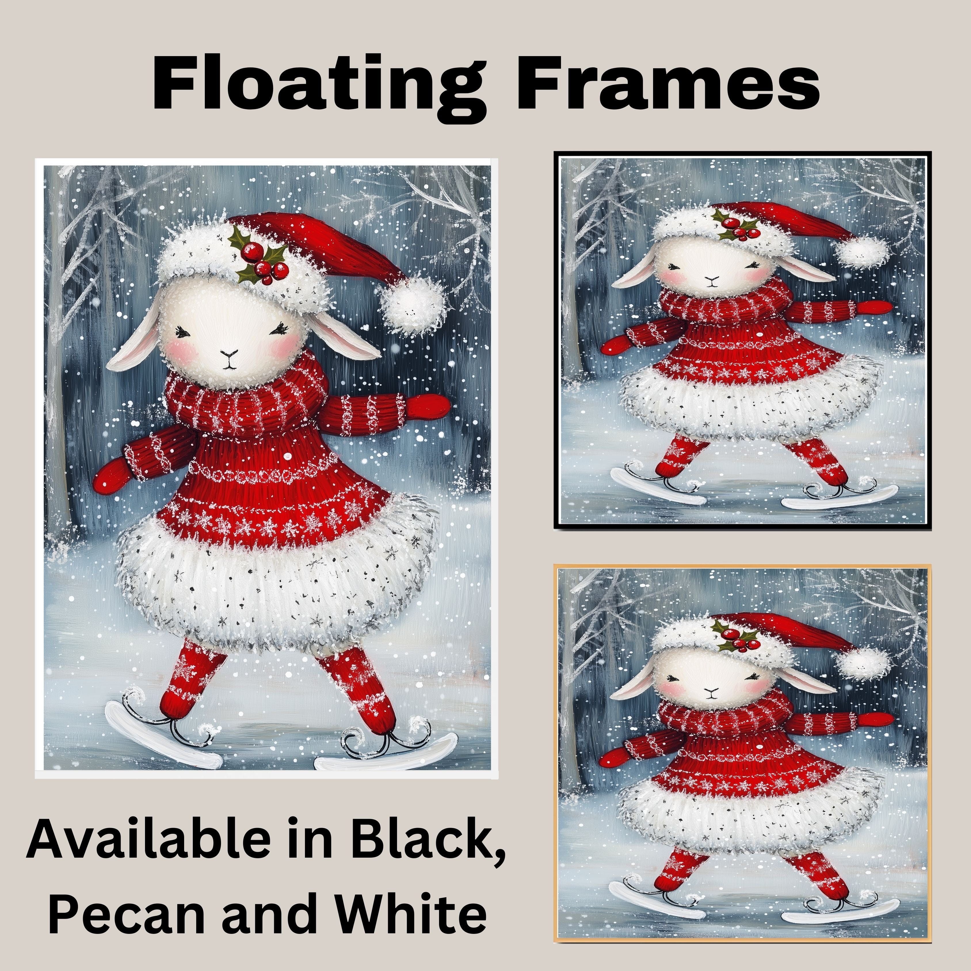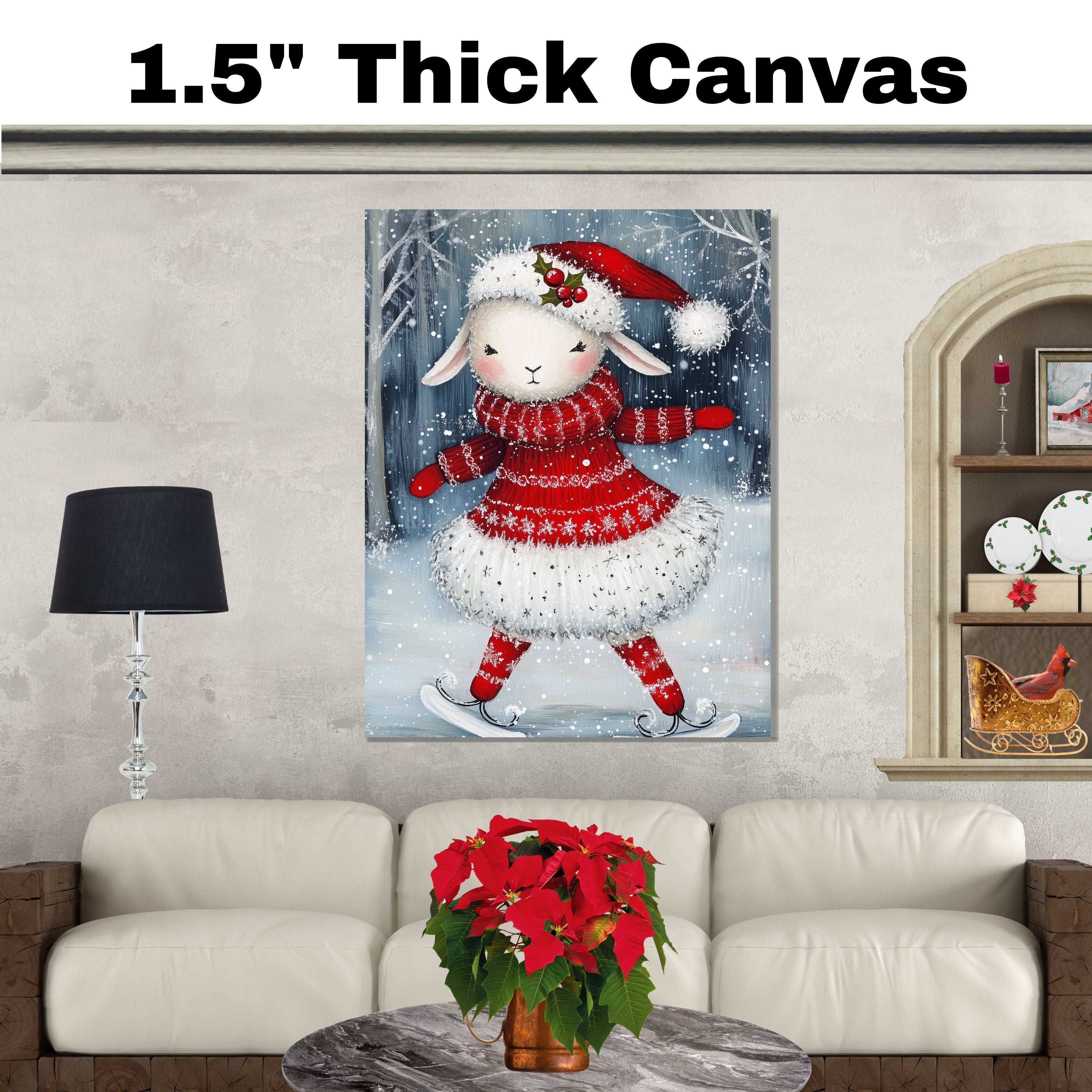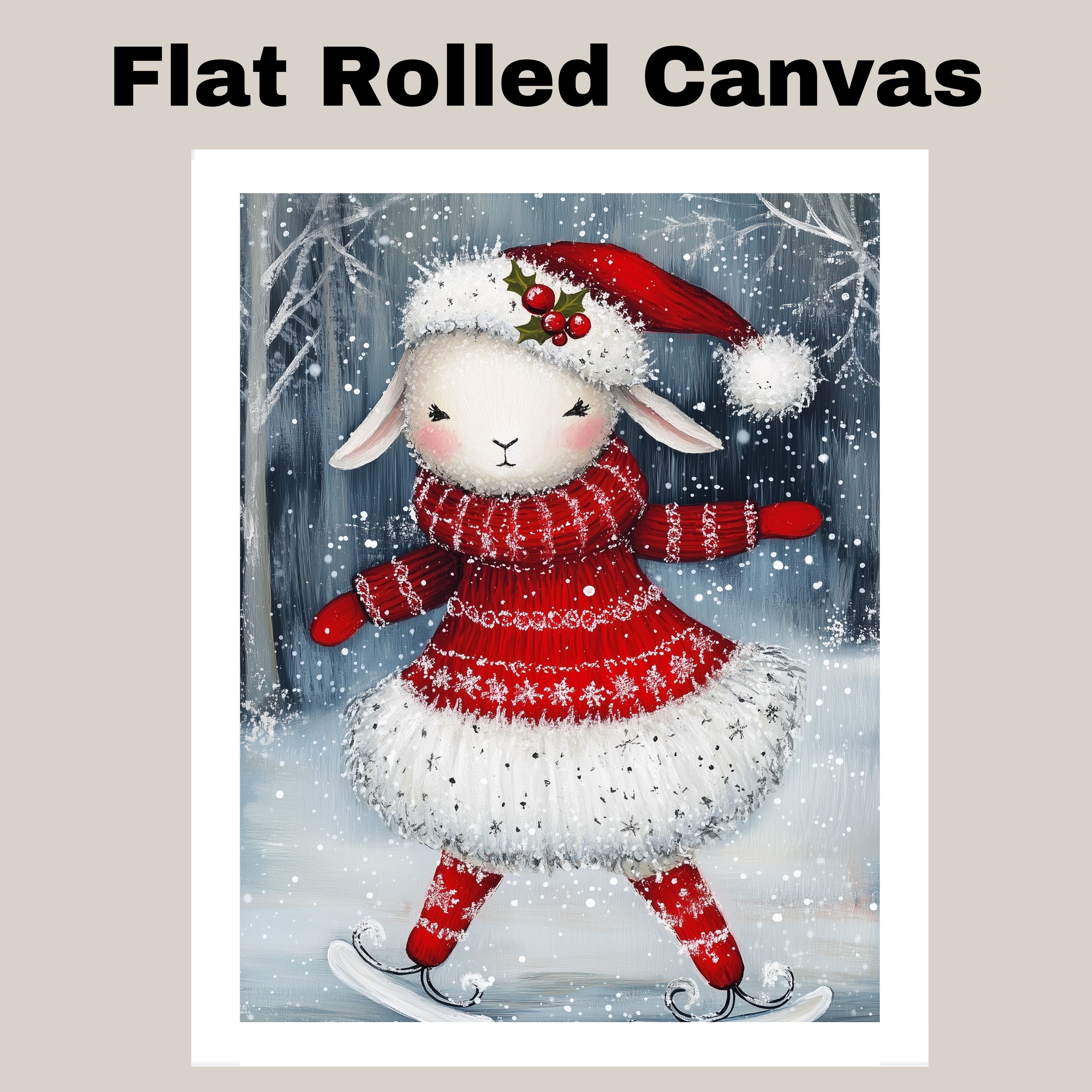 This enchanting holiday illustration features a sweet little lamb twirling on ice in a cozy red sweater dress and Santa hat, surrounded by softly falling snow. With its soft textures and charming details, it’s perfect for Christmas decor, nursery walls, or heartfelt winter gifts.