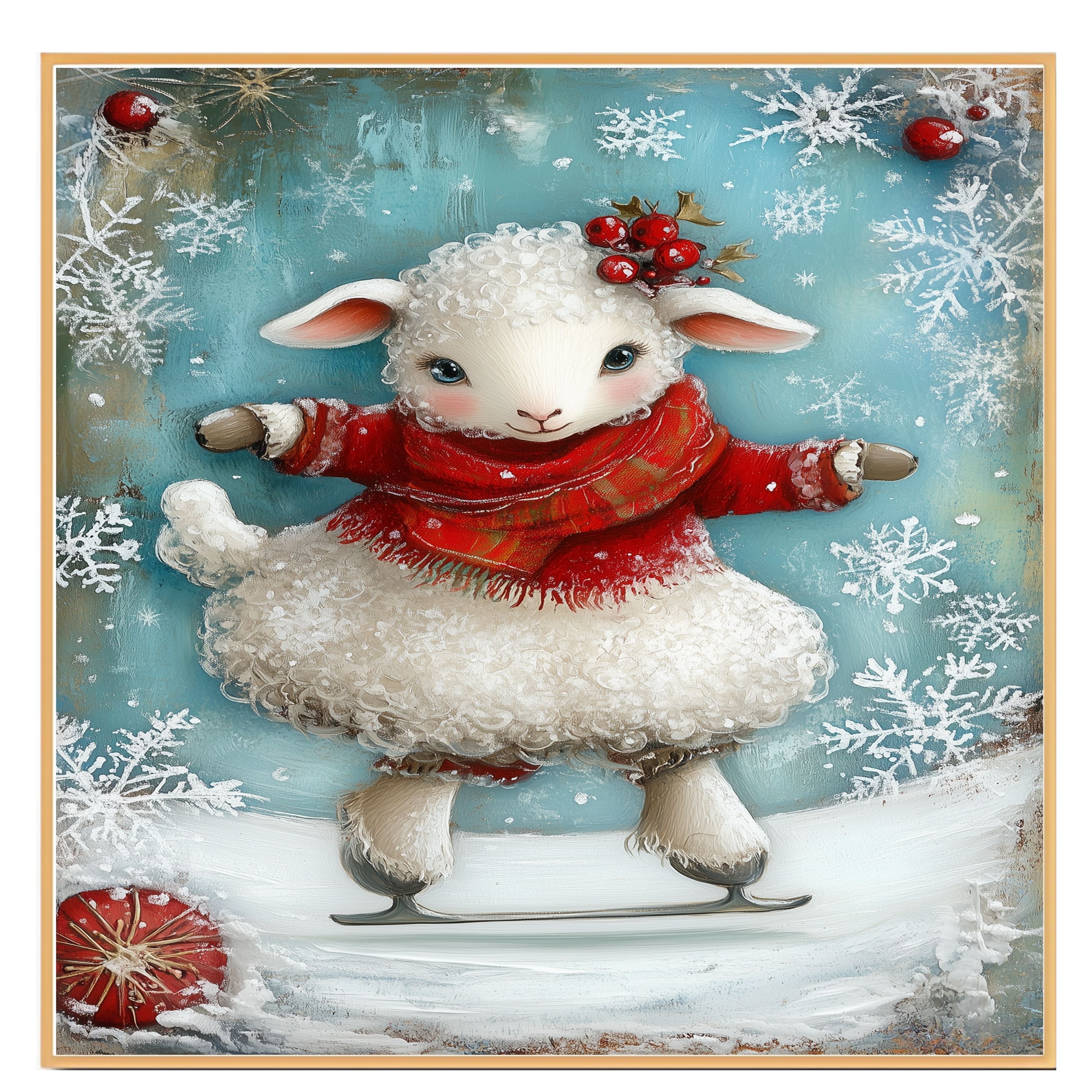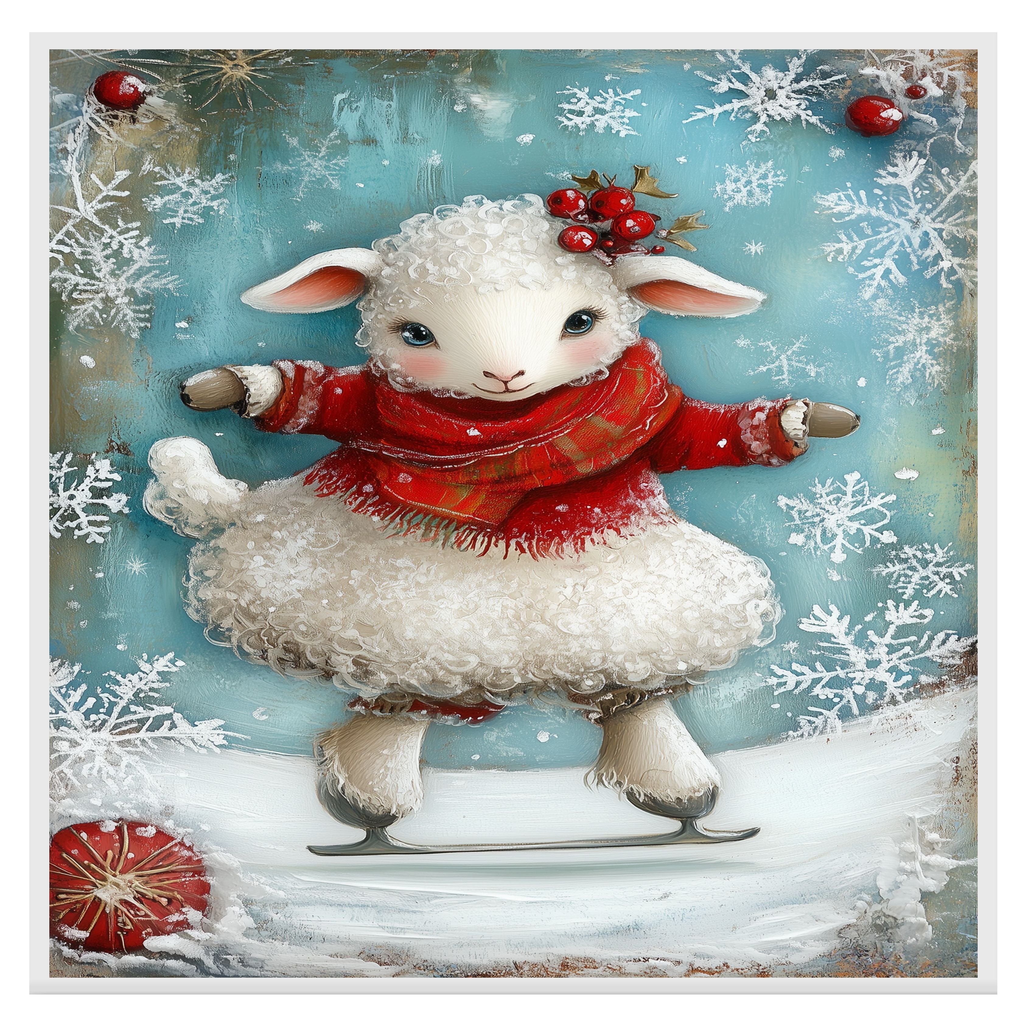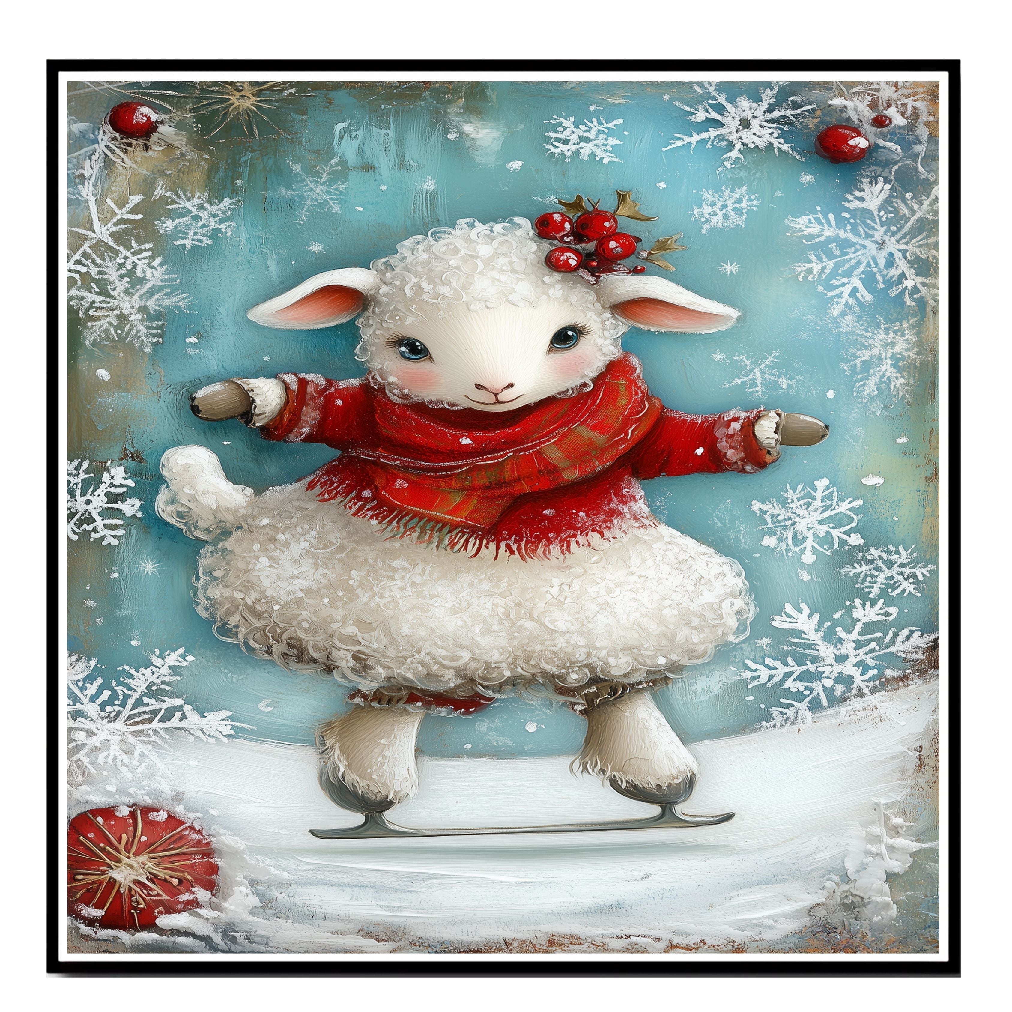 This delightful holiday illustration features a curly-haired lamb skating happily in a cozy red sweater and scarf, adorned with holly berries and surrounded by snowflakes. A charming winter scene full of festive magic—perfect for seasonal home decor, children's rooms, or heartwarming gifts.
