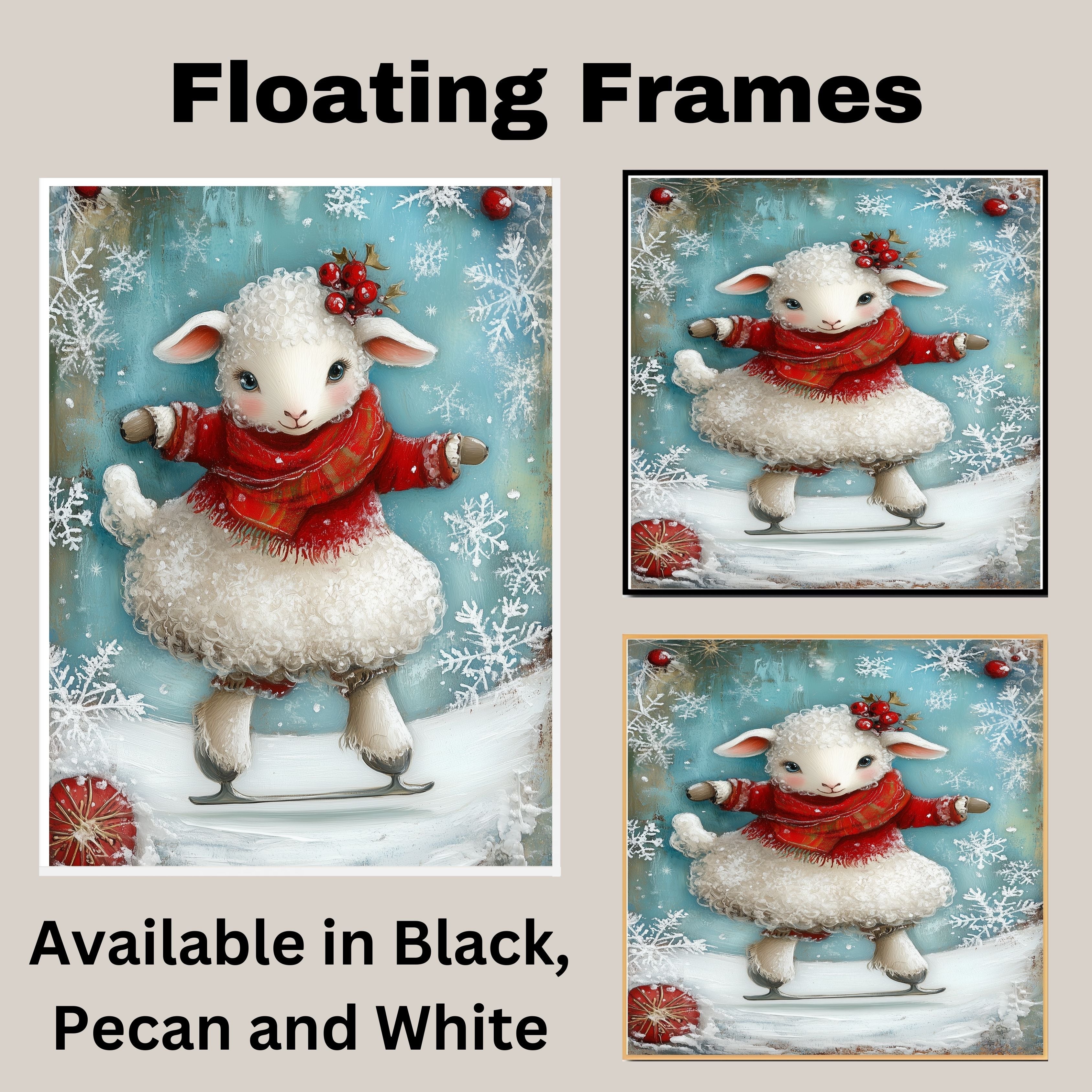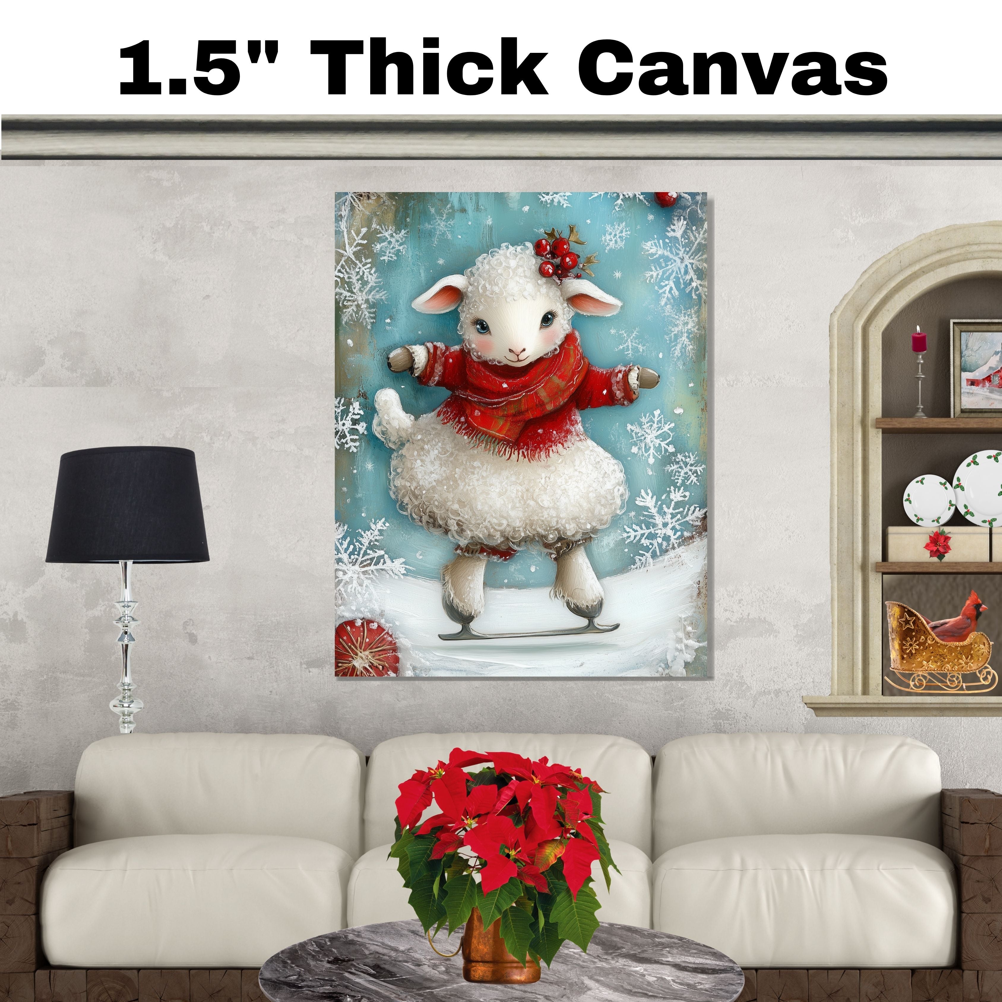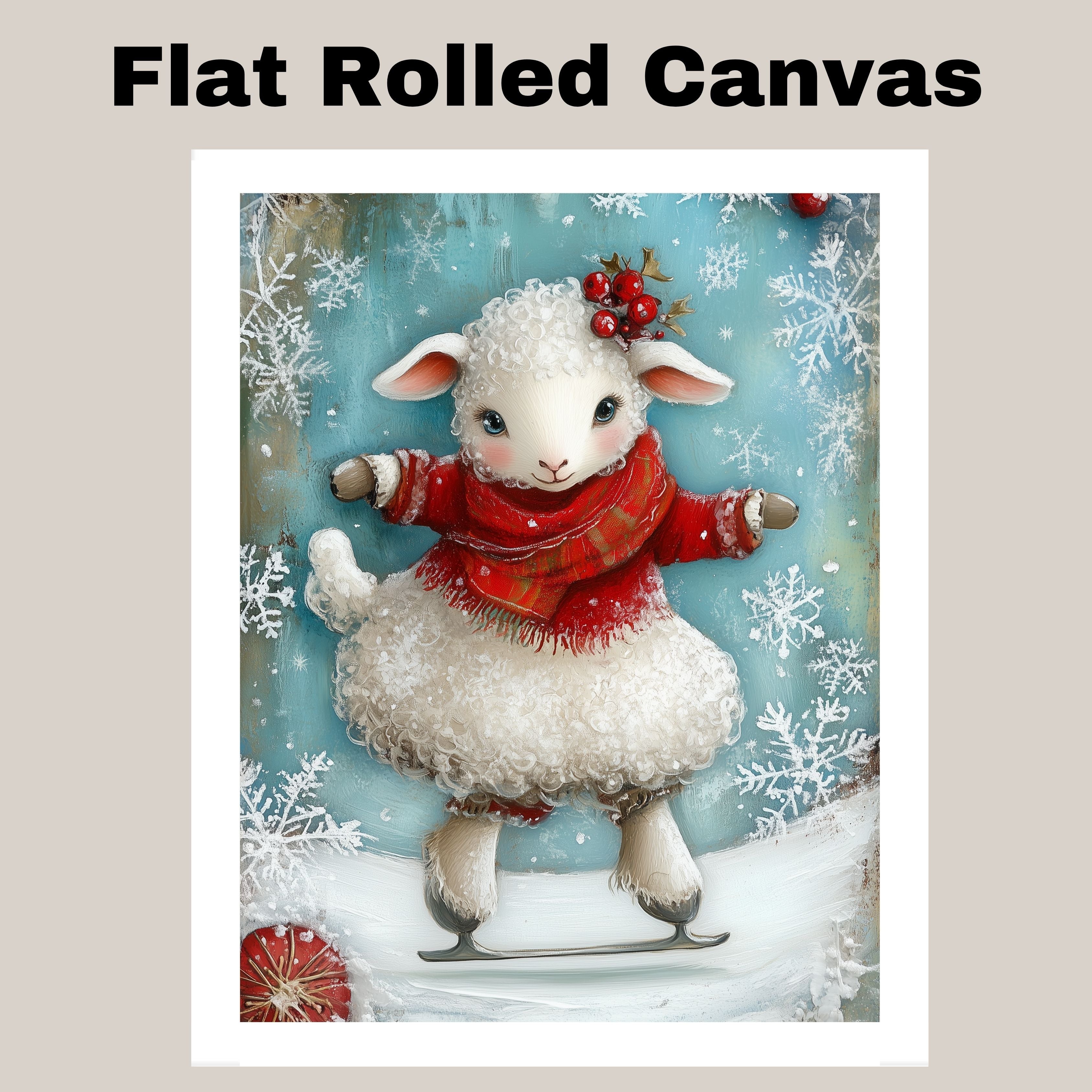 This delightful holiday illustration features a curly-haired lamb skating happily in a cozy red sweater and scarf, adorned with holly berries and surrounded by snowflakes. A charming winter scene full of festive magic—perfect for seasonal home decor, children's rooms, or heartwarming gifts.