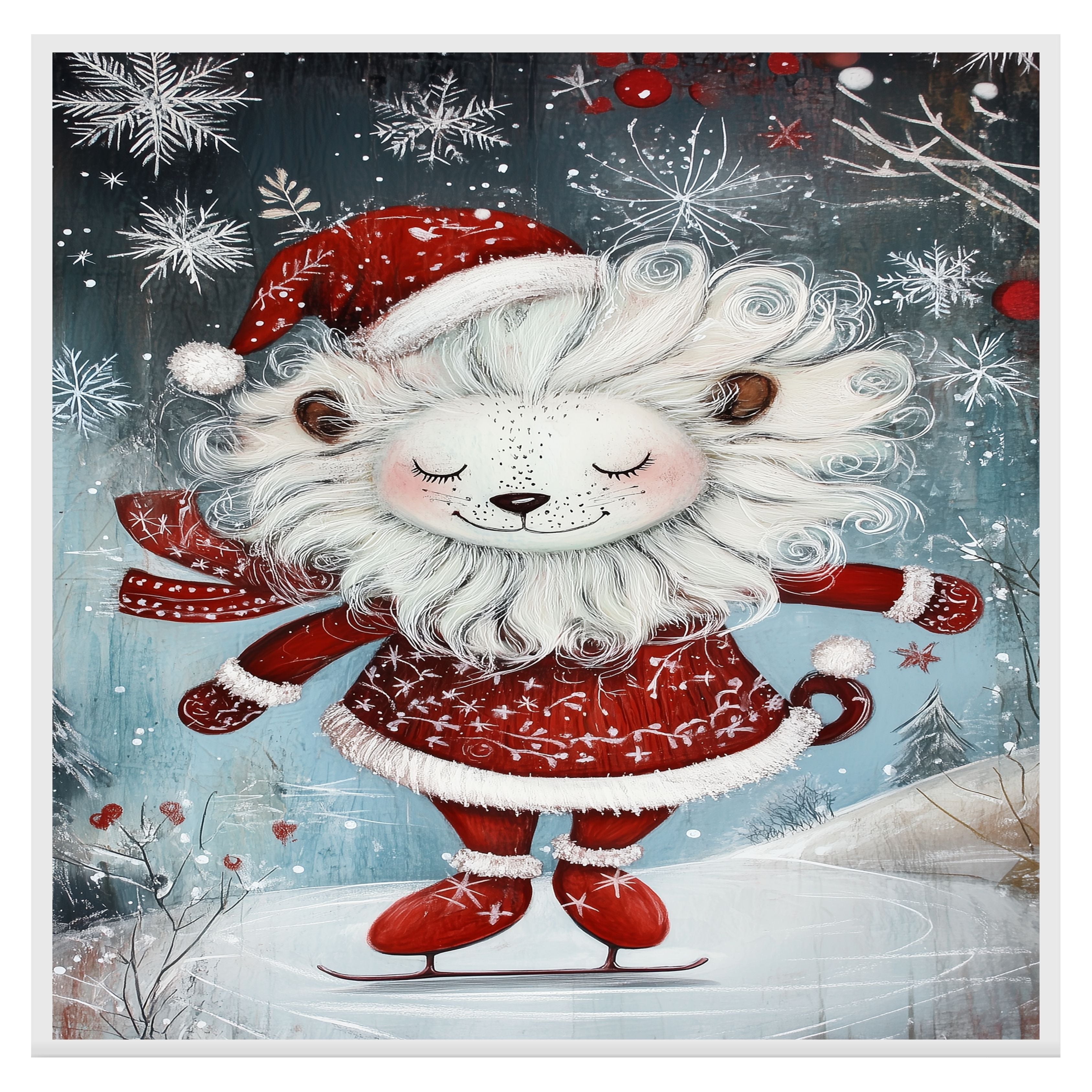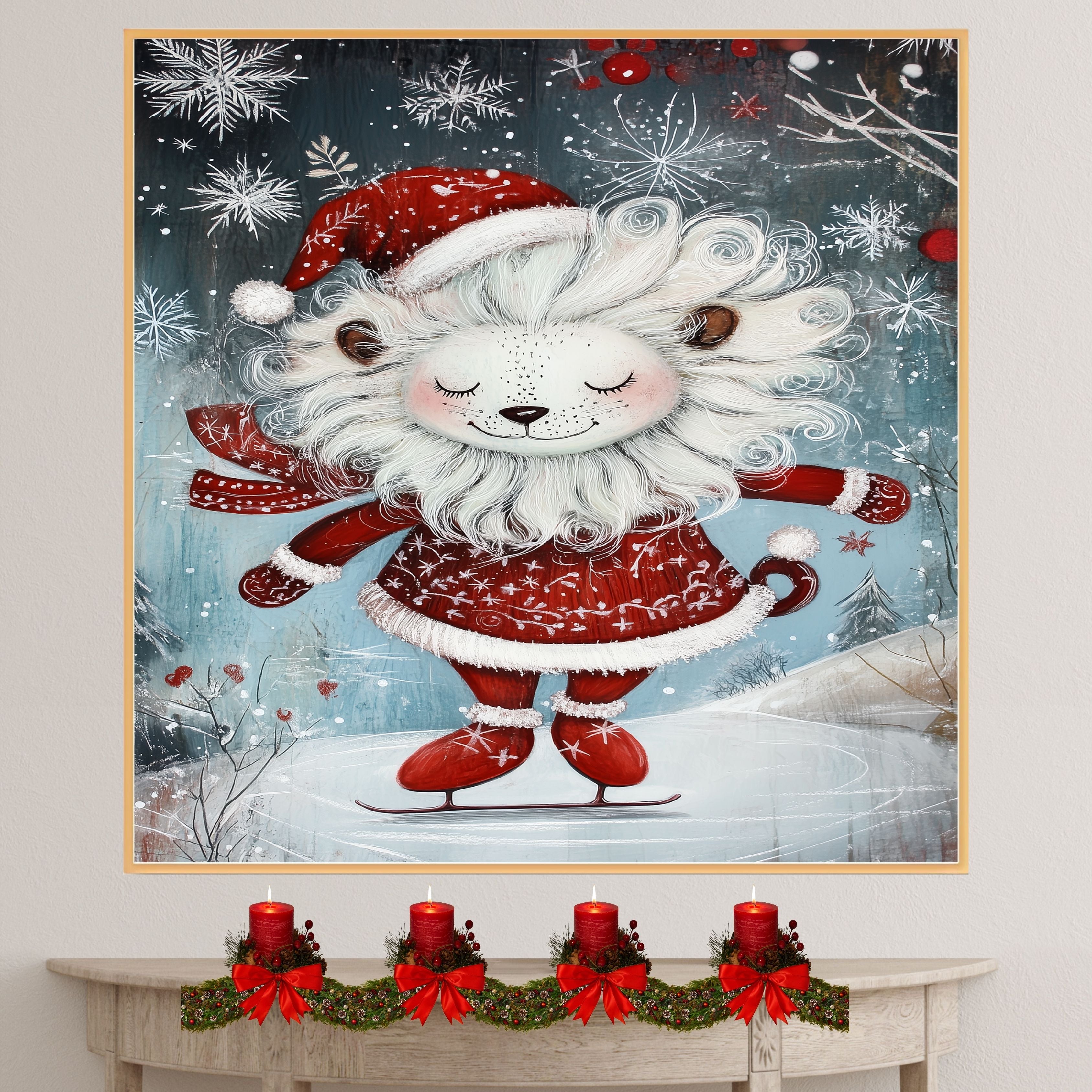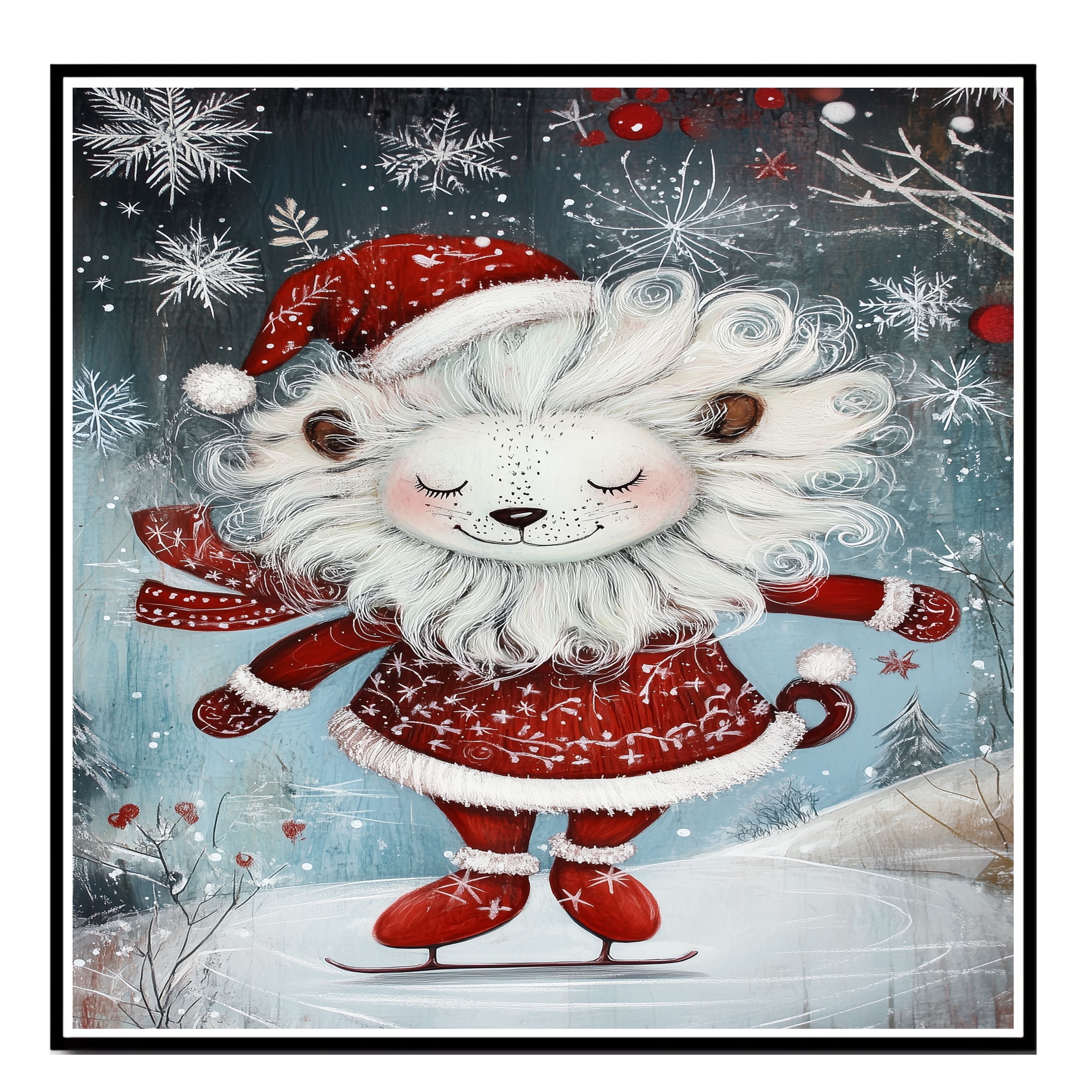This dreamy winter scene features a serene lion gliding across the ice in a detailed red snowflake coat and Santa hat, with a glorious white mane swirling in motion. A heartwarming piece perfect for nursery walls, holiday gifts, or cozy Christmas home accents.