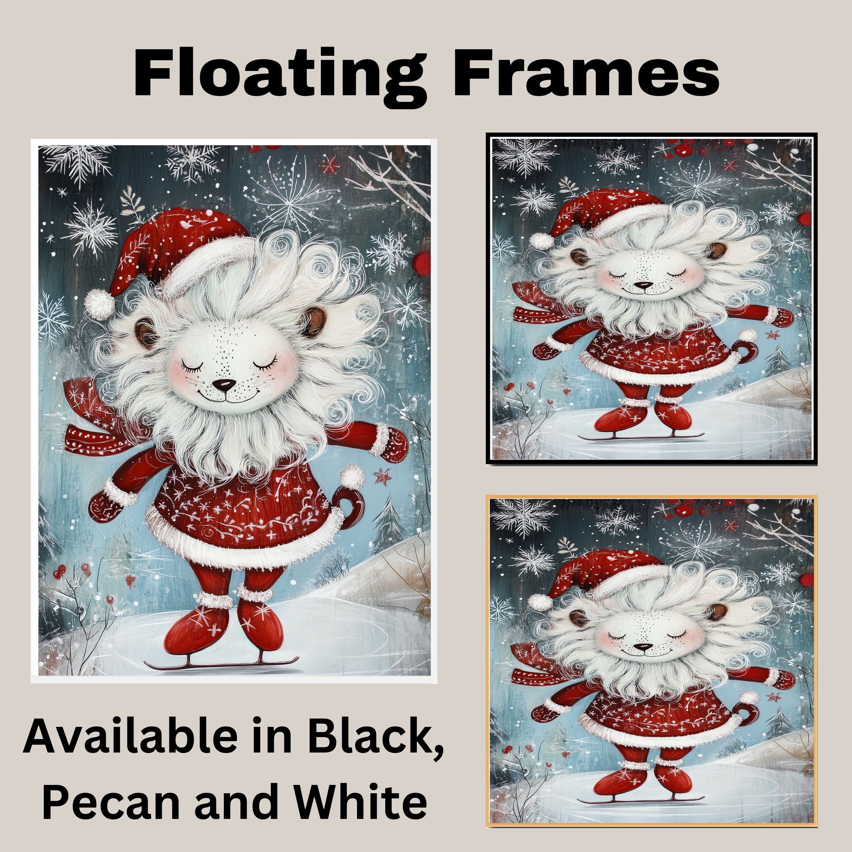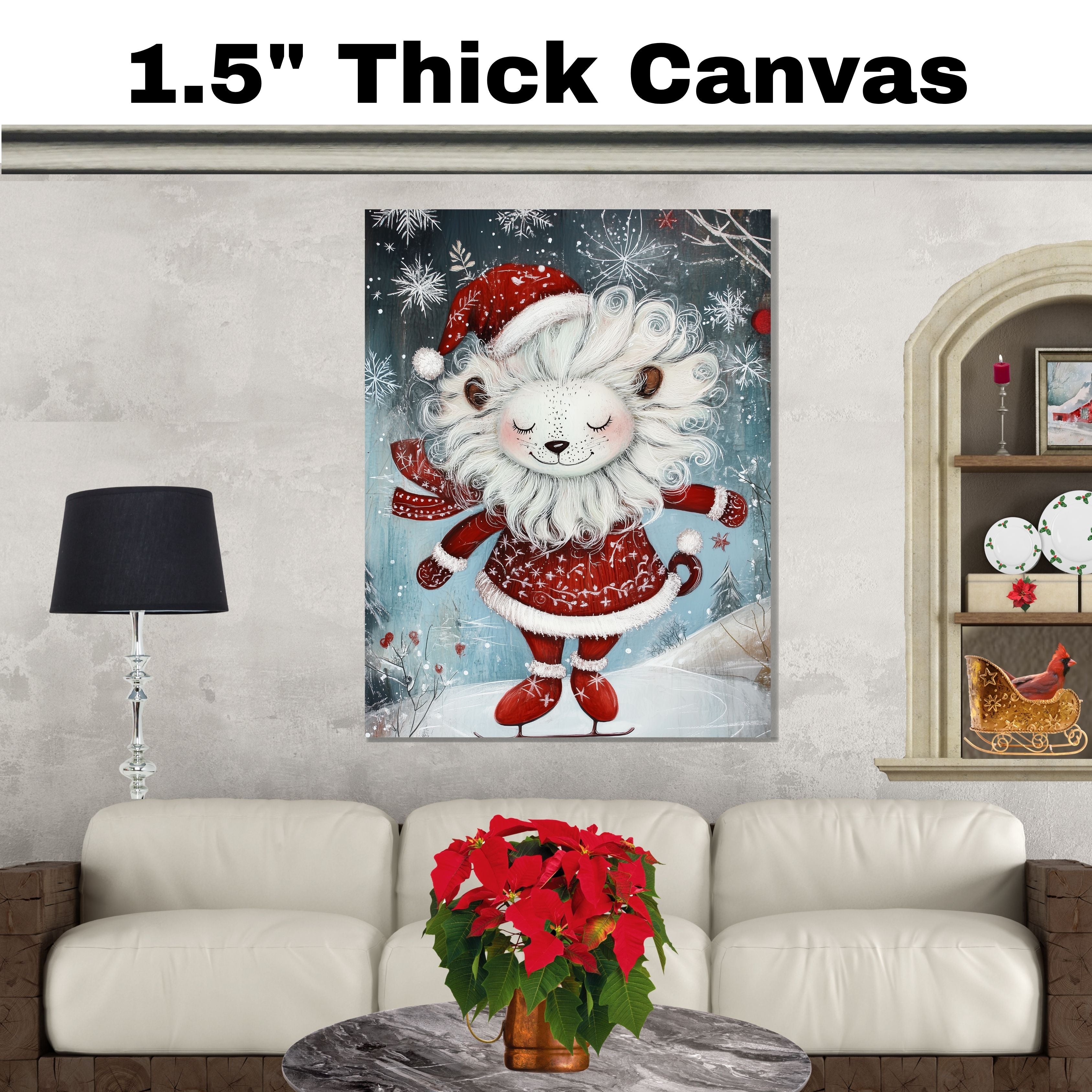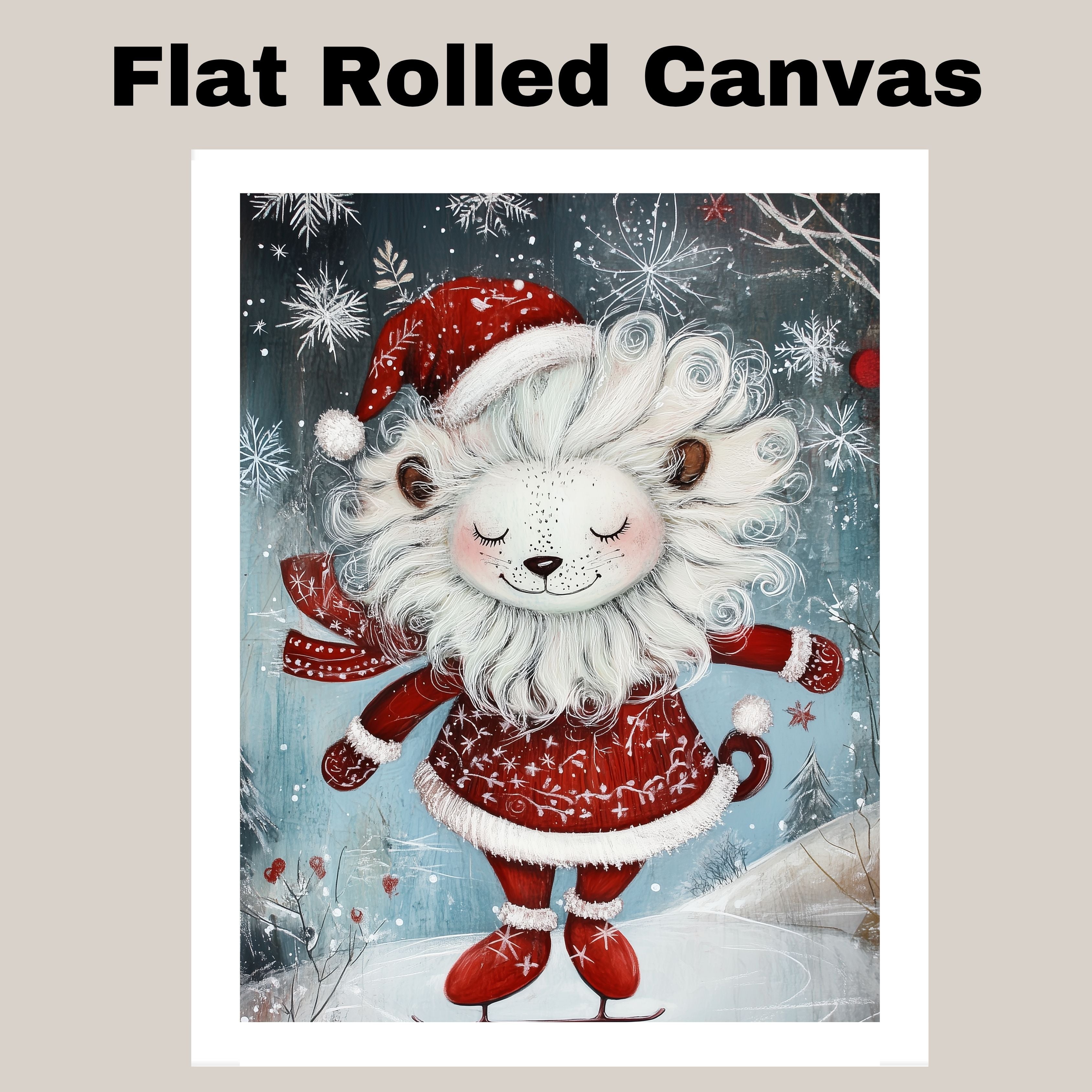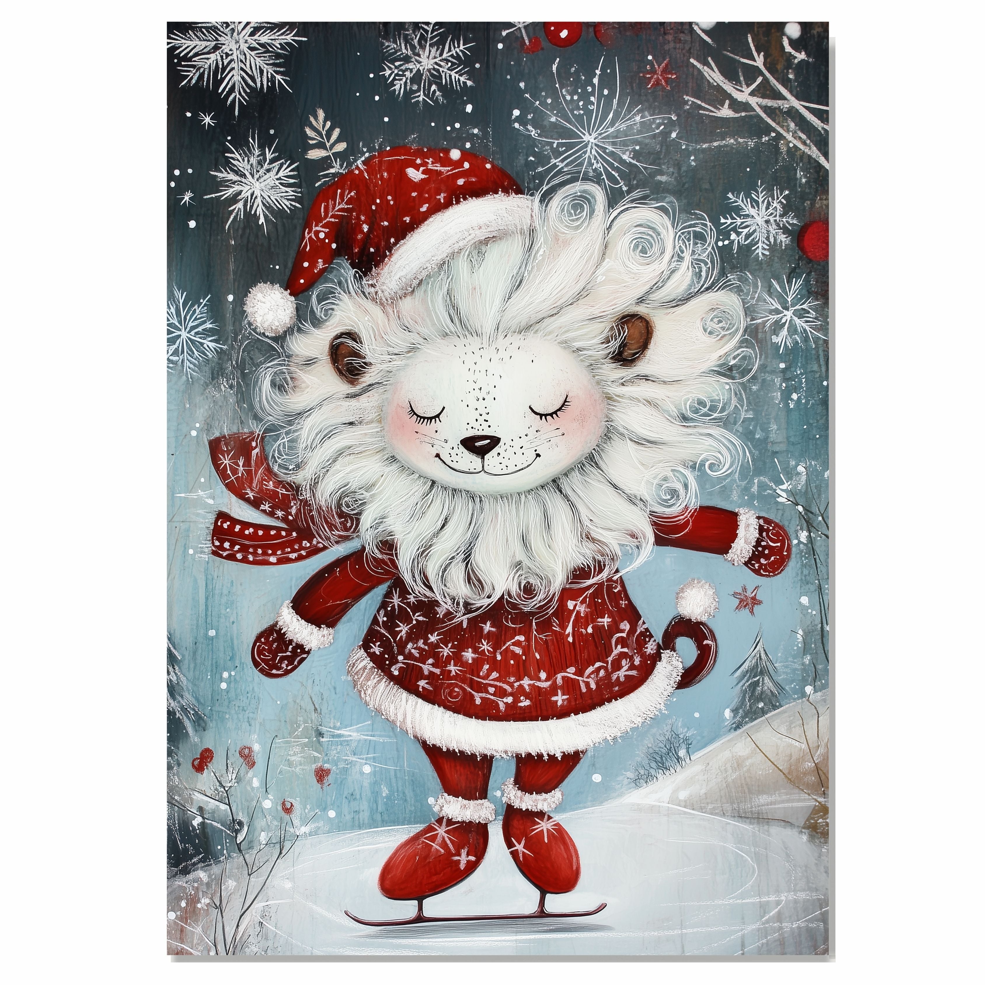 This dreamy winter scene features a serene lion gliding across the ice in a detailed red snowflake coat and Santa hat, with a glorious white mane swirling in motion. A heartwarming piece perfect for nursery walls, holiday gifts, or cozy Christmas home accents.