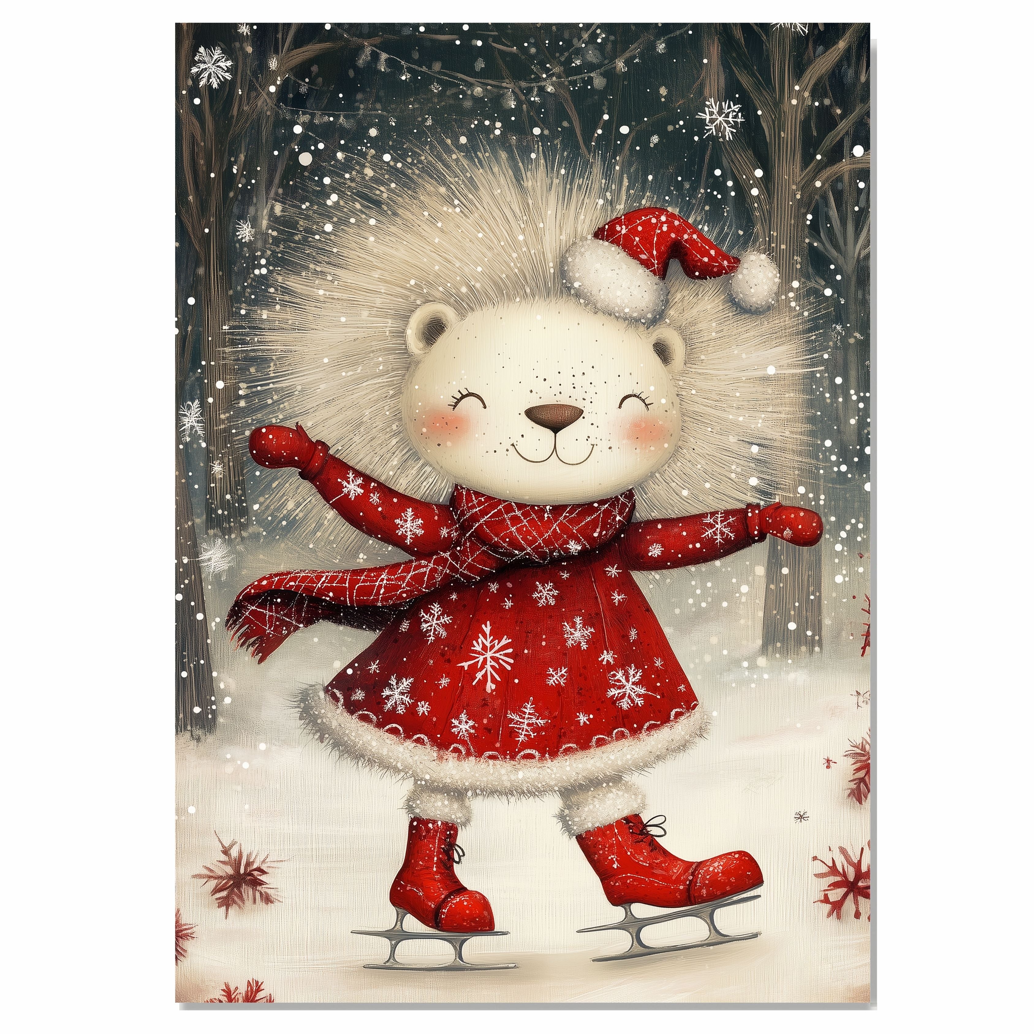This heartwarming illustration captures a cheerful lion skating joyfully through a snowy forest, dressed in a twirling red snowflake dress, scarf, and Santa hat. With its fluffy mane and glowing smile, this festive feline brings happiness to nursery decor, seasonal wall art, or heartfelt holiday gifts.