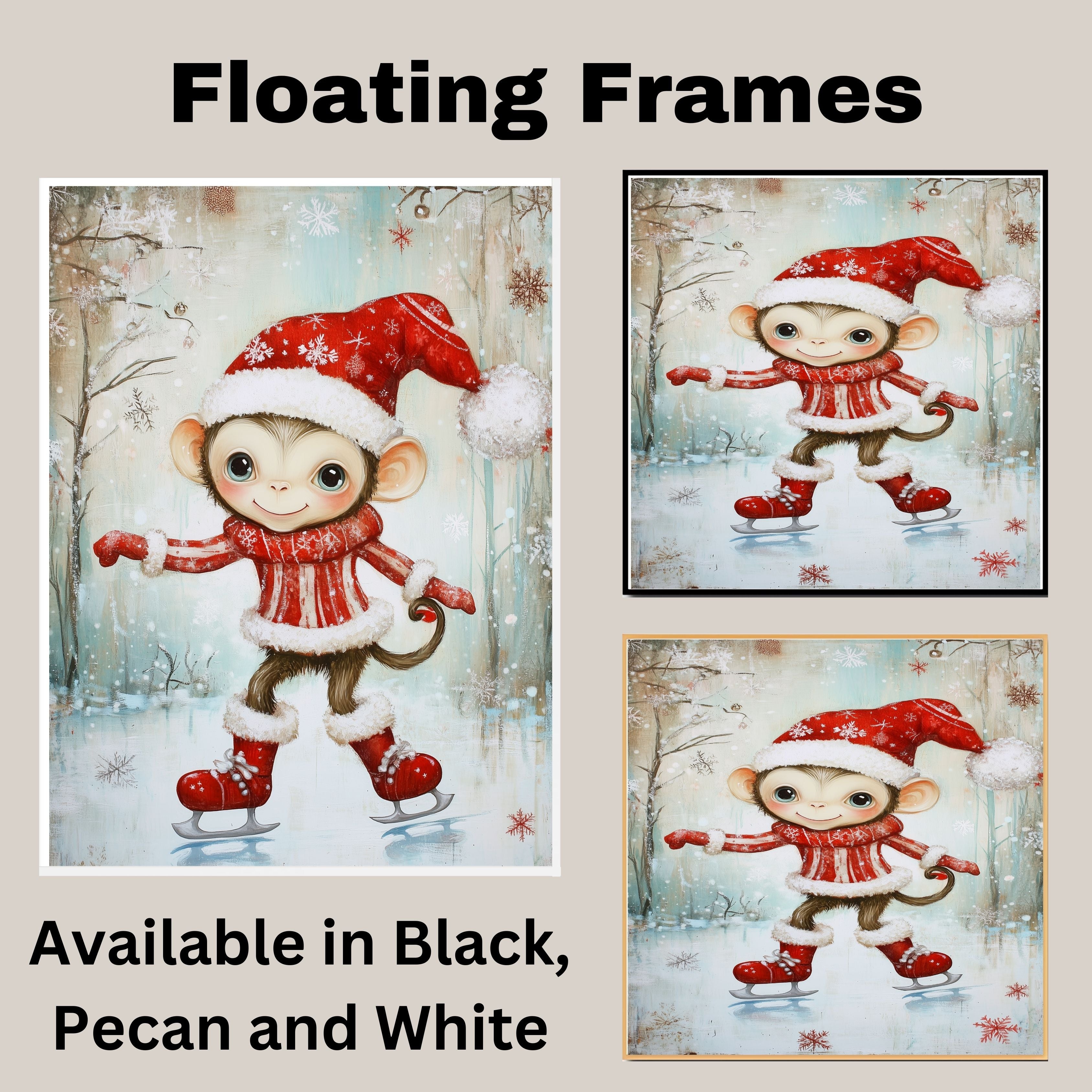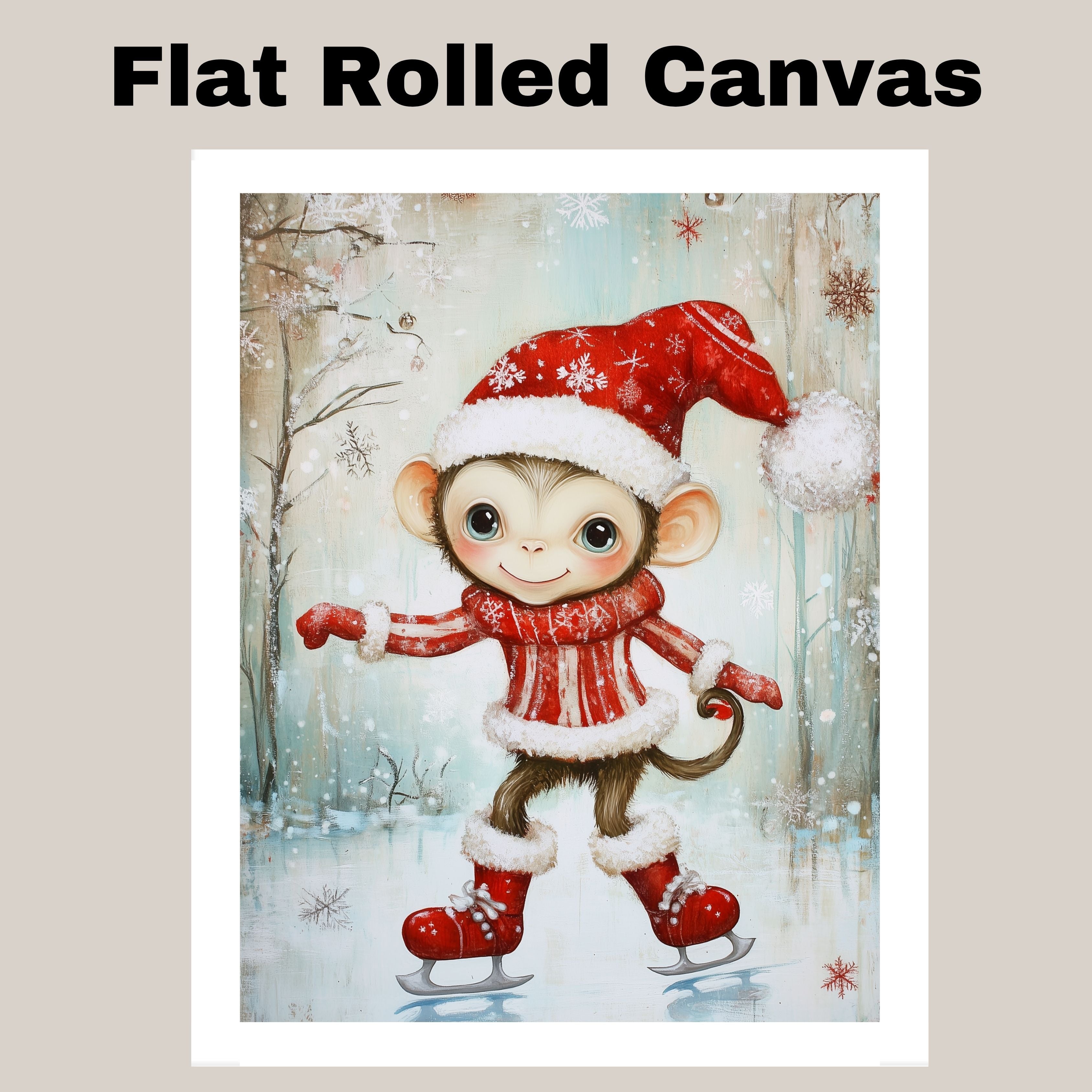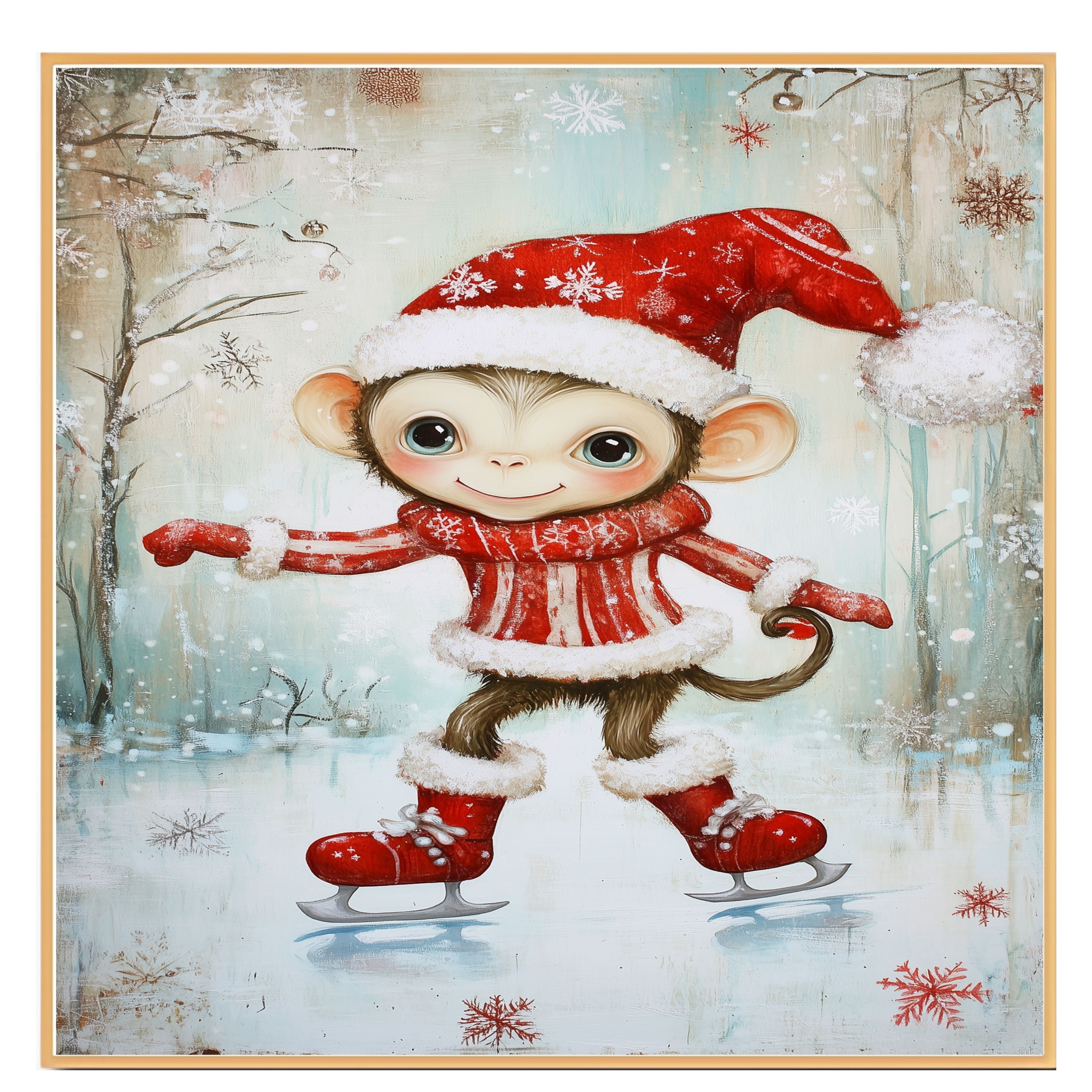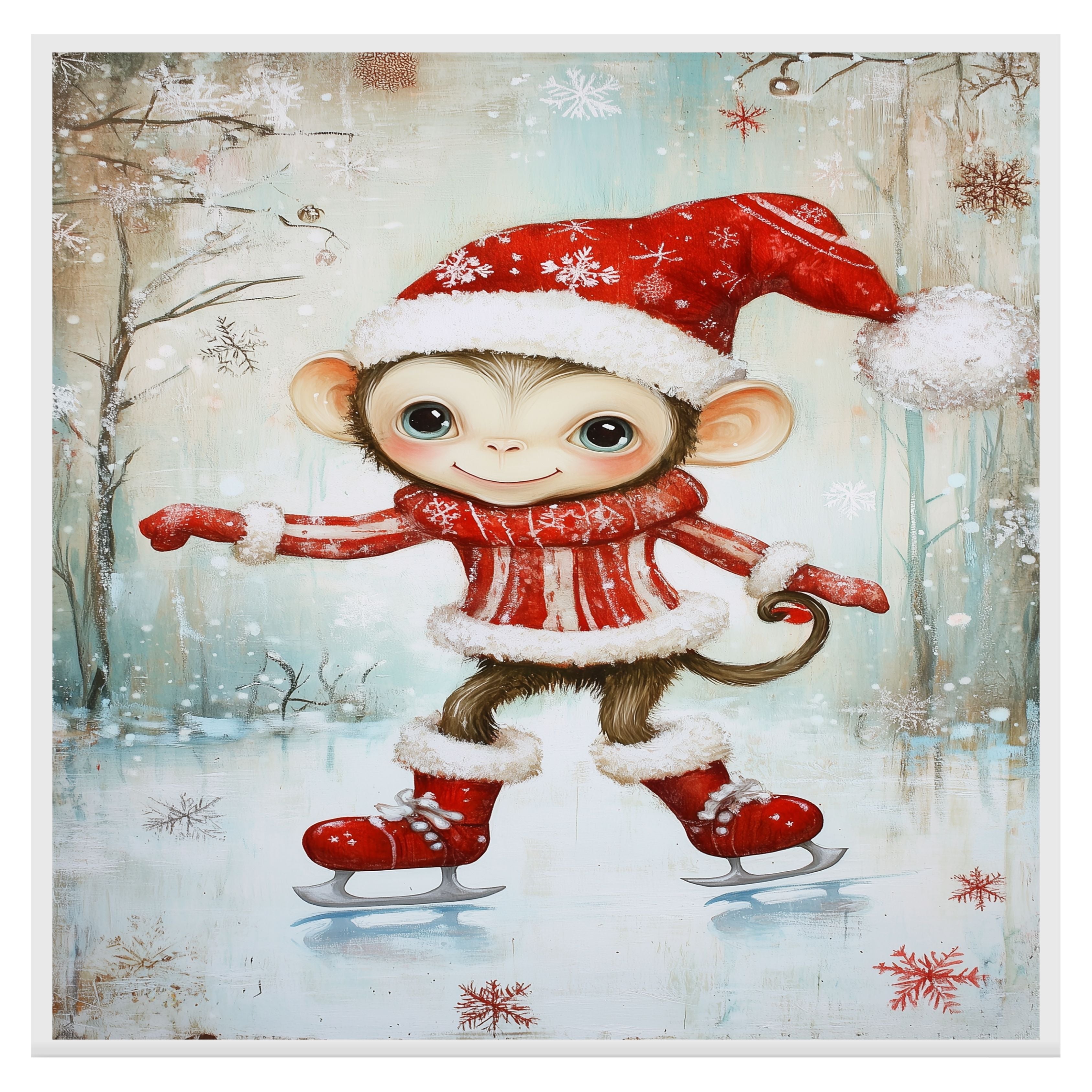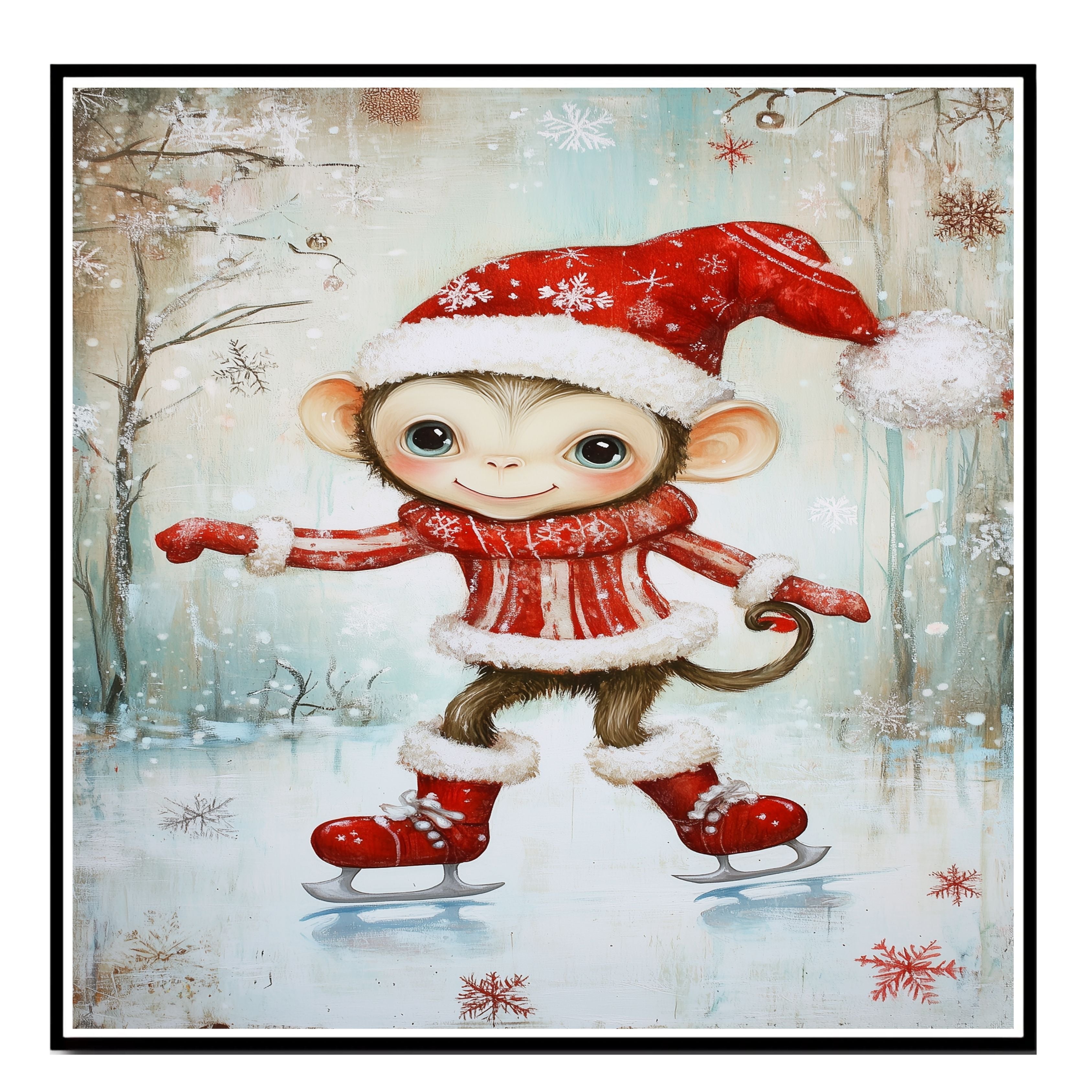 This fun and festive artwork features an adorable monkey gliding across the ice in a red striped sweater, Santa hat, and fluffy boots. With bright eyes and a joyful pose, this illustration is perfect for kids' rooms, holiday decor, or gifting with a smile.