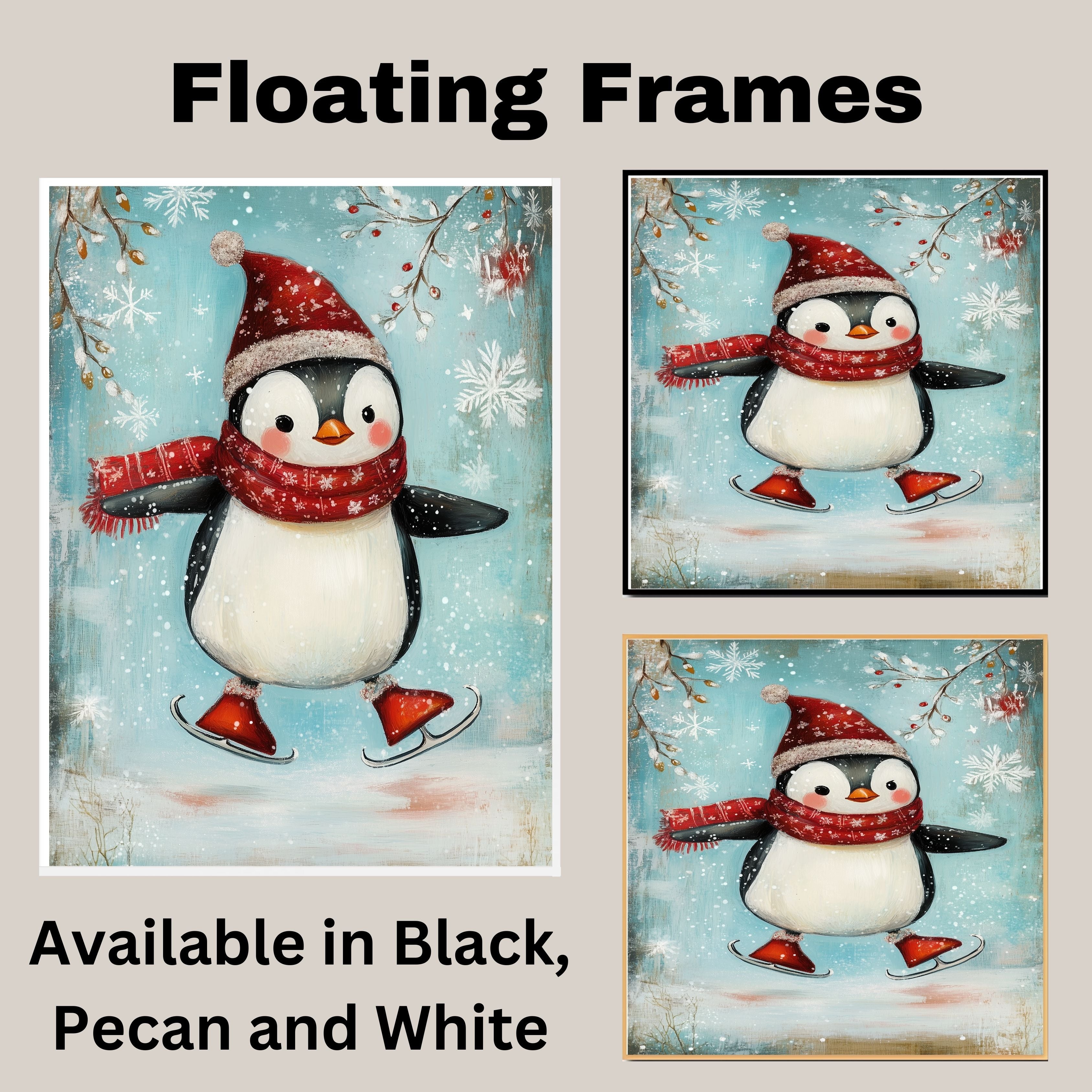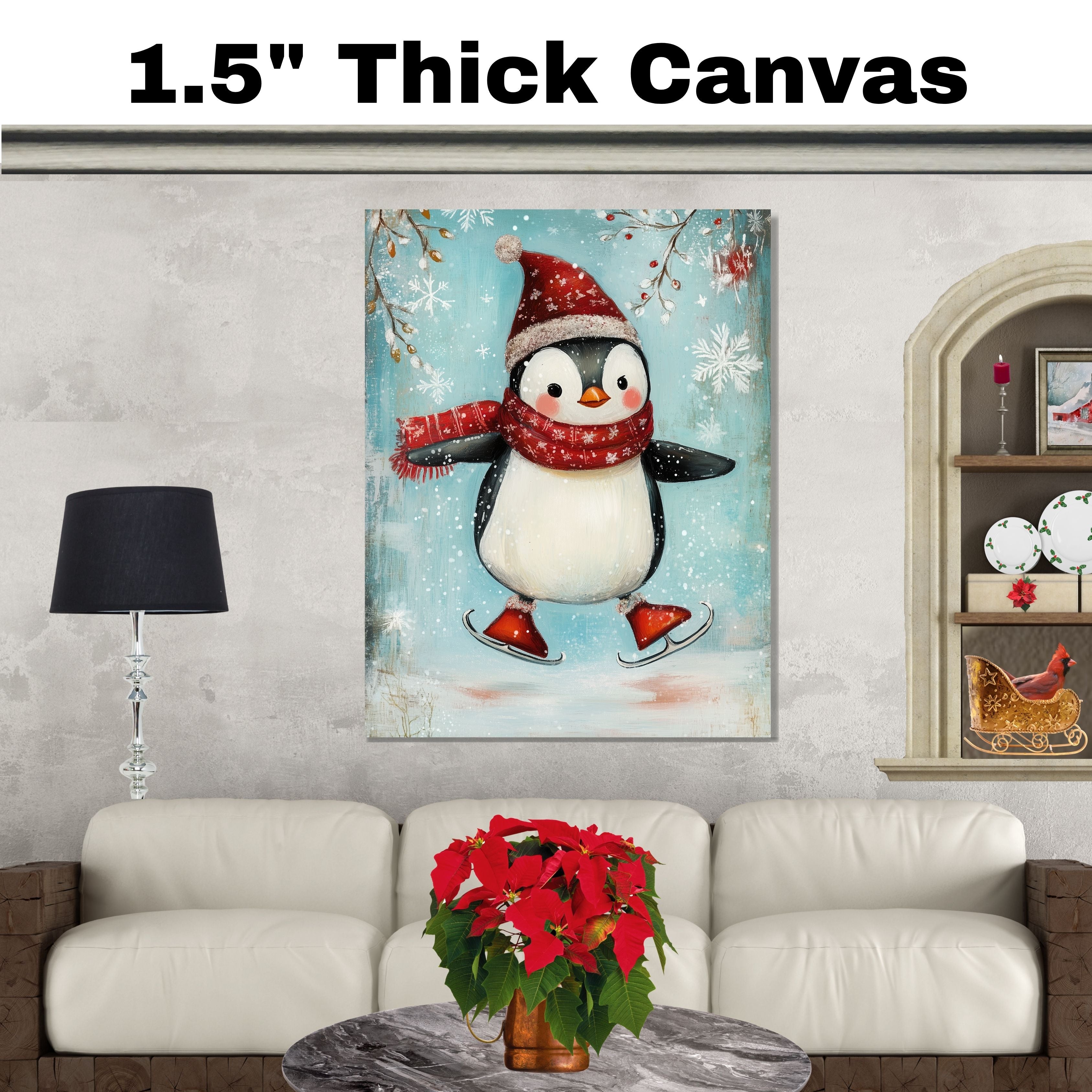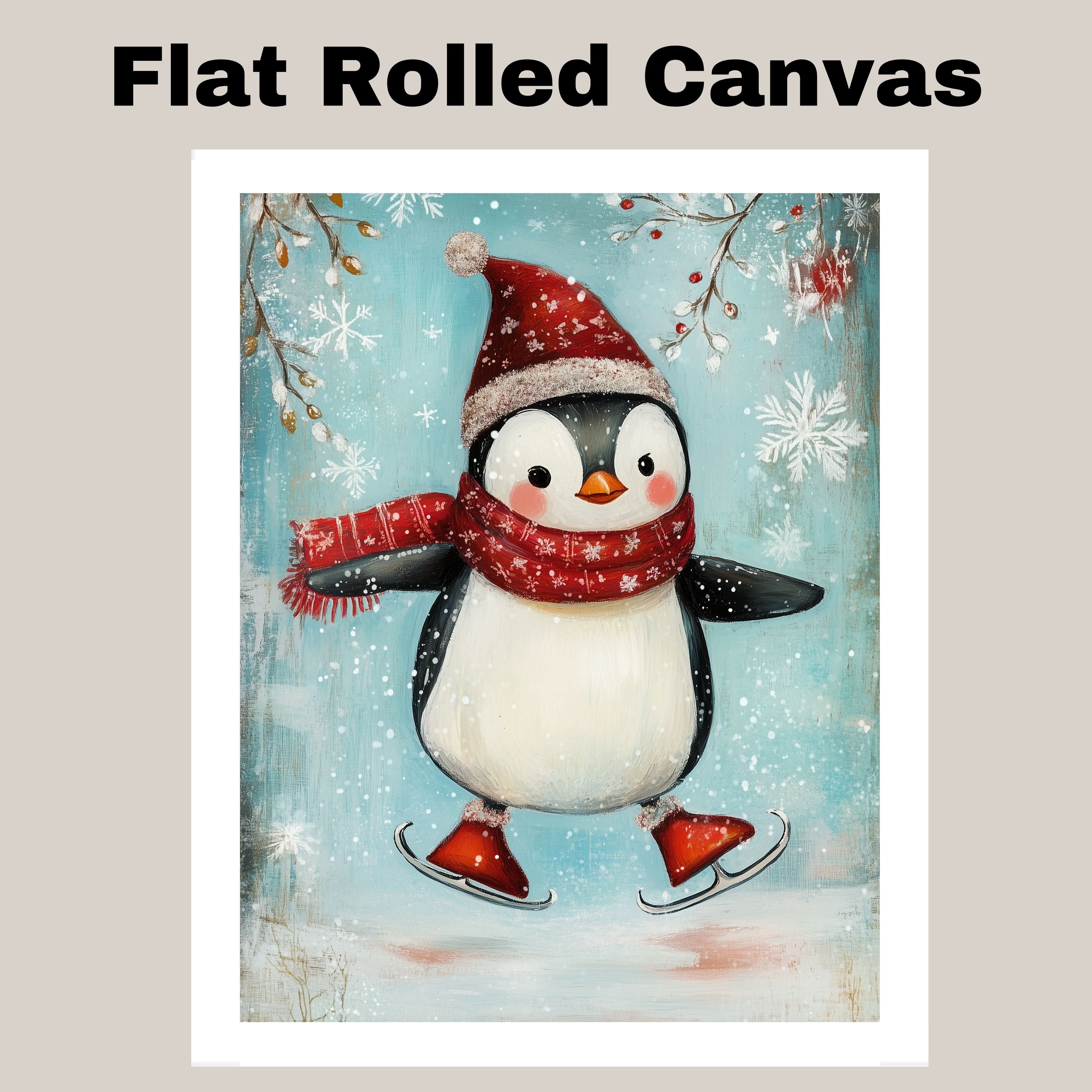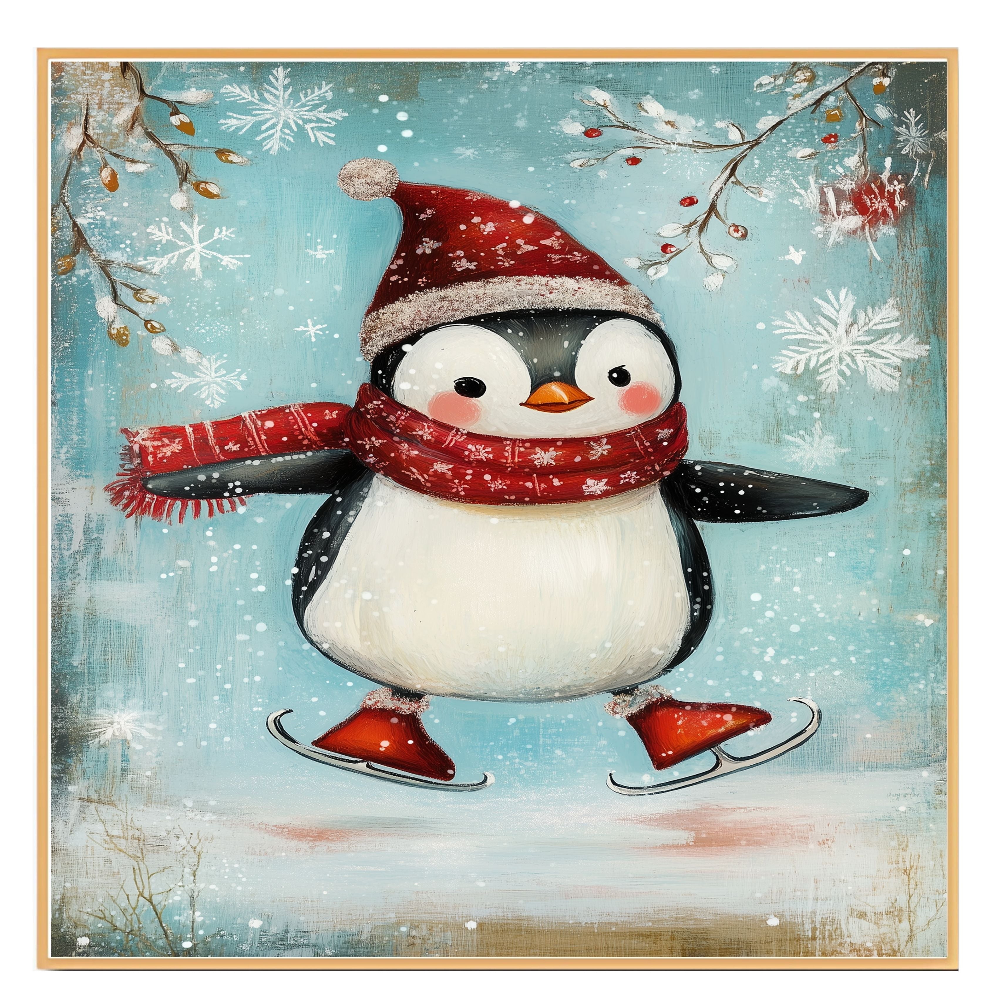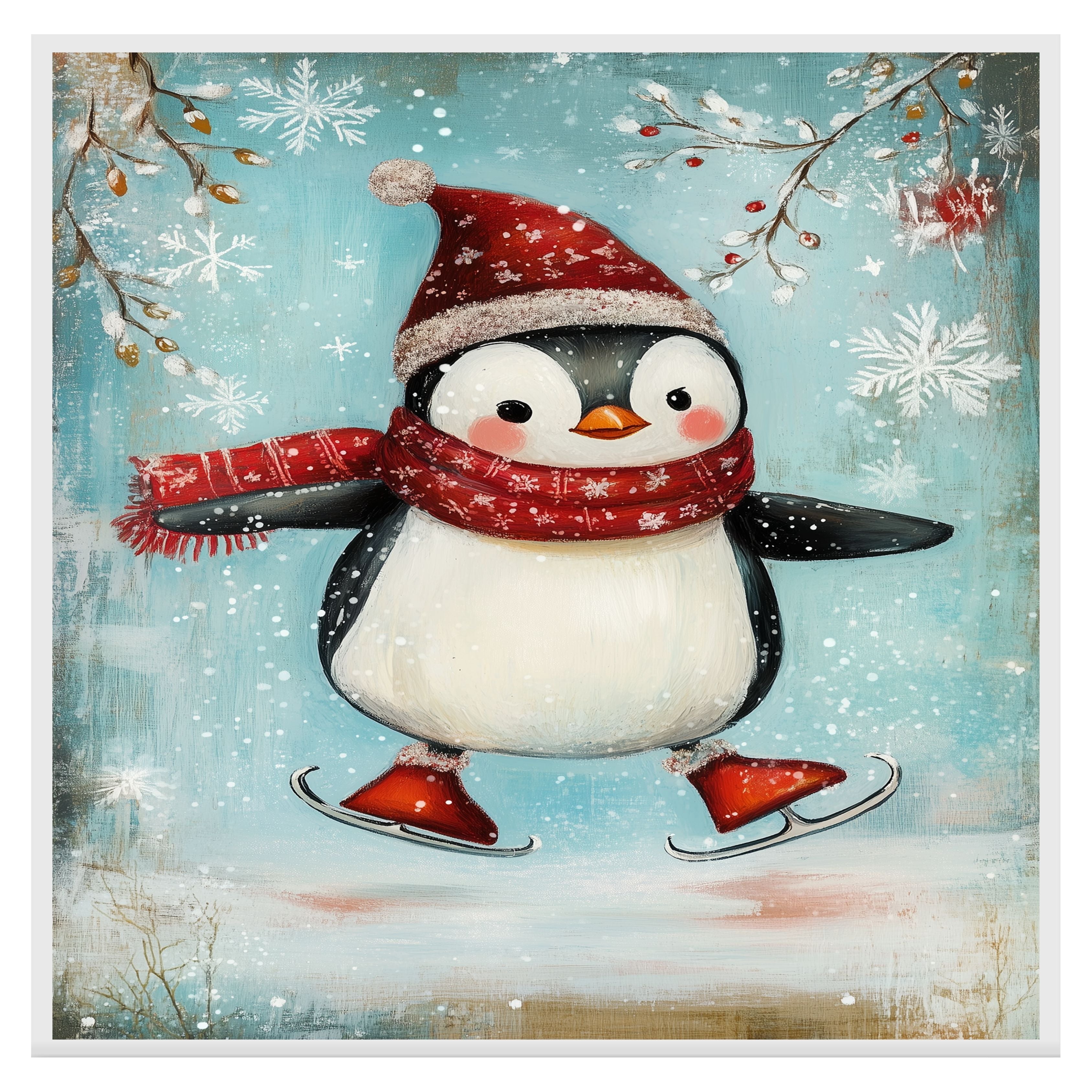 Whimsical Christmas Penguin Ice Skating in Red Scarf and Santa Hat – Cheerful Holiday Animal Art for Winter Nursery Decor, Gifts, or Seasonal Wall Accents on Ready to Hang 1.5" Thick Canvas Wrap, Floating Framed Canvas, Flat Rolled Canvas