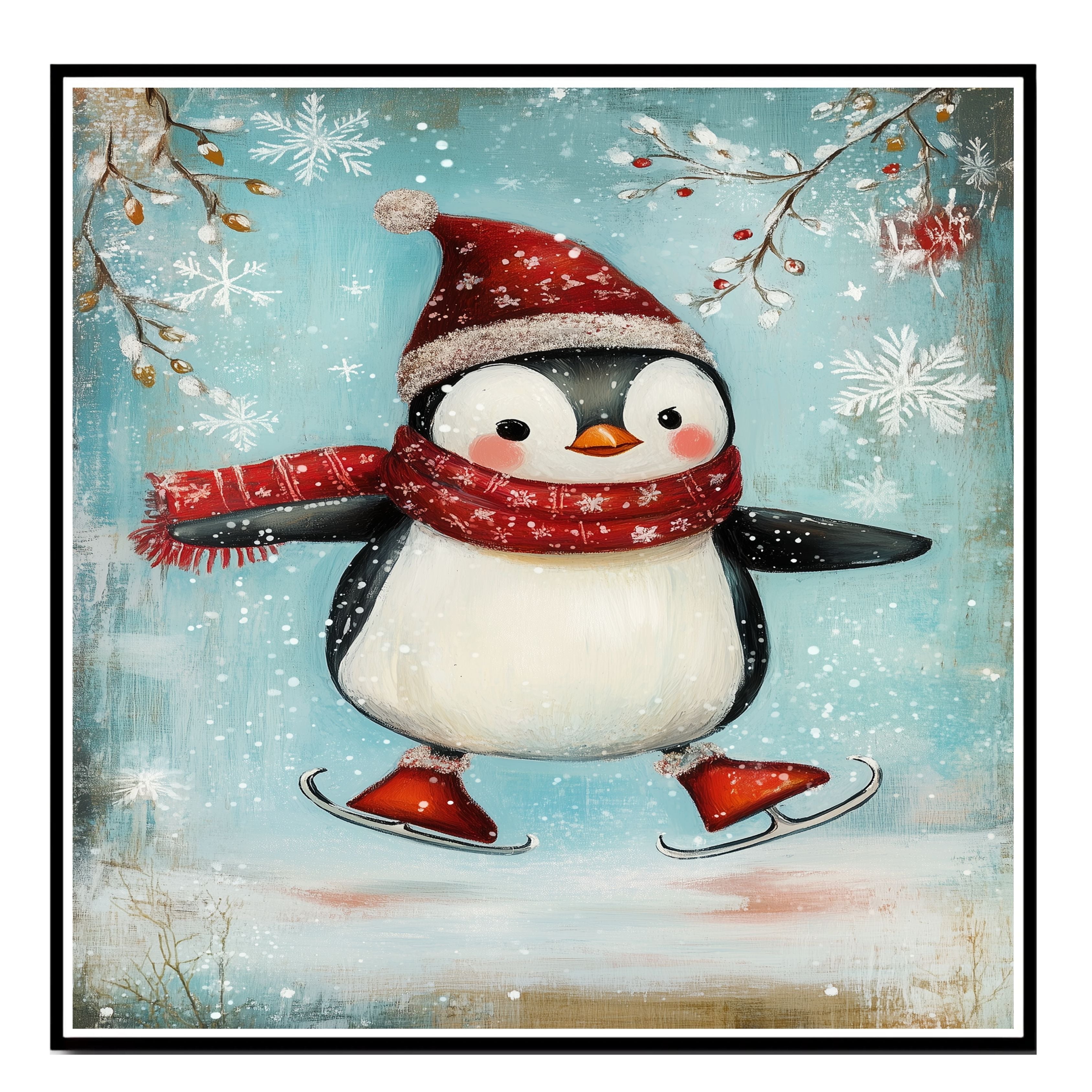 This adorable illustration features a happy penguin mid-skate, bundled in a red scarf and Santa hat as snowflakes dance through the air. With a playful winter palette and charming smile, it’s the perfect piece for nursery walls, holiday gifting, or cozy seasonal displays.