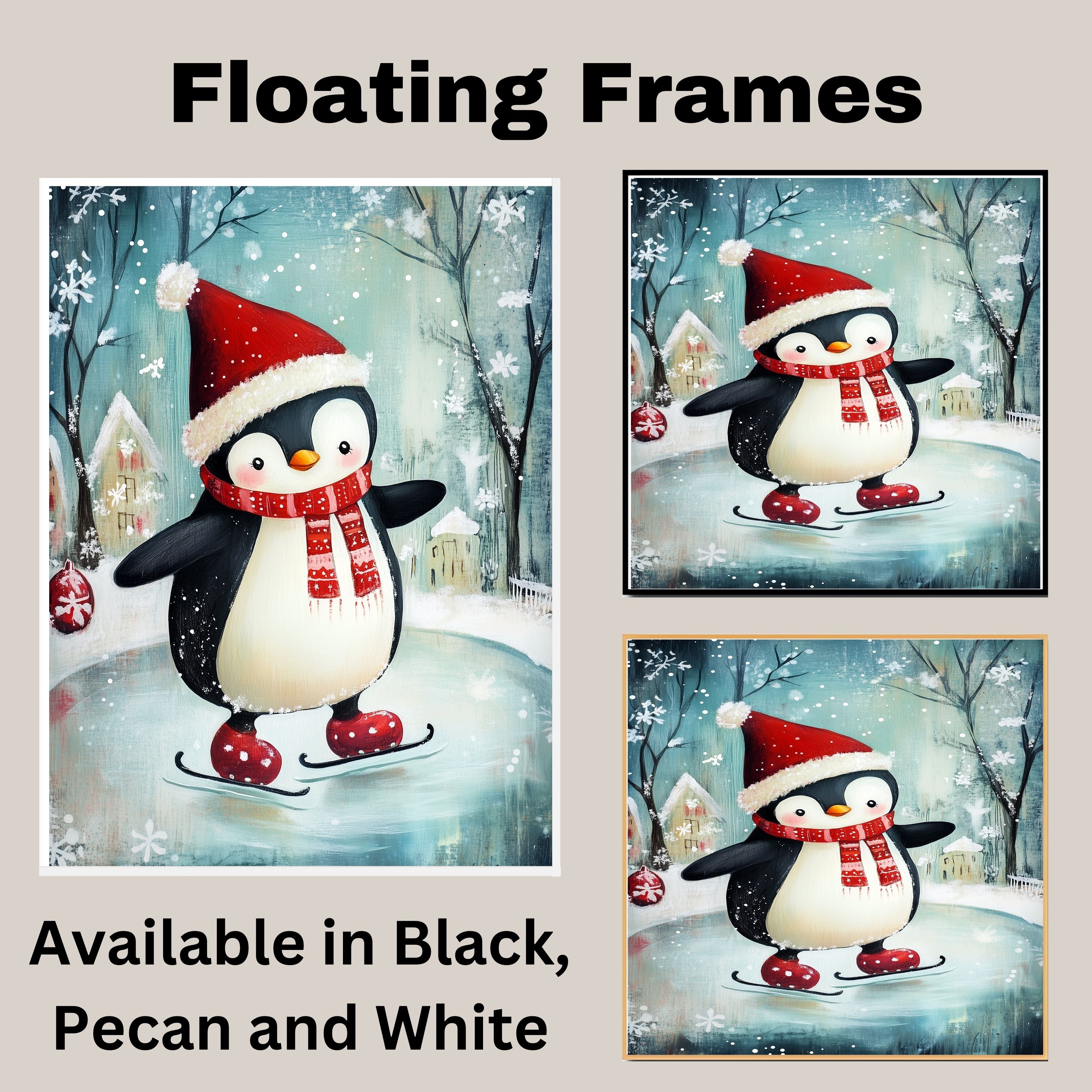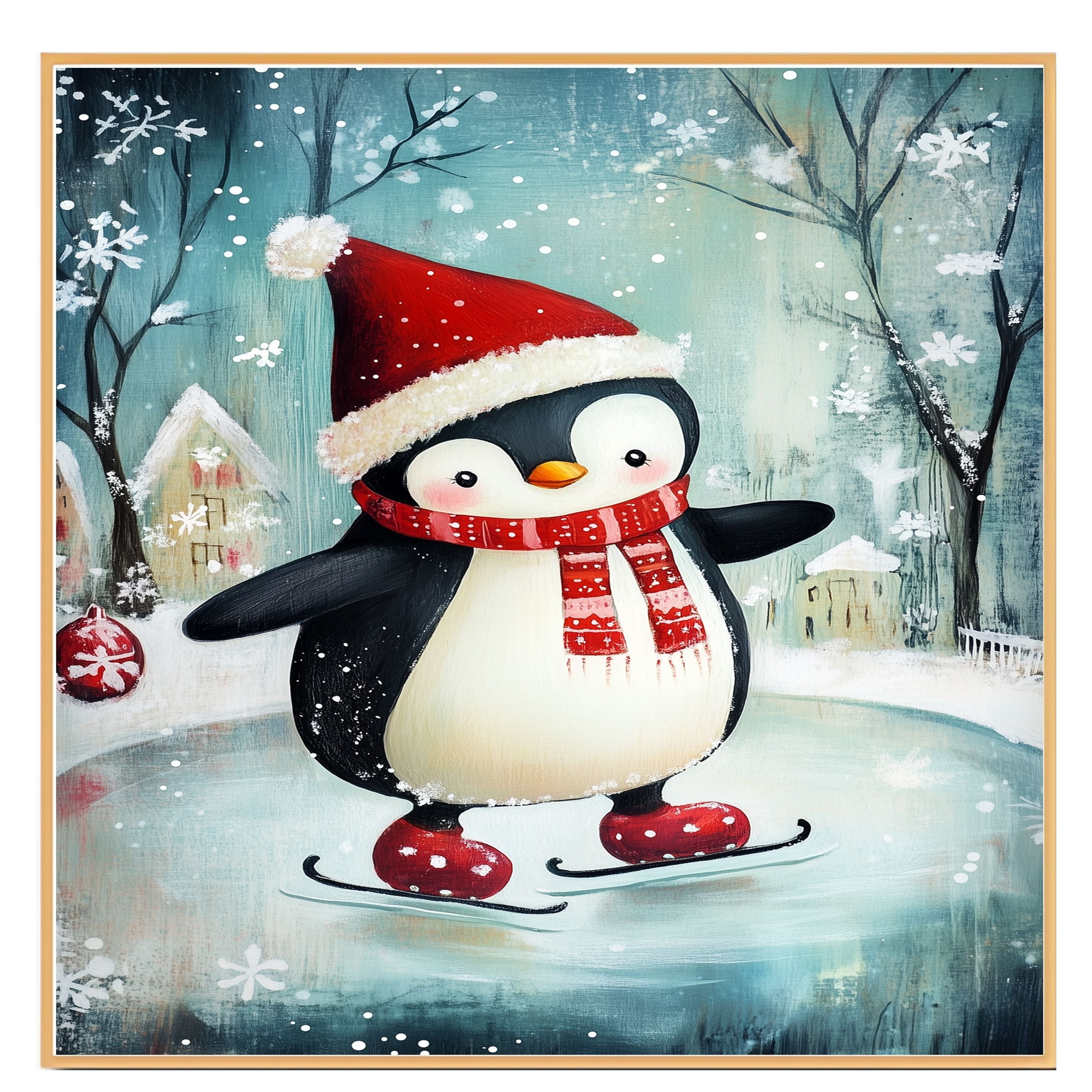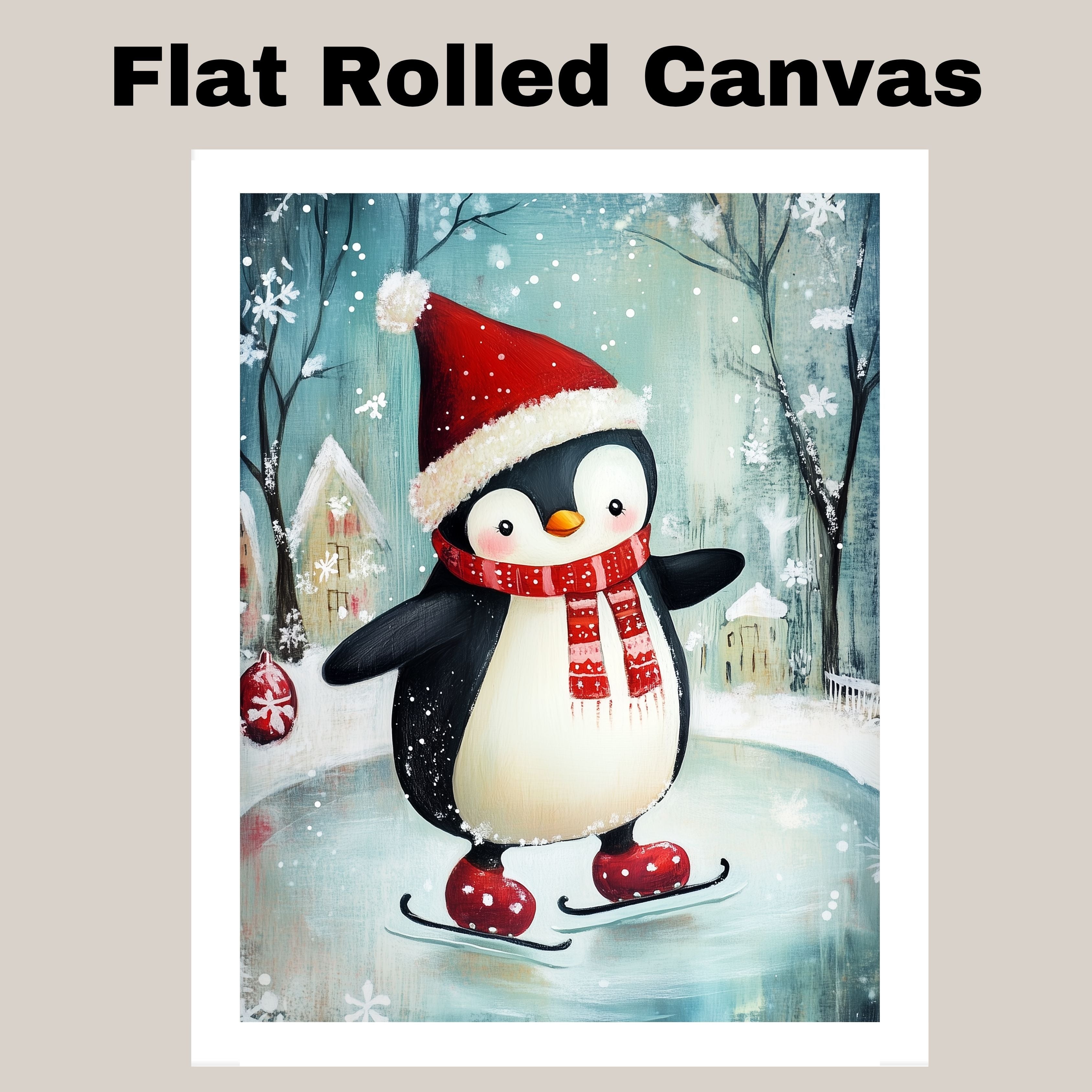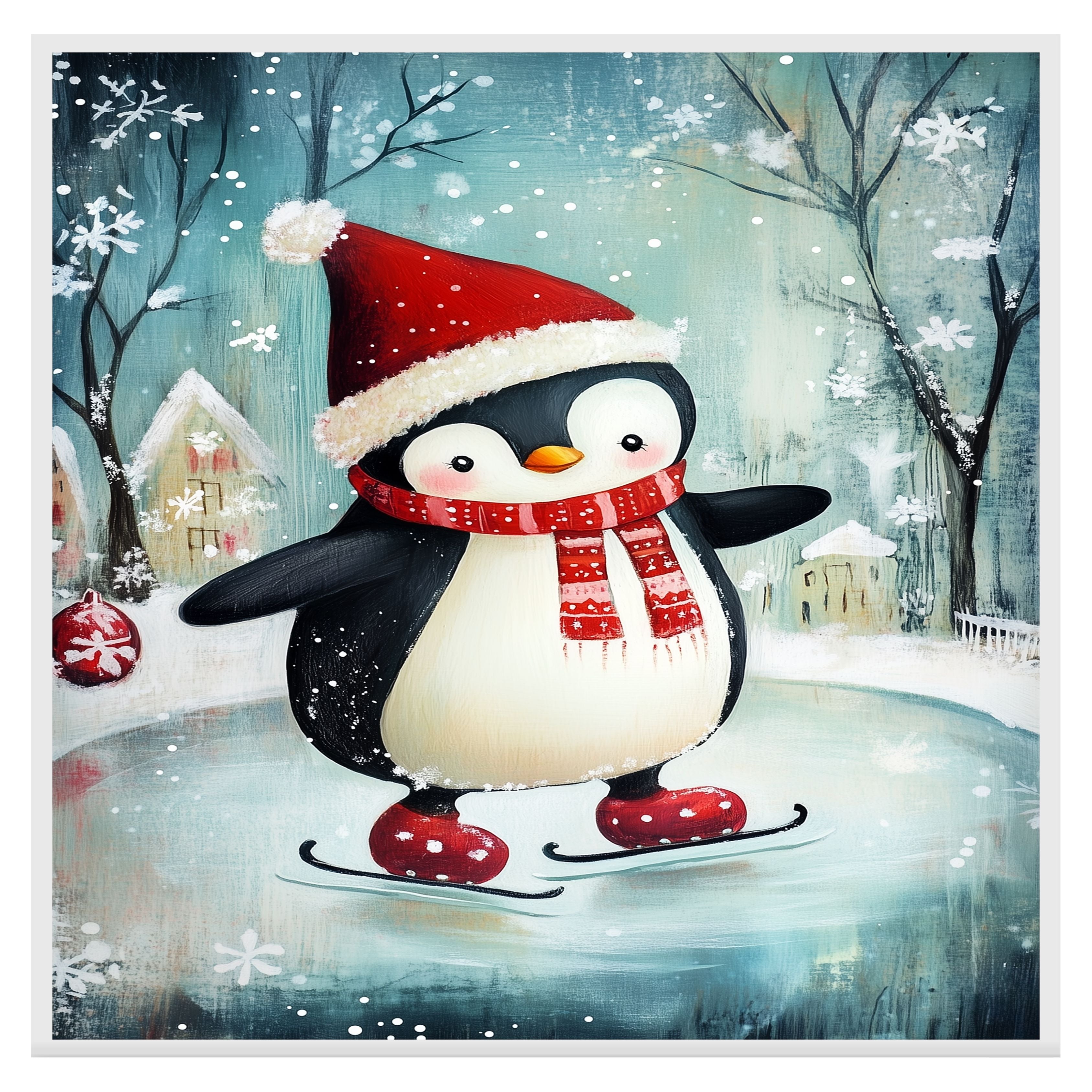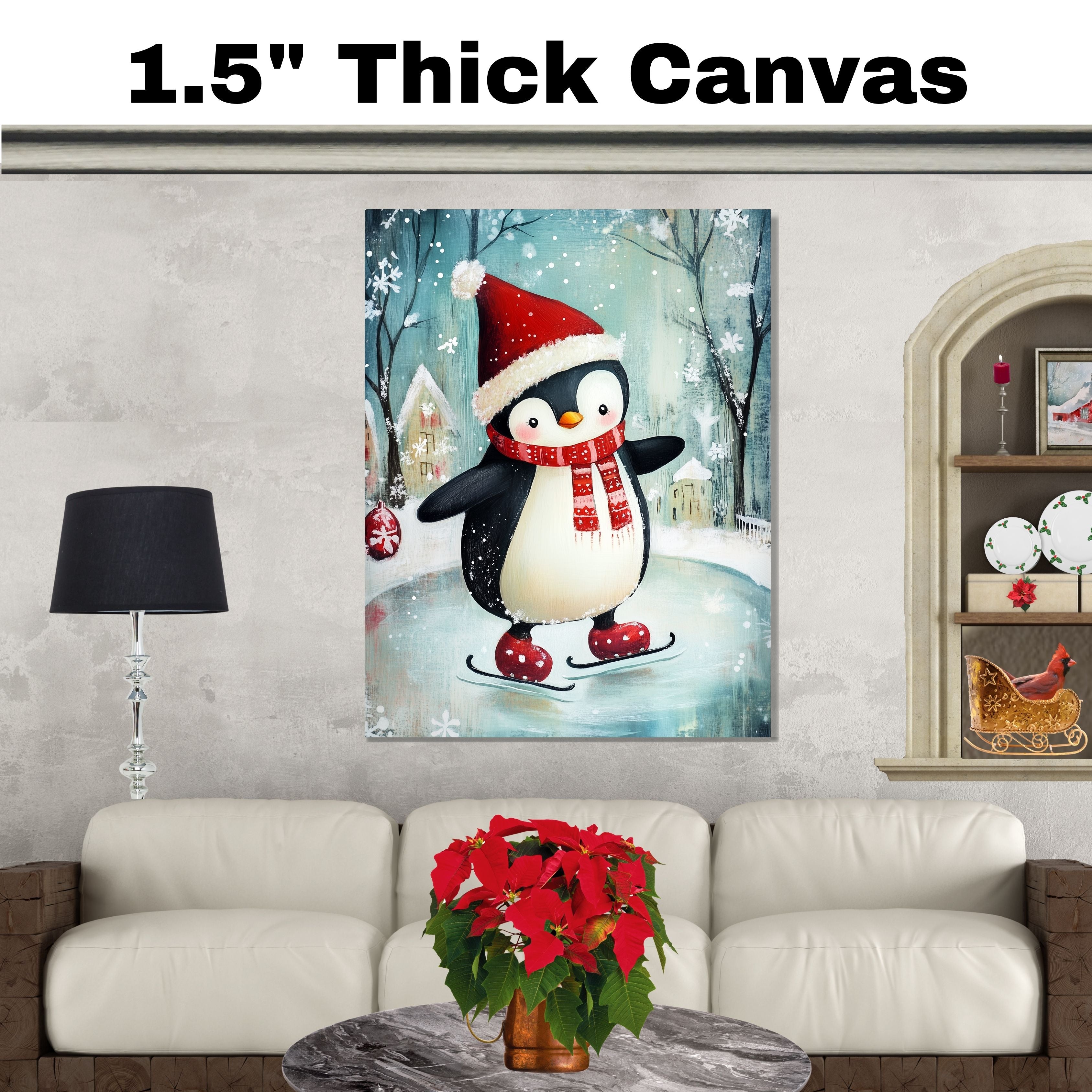 Whimsical Christmas Penguin Ice Skating with Santa Hat and Red Scarf – Holiday Winter Animal Art for Nursery, Kids’ Room, Gifts, or Seasonal Wall Display on Ready to Hang 1.5" Thick Canvas Wrap, Floating Framed Canvas, Flat Rolled Canvas