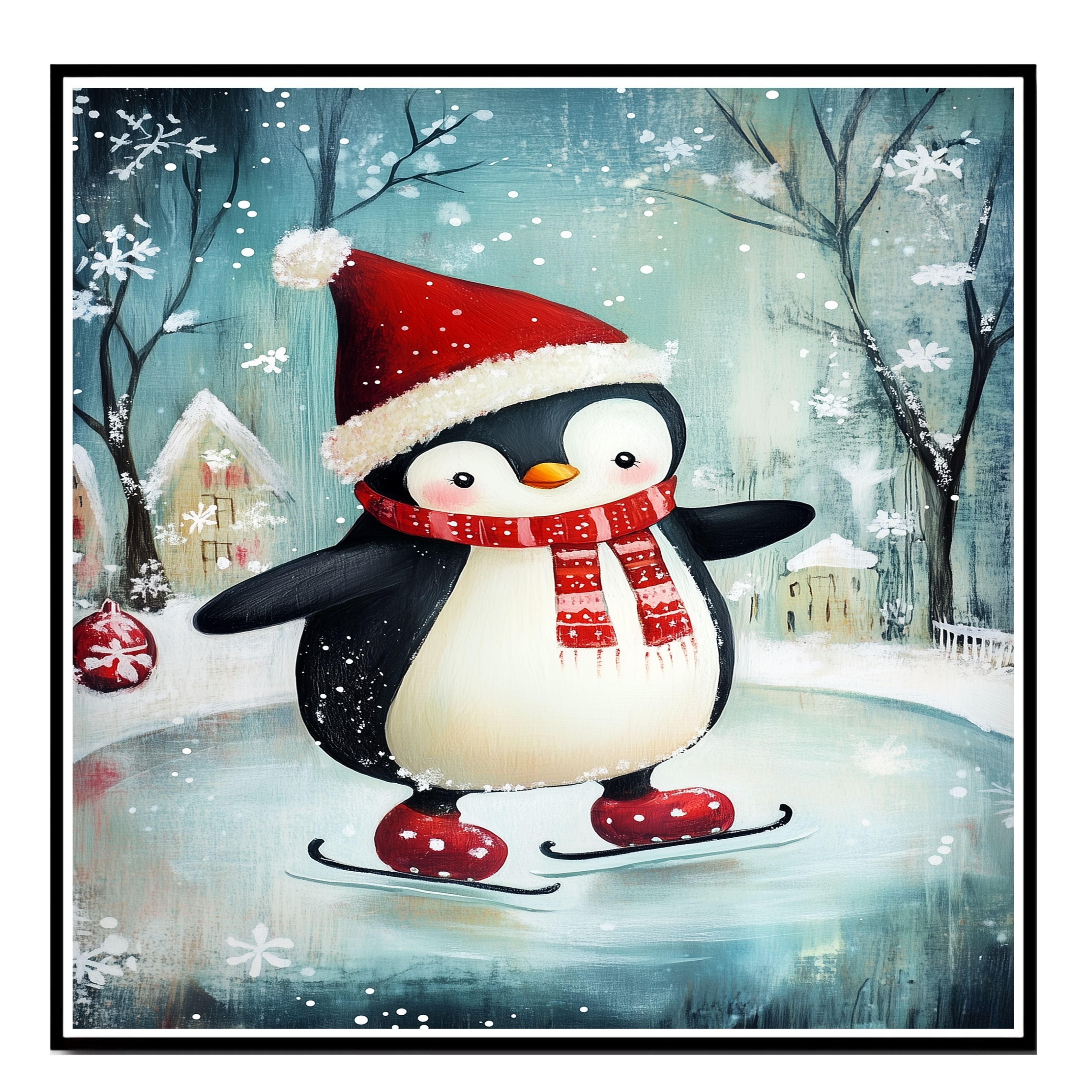 This festive penguin glides gracefully across a wintery pond, bundled in a red polka-dot scarf and Santa hat. With warm village lights in the backdrop and softly falling snow, this magical holiday print is ideal for nursery decor, Christmas gifts, or cozy seasonal wall displays.