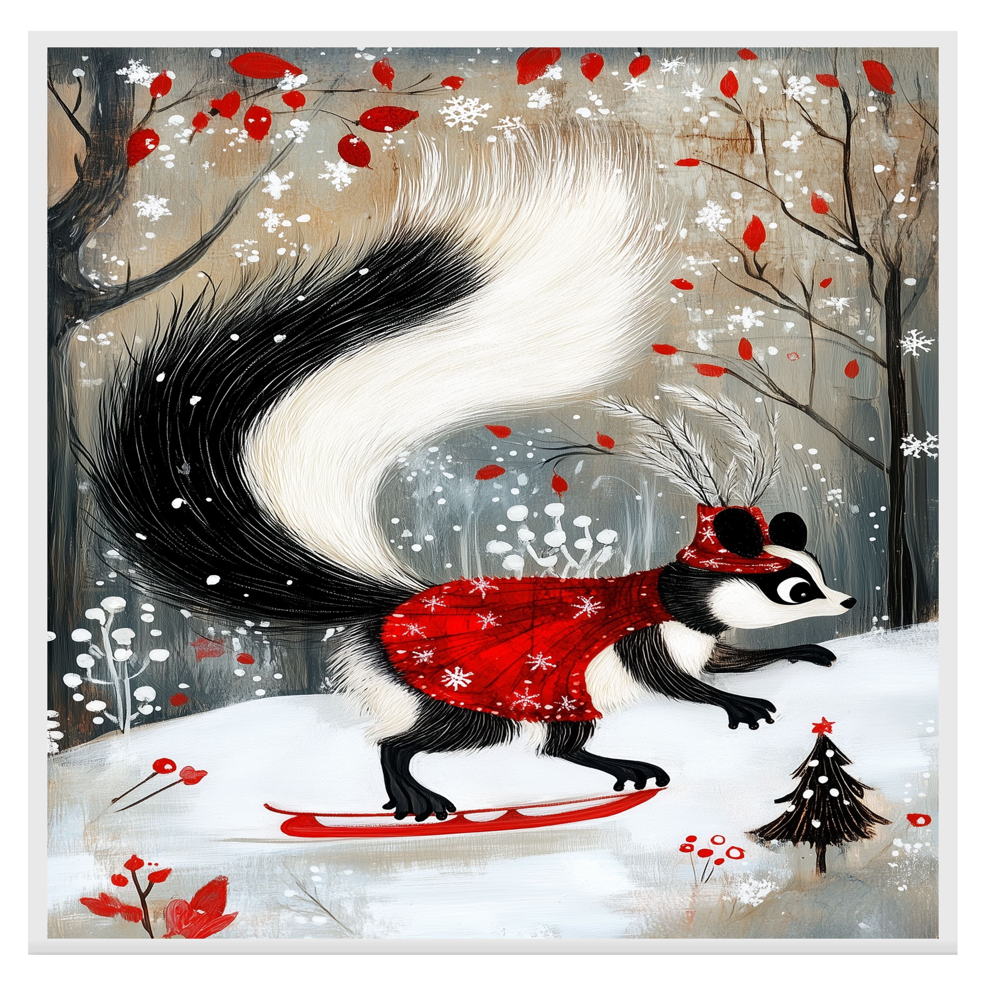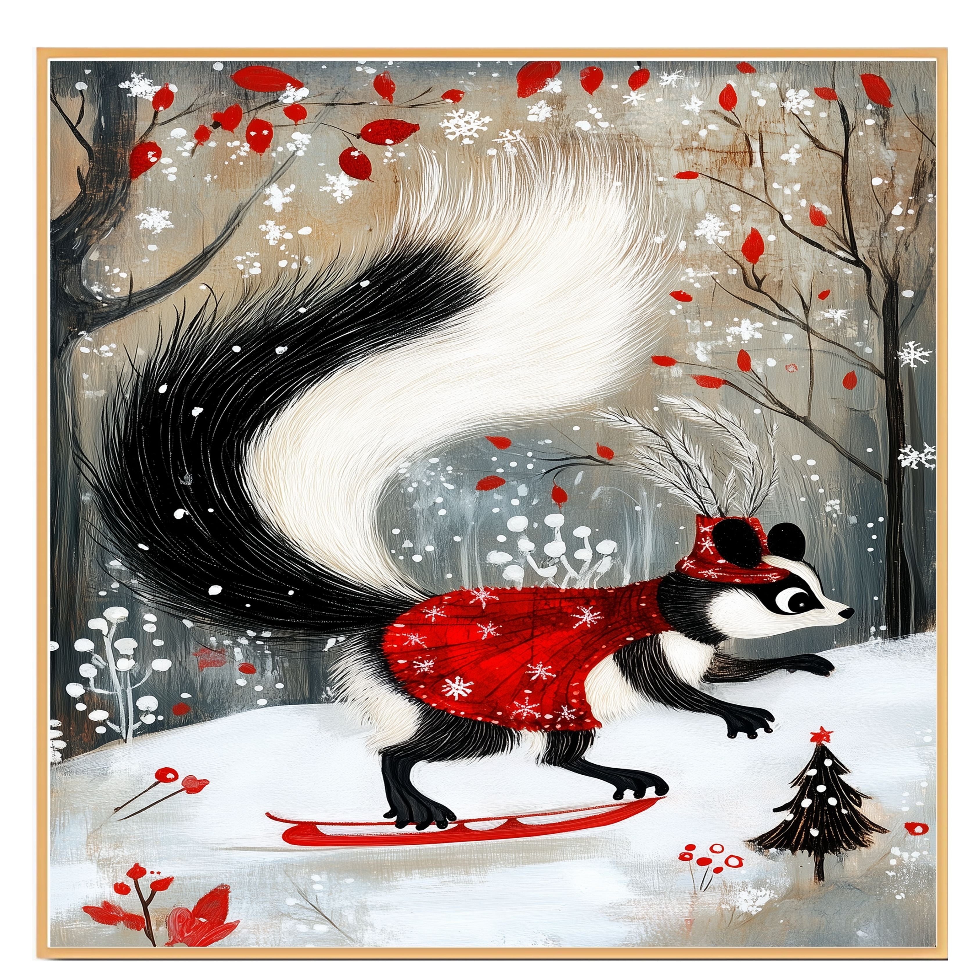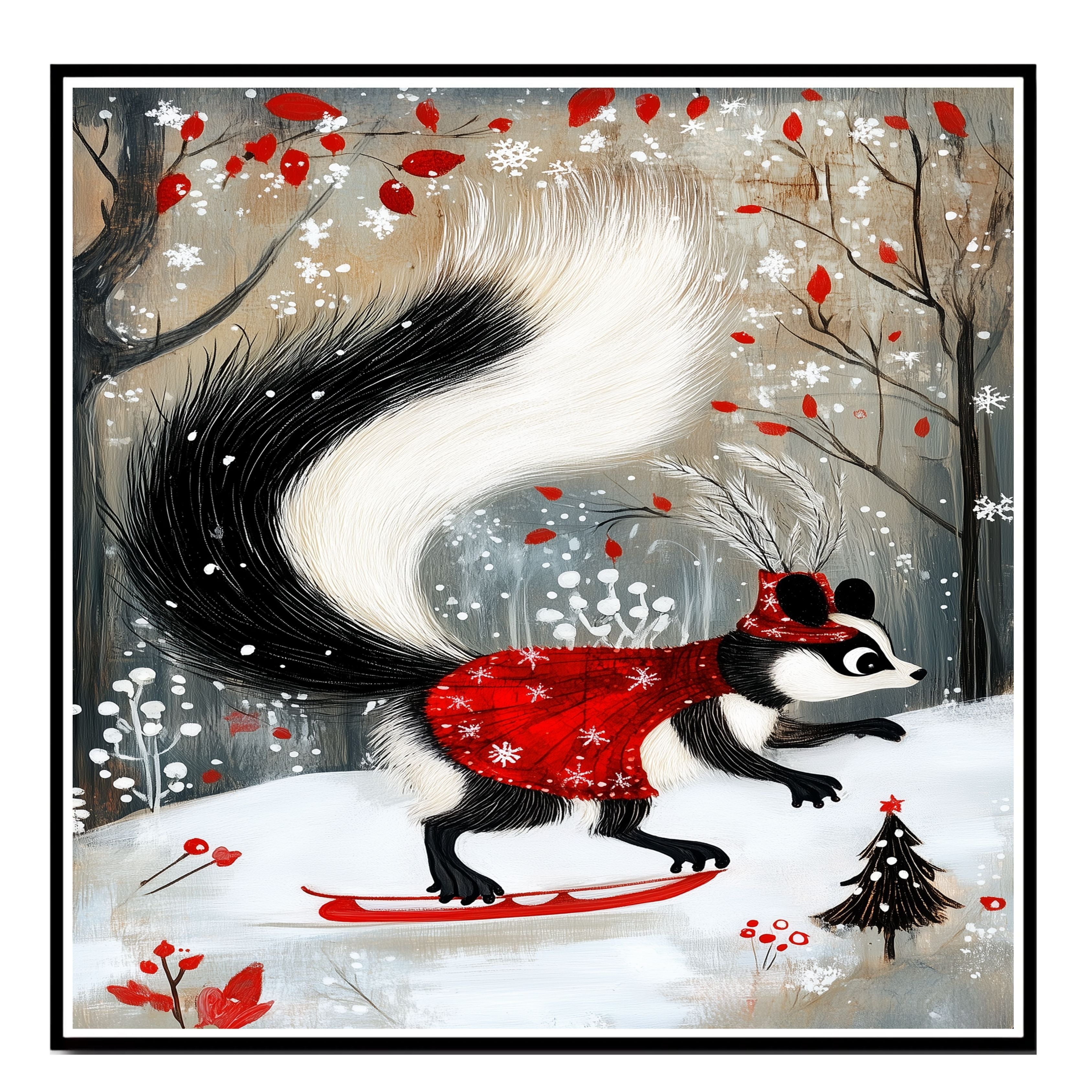 Decked out in a dazzling red cape and feathered Santa hat, this whimsical skunk glides across a snowy landscape like the winter fashion icon she is. This enchanting holiday art print captures the festive spirit with woodland charm and graceful movement.