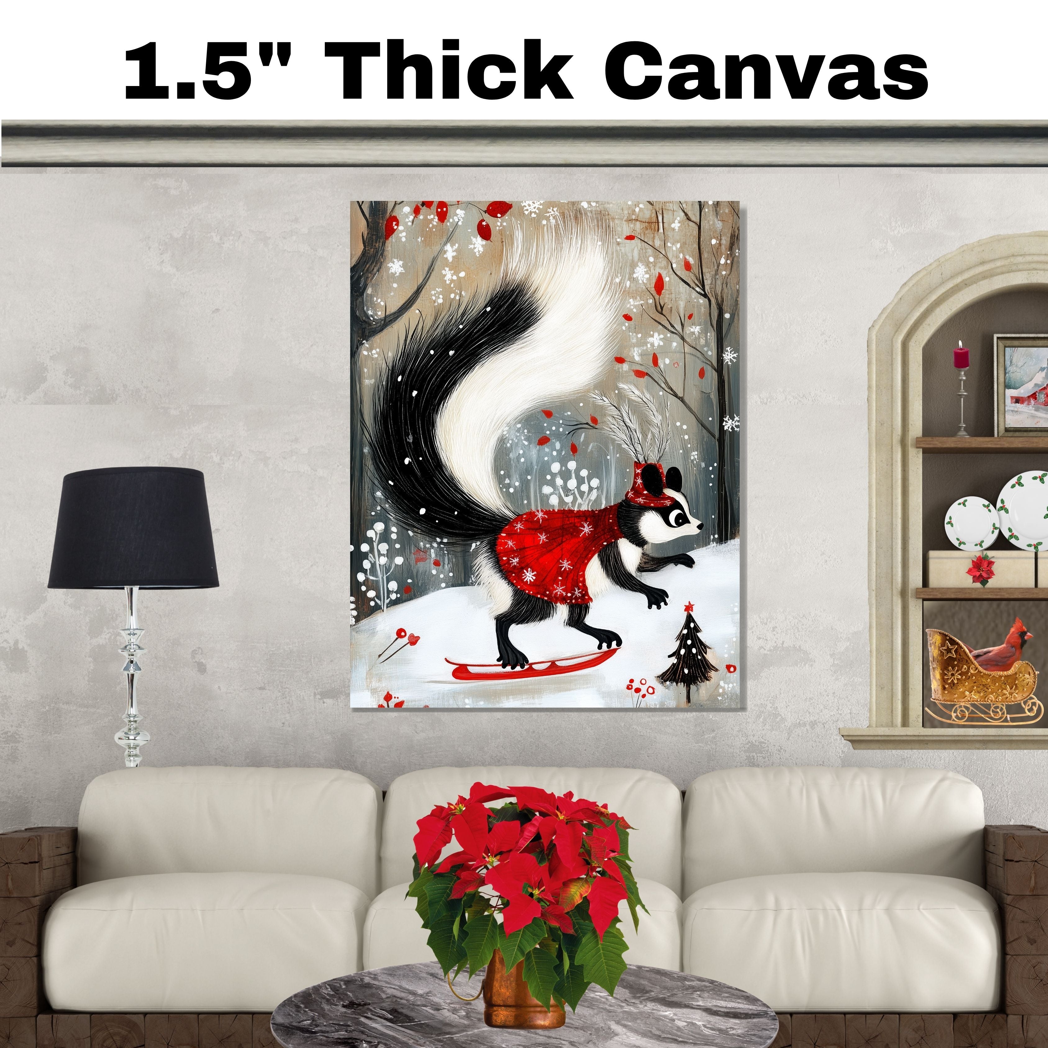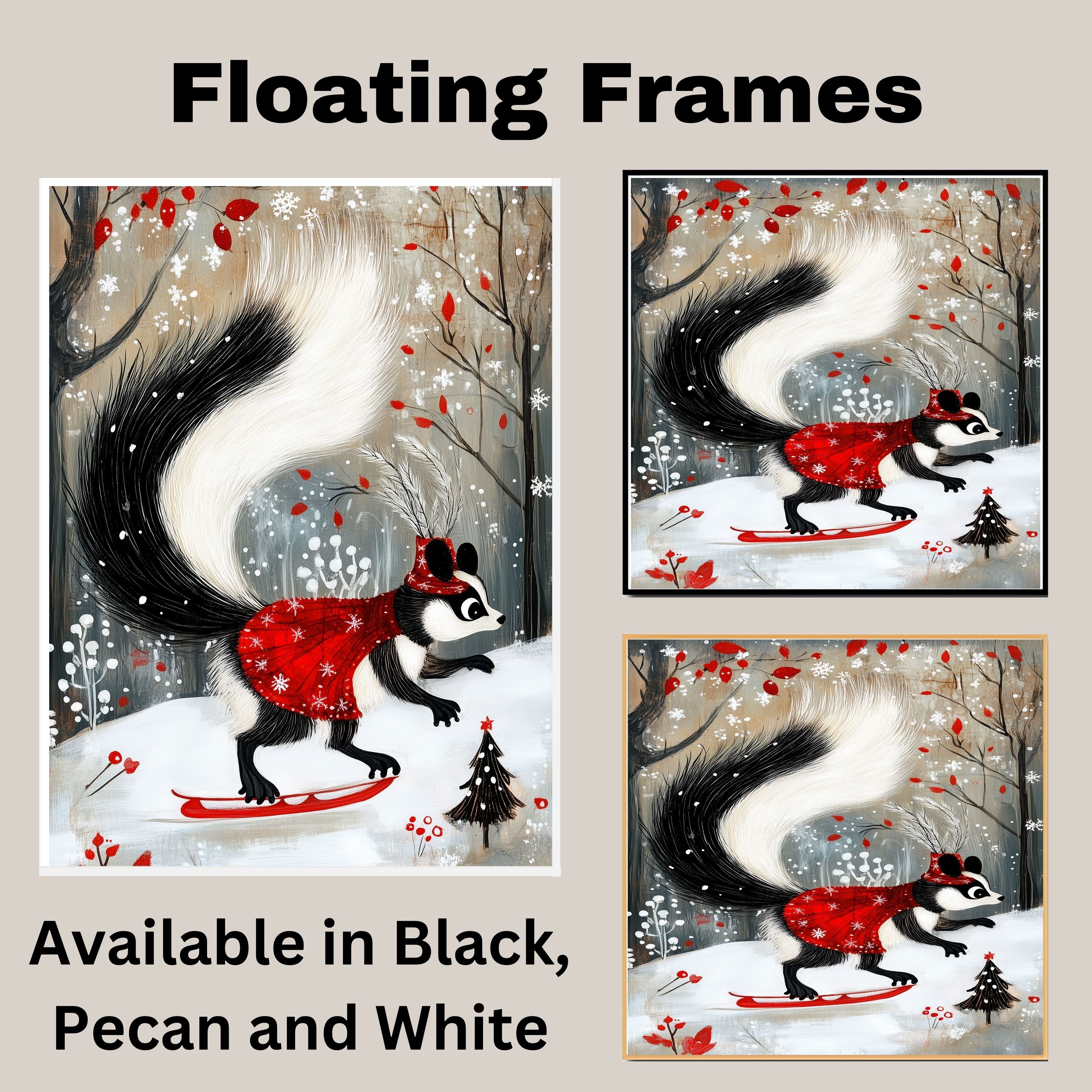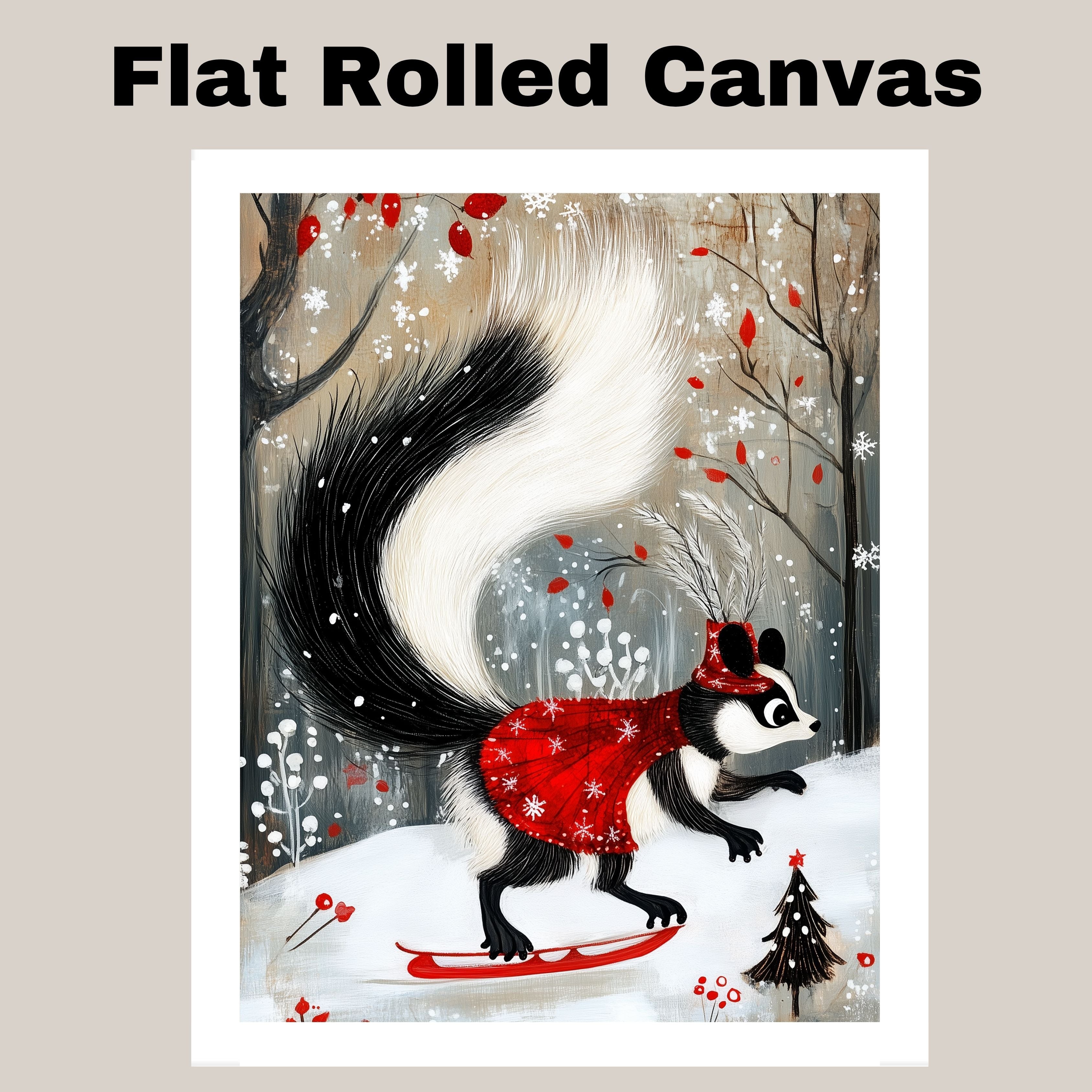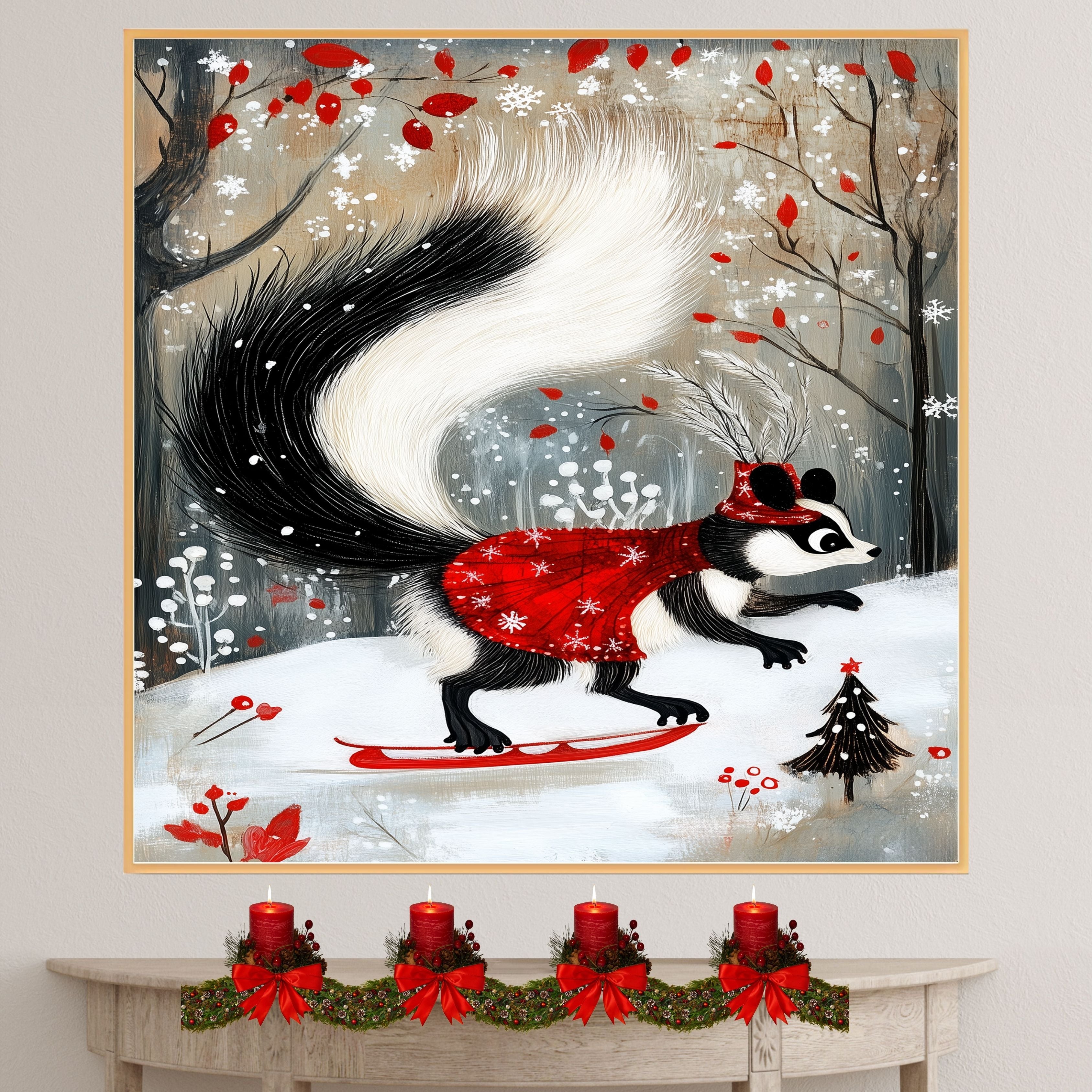 Decked out in a dazzling red cape and feathered Santa hat, this whimsical skunk glides across a snowy landscape like the winter fashion icon she is. This enchanting holiday art print captures the festive spirit with woodland charm and graceful movement.