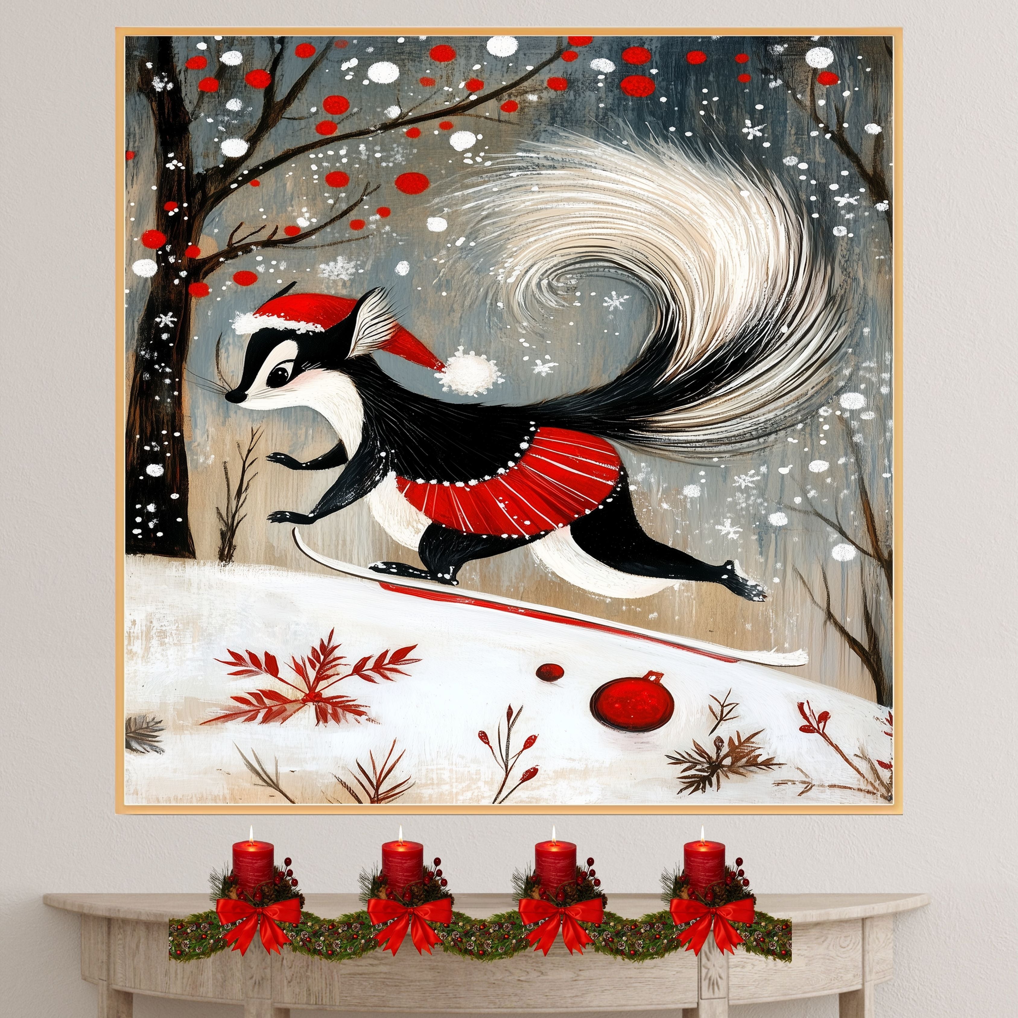 Glide into the festive season with this charming illustration of a stylish skunk twirling through the snow in a red tutu and Santa hat! This playful print is filled with vintage Christmas vibes and woodland whimsy, perfect for animal lovers and holiday decor enthusiasts alike. From her expressive tail to the soft snowfall and classic color palette, this skating skunk brings a delightful twist to traditional winter scenes.