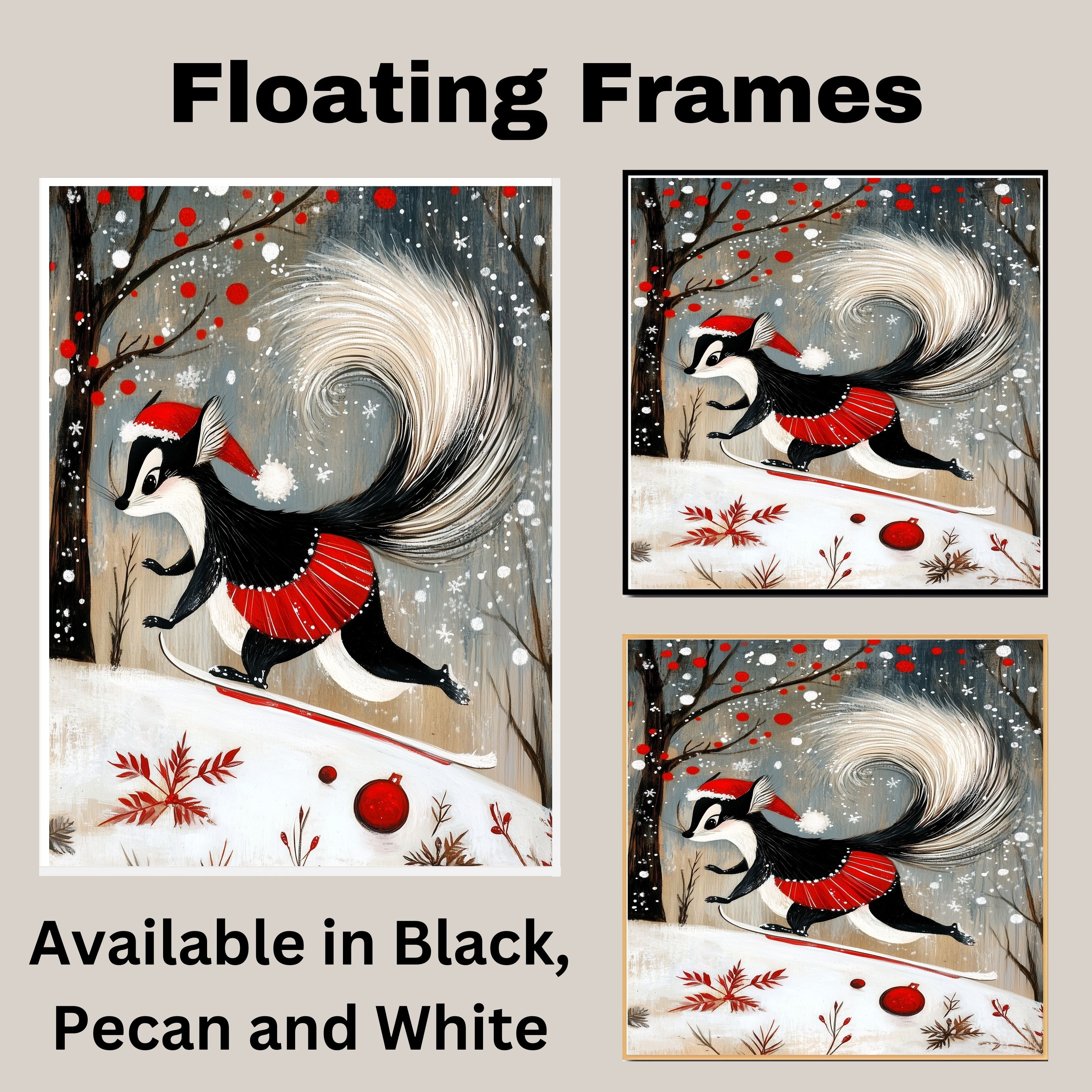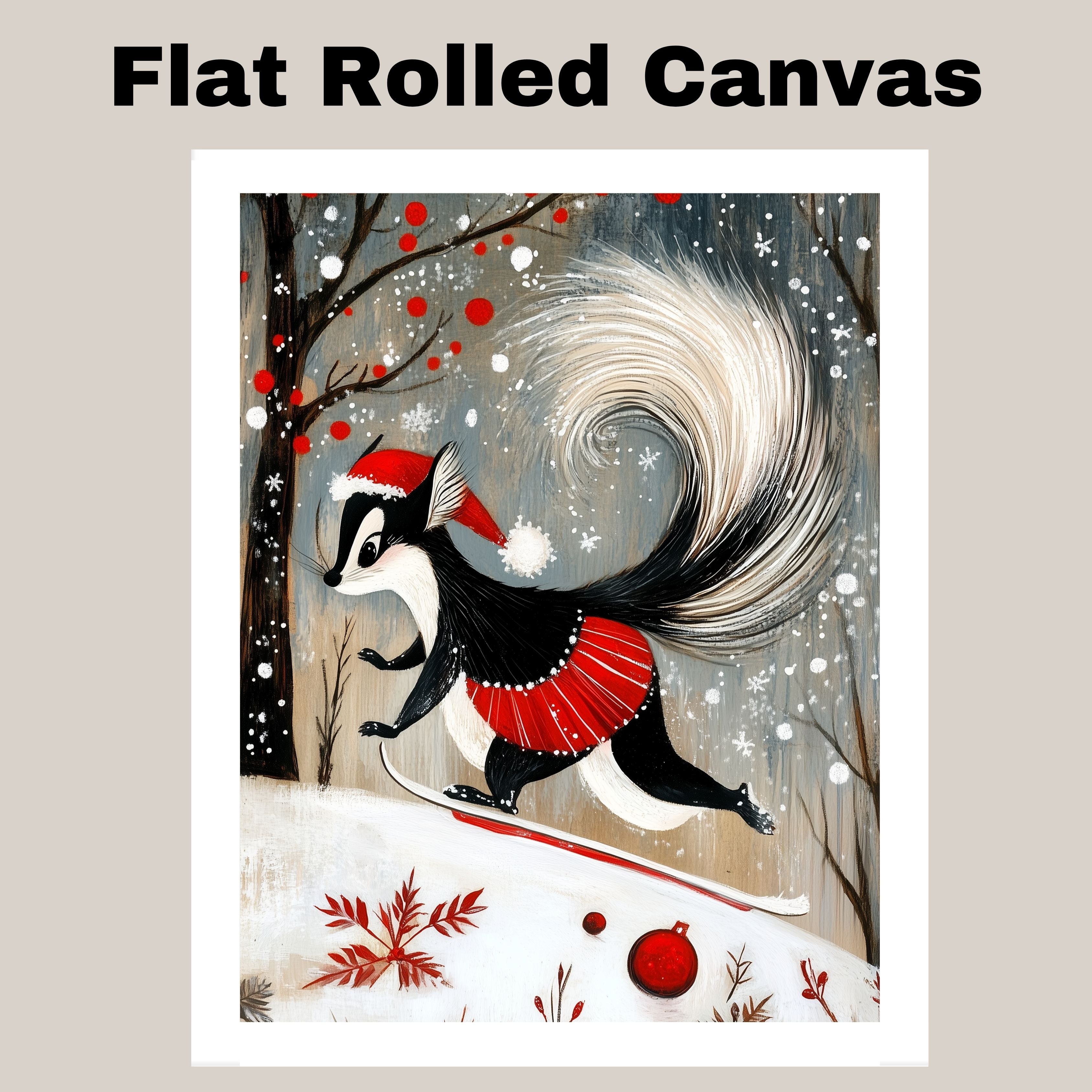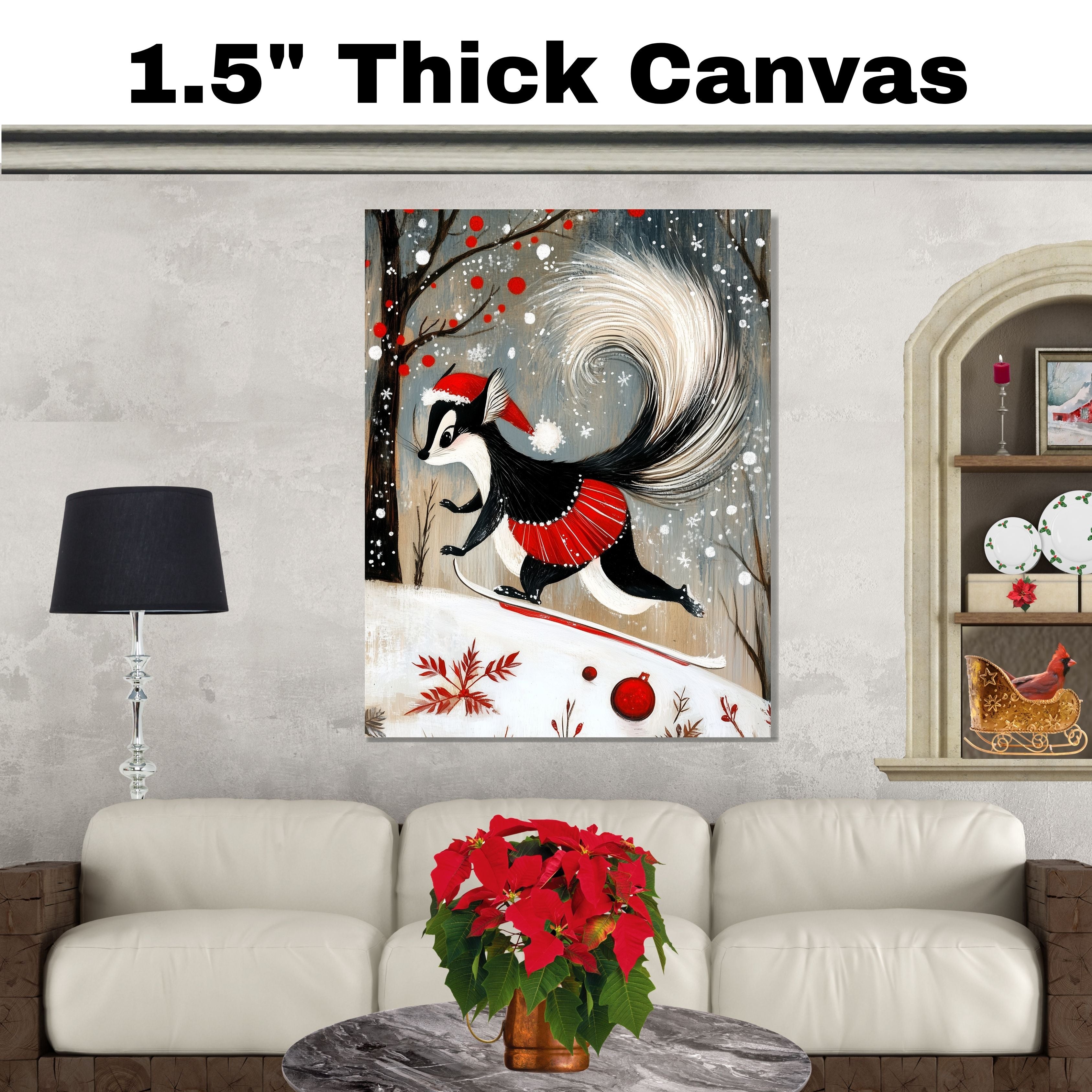 Whimsical Christmas Skunk on Ice – Cute Woodland Skating Animal Art Print in Red Tutu & Santa Hat, Adorable Winter Holiday Wall Decor for Animal Lovers on Ready to Hang 1.5" Thick Canvas Wrap, Floating Framed Canvas, Flat Rolled Canvas