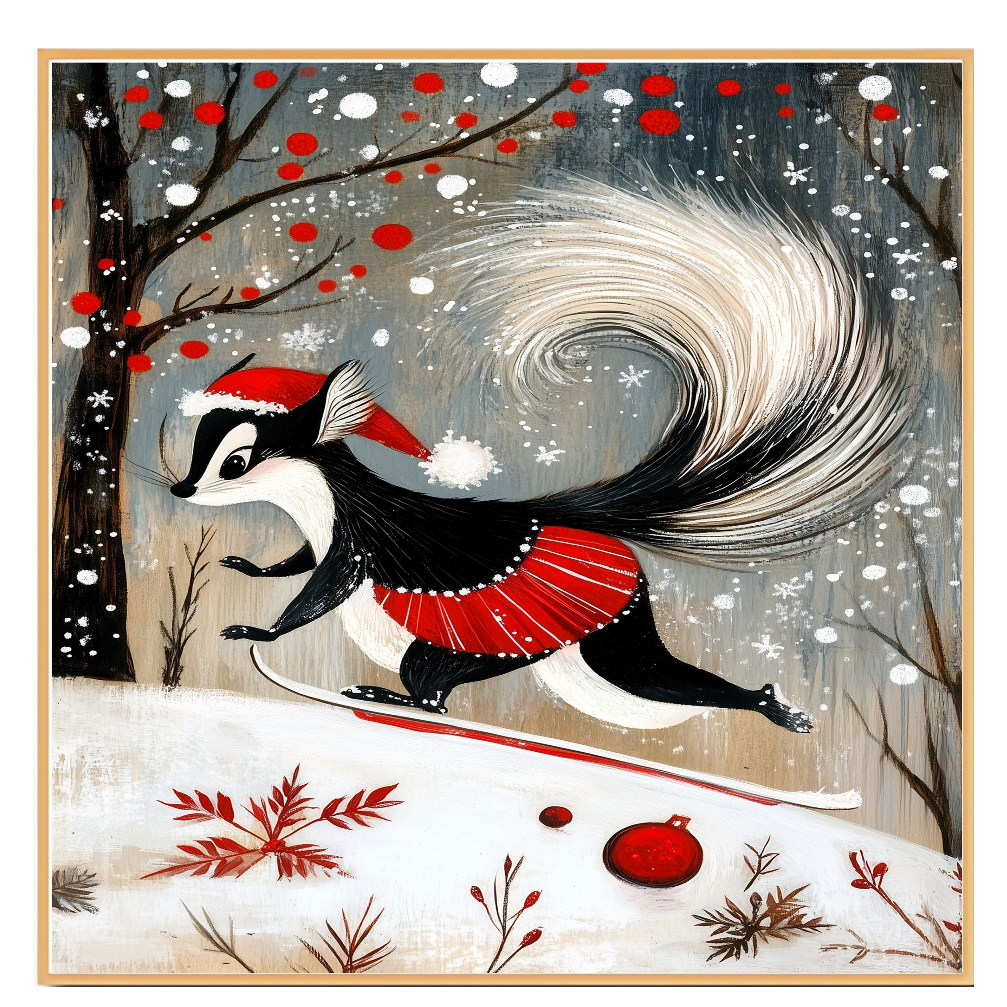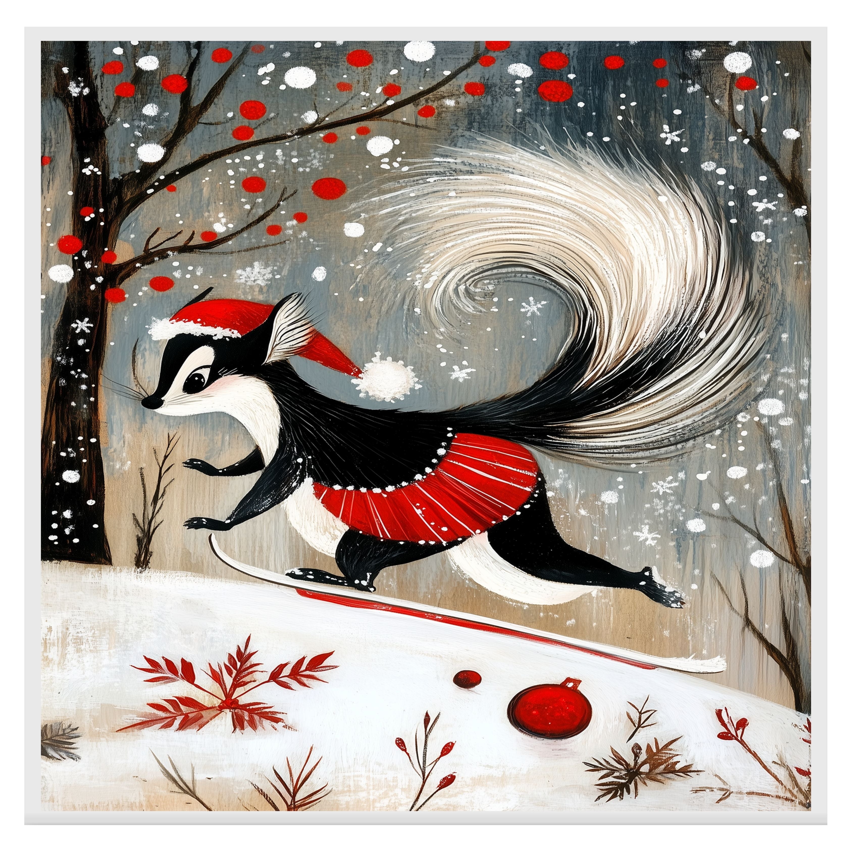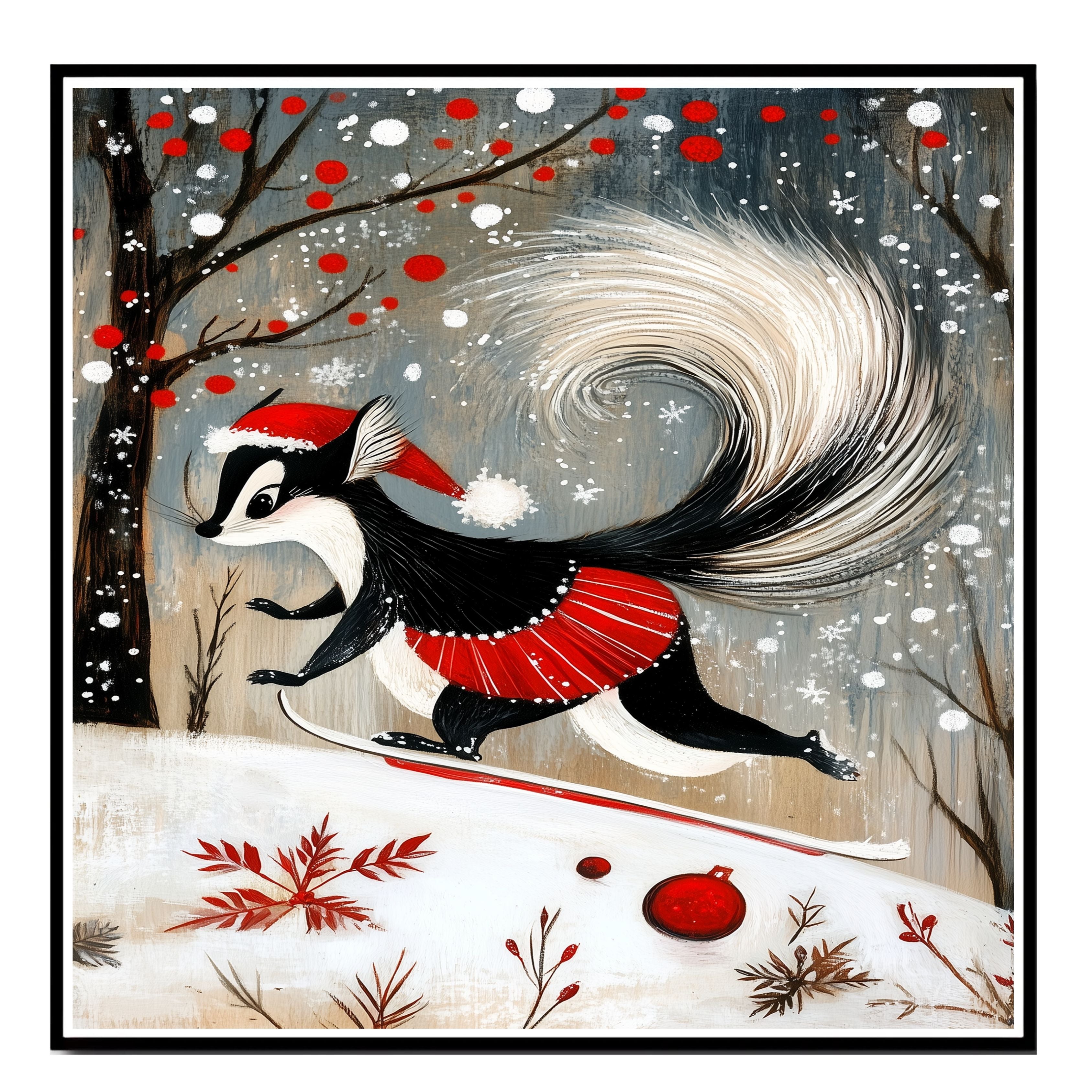 Glide into the festive season with this charming illustration of a stylish skunk twirling through the snow...