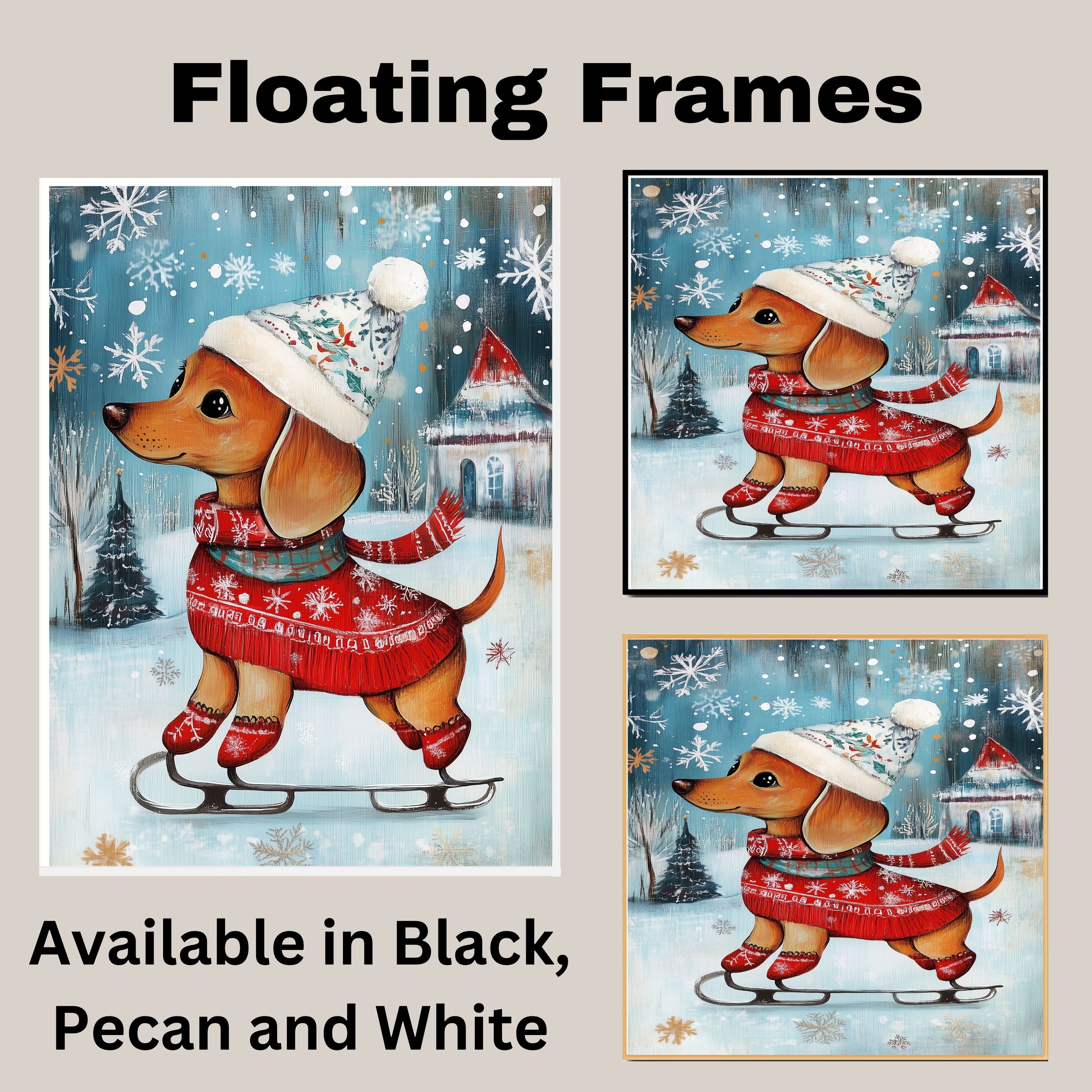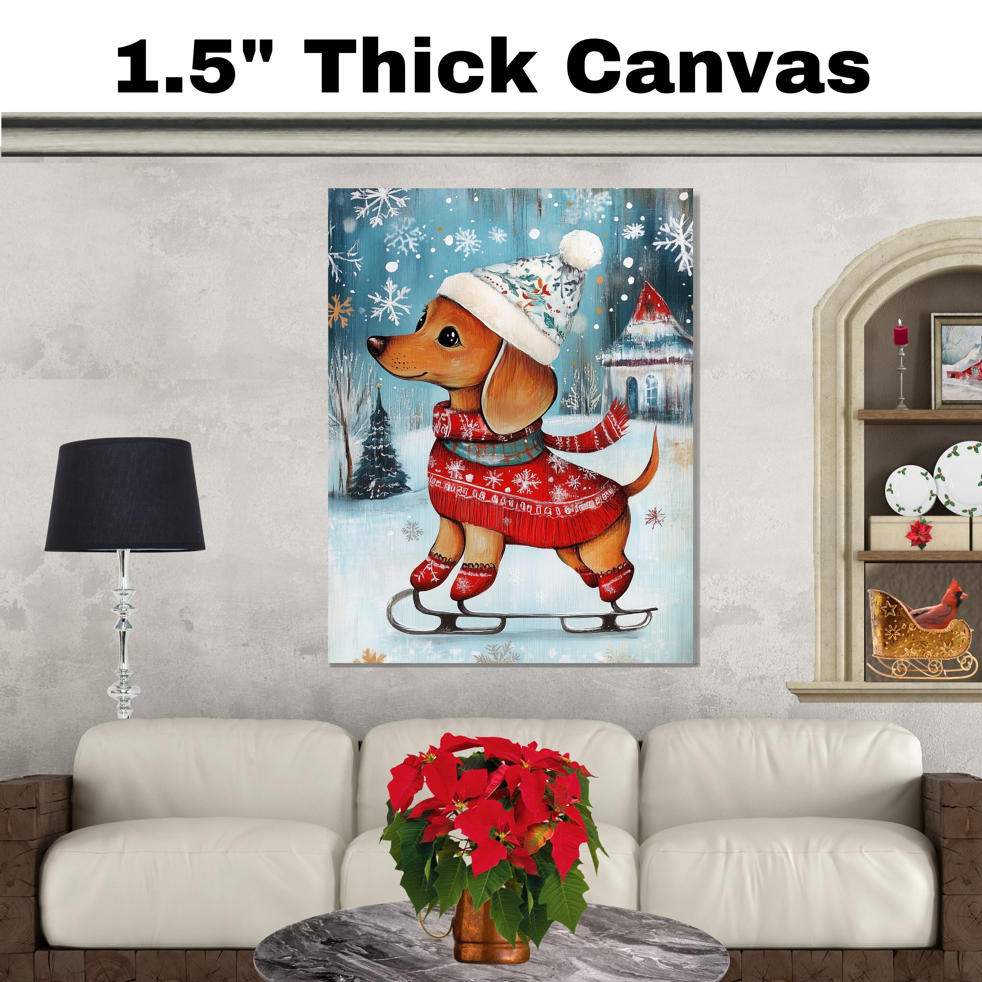 Whimsical Dachshund Dog Ice Skating in Red Holiday Sweater and Festive Hat Adorable Winter Christmas Art for Dog Lovers and Seasonal Home Décor on Ready to Hang 1.5" Thick Canvas Wrap, Floating Framed Canvas, Flat Rolled Canvas