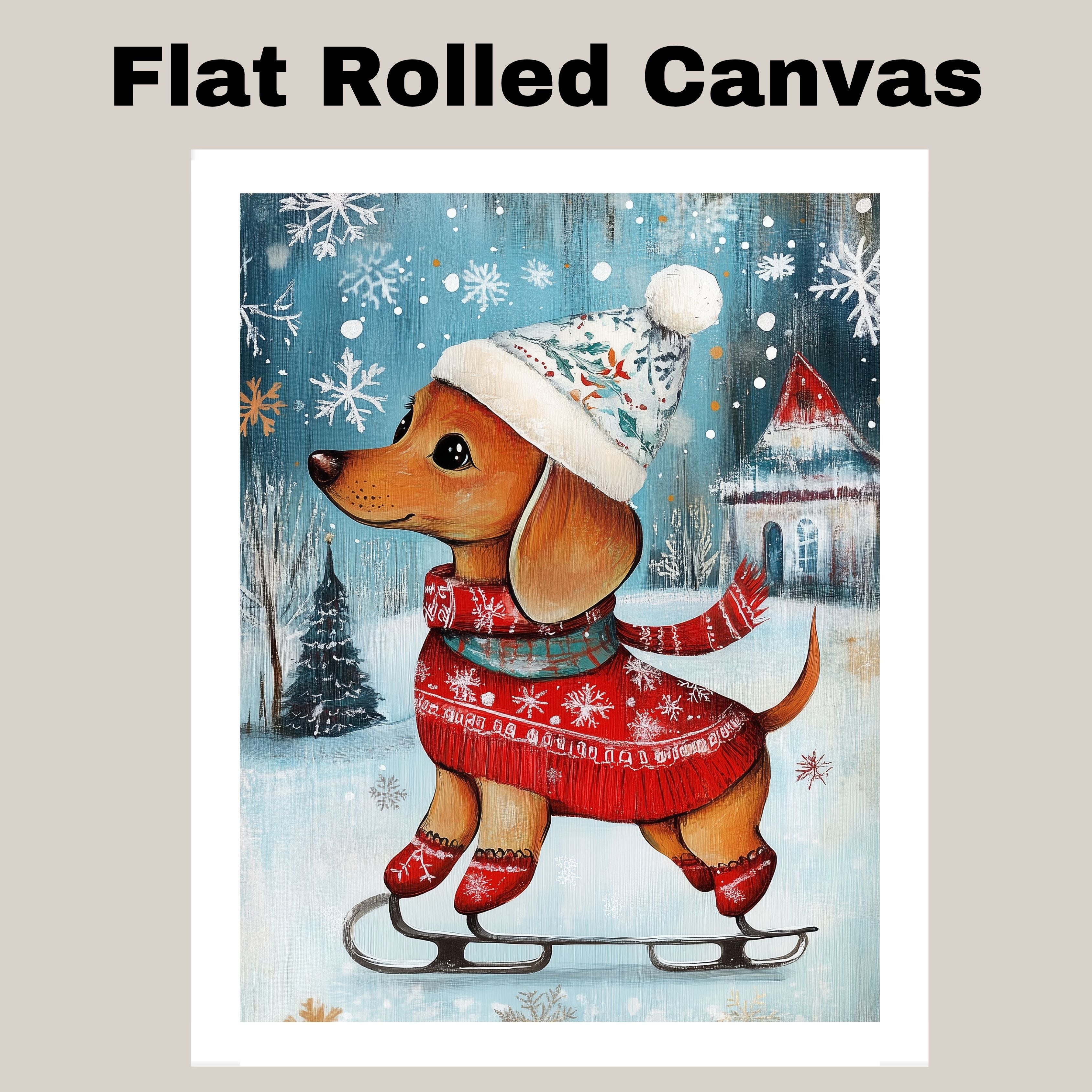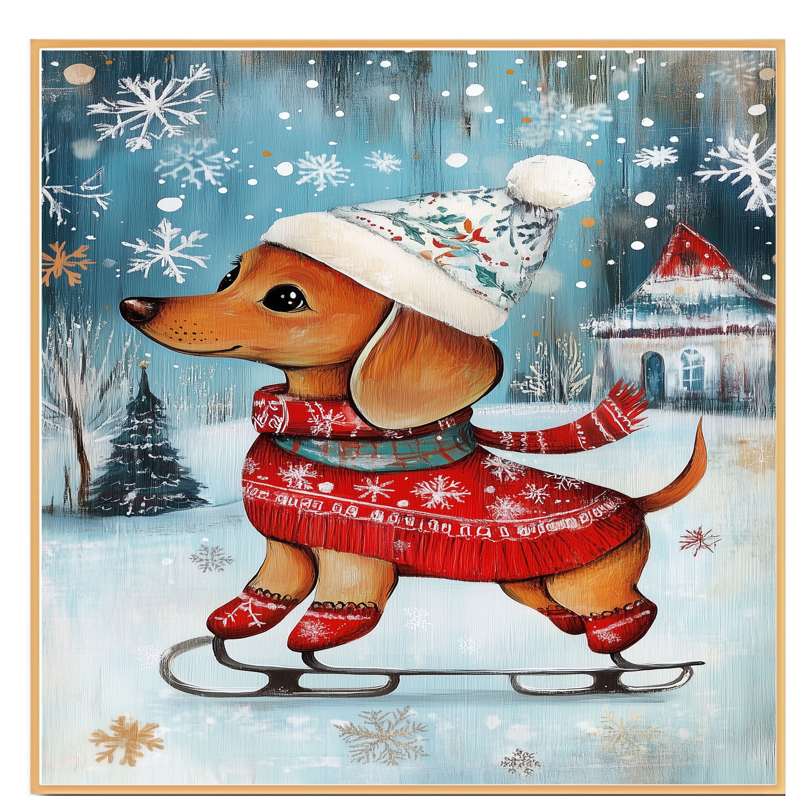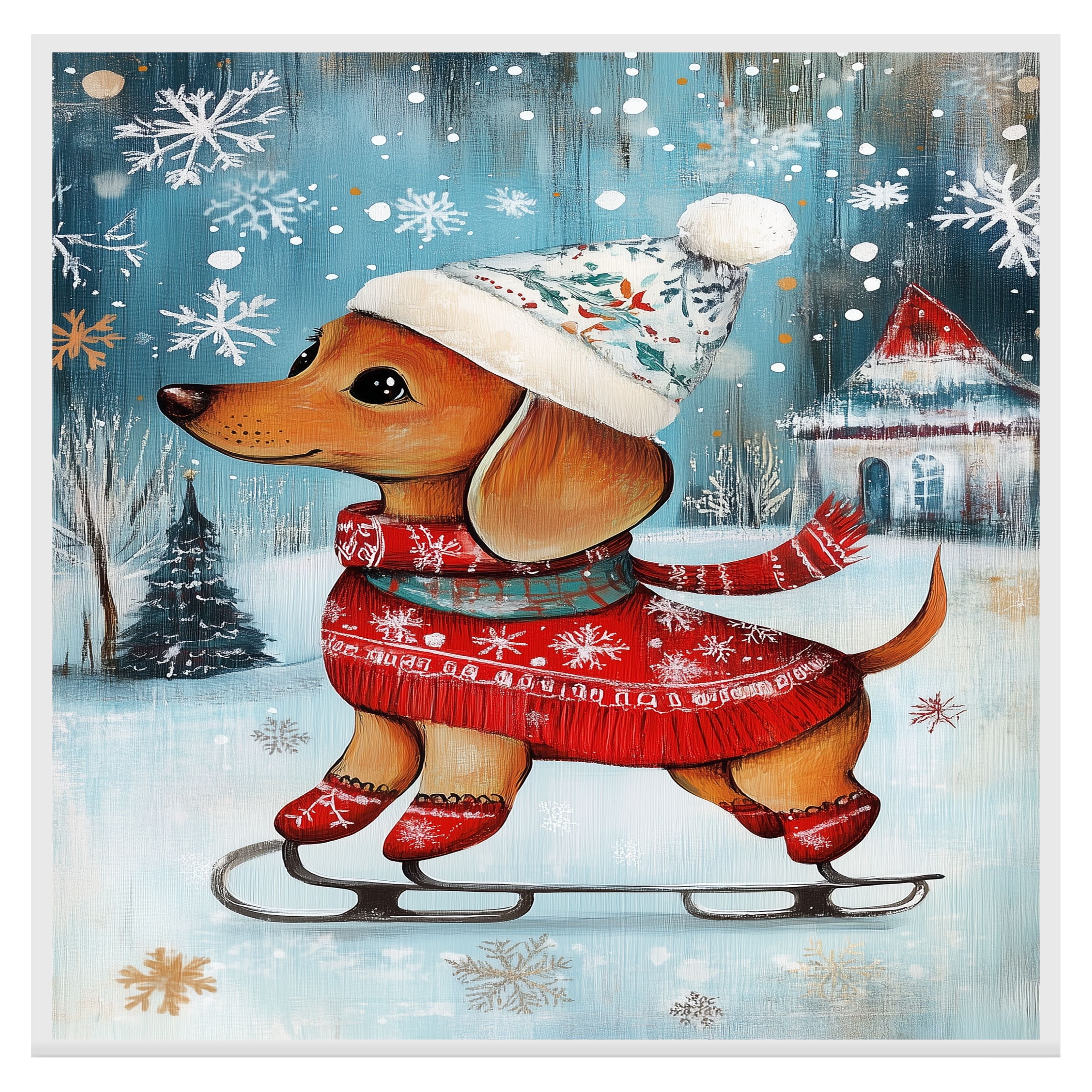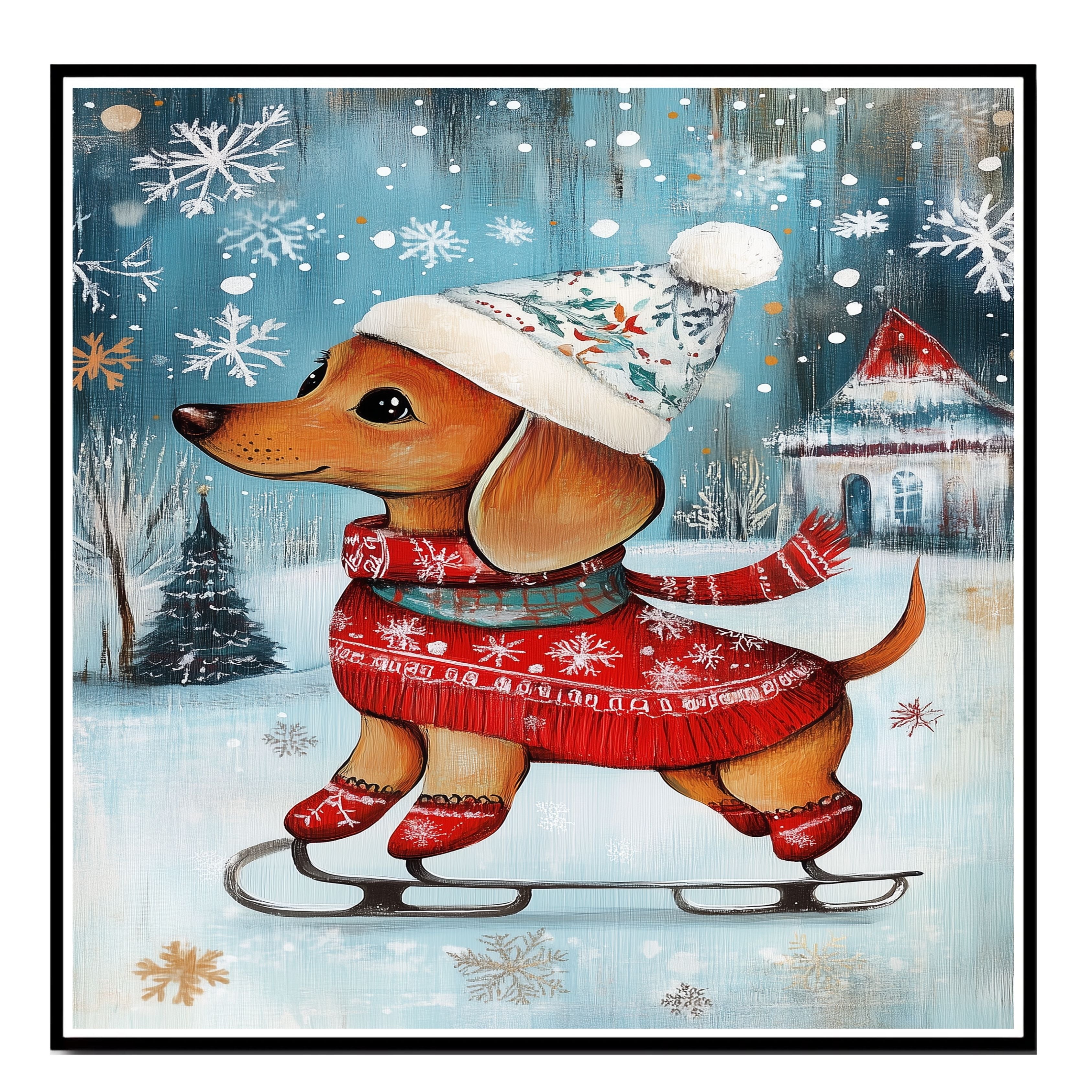 Bring charm and cheer to your holiday décor with this delightful artwork of a dachshund dog ice skating in a festive red sweater and winter hat. With playful details, snowy background, and warm colors, this whimsical print is perfect for dog lovers, cozy Christmas vibes, and magical winter decorating.
