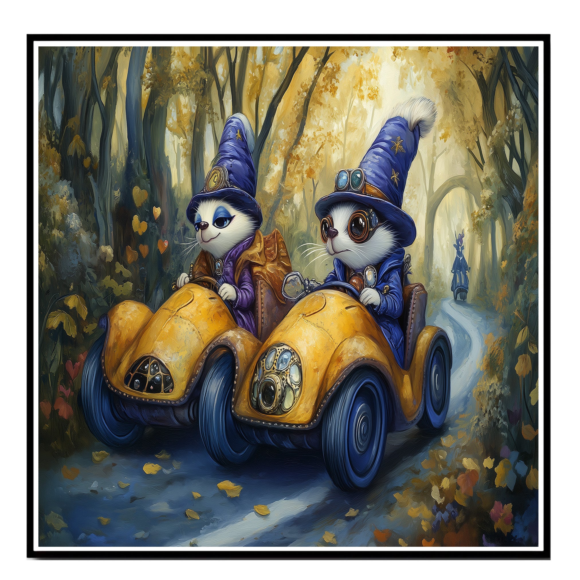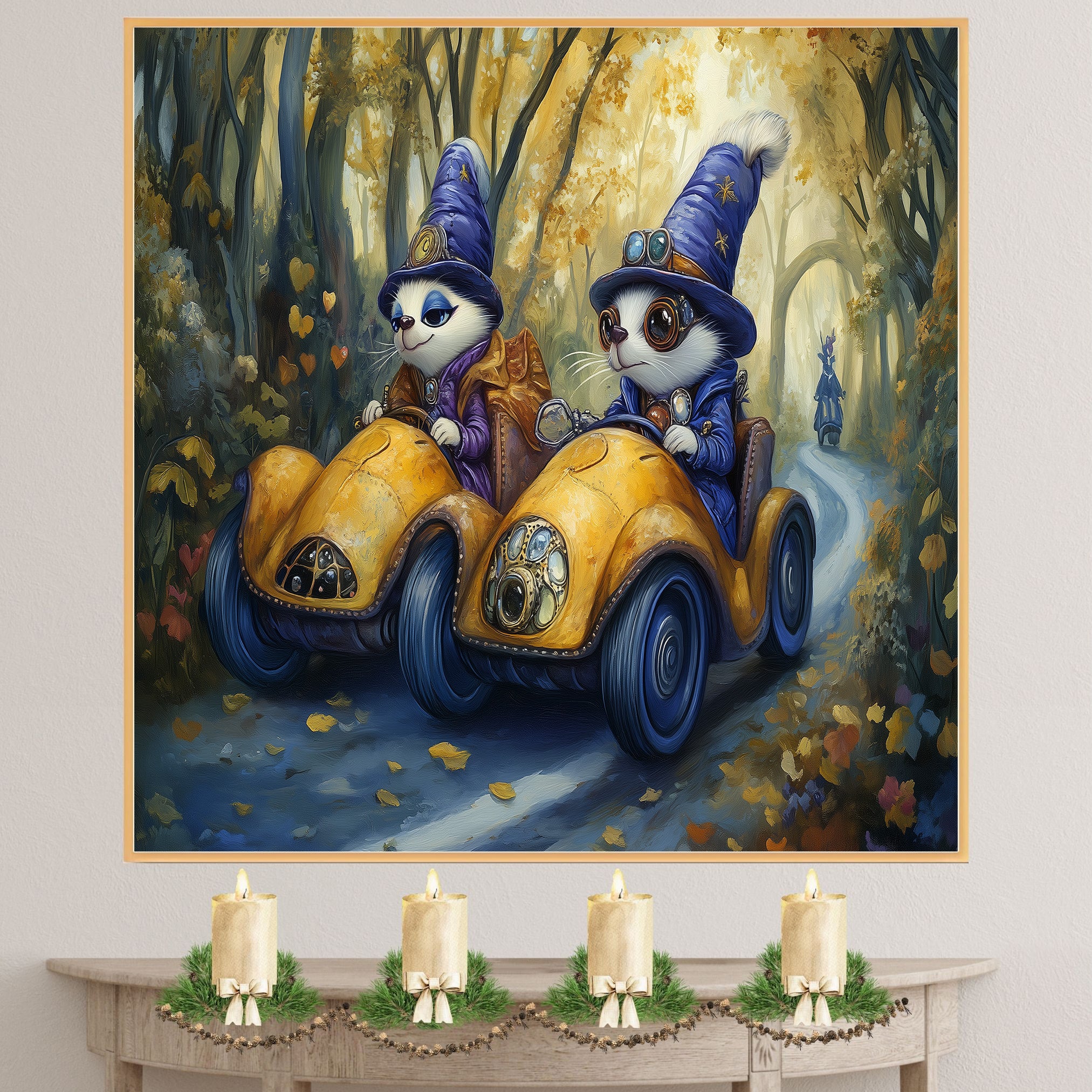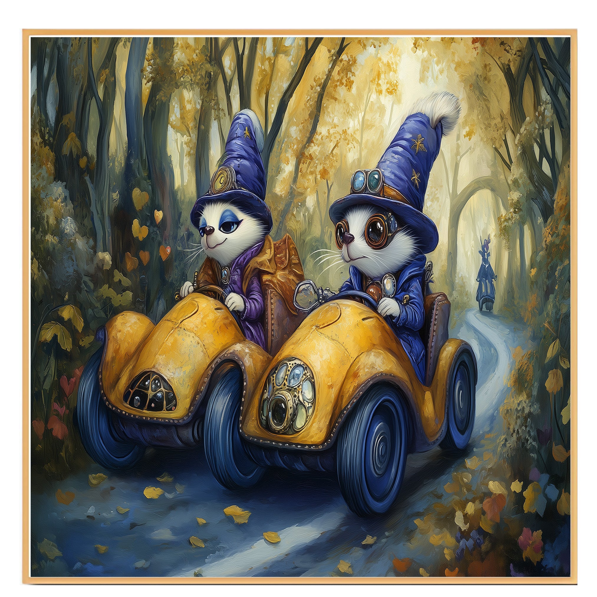 Ignite your imagination with this whimsical painting of two girls and a dog soaring through the sky in a colorful balloon ride—perfect for fantasy lovers.