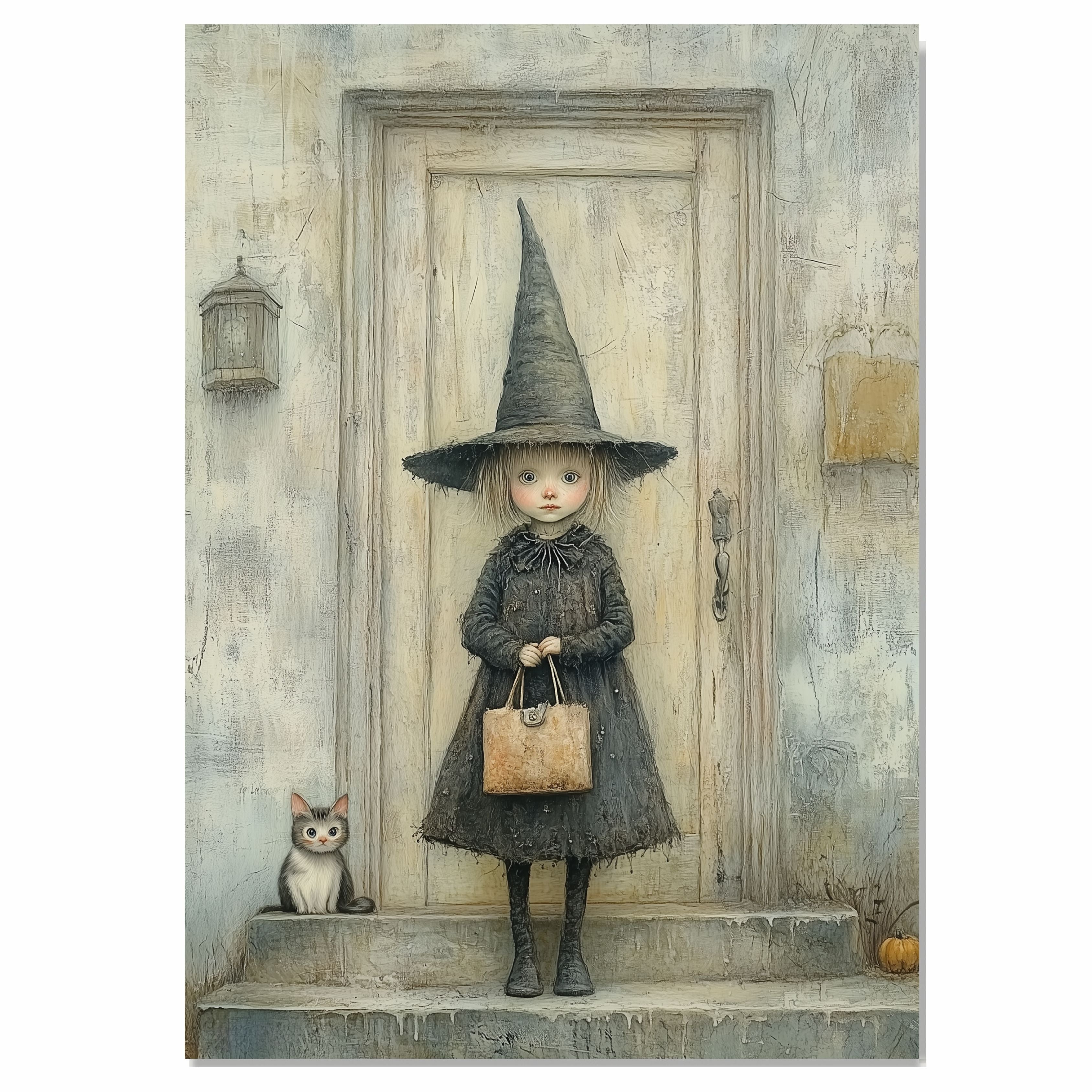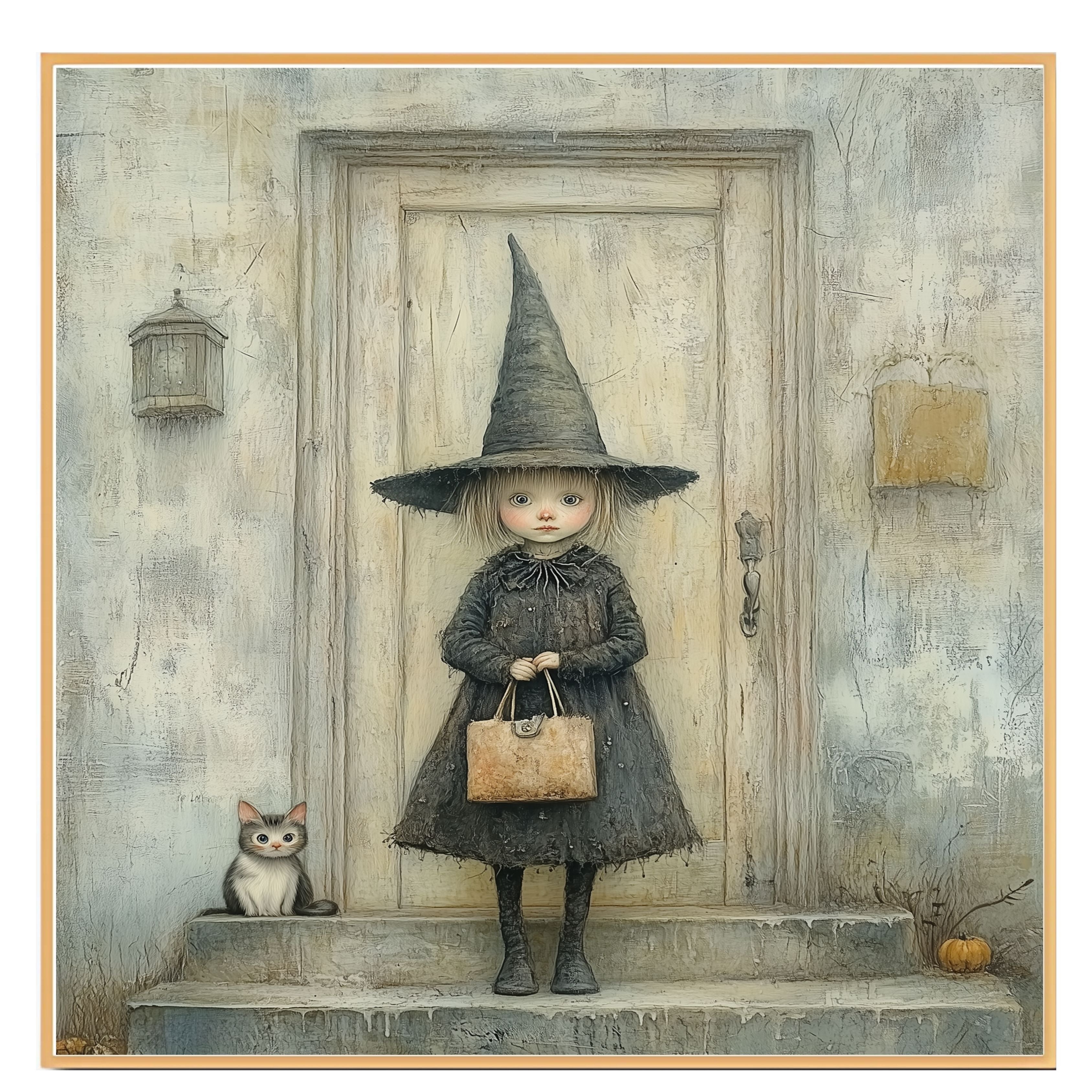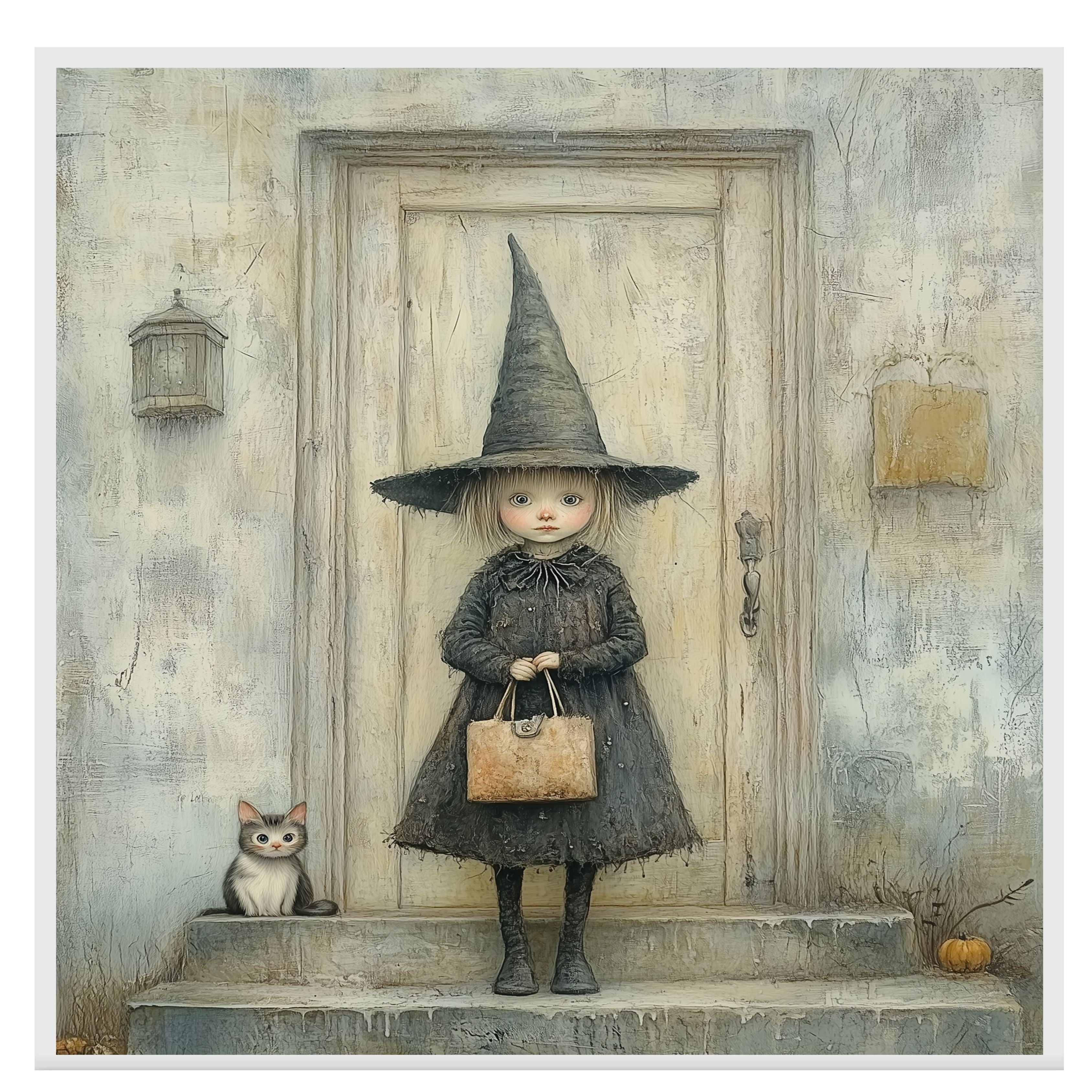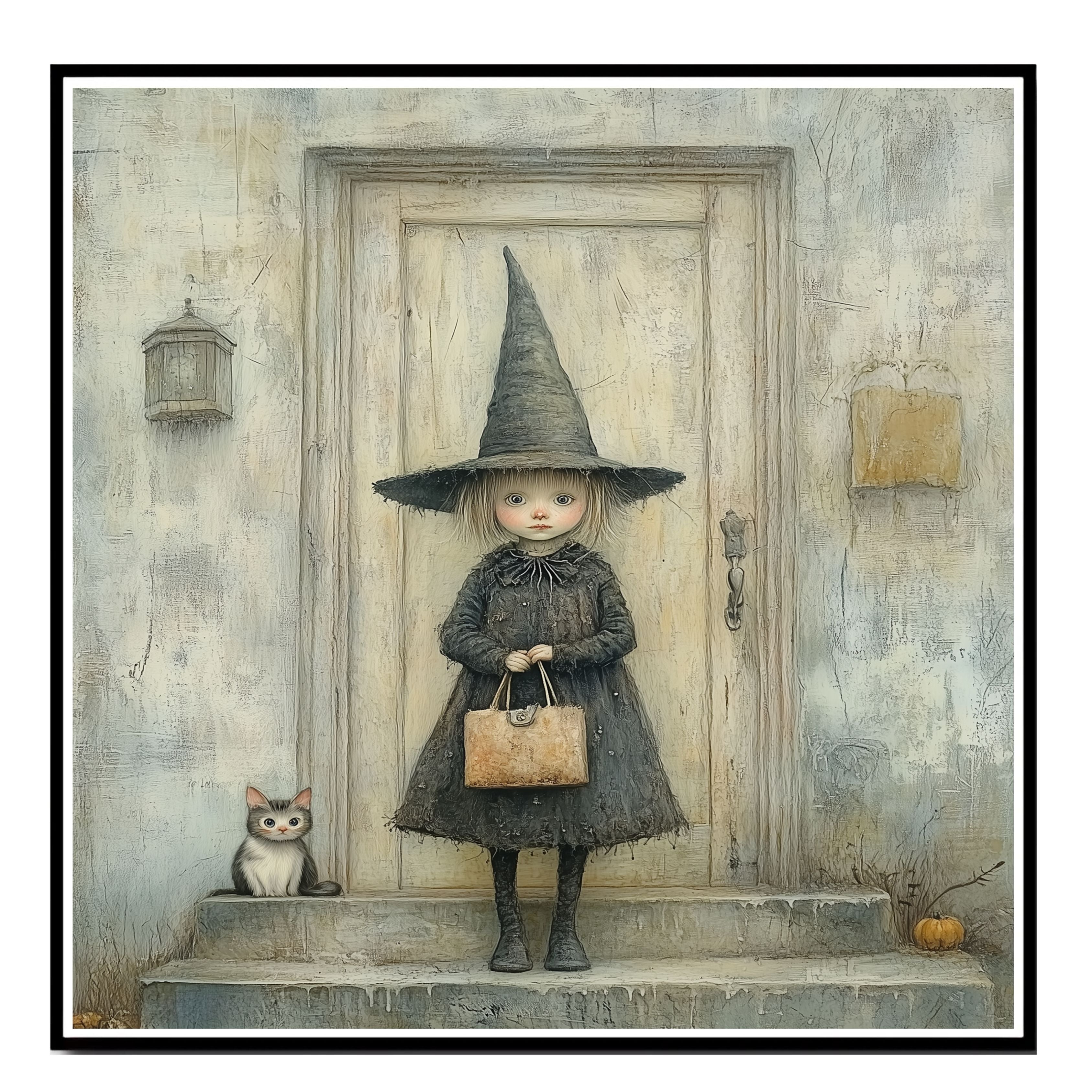 This delightful Halloween artwork captures a young girl in a vintage witch costume holding a small purse, standing quietly beside a wide-eyed kitten. Set against an aged, textured porch with soft autumn colors and rustic charm, this piece evokes gentle spookiness with a storybook feel. Ideal for fall decorating, it brings a touch of nostalgic Halloween whimsy to any space.