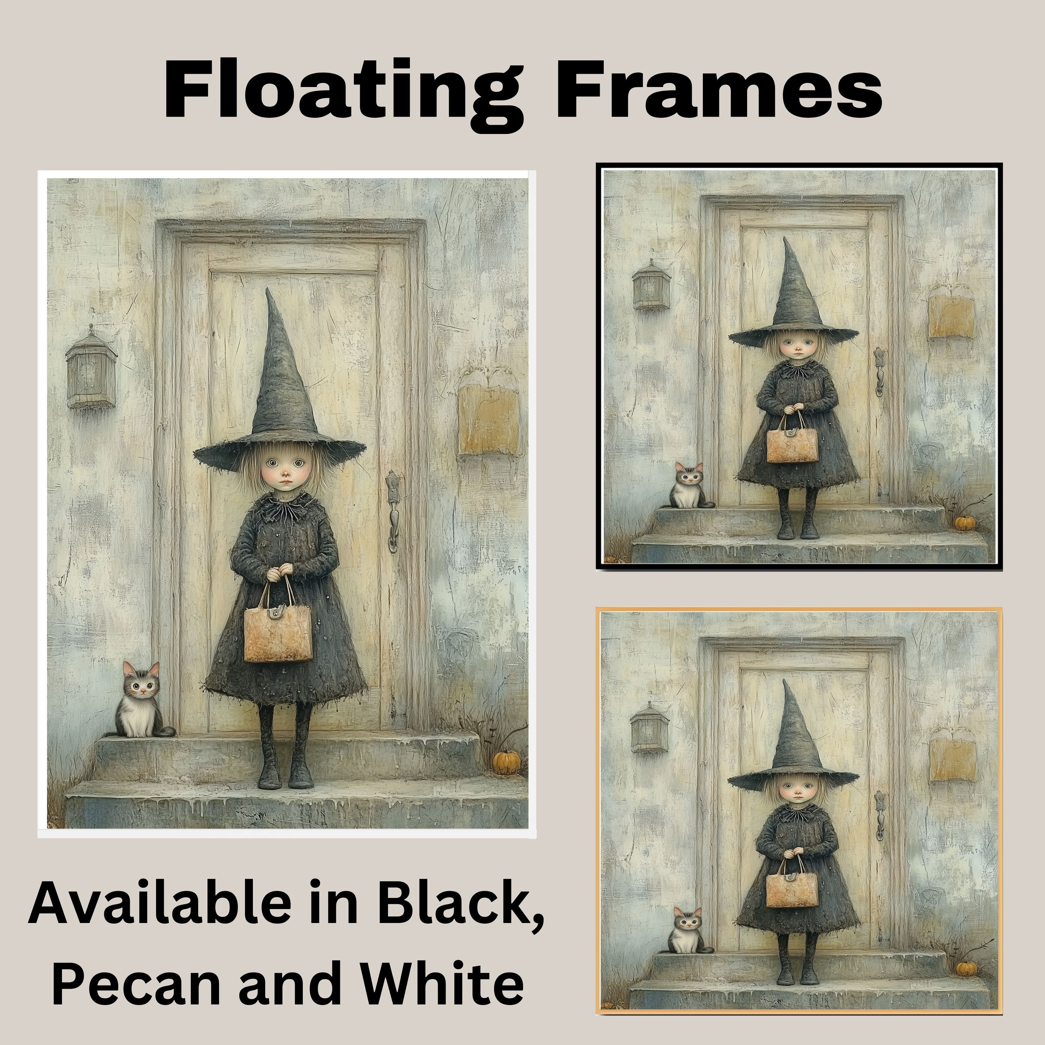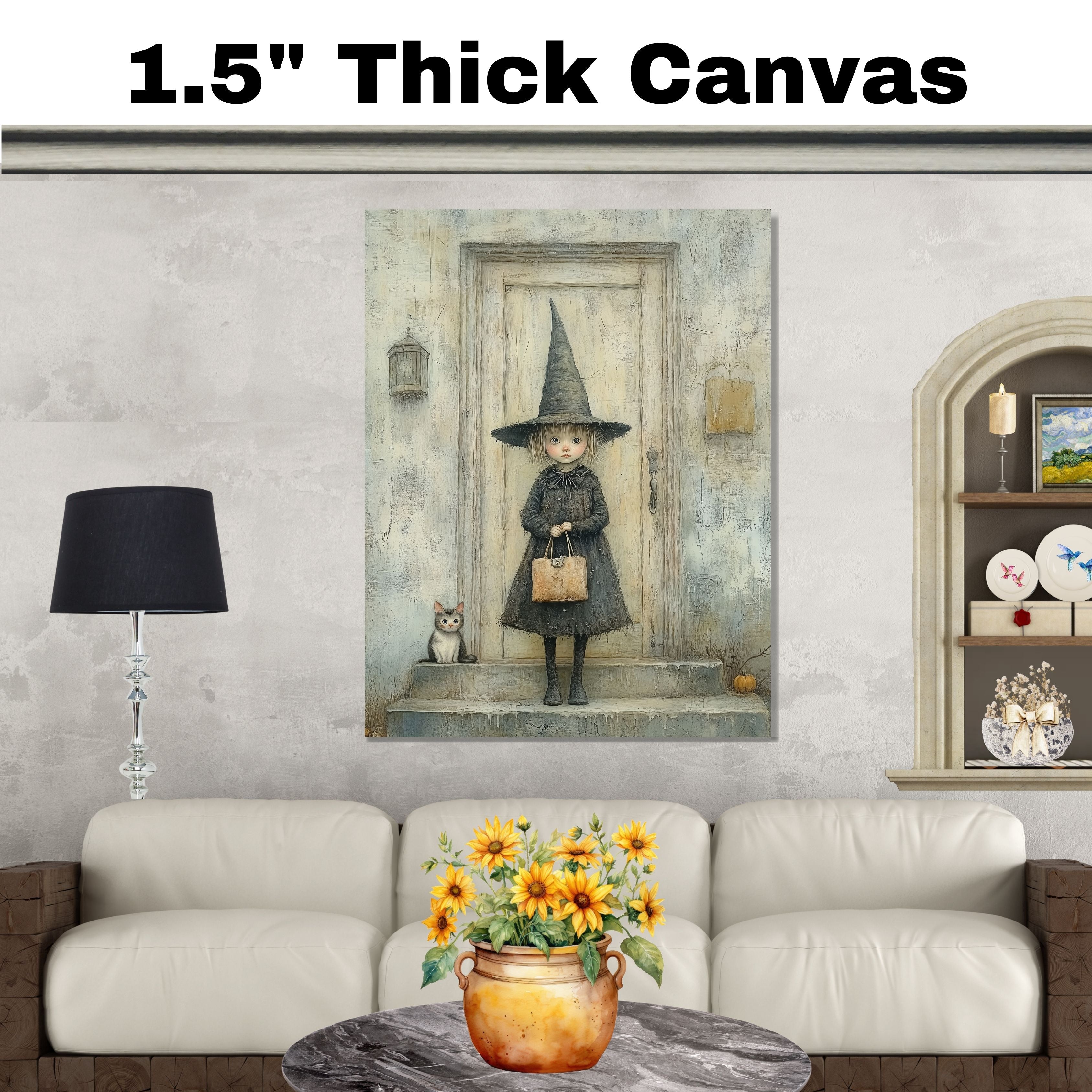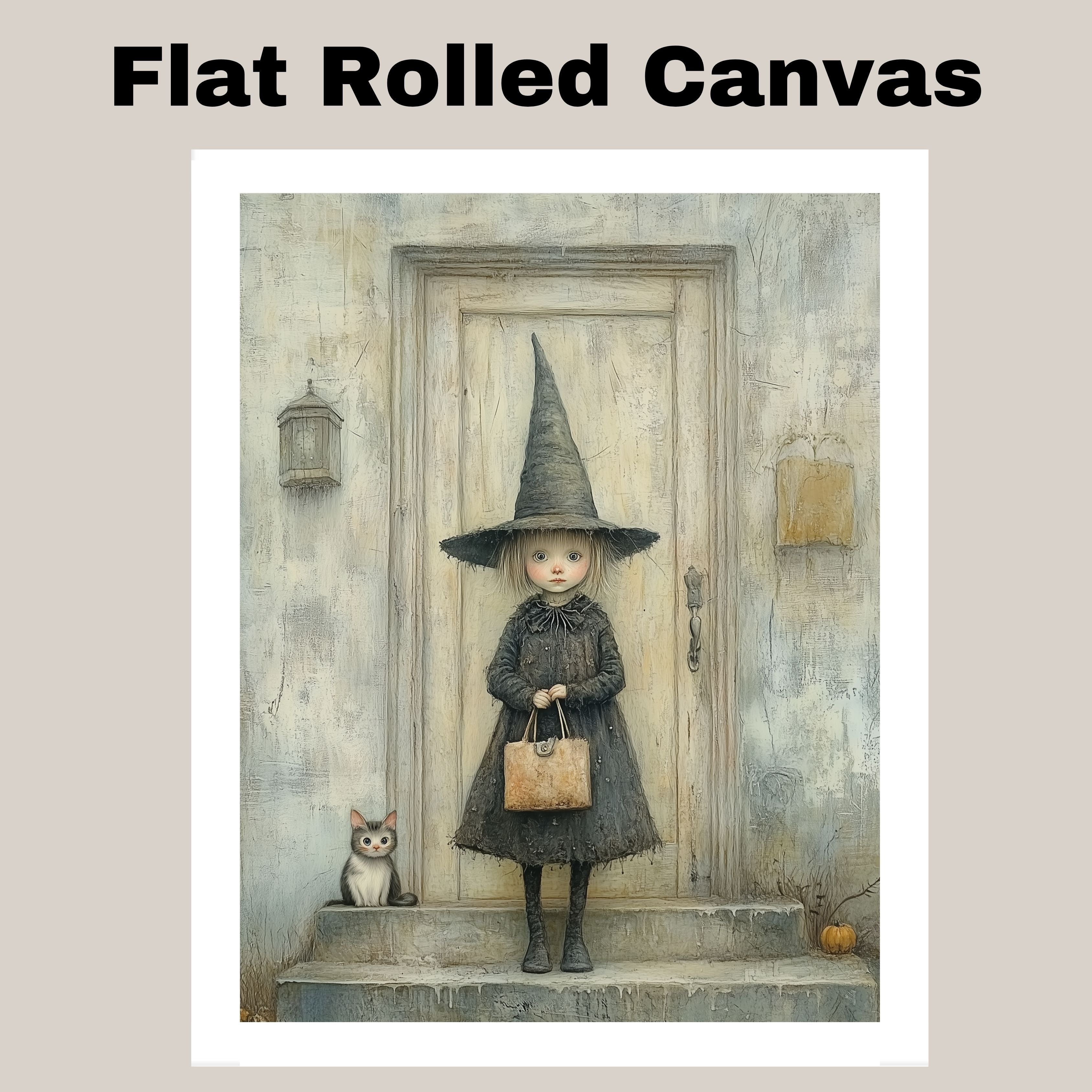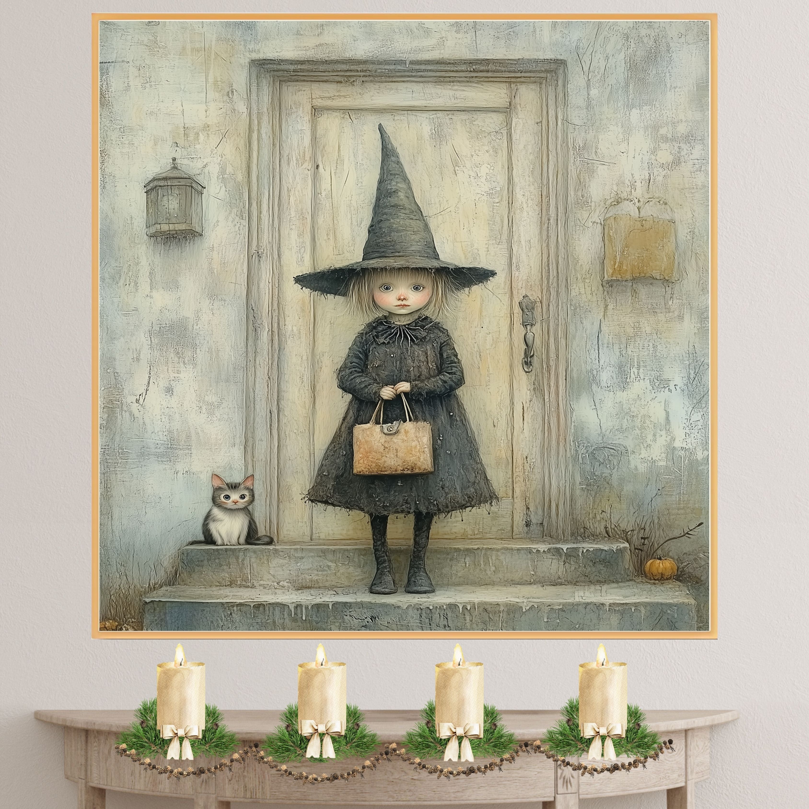 This delightful Halloween artwork captures a young girl in a vintage witch costume holding a small purse, standing quietly beside a wide-eyed kitten. Set against an aged, textured porch with soft autumn colors and rustic charm, this piece evokes gentle spookiness with a storybook feel. Ideal for fall decorating, it brings a touch of nostalgic Halloween whimsy to any space.