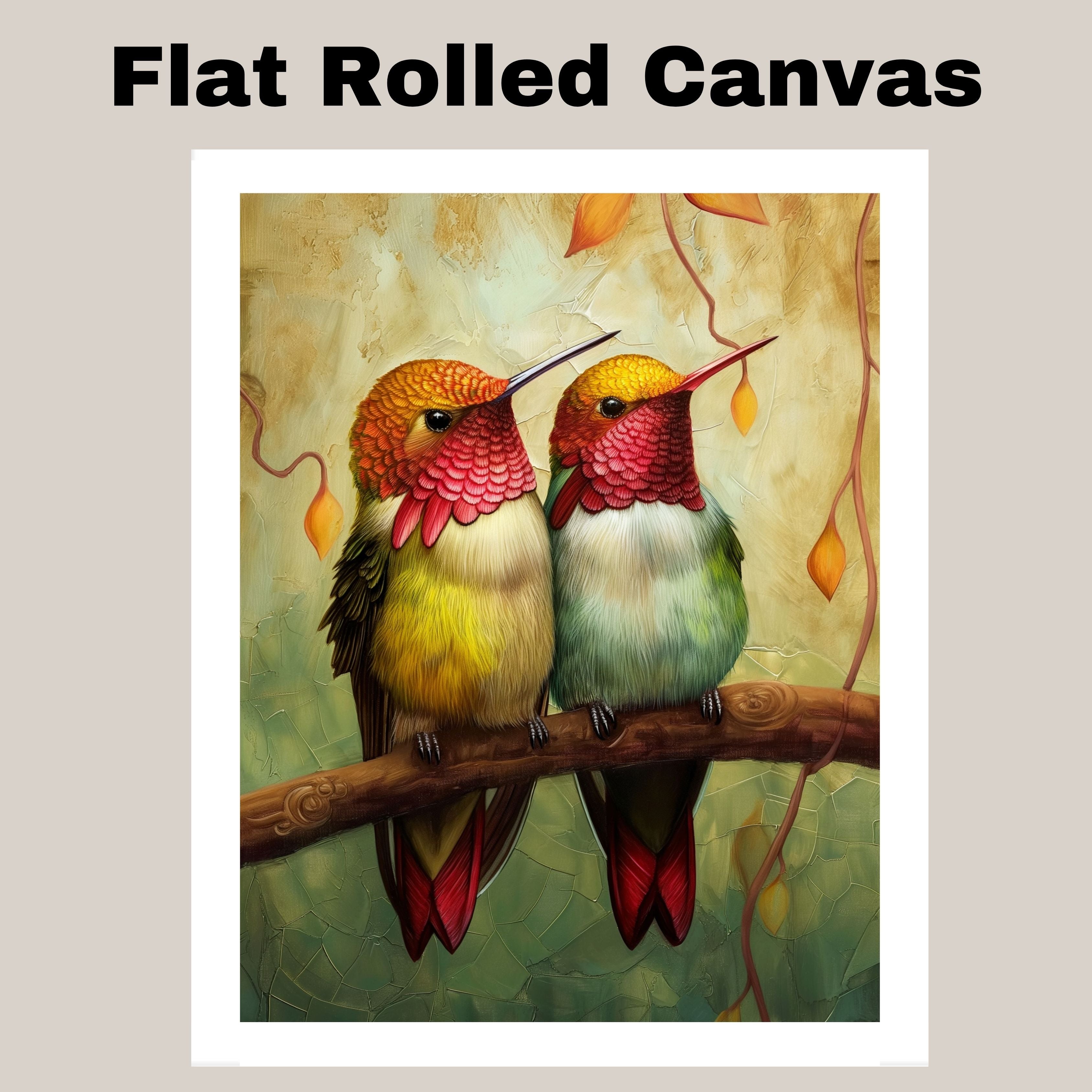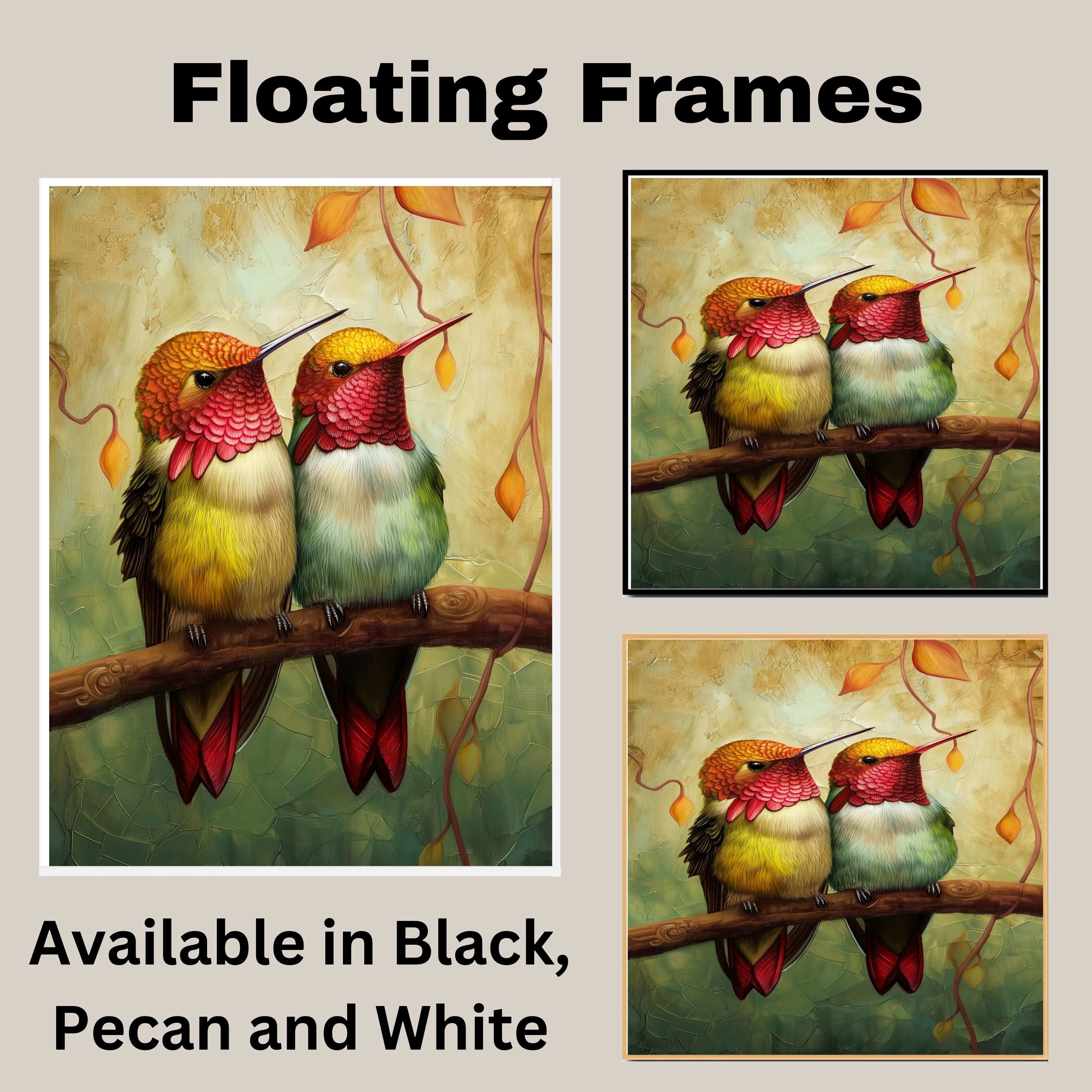 Whimsical Hummingbird Pair Artwork Featuring Red and Green Plumage Perched on a Branch with Textured Earth-Toned Background and Delicate Autumn Leaves on Ready to Hang 1.5" Thick Canvas Wrap, Floating Framed Canvas, Flat Rolled Canvas