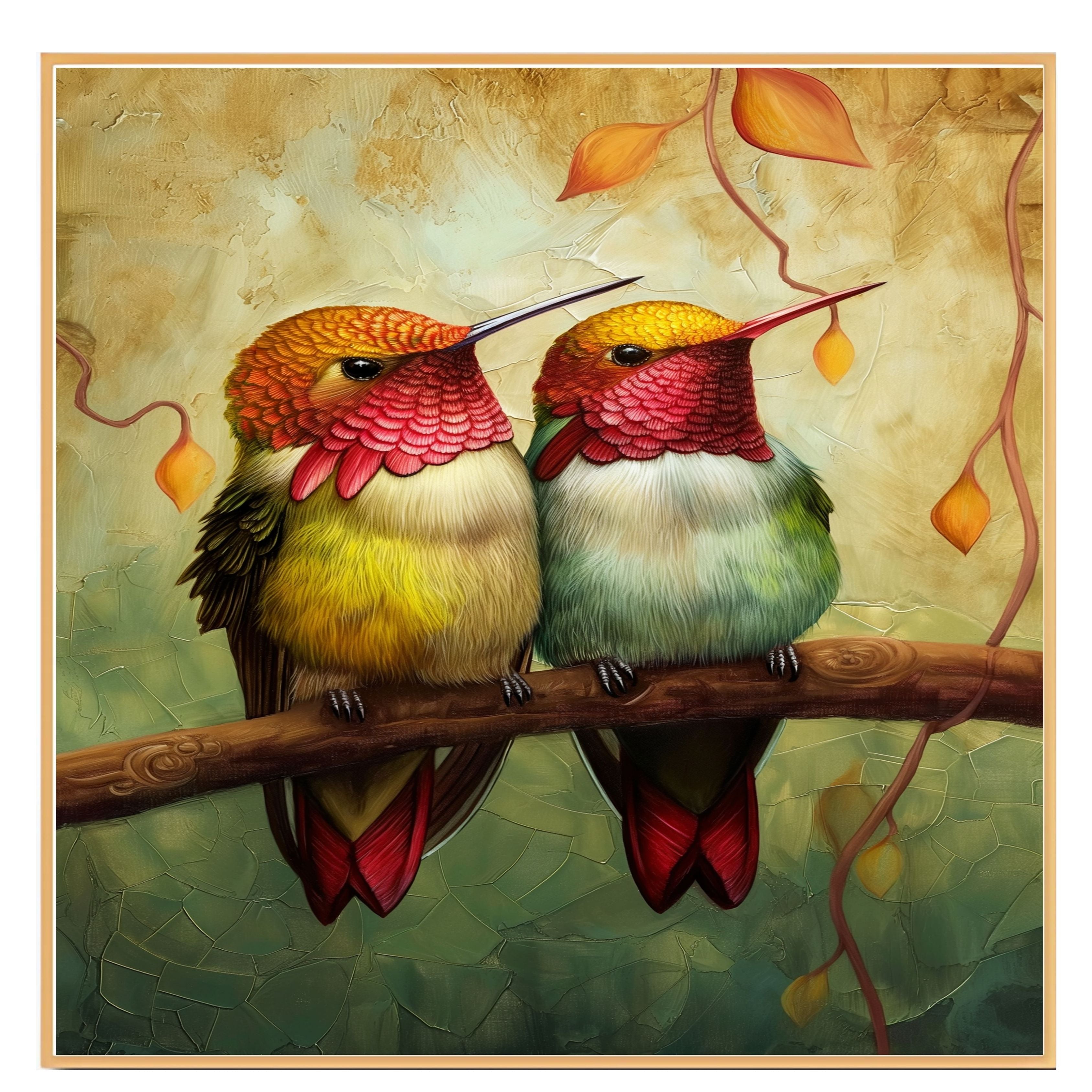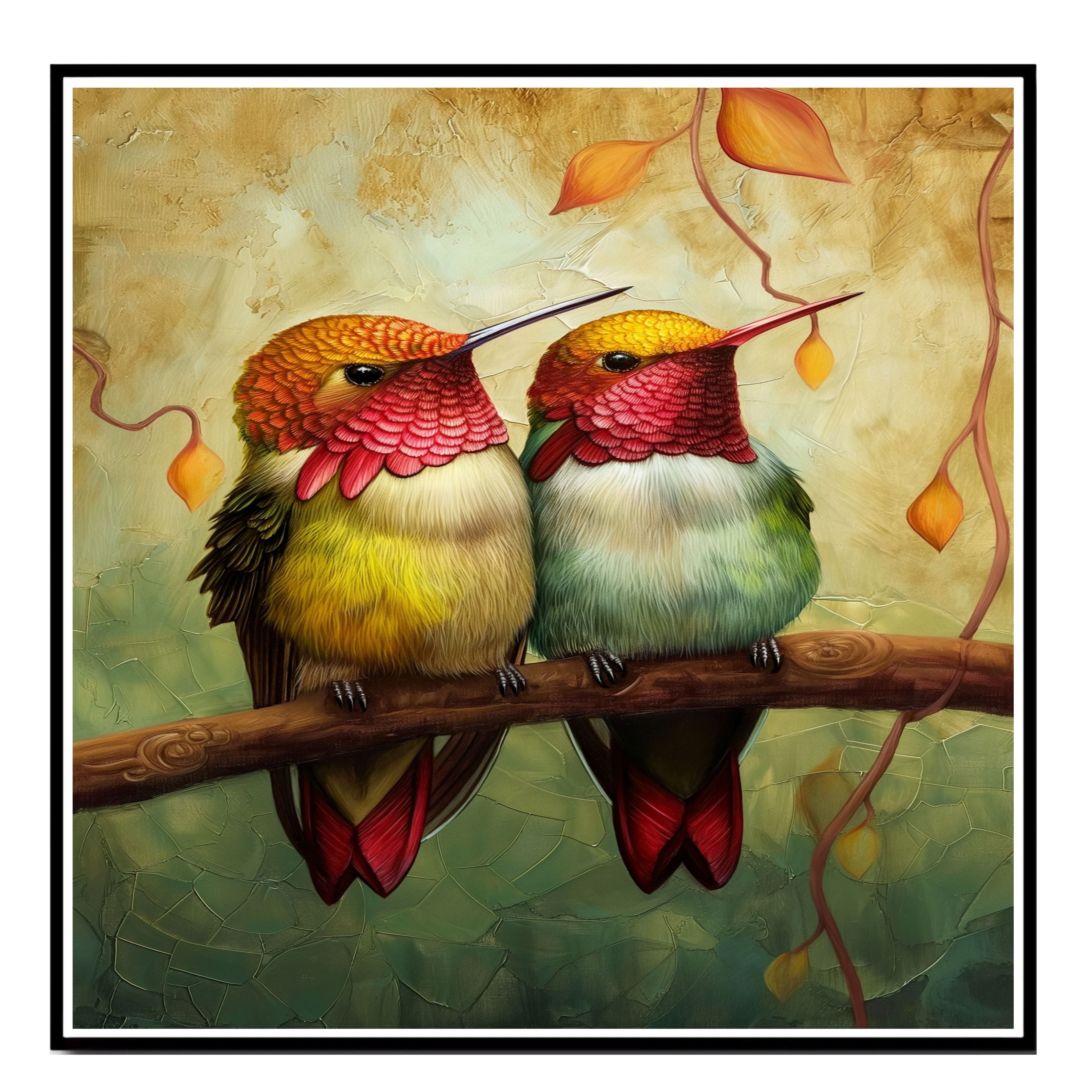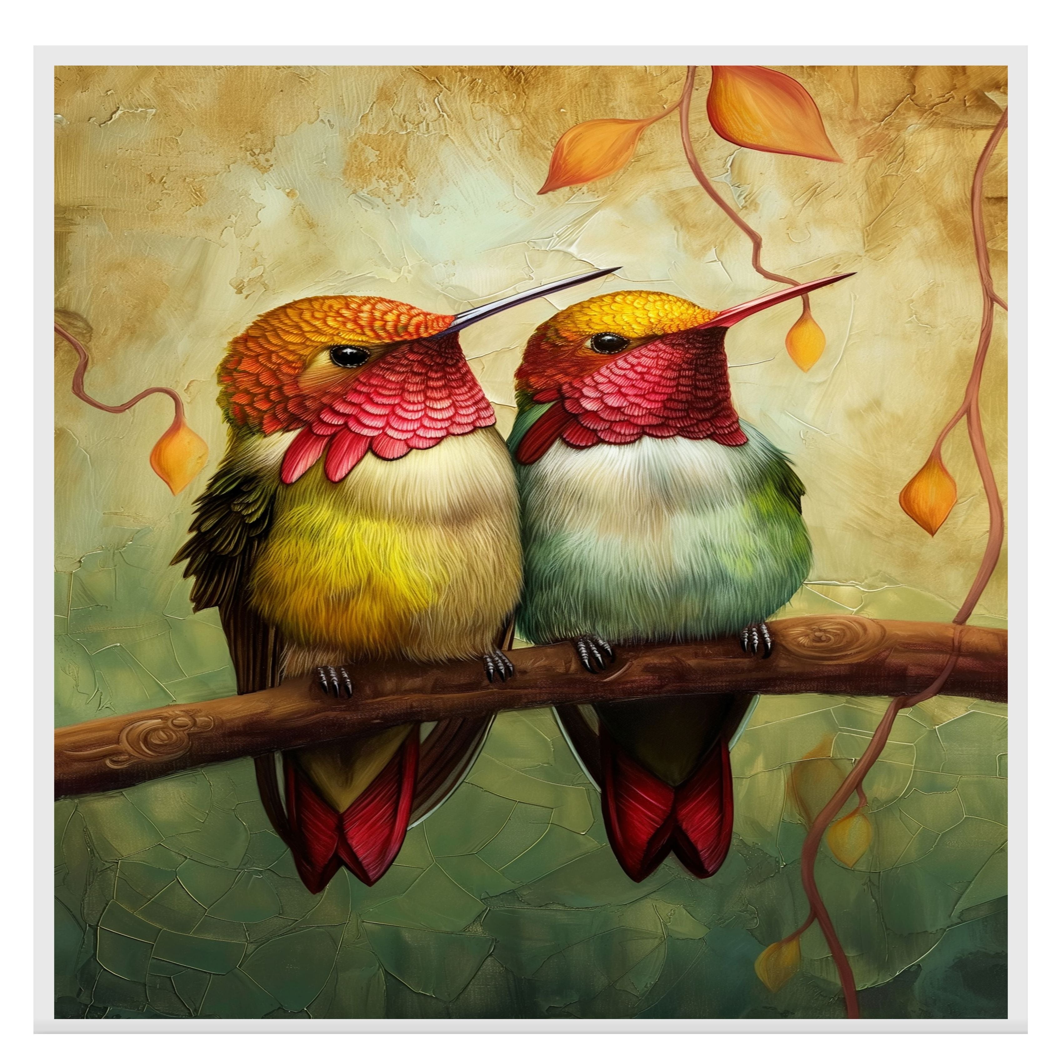 This charming artwork captures a pair of hummingbirds in exquisite detail, featuring rich red throats and green-golden feathers. Perched side by side on a branch, they rest against a textured background in warm earthy tones with softly falling autumn leaves—perfect for adding nature’s quiet beauty to your home.