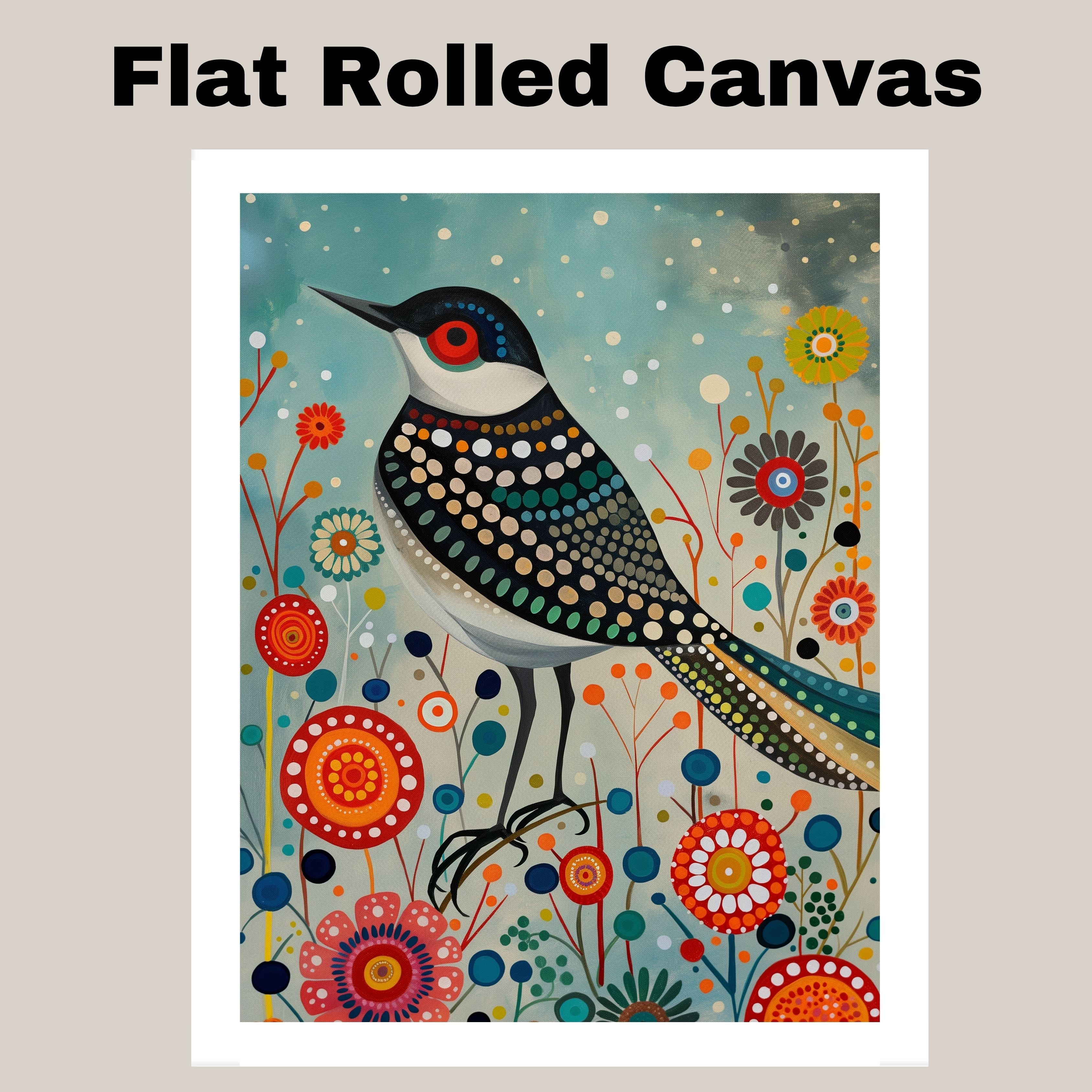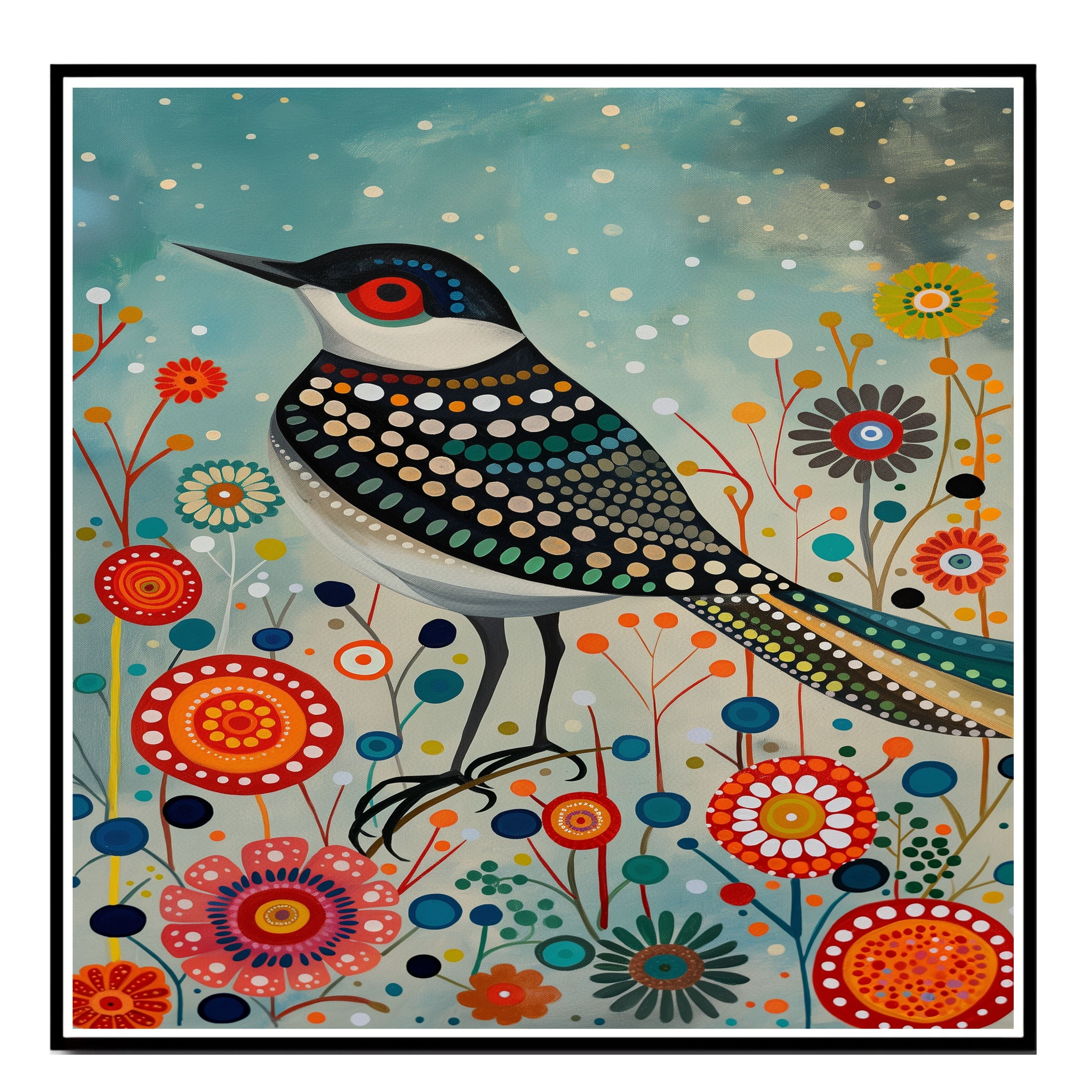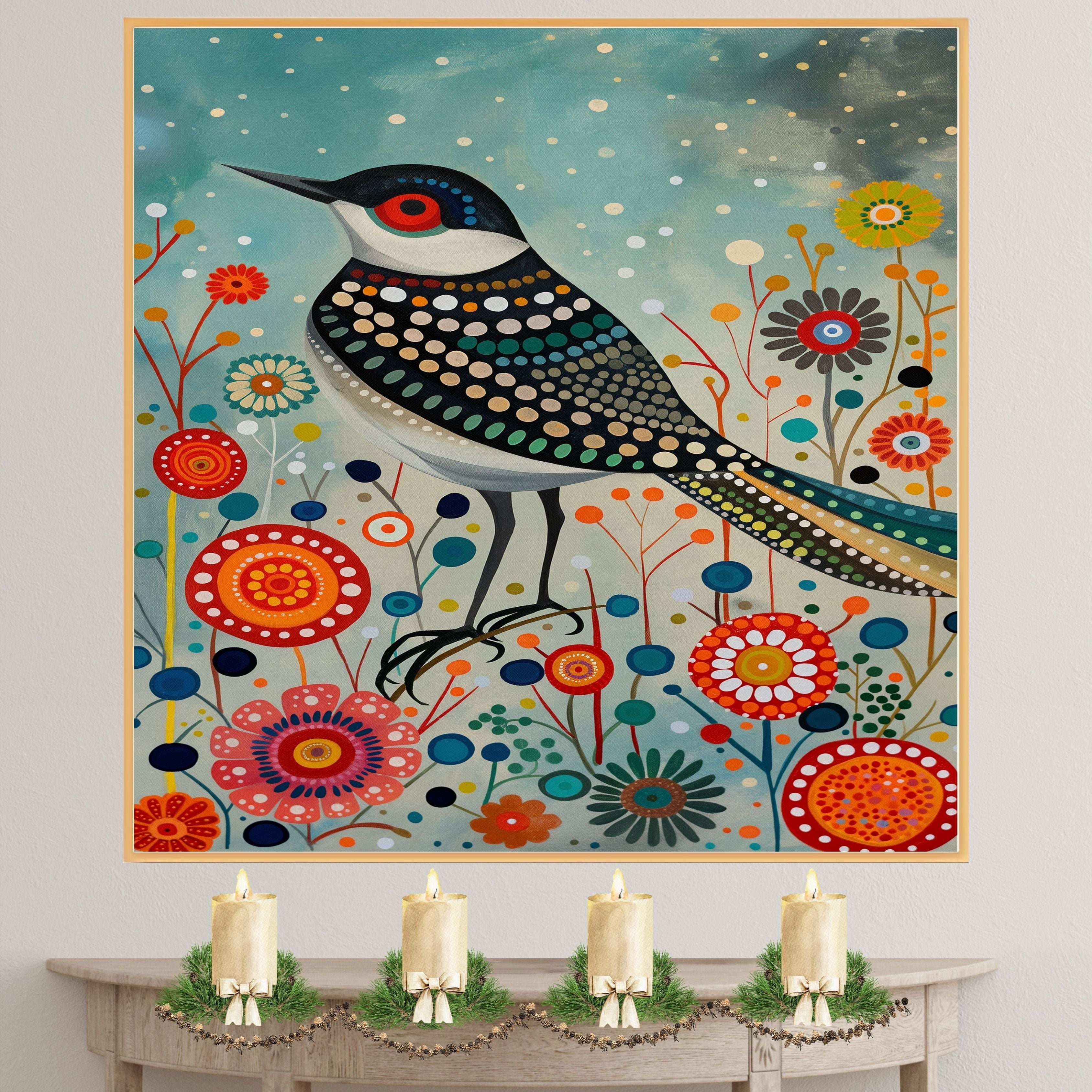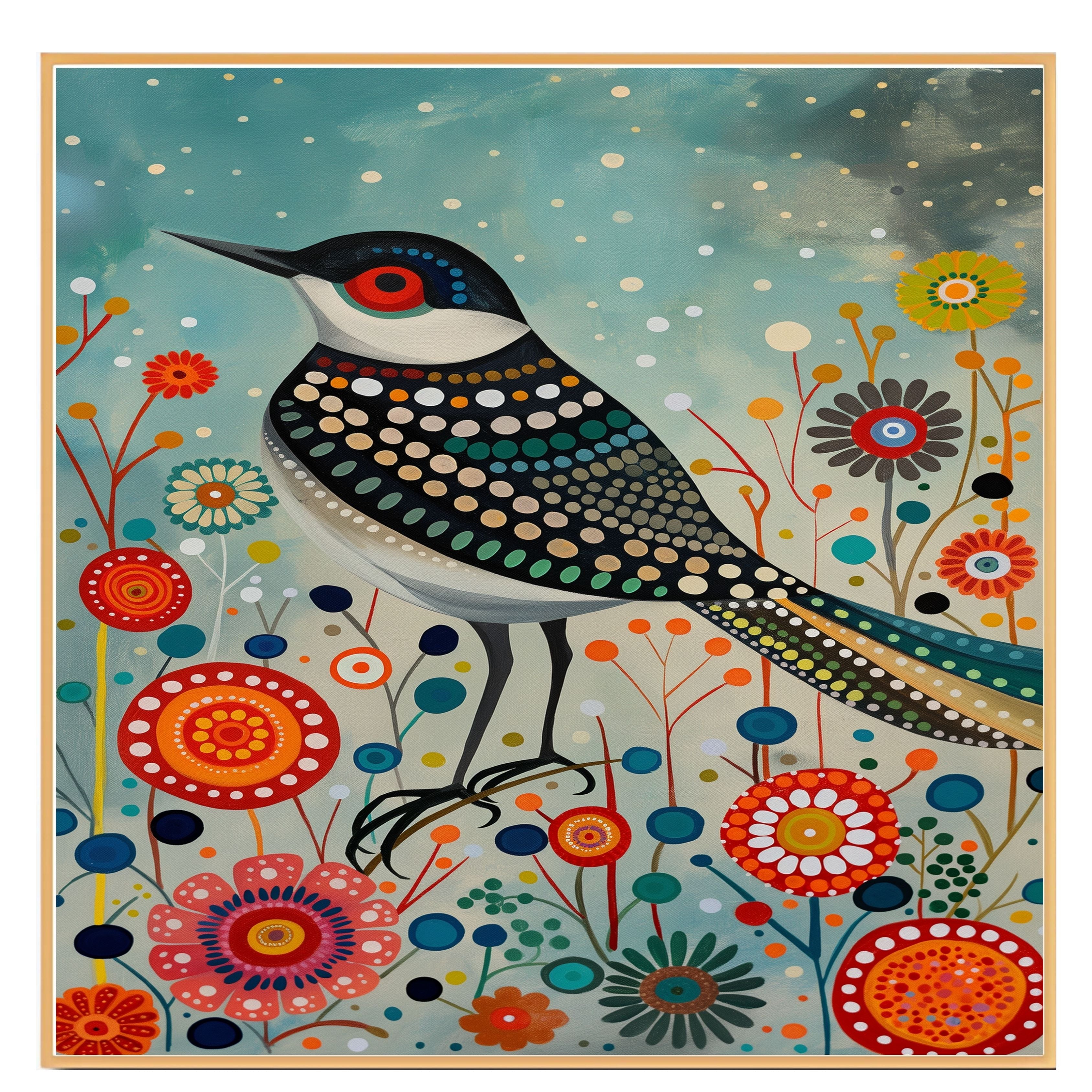 This delightful painting features a whimsically patterned bird adorned with dotted feathers, surrounded by bold, abstract floral elements. With a dreamy sky in the background and vibrant colors throughout, this artwork is perfect for those who love playful, nature-inspired themes. A cheerful addition to any room or creative space.