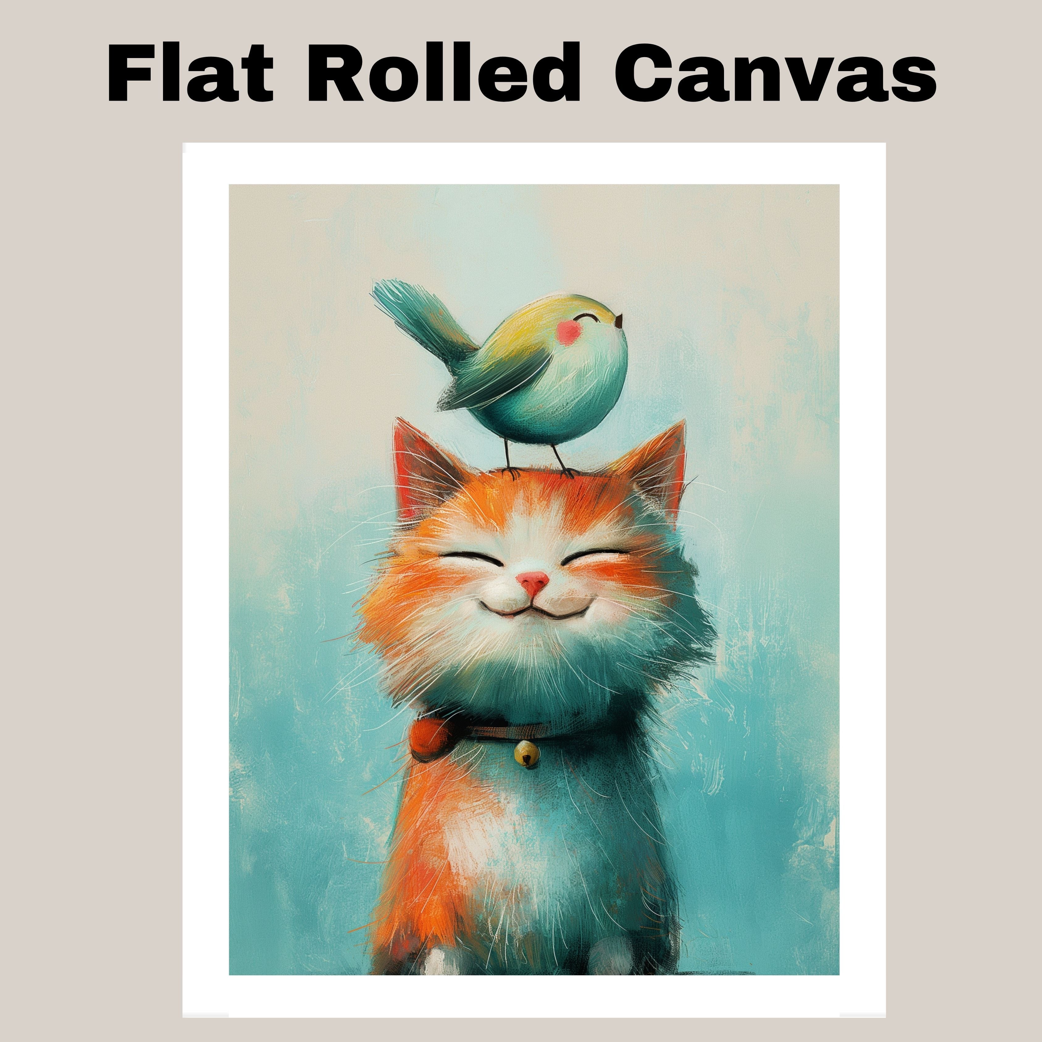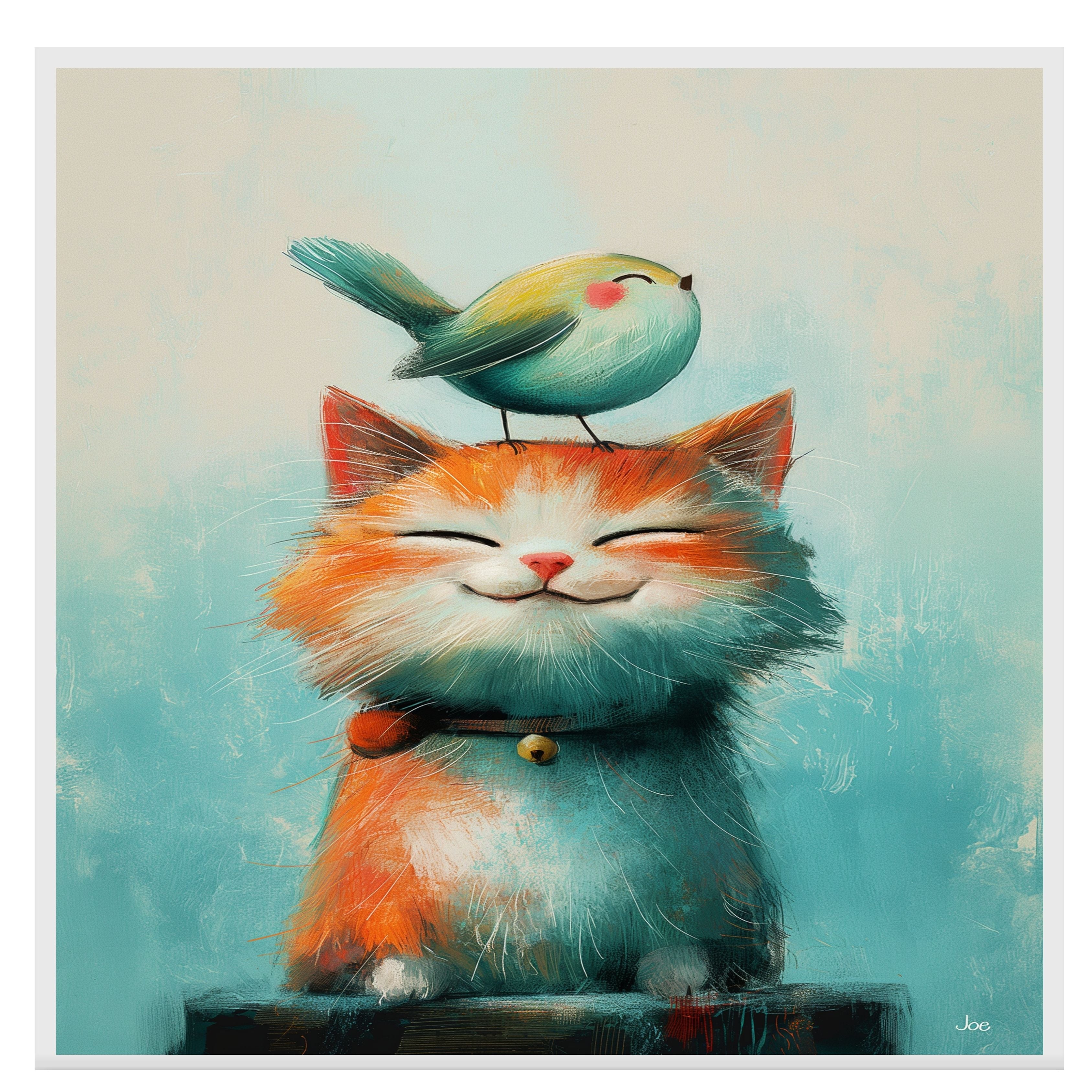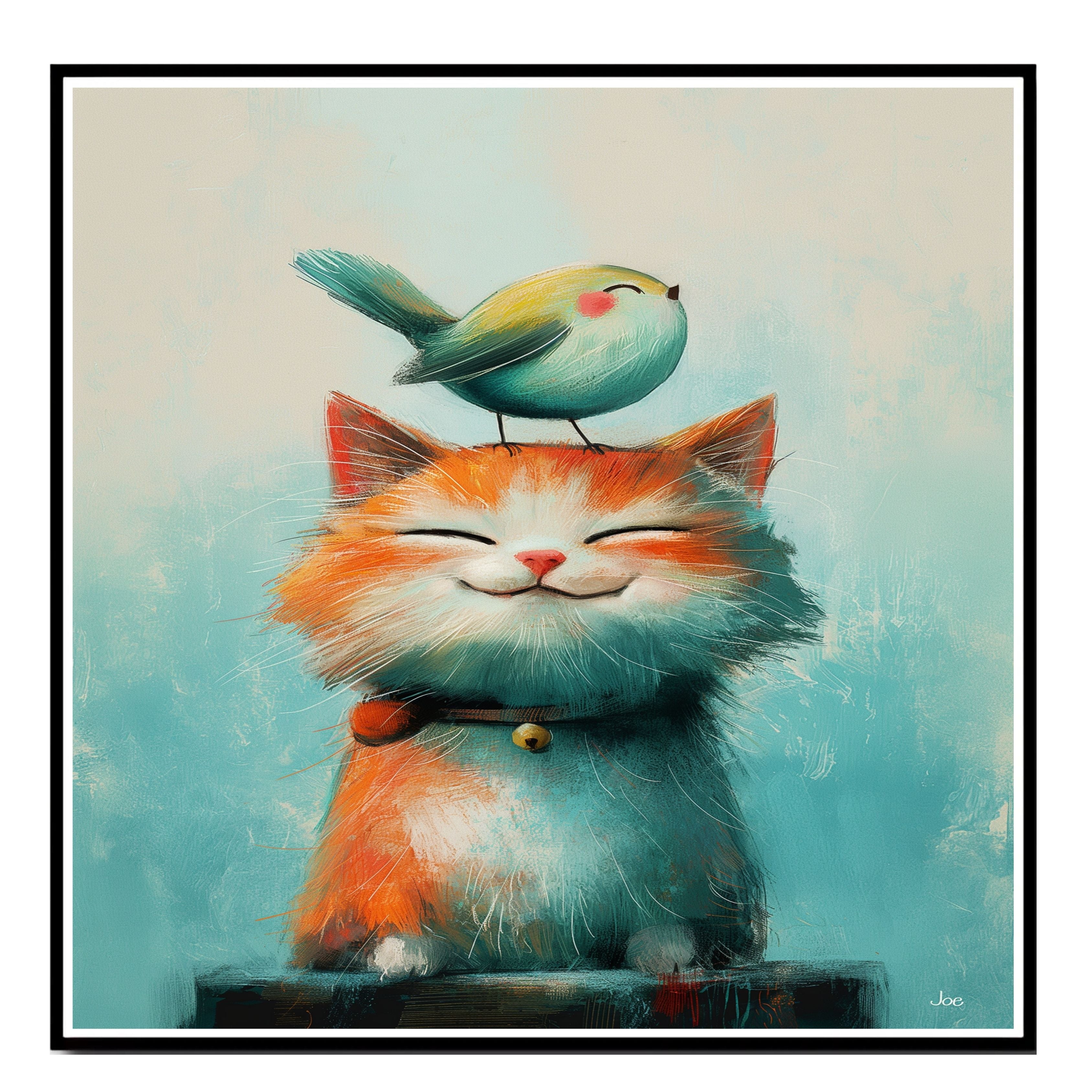 This charming and whimsical painting features a joyful orange cat wearing a gentle smile, with a cheerful bird perched on its head. The soft pastel background and heartwarming expressions make this piece a delightful choice for nurseries, pet lovers, or any space that could use a touch of happiness and calm. A perfect gift for those who adore playful animal art.