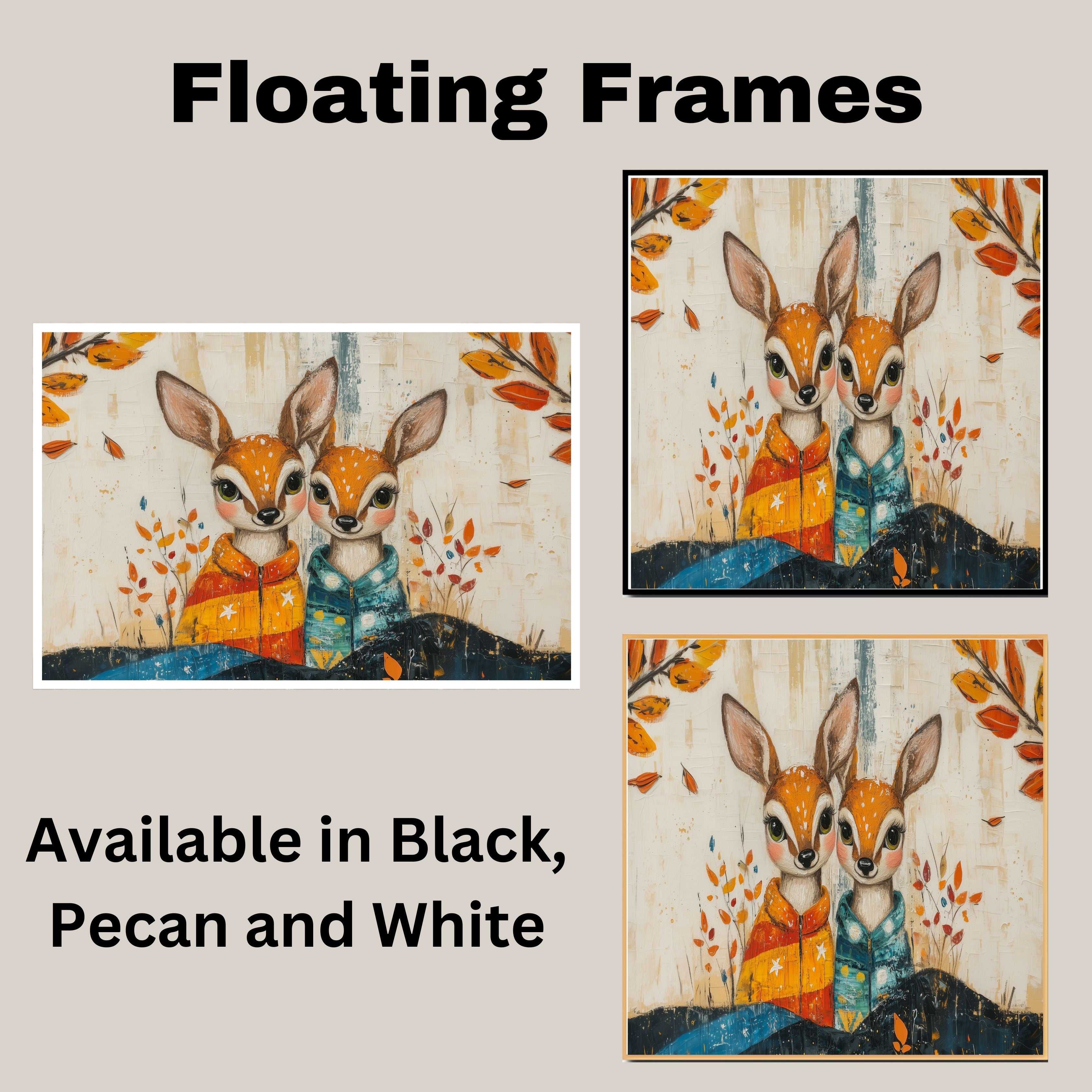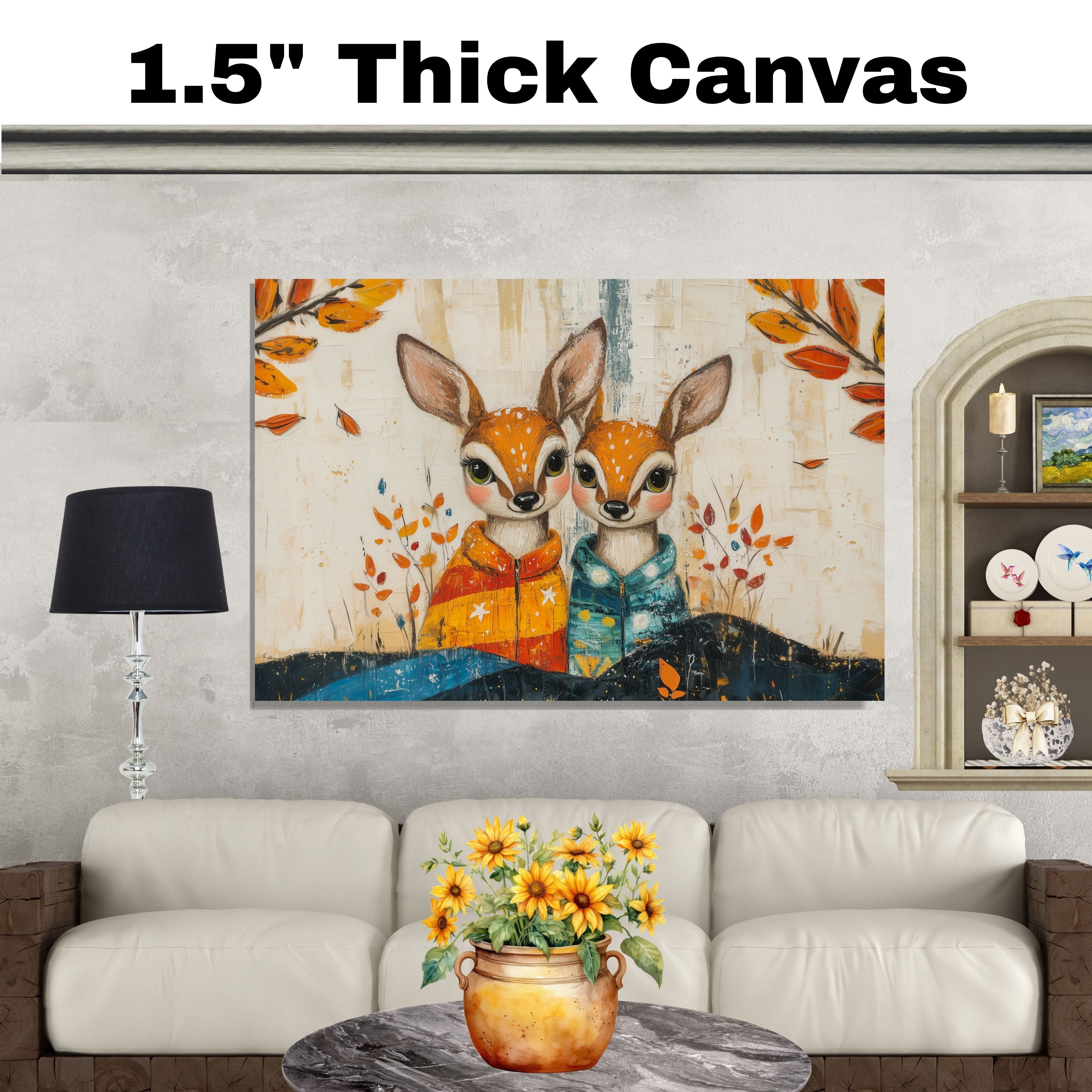 Whimsical Painting of Two Adorable Baby Deer in Colorful Pajamas Surrounded by Autumn Leaves and Nature-Inspired Background in Warm Fall Tones on Ready to Hang 1.5" Thick Canvas Wrap, Floating Framed Canvas, Flat Rolled Canvas