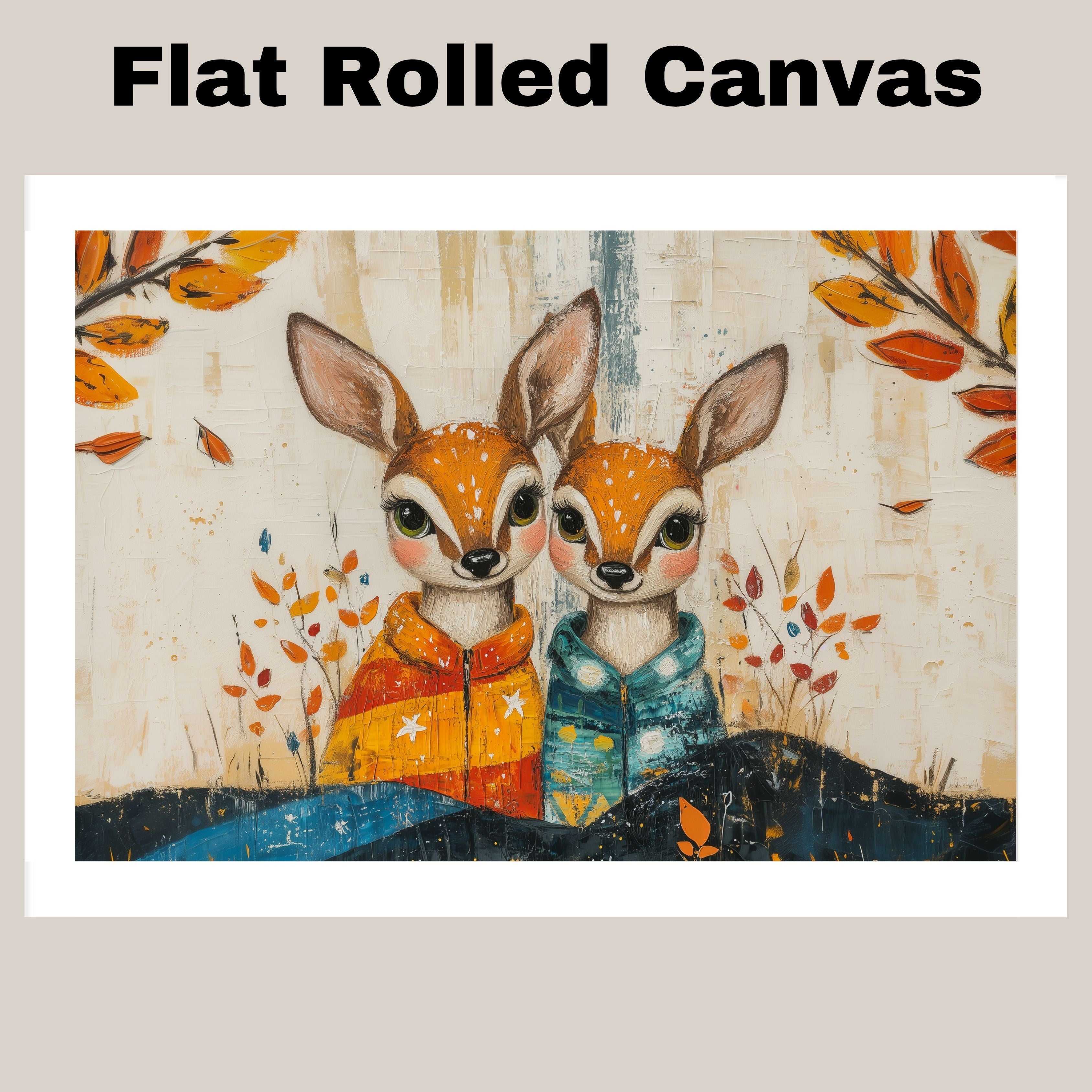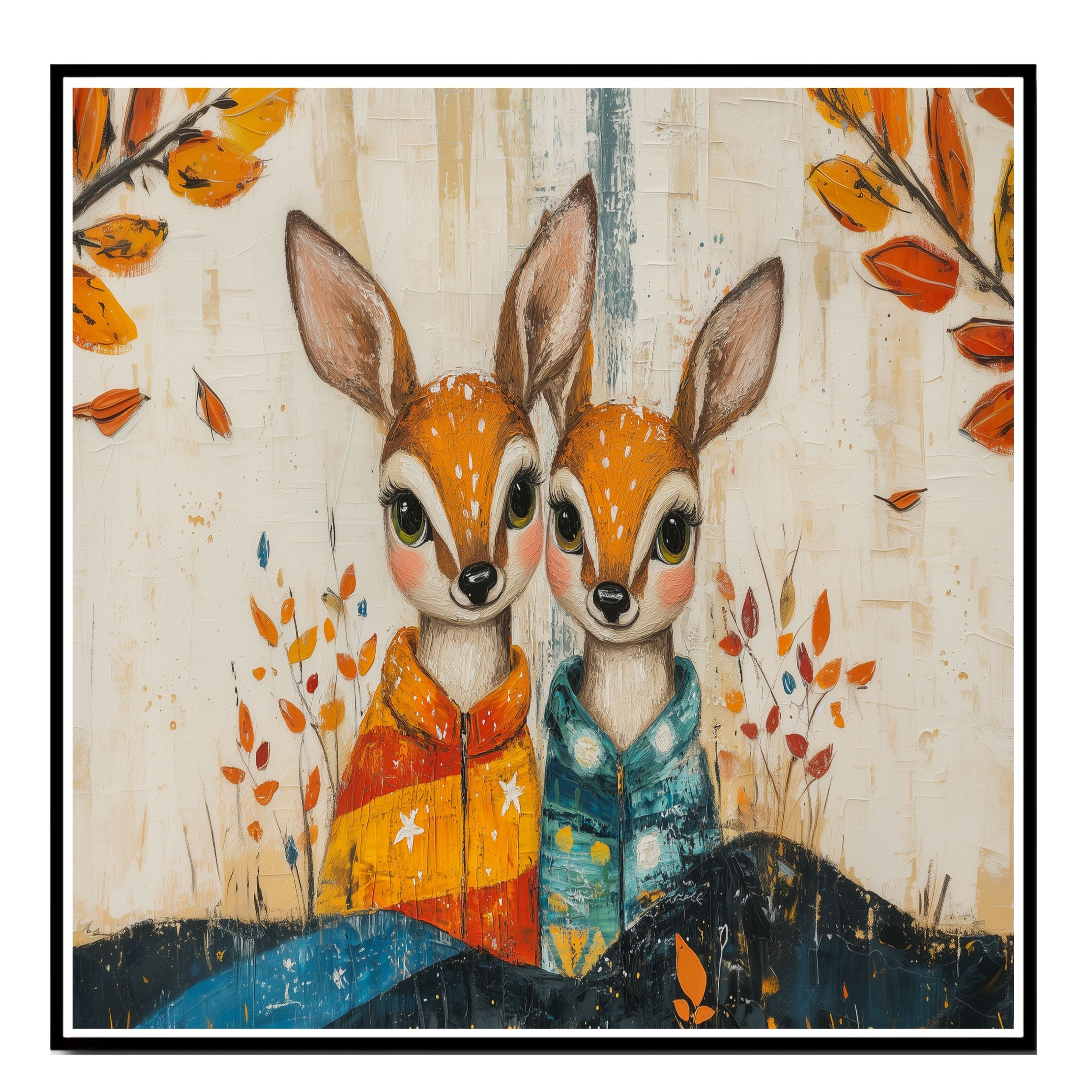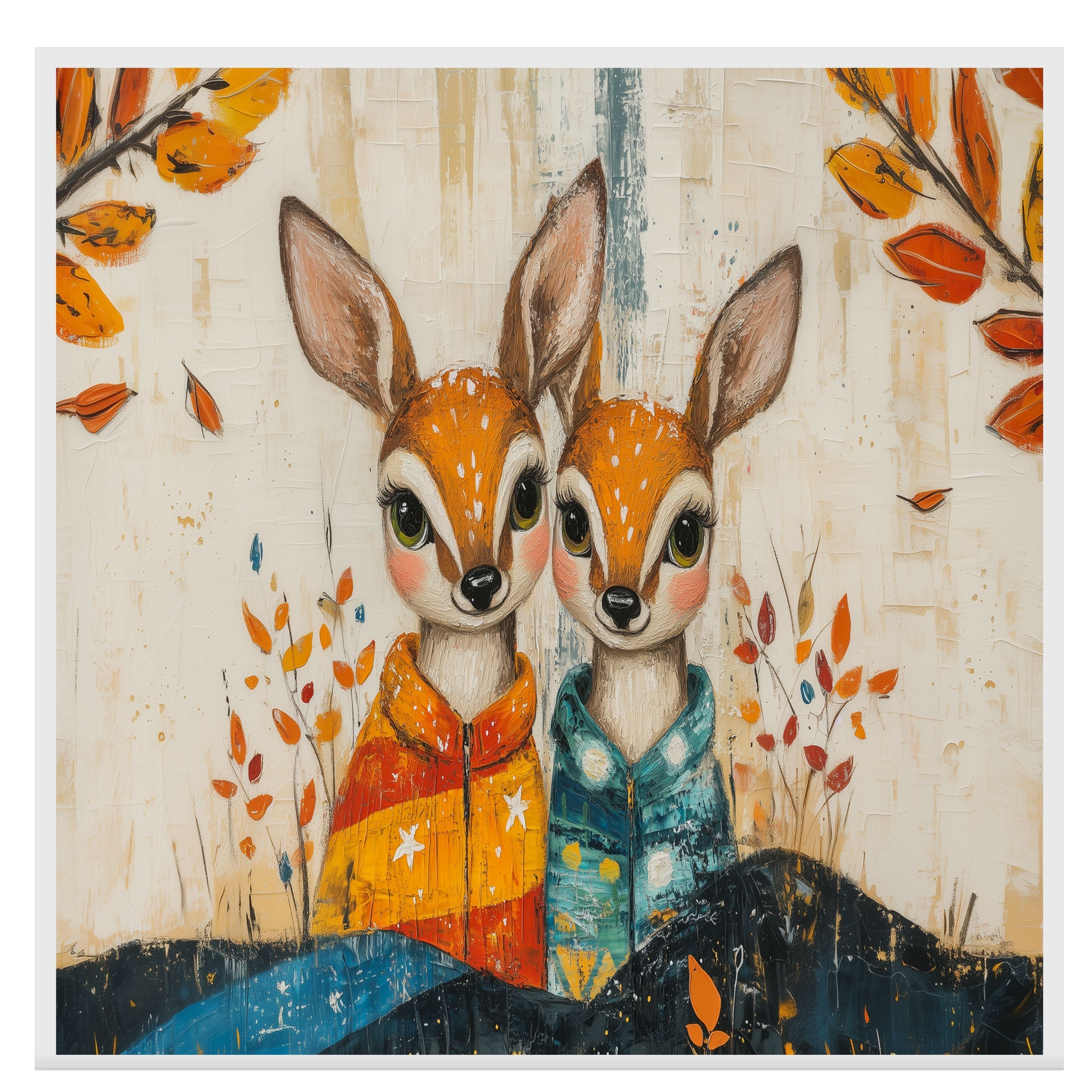This charming painting features two cute baby deer dressed in colorful pajamas, set against a textured autumn backdrop with vibrant leaves. Perfect for adding warmth and whimsy to any space, this artwork evokes joy and cozy seasonal vibes. Makes a delightful gift for nature and animal lovers alike.