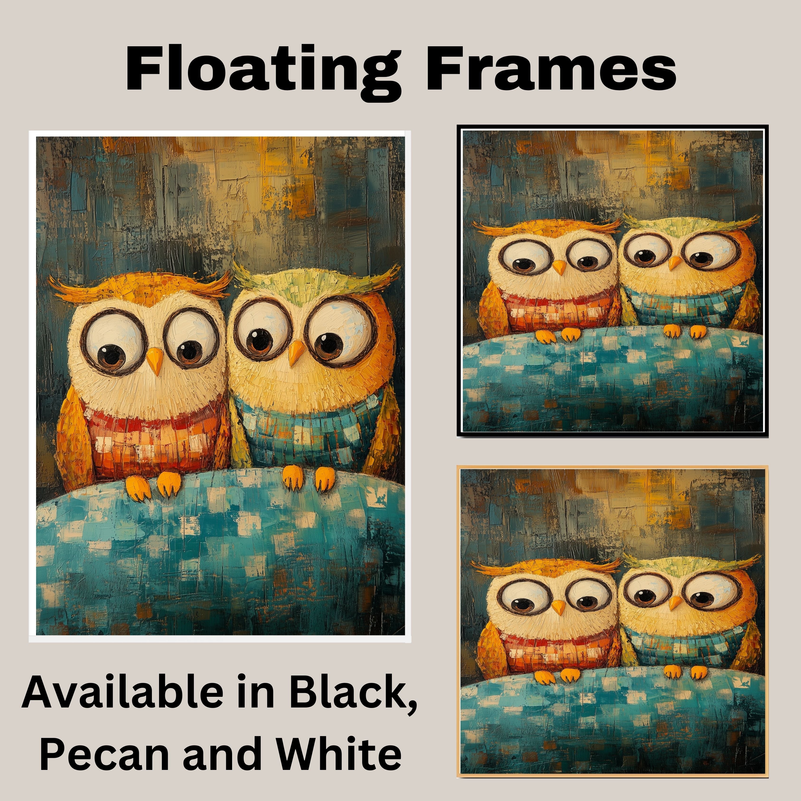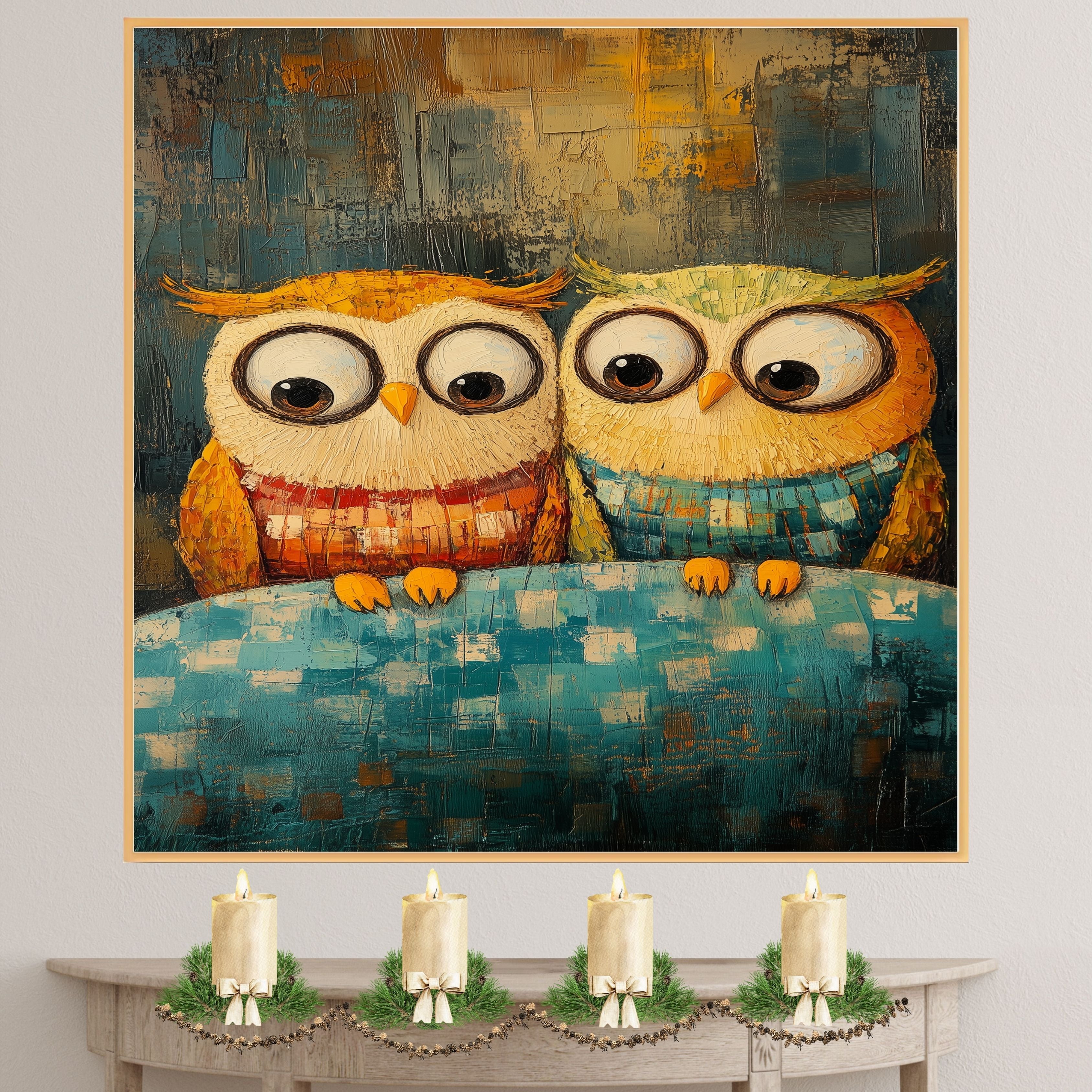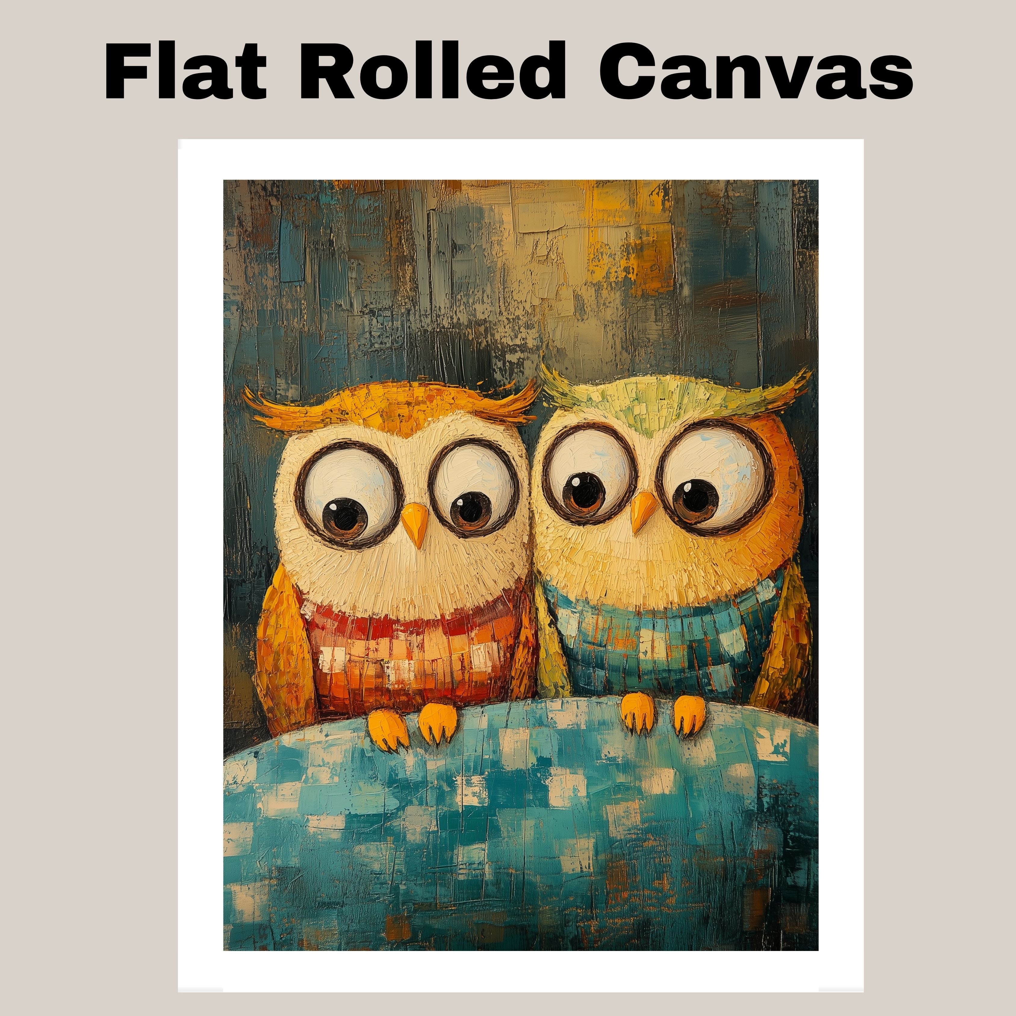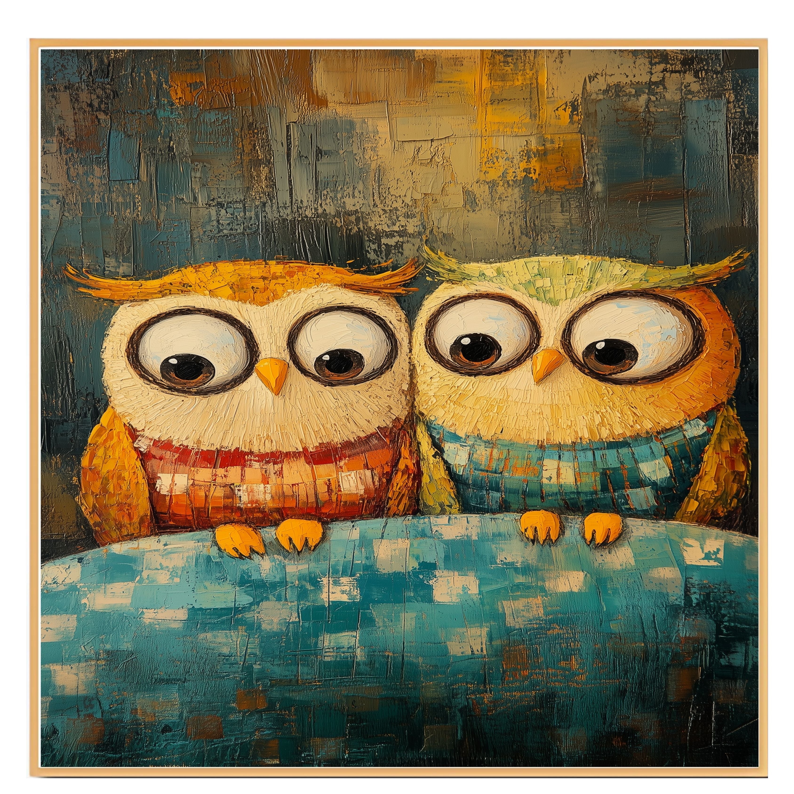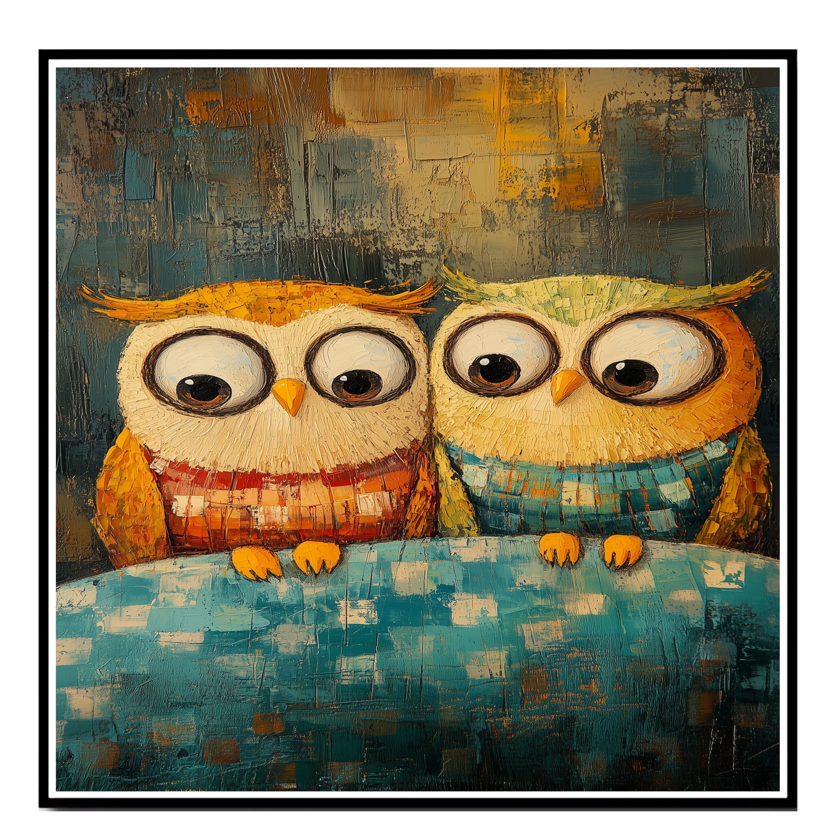 This charming artwork features two lovable owls in cozy sweaters, perched together on a soft blanket with vibrant colors and rich texture. Ideal for adding warmth and whimsy to any space, this expressive piece is crafted in a bold impasto style, showcasing a playful yet heartfelt moment. Perfect for animal lovers and fans of colorful, imaginative art.