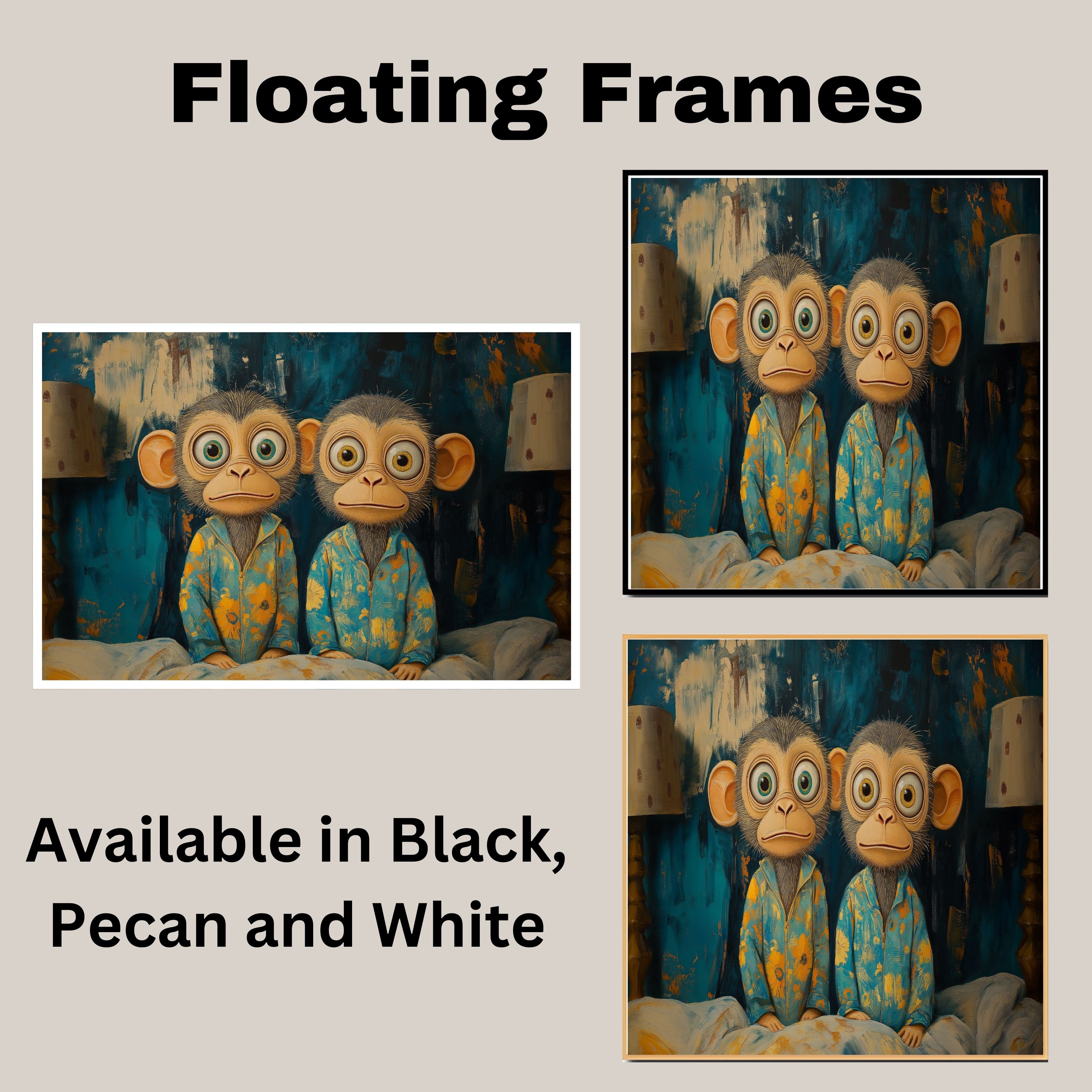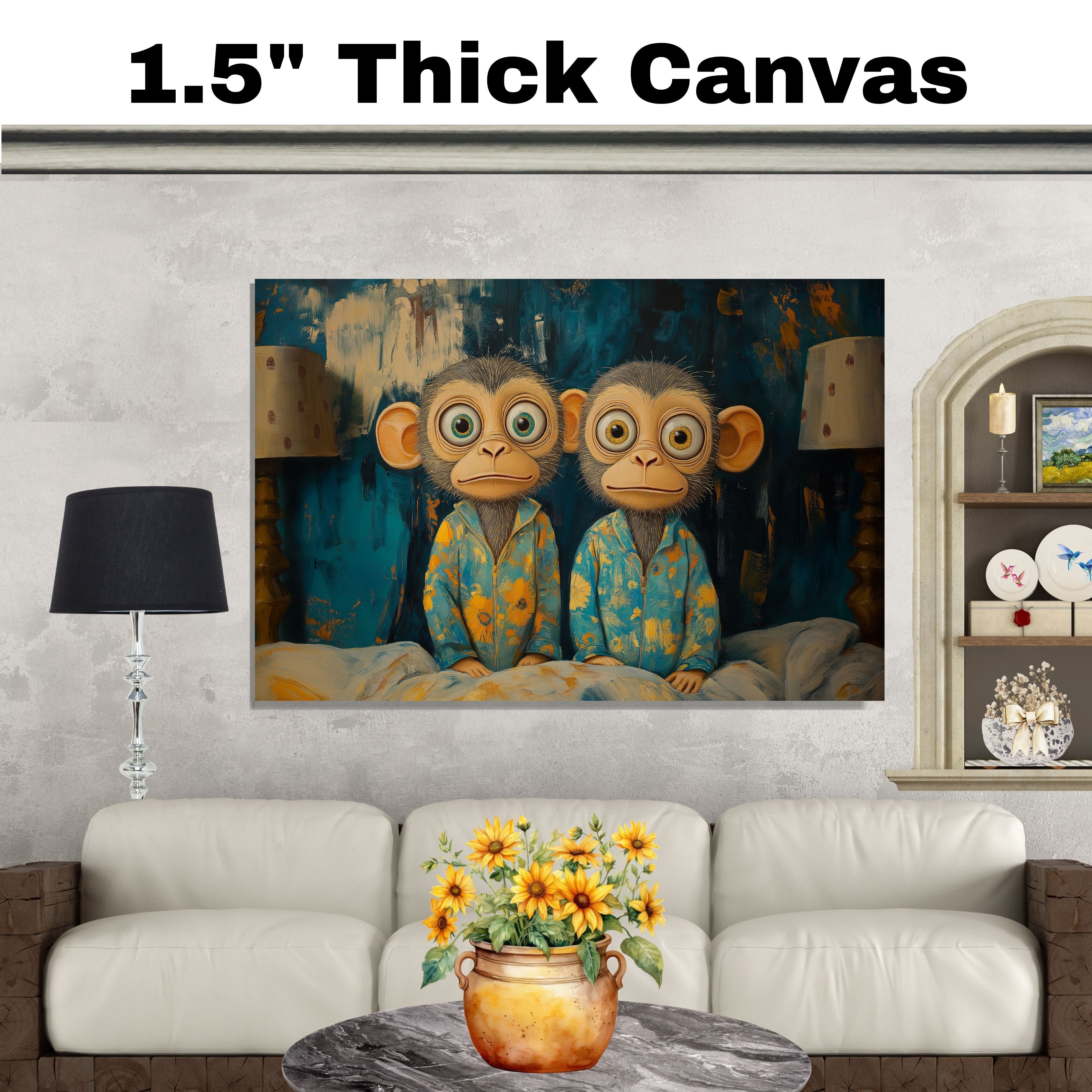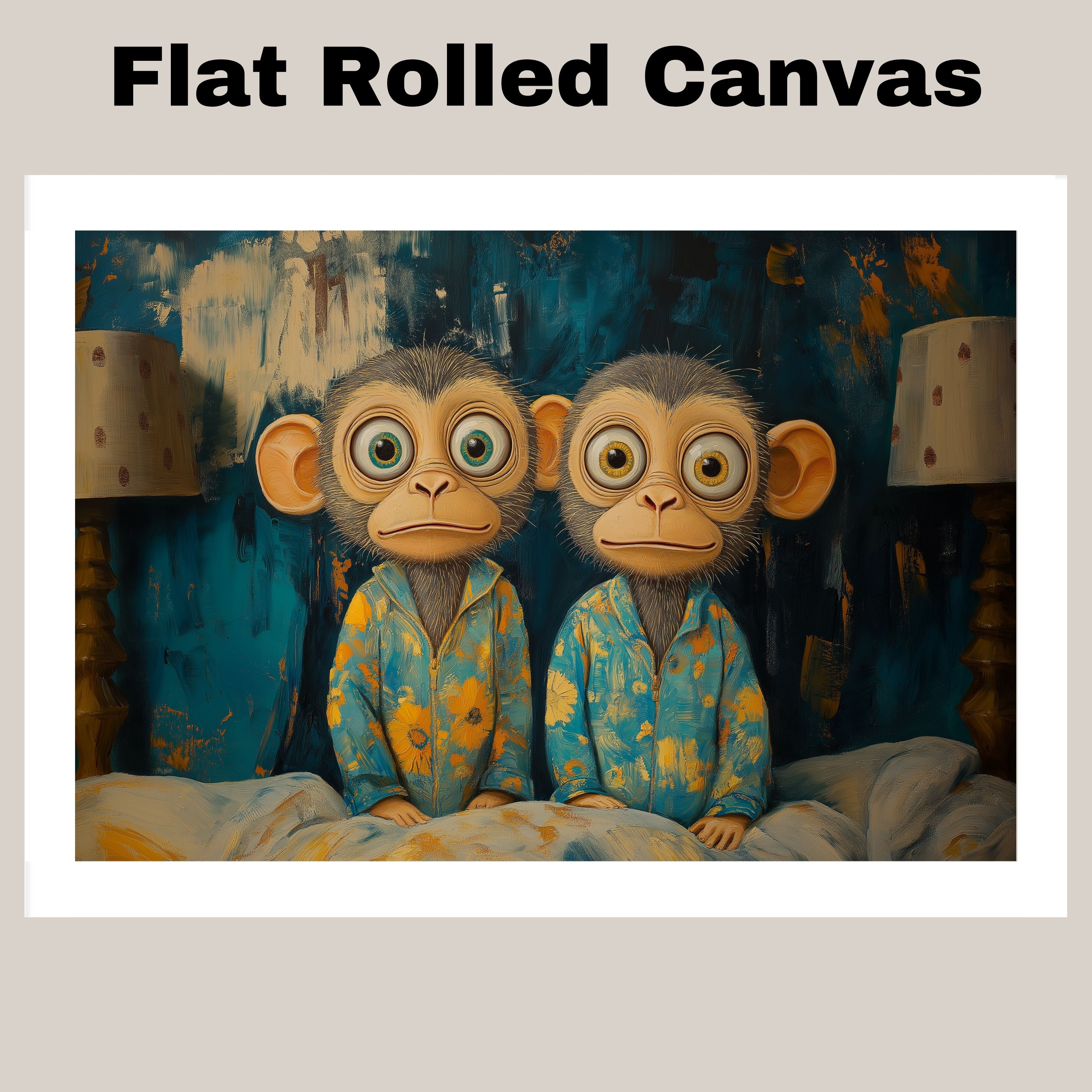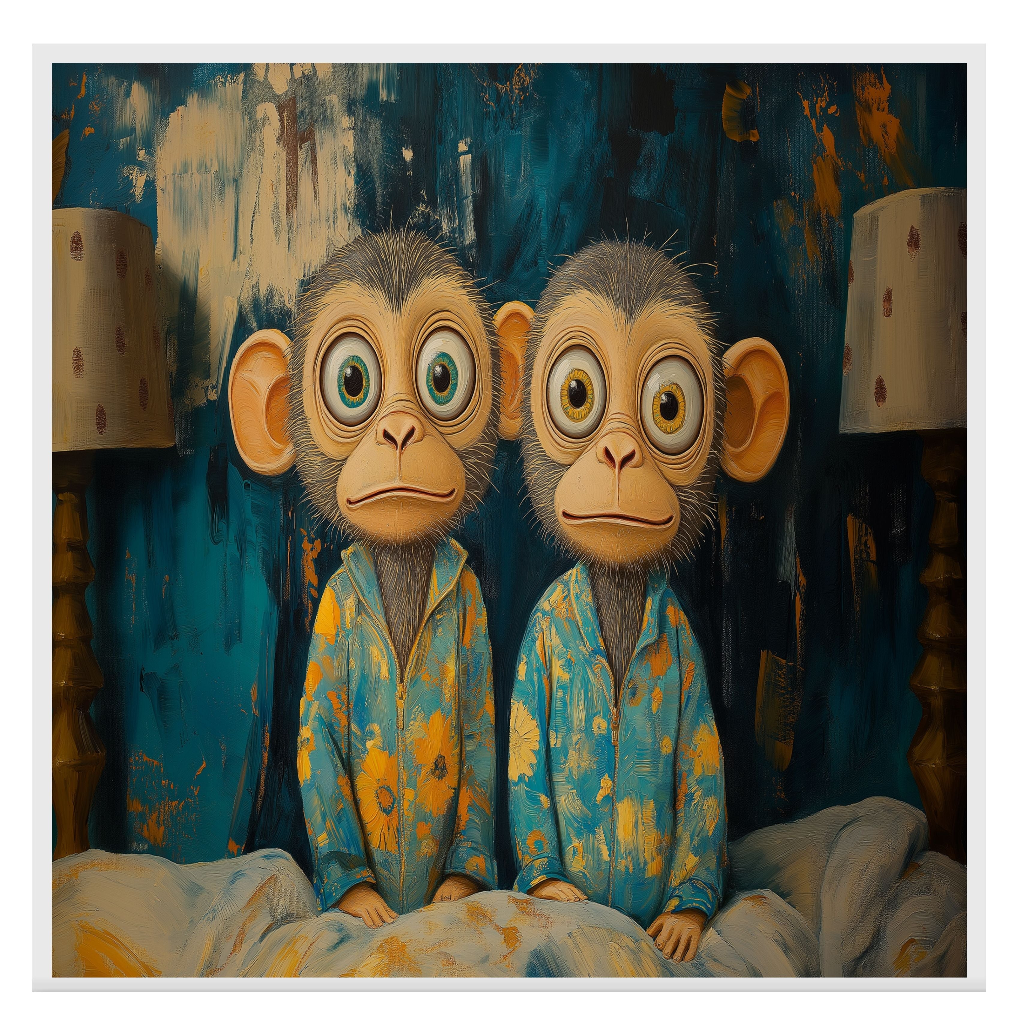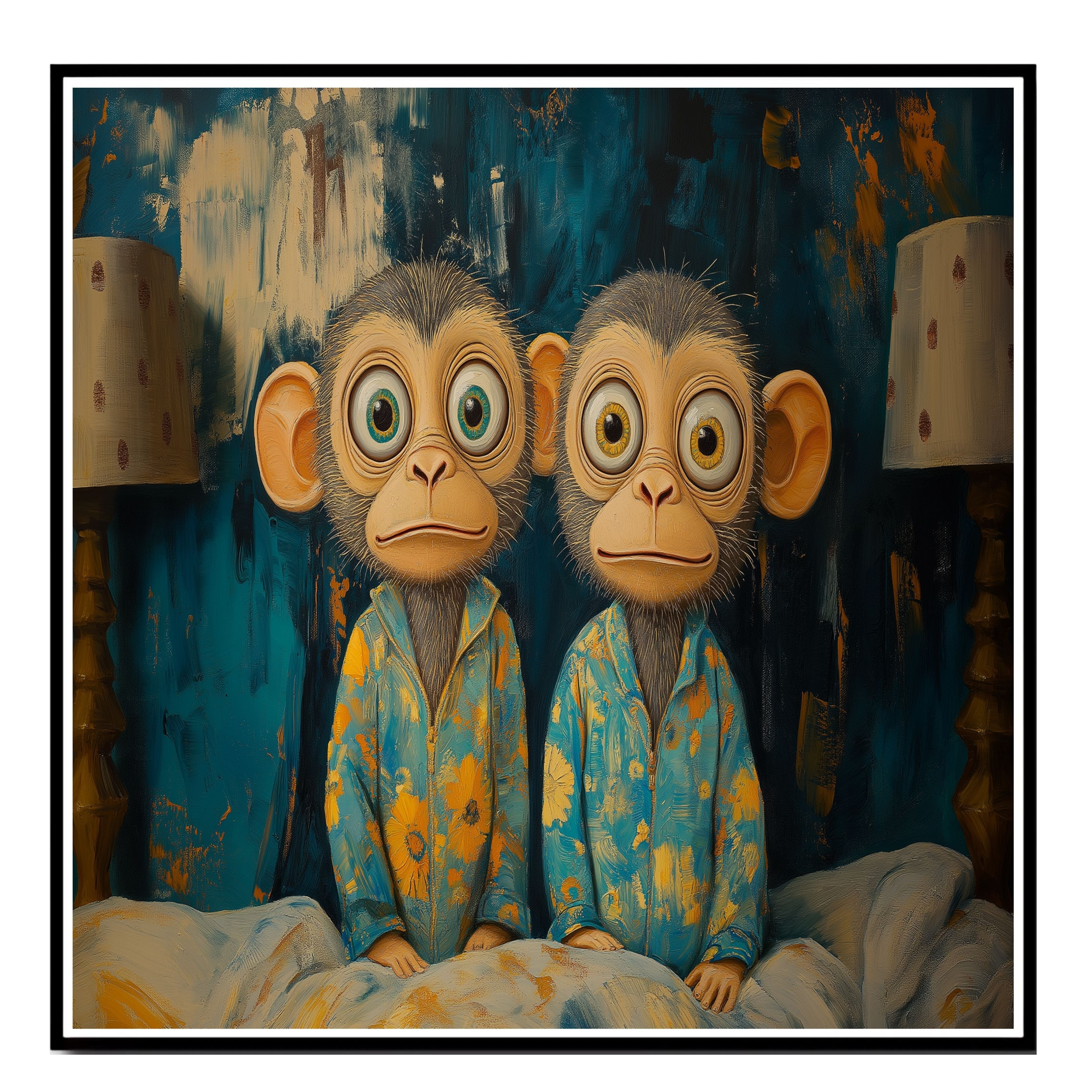 This playful painting features two monkeys in matching blue floral pajamas seated side by side on a cozy bed. With their wide, humorous eyes and quirky expressions, they create a lighthearted and whimsical scene. Perfect for nursery spaces, kids’ rooms, or animal art collections.
