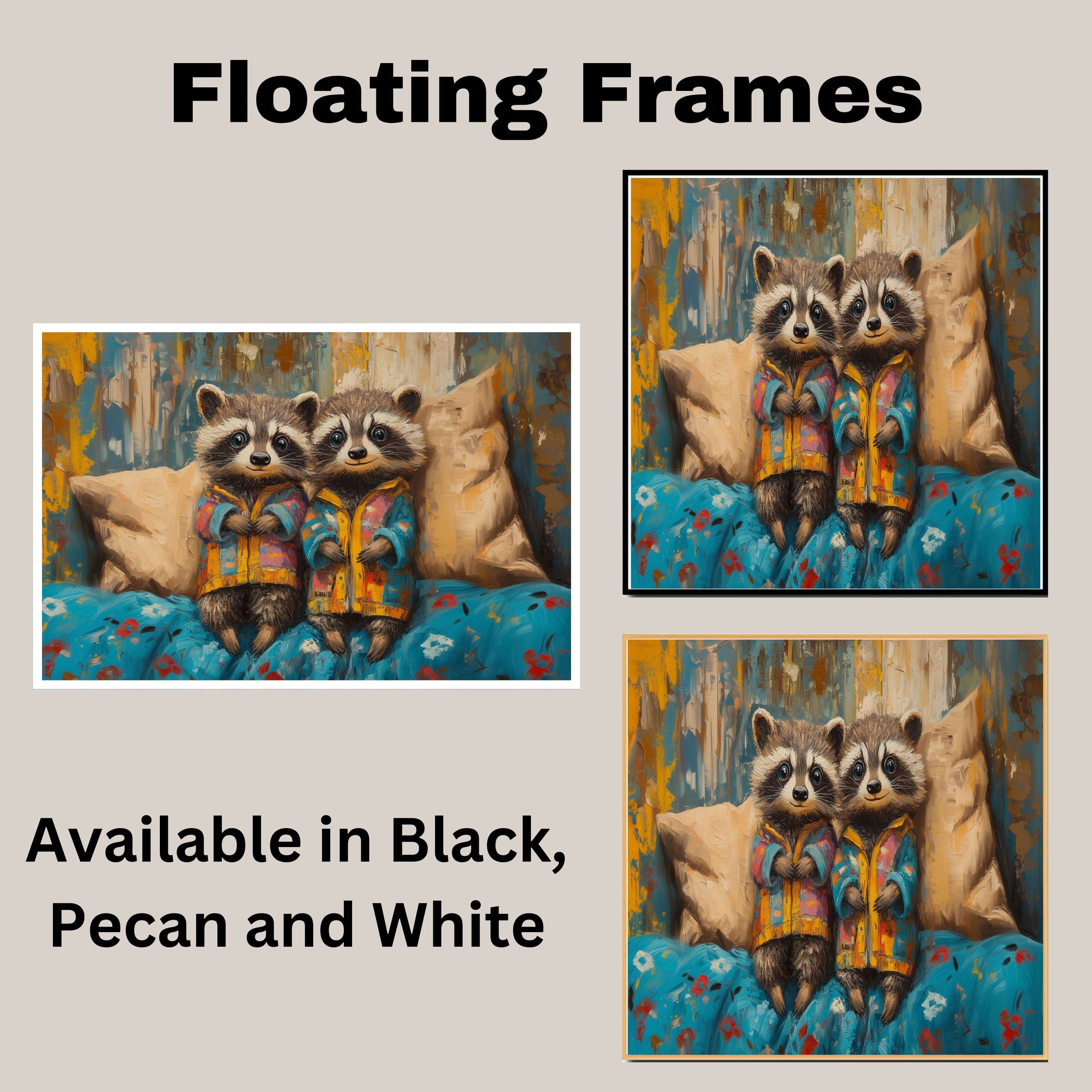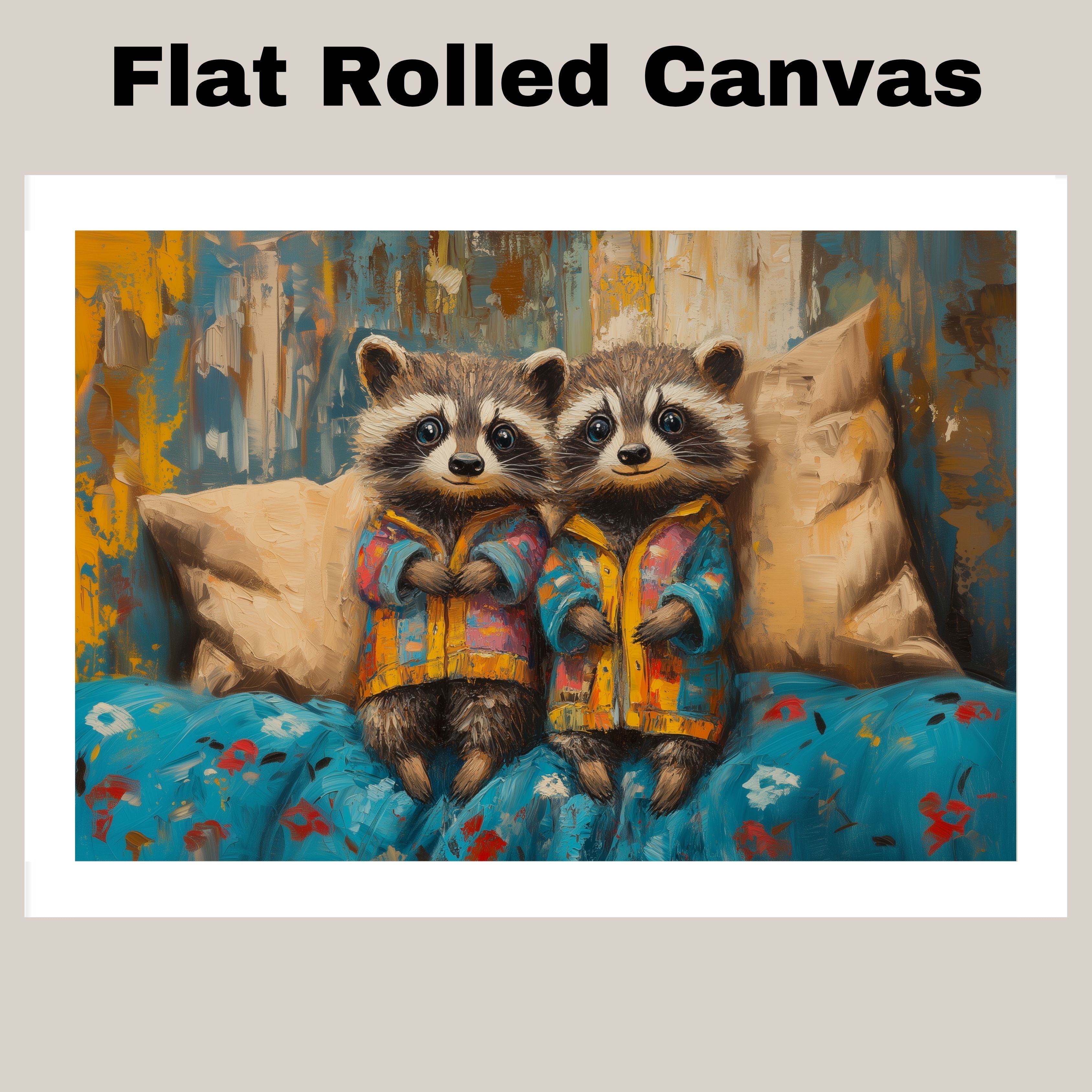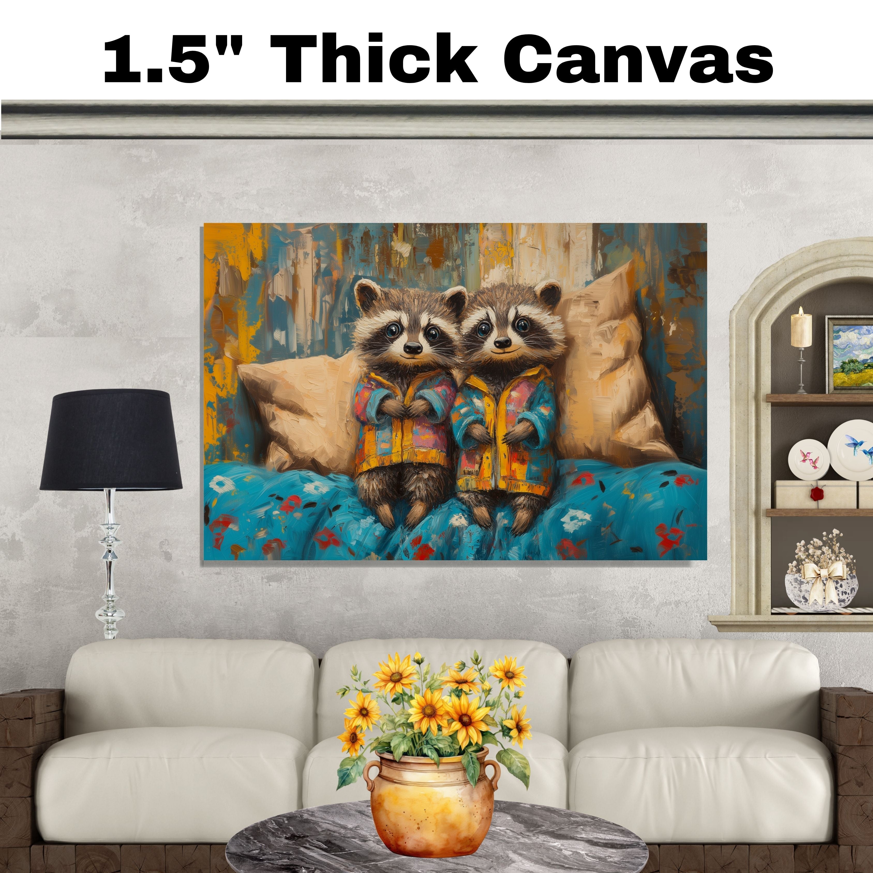Whimsical Painting of Two Raccoons in Bright Pajamas Sitting on a Bed with Soft Pillows and a Colorful Blanket in a Cozy Setting with Expressive Faces on Ready to Hang 1.5" Thick Canvas Wrap, Floating Framed Canvas, Flat Rolled Canvas