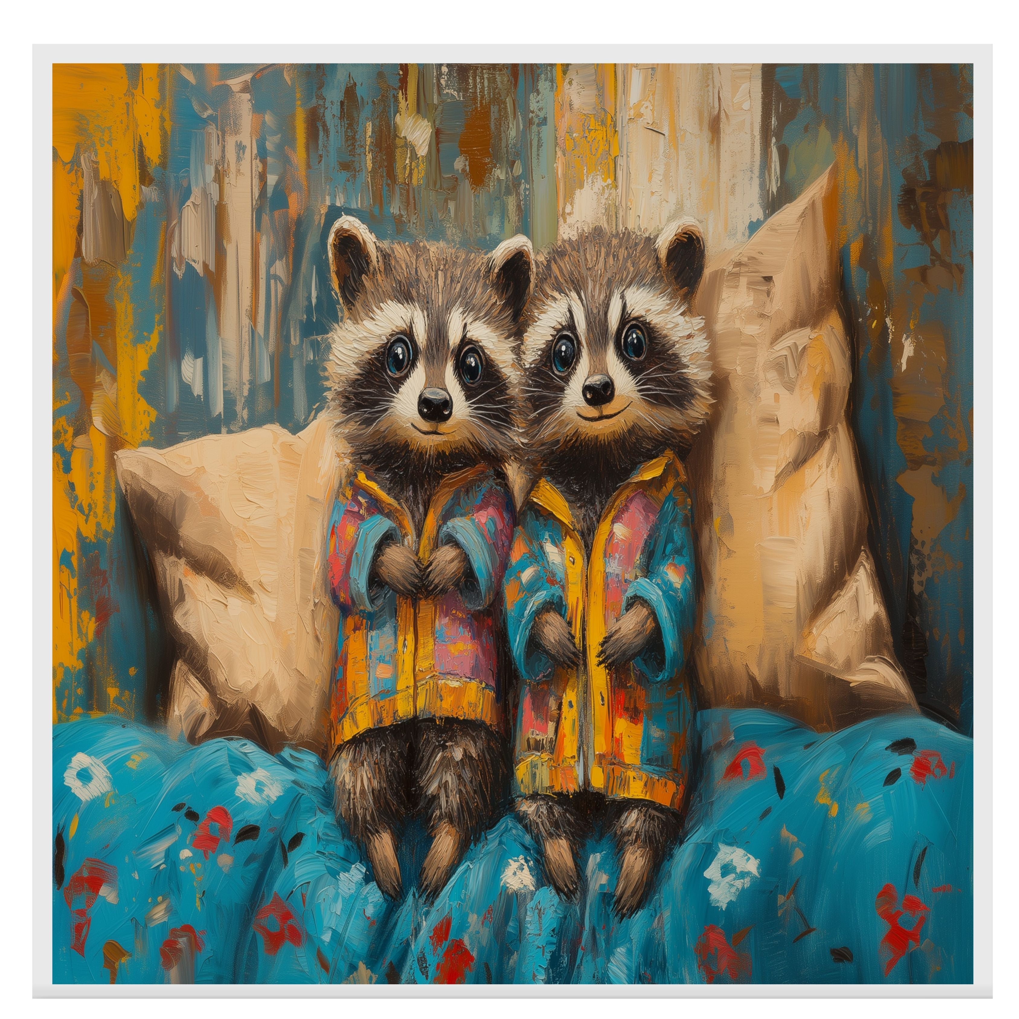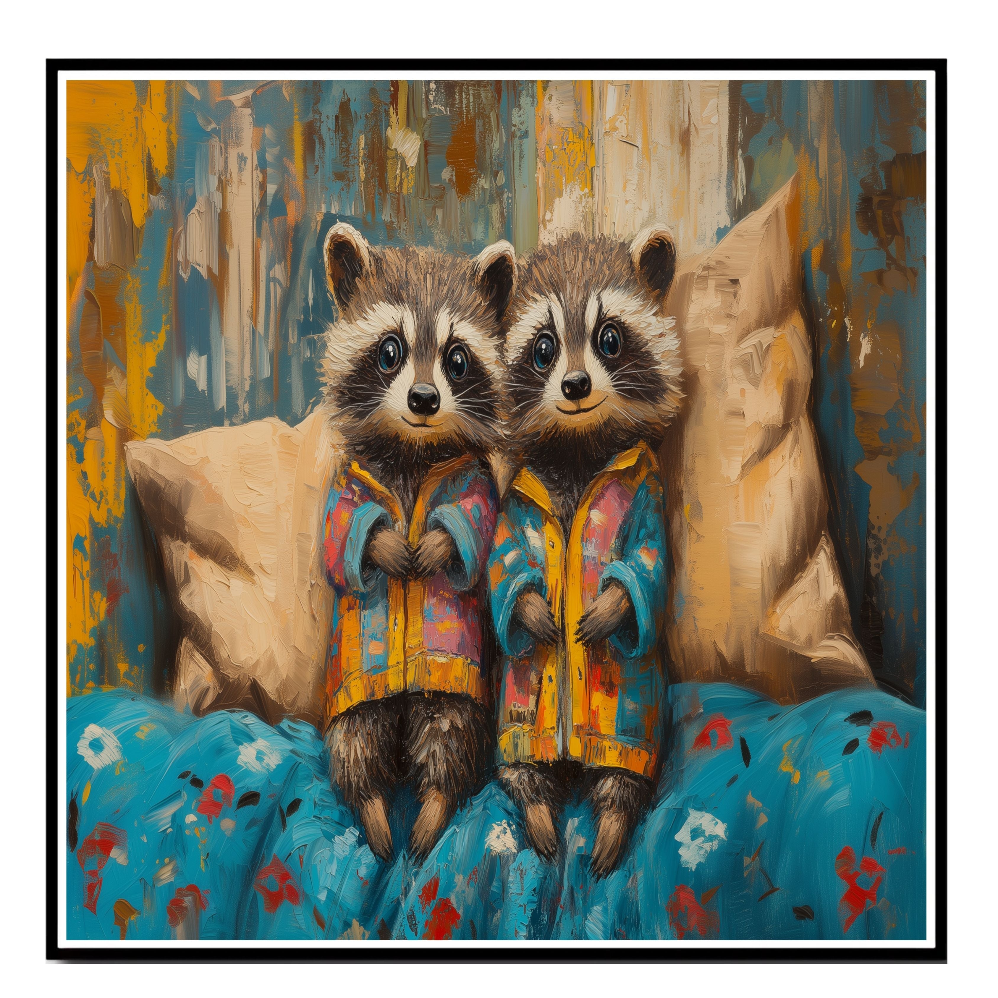This endearing painting features two raccoons dressed in vibrant pajamas, seated comfortably on a bed with soft pillows and a lively patterned blanket. Their expressive eyes and joyful demeanor make this a perfect addition to nurseries, woodland-themed rooms, or animal art collections.