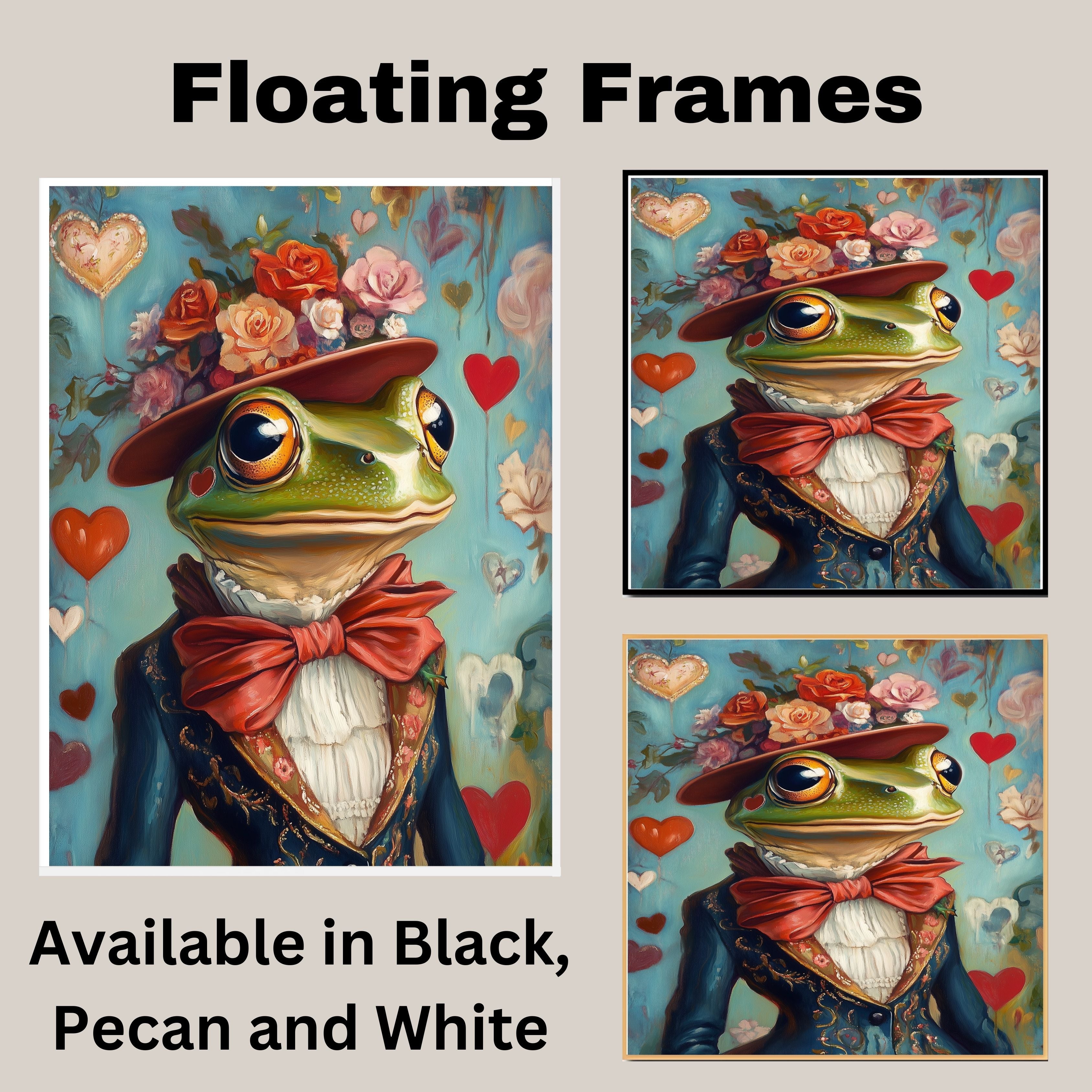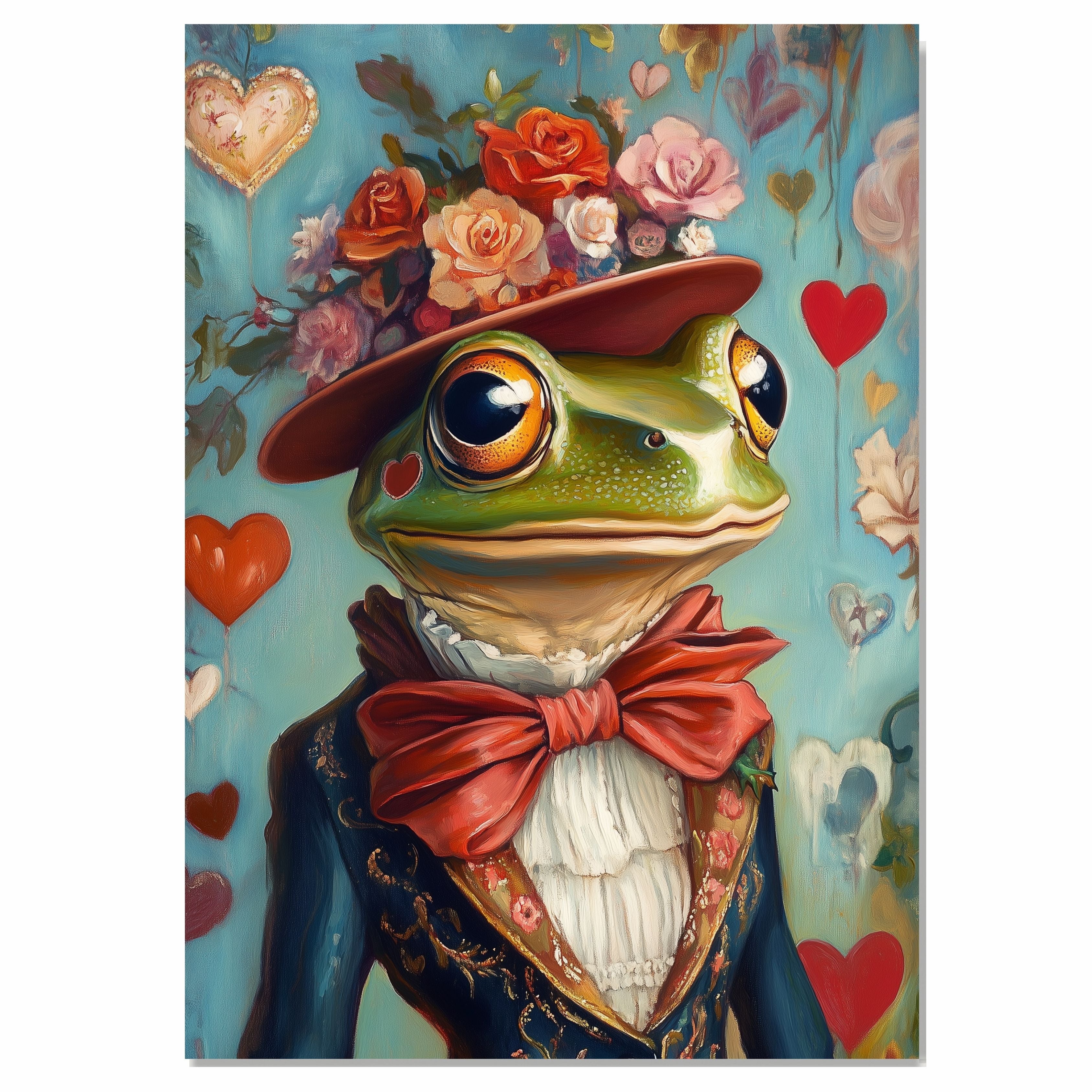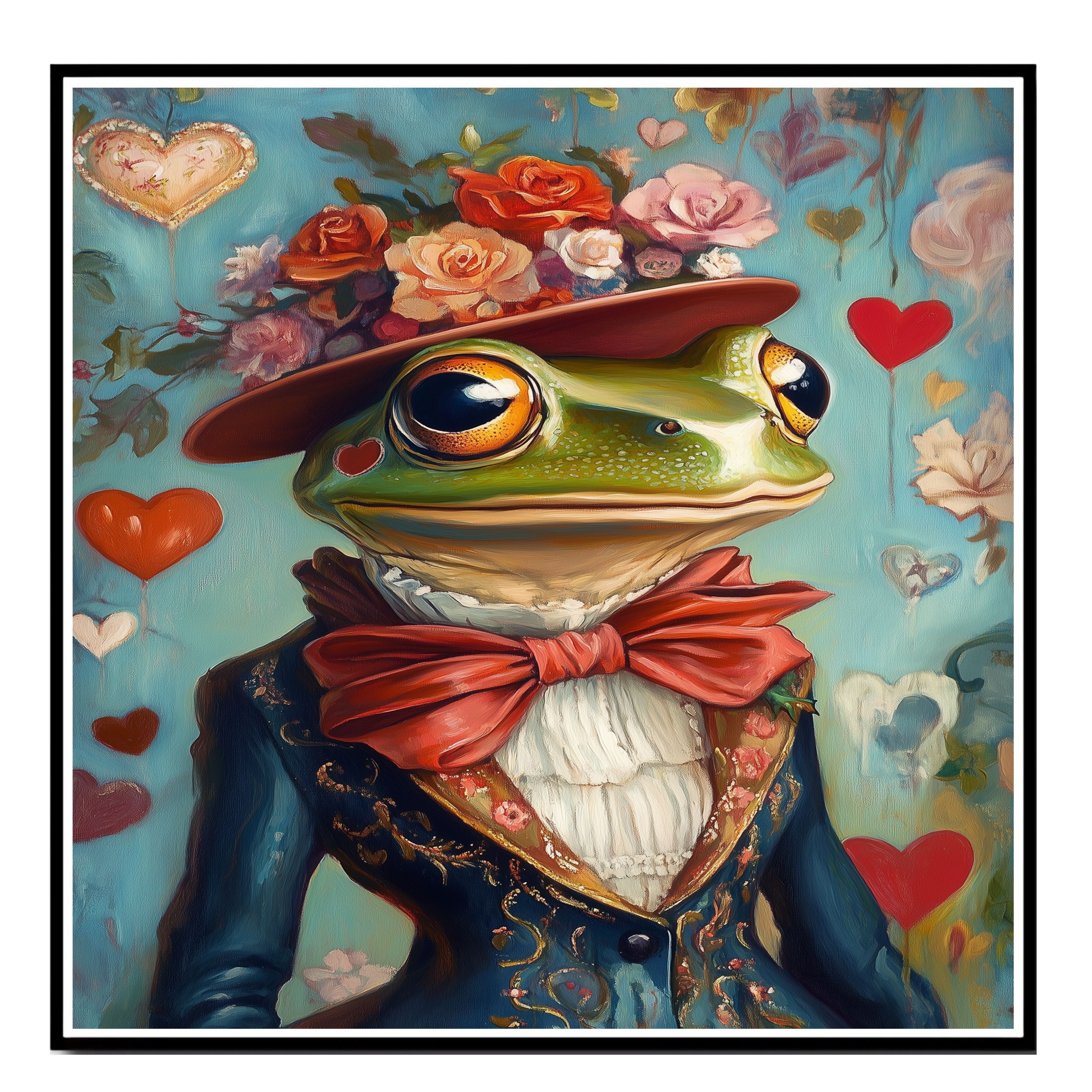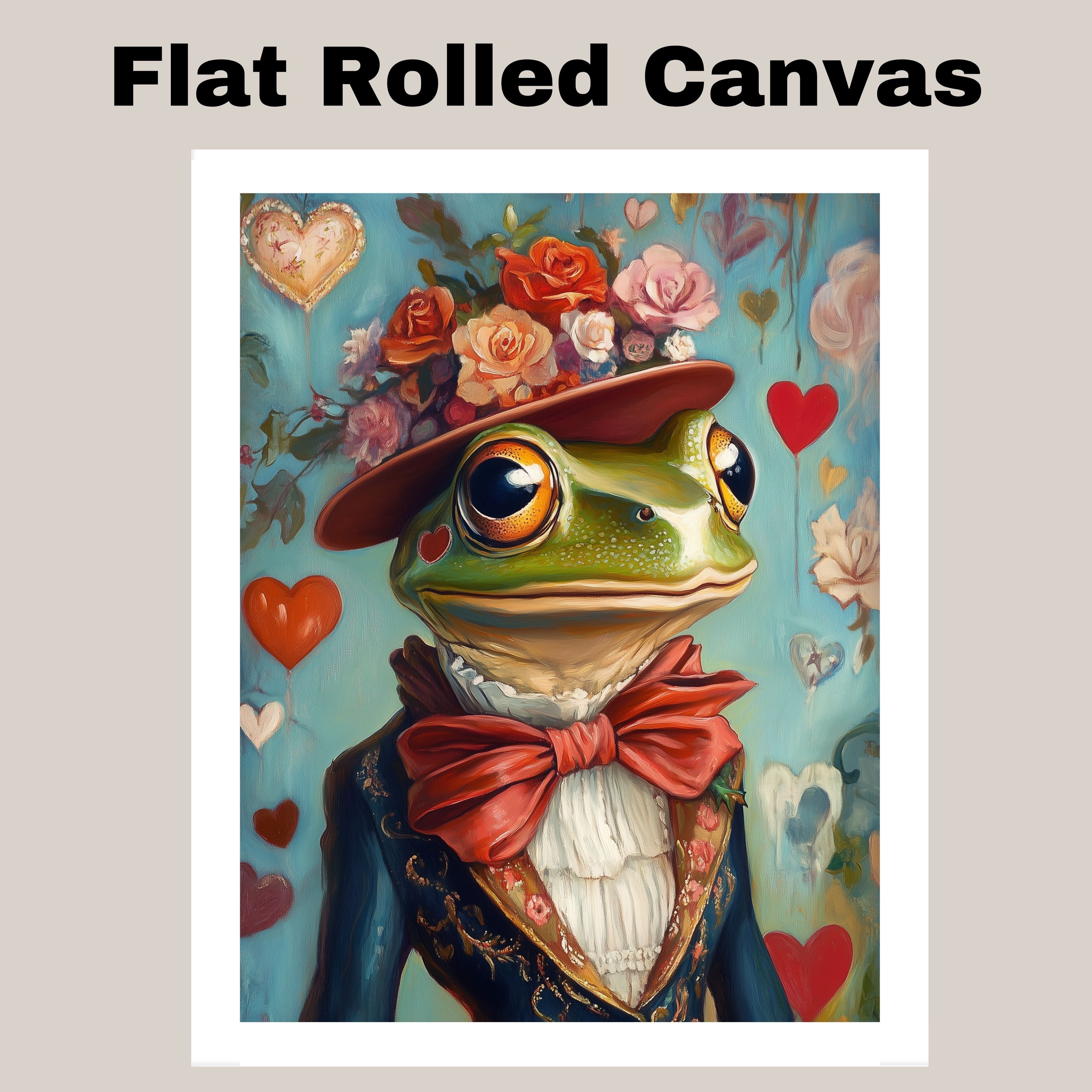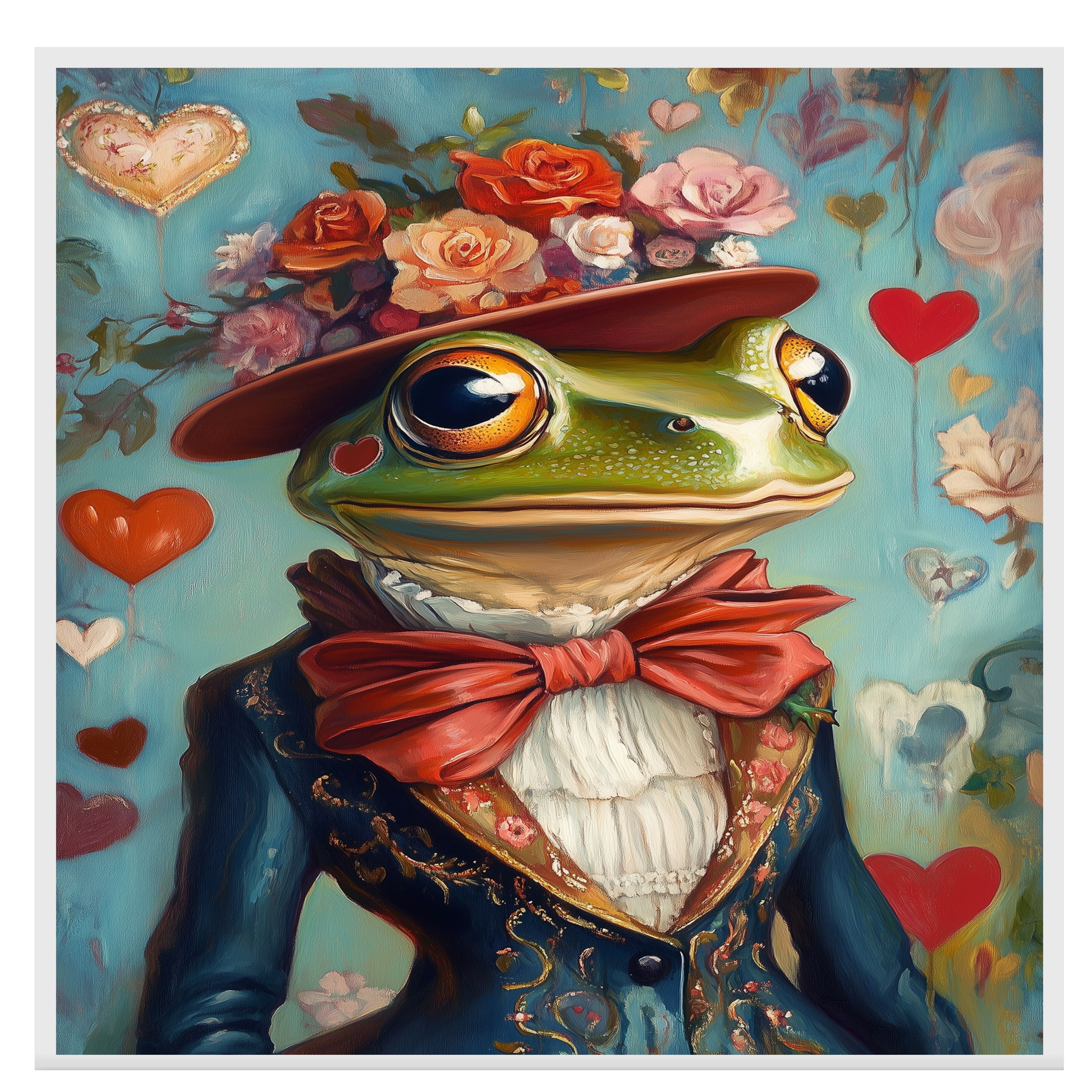 Our "Whimsical Romance" Canvas features a charming green frog dressed in a Victorian-era European suit and hat, exuding a sense of playful elegance and heartfelt romance. This delightful artwork blends whimsy and sophistication, capturing the frog's endearing personality as it dons a timeless ensemble. The soft, vintage-inspired colors and intricate details create a heartwarming scene that adds a touch of magic and nostalgia to any space. Available on a 1.5" thick canvas wrap, floating framed canvas, or flat rolled canvas, this enchanting piece is perfect for frog lovers and those who appreciate unique, romantic art.