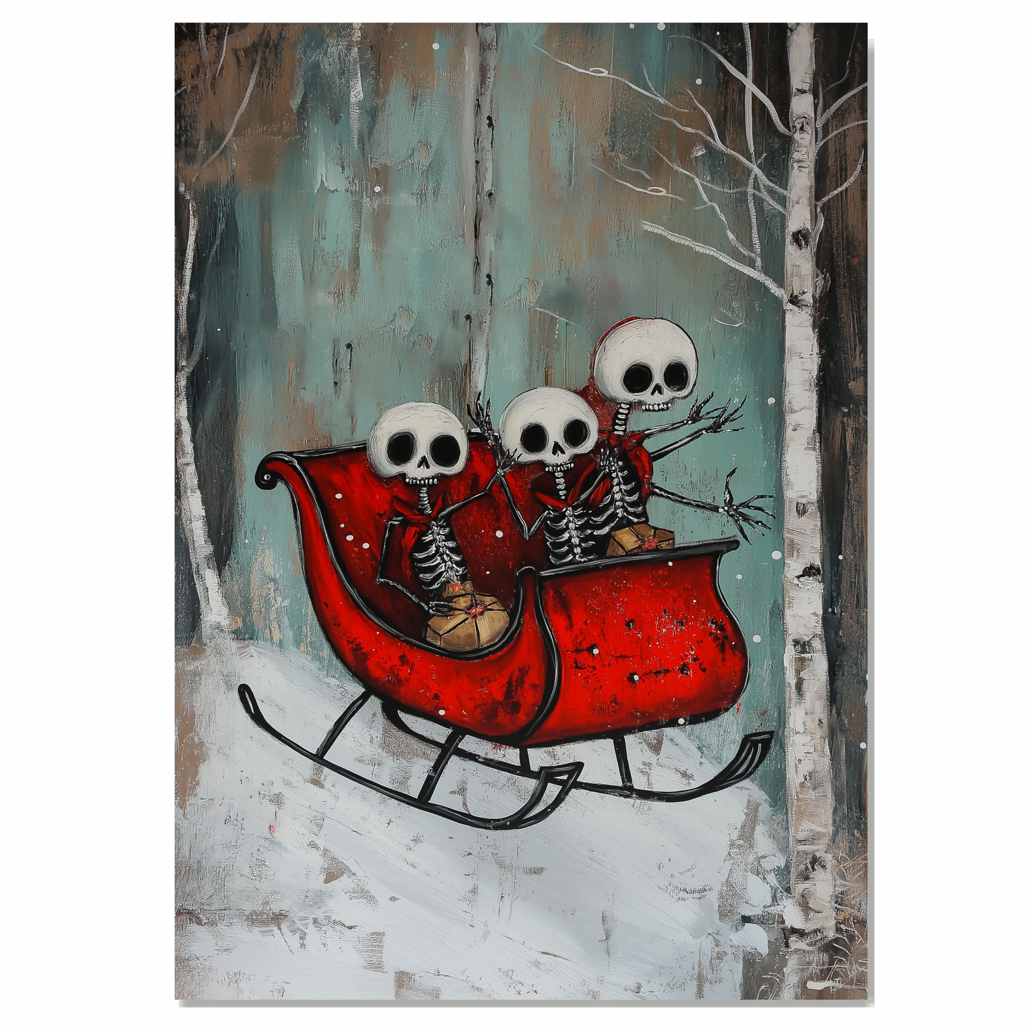 Whimsical Skeleton Sleigh Ride Christmas Print – Gothic Holiday Wall Art with Skeleton Friends in Red Sleigh, Spooky Winter Decor, Quirky Festive Illustration on Ready to Hang 1.5" Thick Canvas Wrap, Floating Framed Canvas, Flat Rolled Canvas