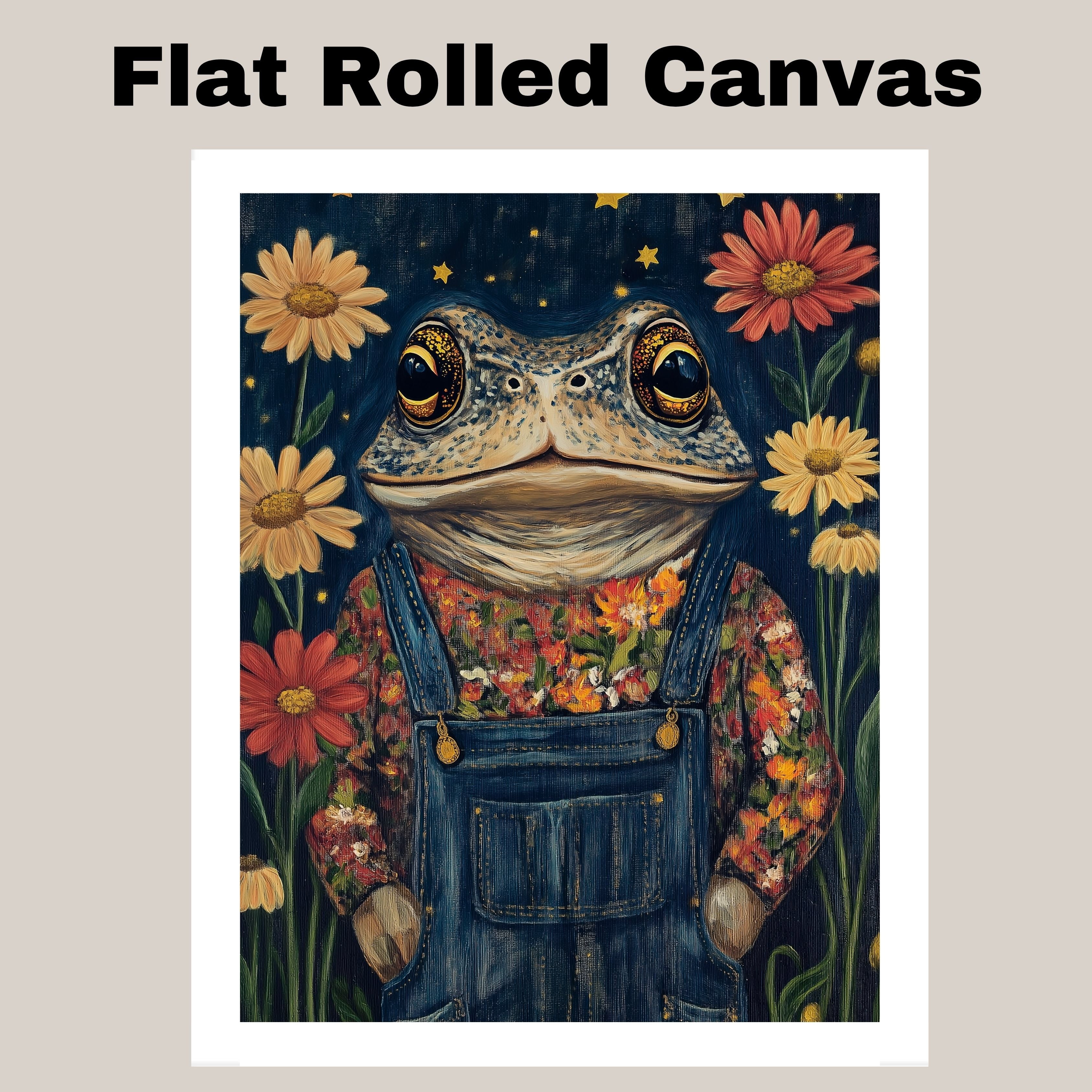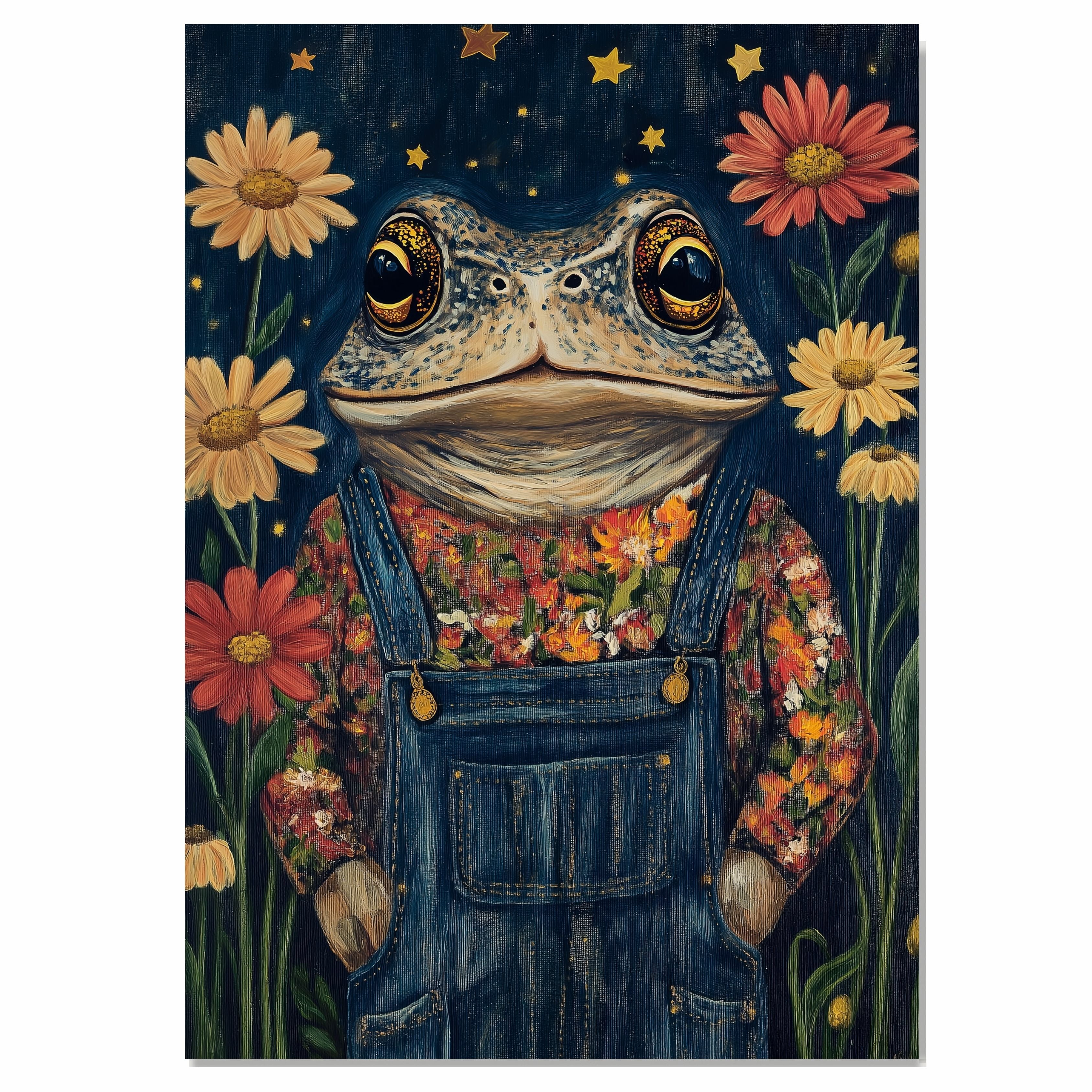 Whimsical Toad Art Print Frog in Floral Shirt Overalls Cute Animal Painting for Nursery Kids Room Nature Inspired Decor Night Sky Theme Frog Artwork on Ready to Hang 1.5" Thick Canvas Wrap, Floating Framed Canvas, Flat Rolled Canvas