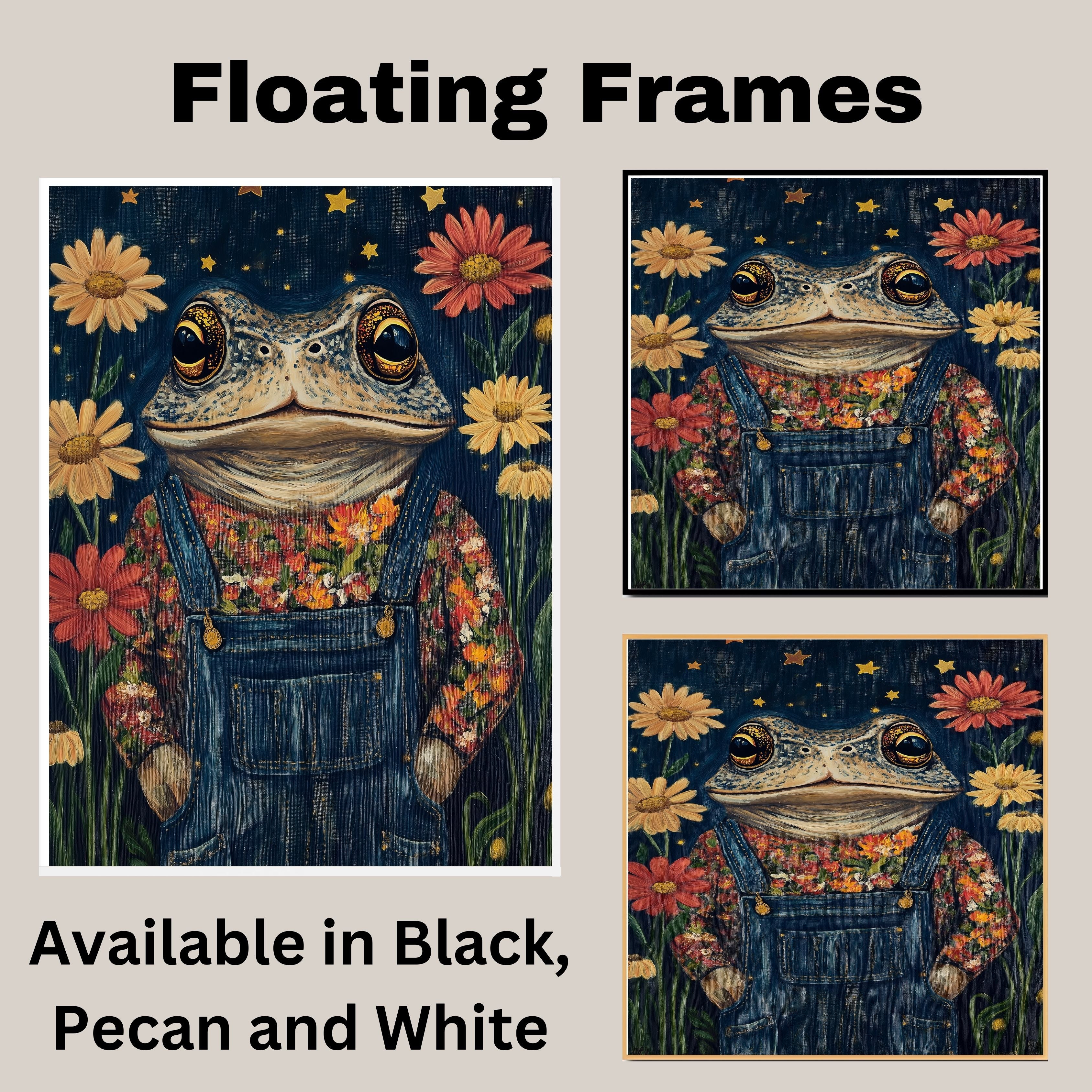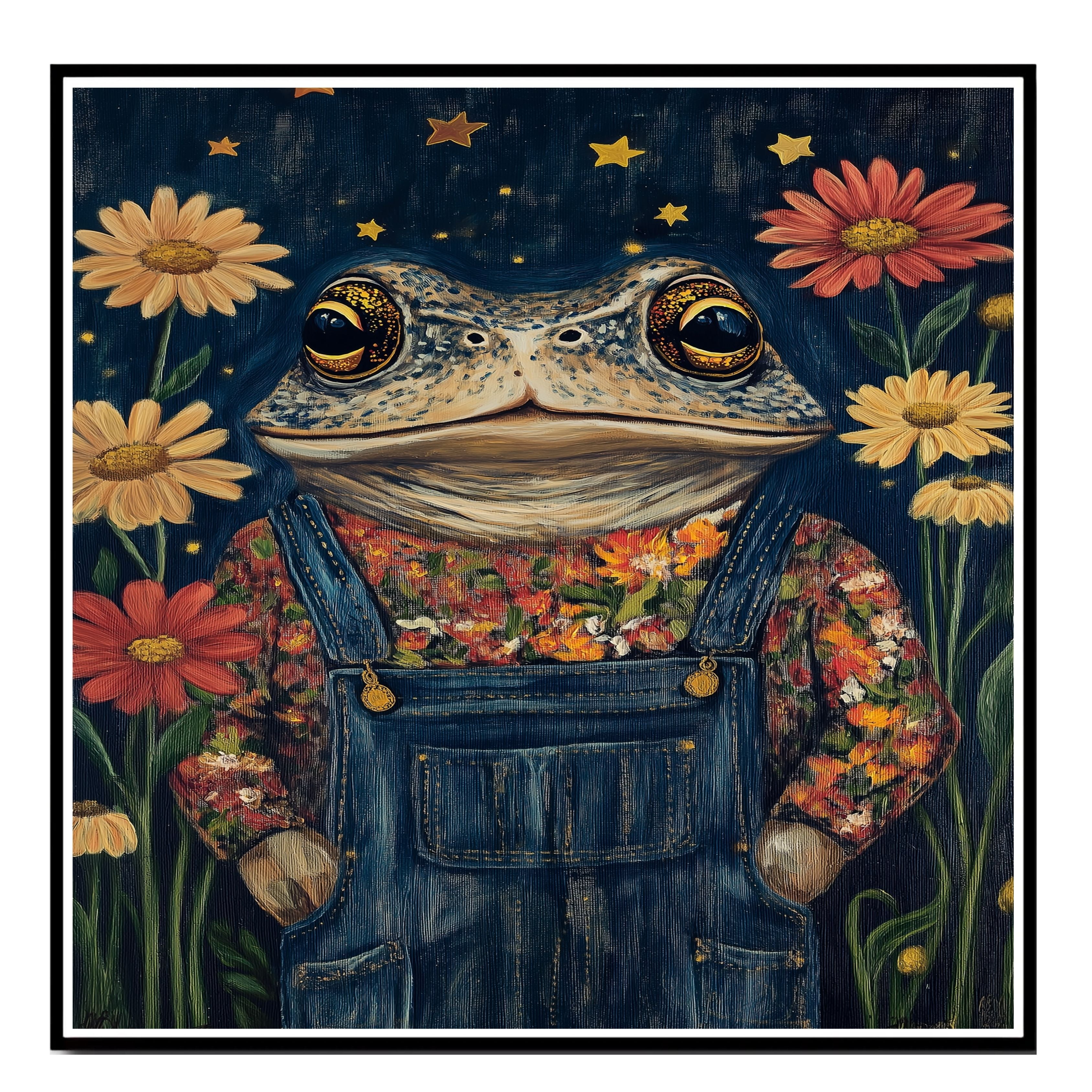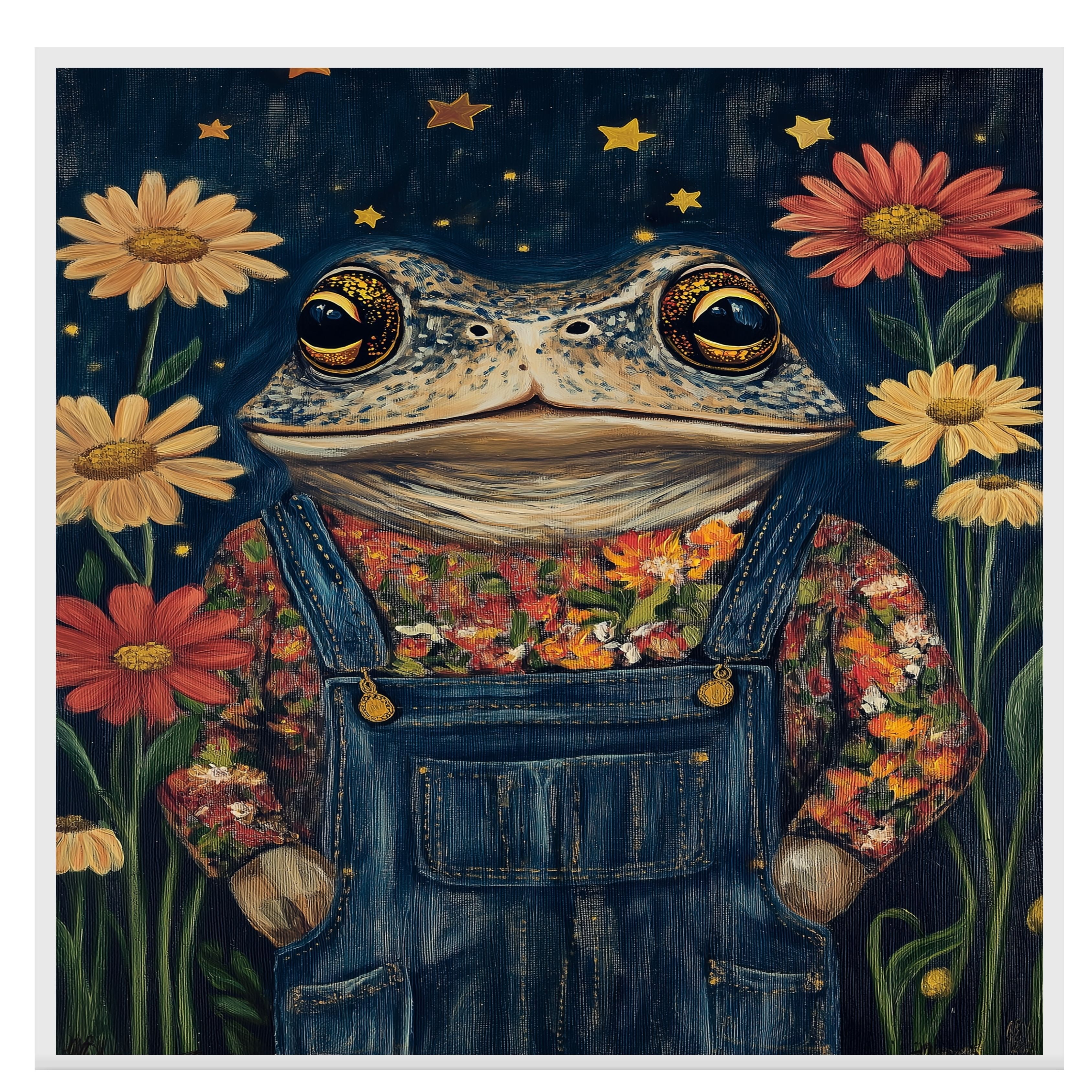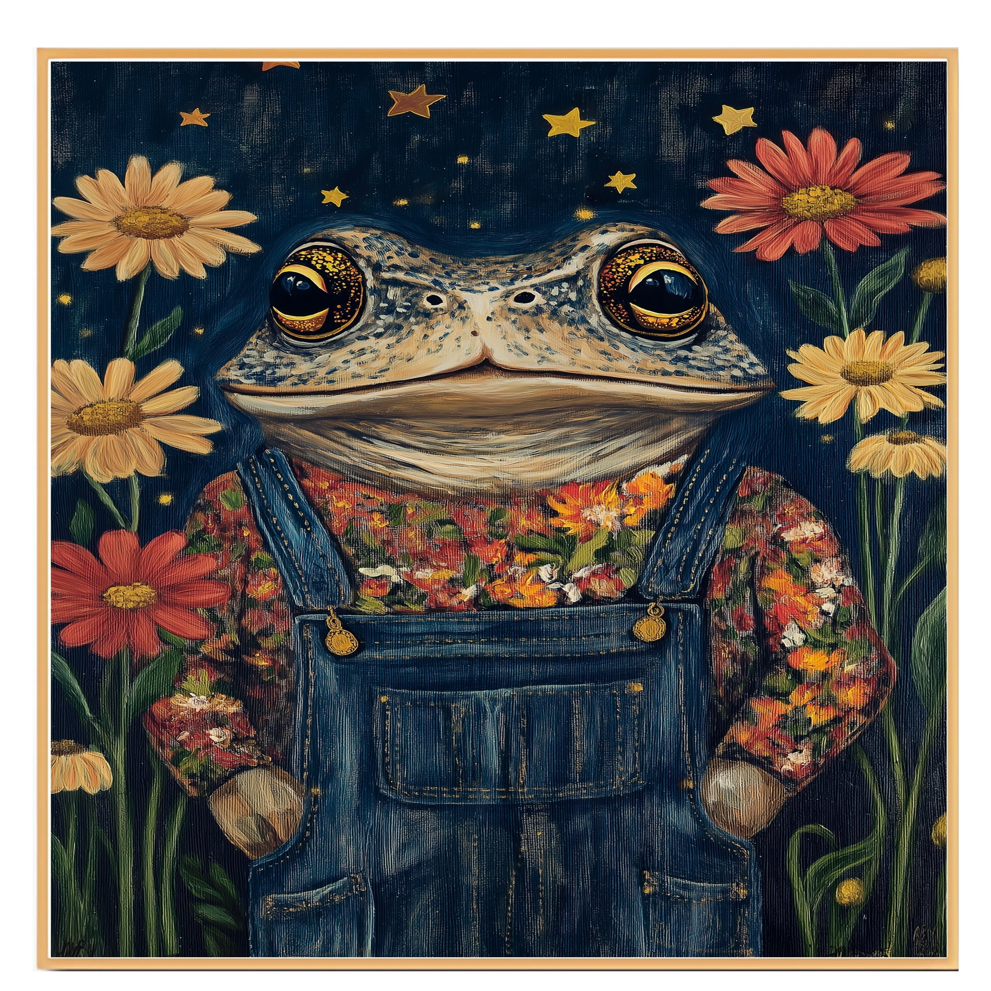 Bring a charming whimsical touch to your space with this adorable toad art print featuring a frog in floral overalls under a starry night sky perfect for nurseries or playful decor.