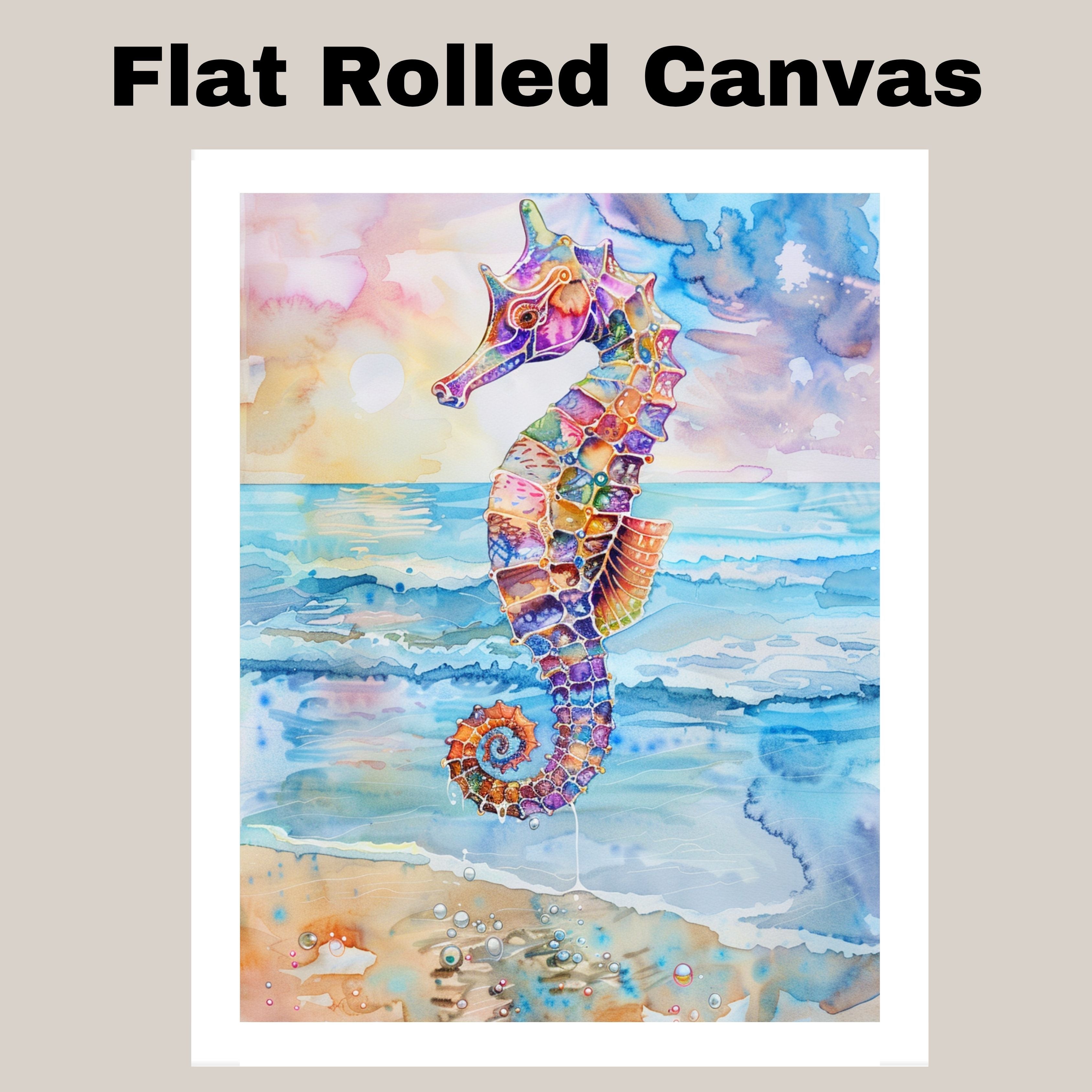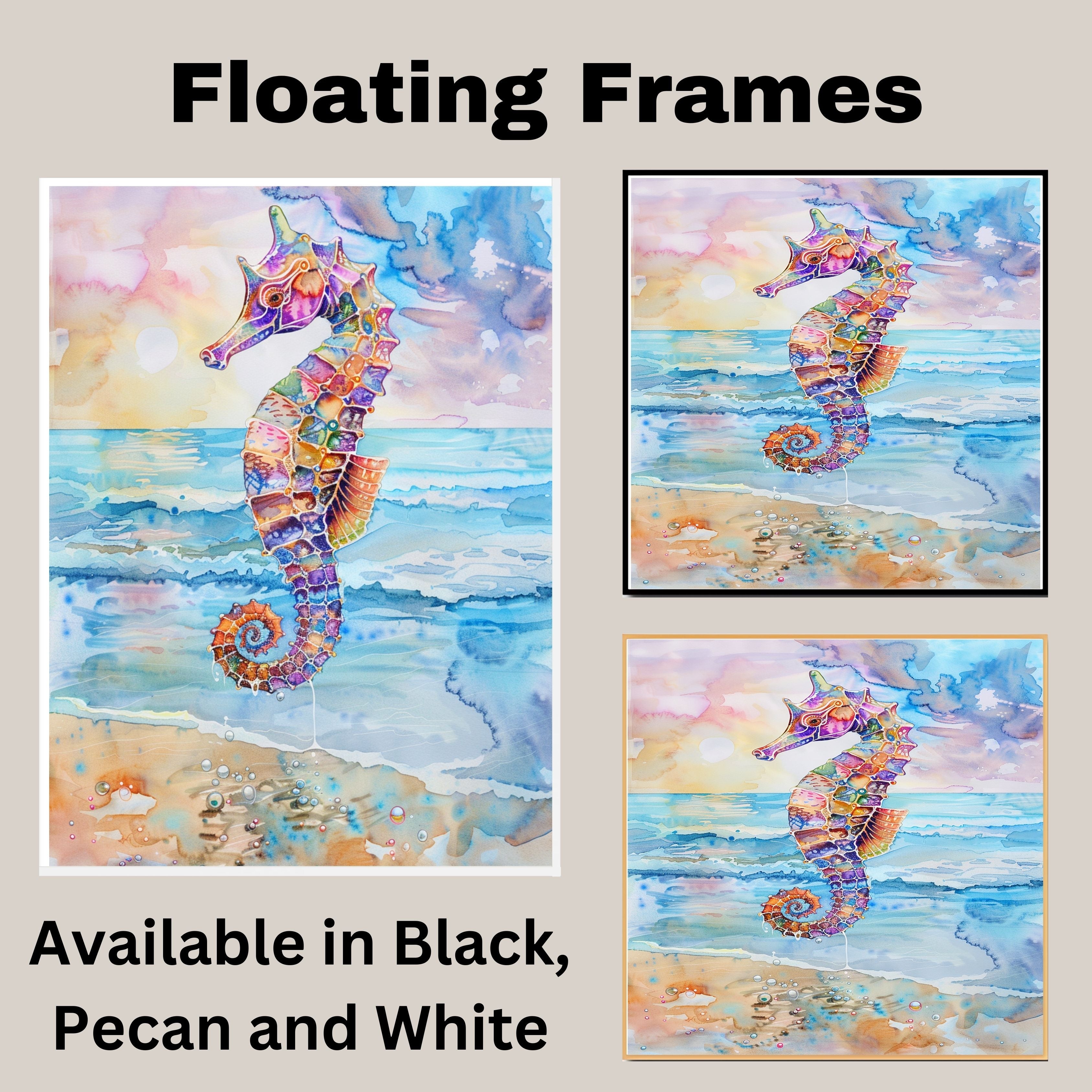 Whimsical Watercolor Painting of a Jewel-Toned Seahorse with Ocean Waves and Sunset Sky on Ready to Hang 1.5" Thick Canvas Wrap, Floating Framed Canvas, Flat Rolled Canvas