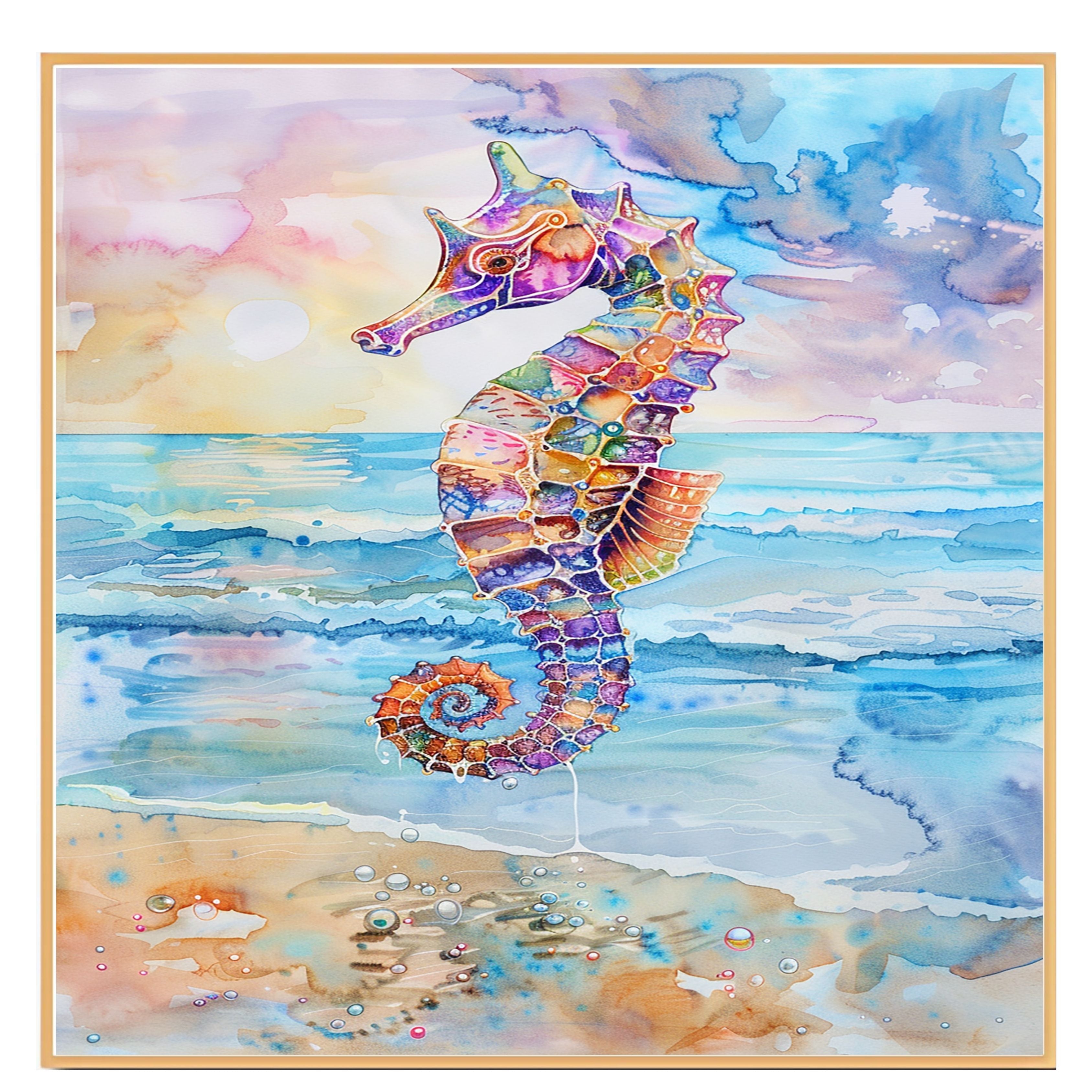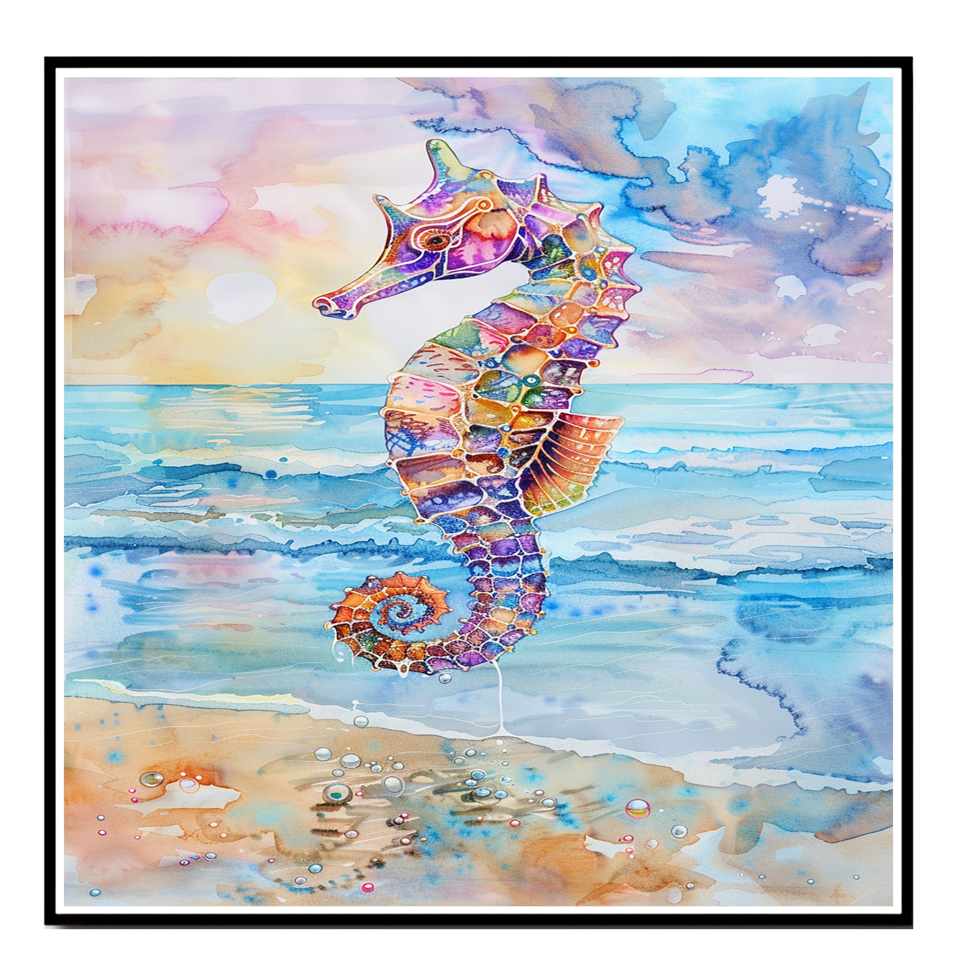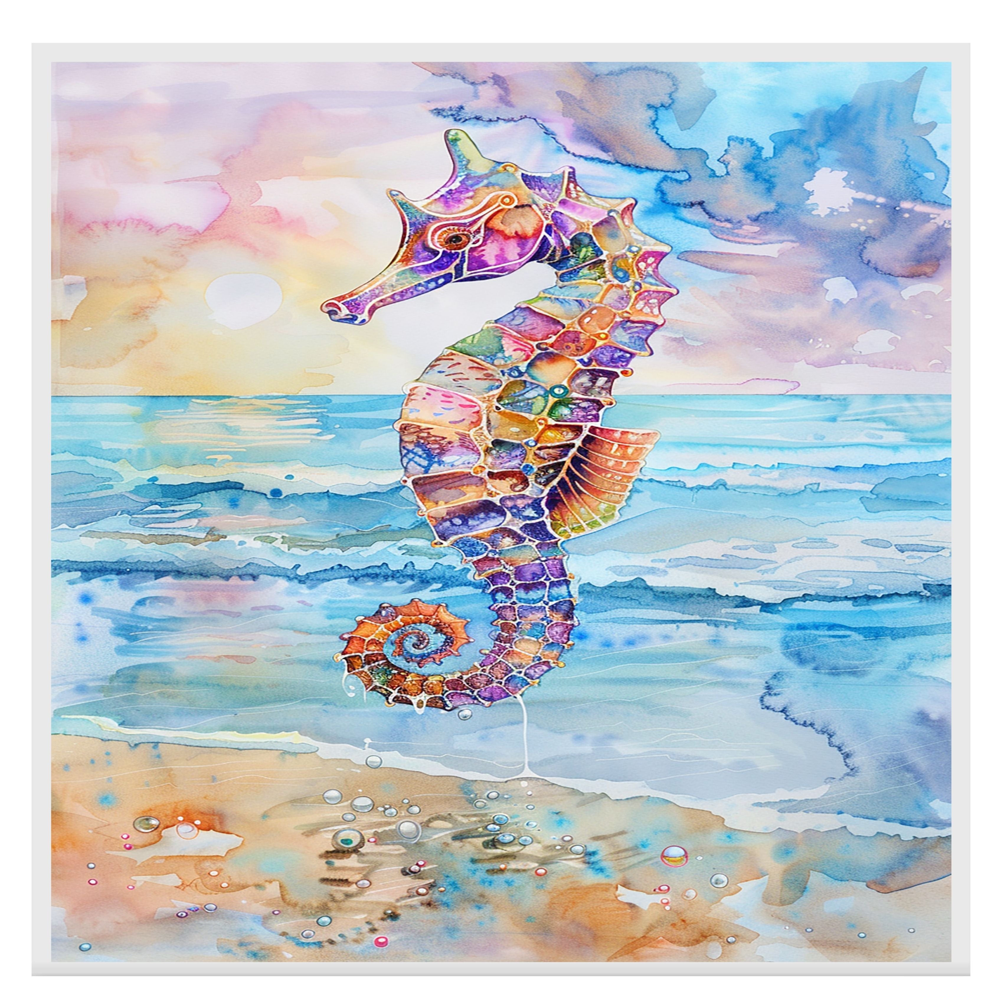 Delight in this enchanting watercolor painting of a jewel-toned seahorse glimmering at the ocean’s edge. Bursting with intricate patterns and gem-like hues, this piece captures the serenity of a beach at sunset. A captivating tribute to sea life and whimsical marine beauty.