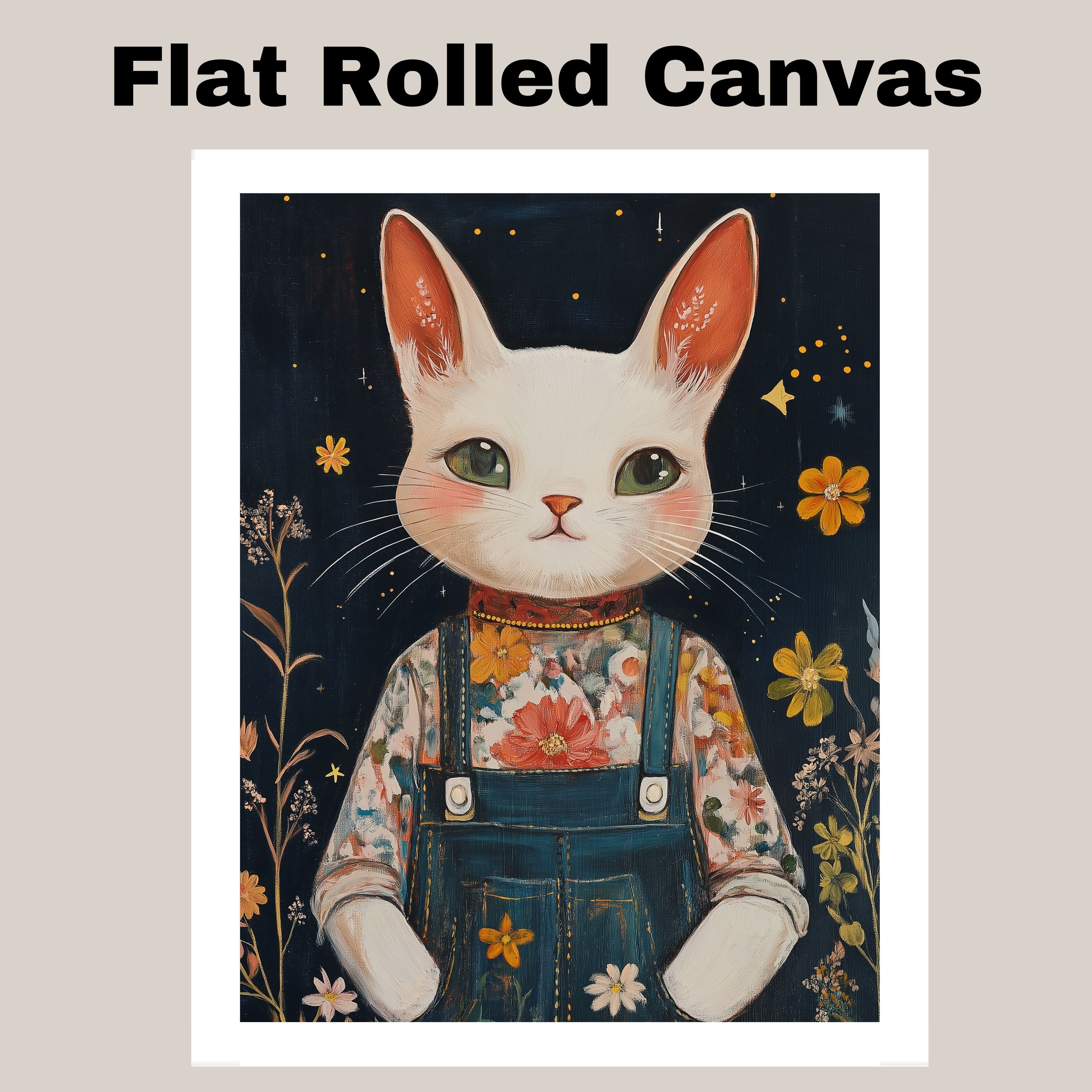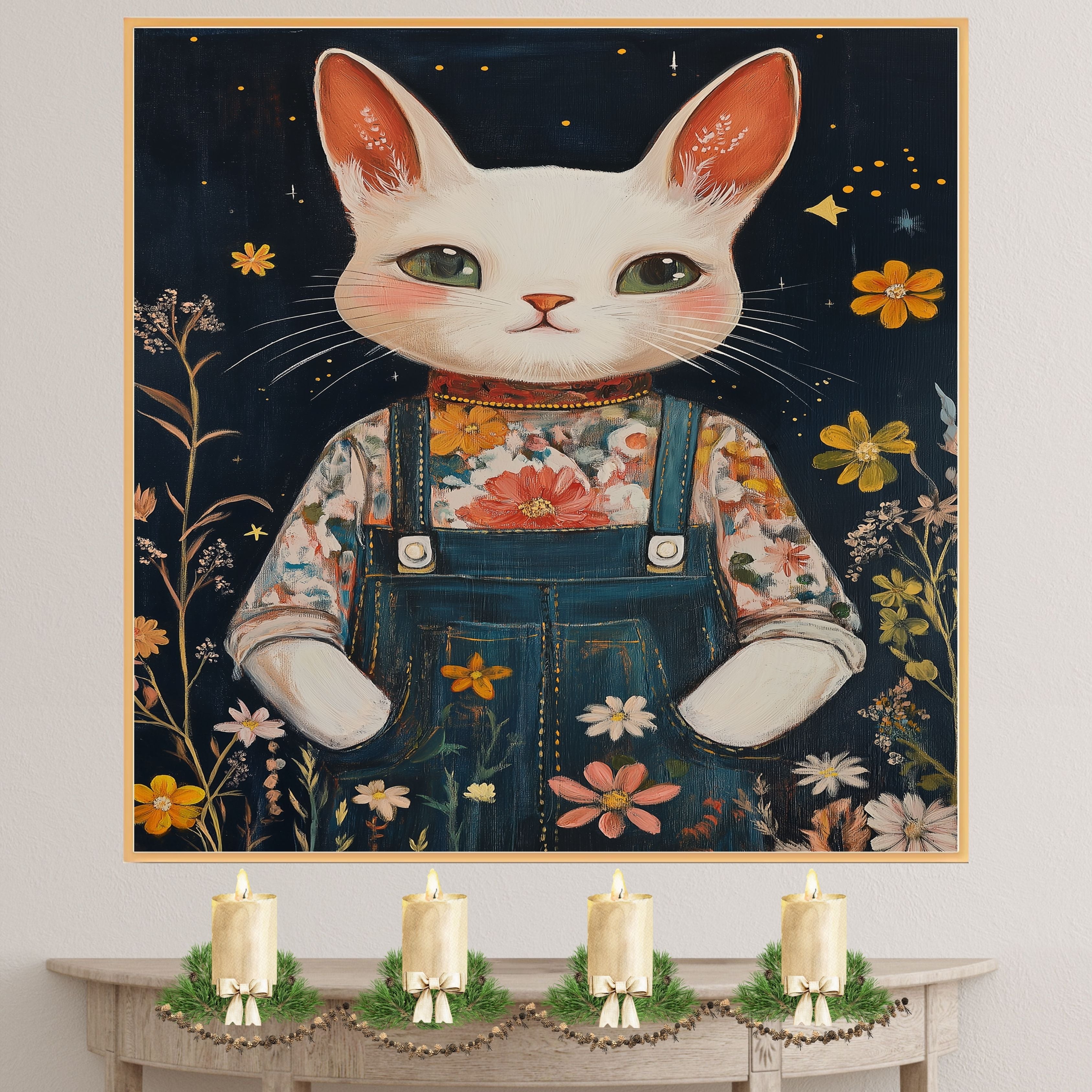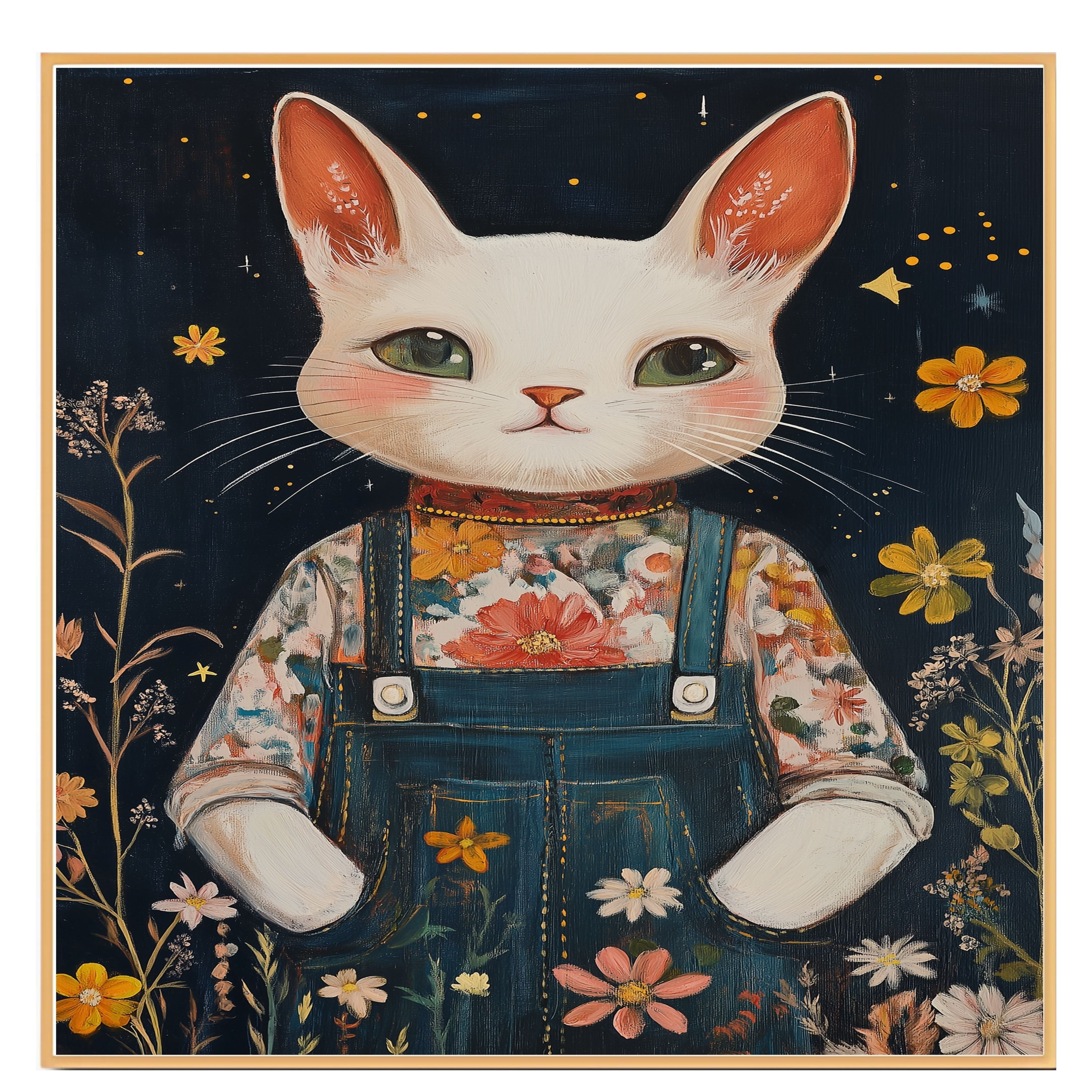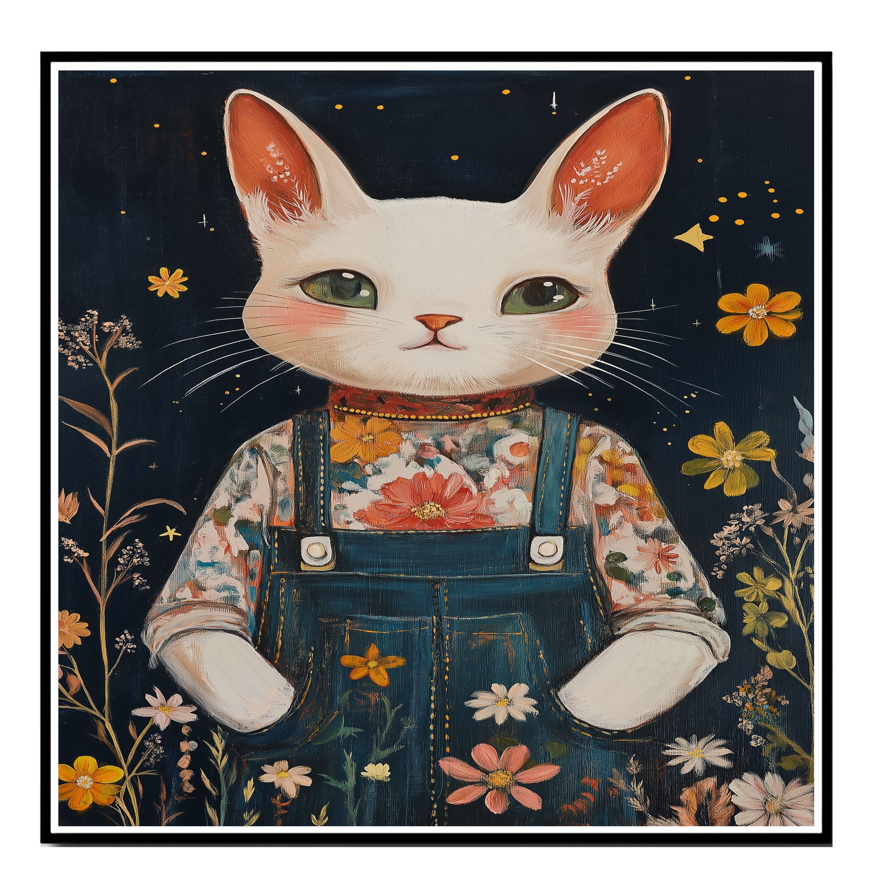 Add charm and color to your space with this hand painted artwork featuring a whimsical white cat in floral overalls set against a dreamy starry night sky A perfect addition to nursery kids room or a thoughtful gift for cat lovers and families.