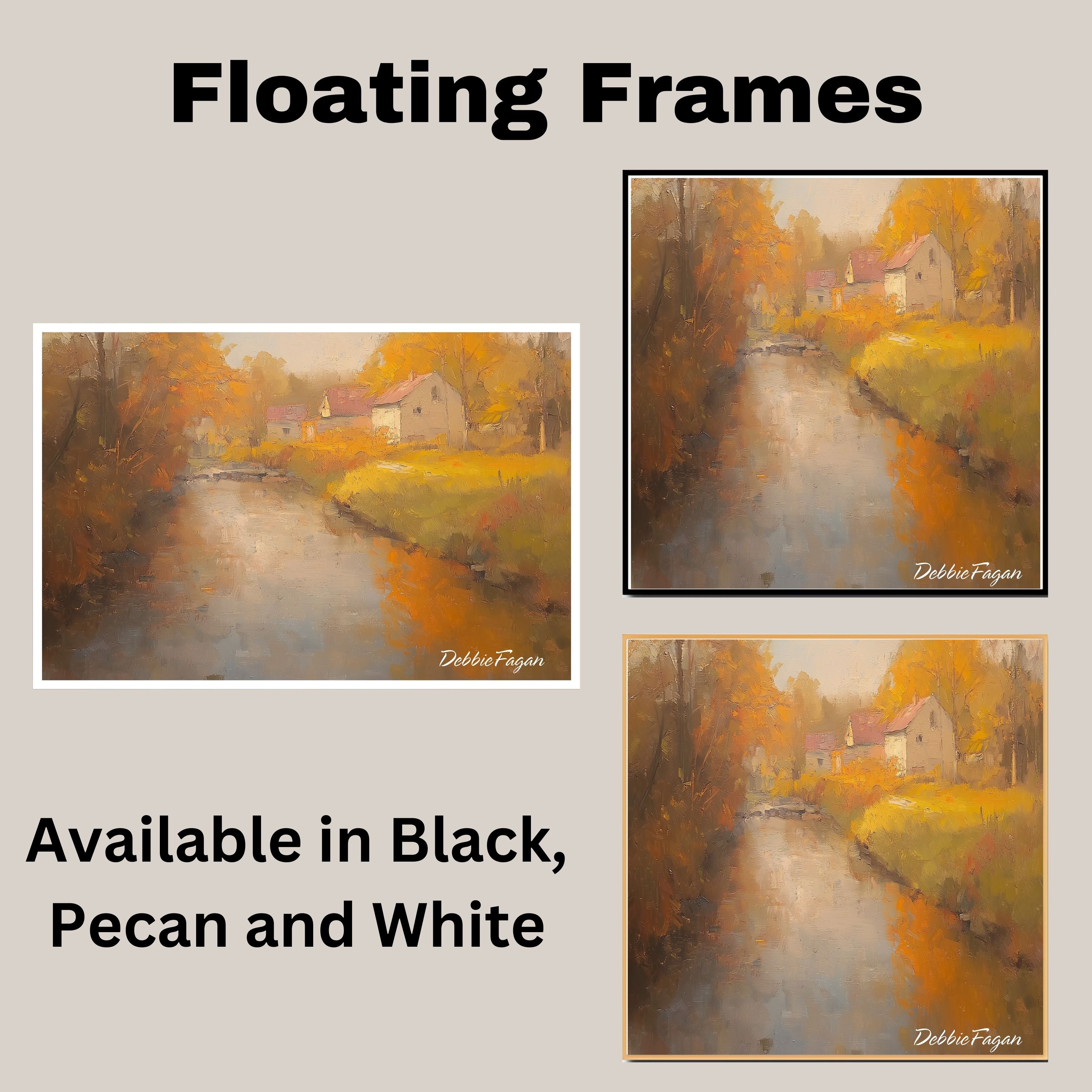 1.5" Thick Floating Framed Canvas: Available in Black, Pecan, and White Grain. Durable shrink-resistant frame. Comes with easy-to-install hanging kits, ready for immediate display.
