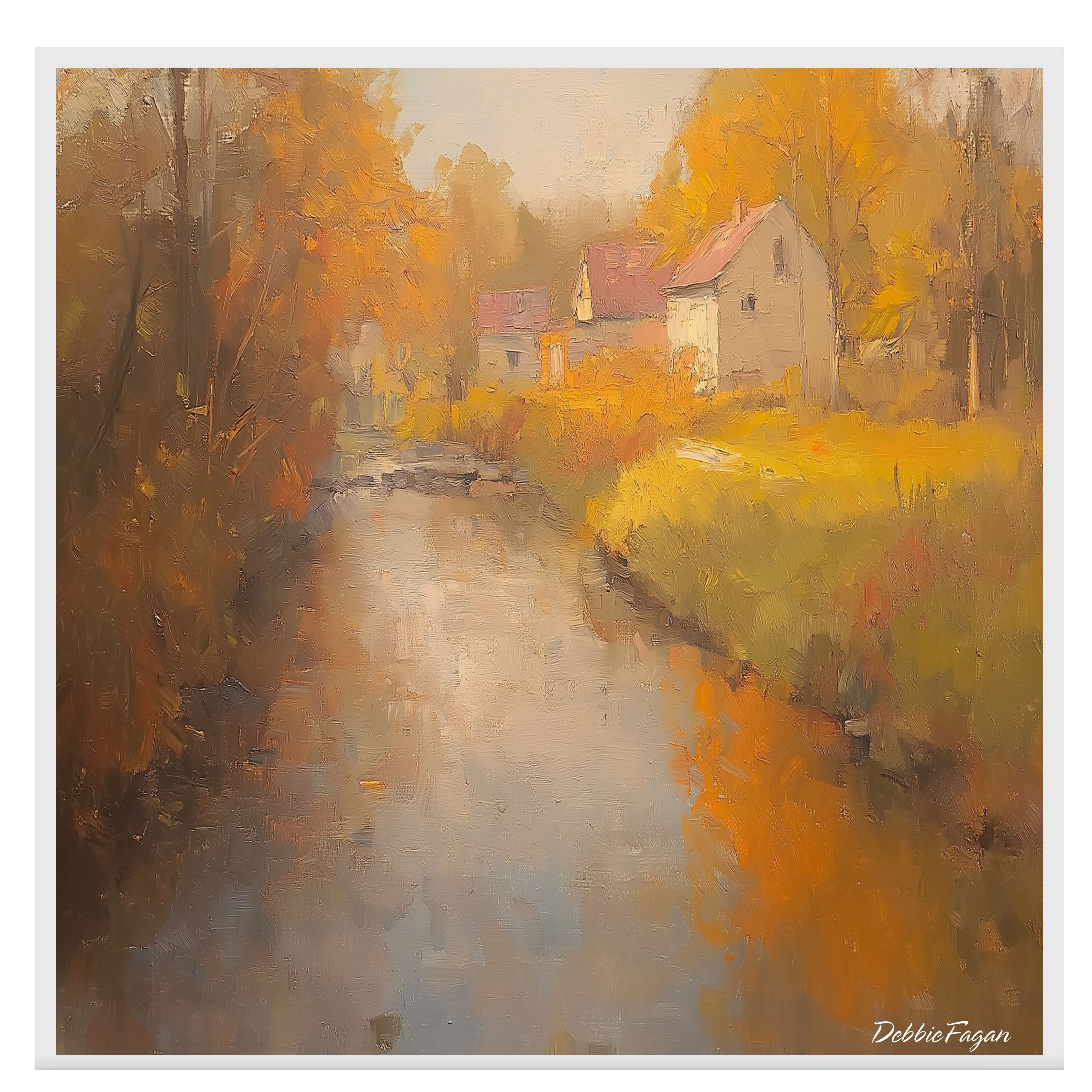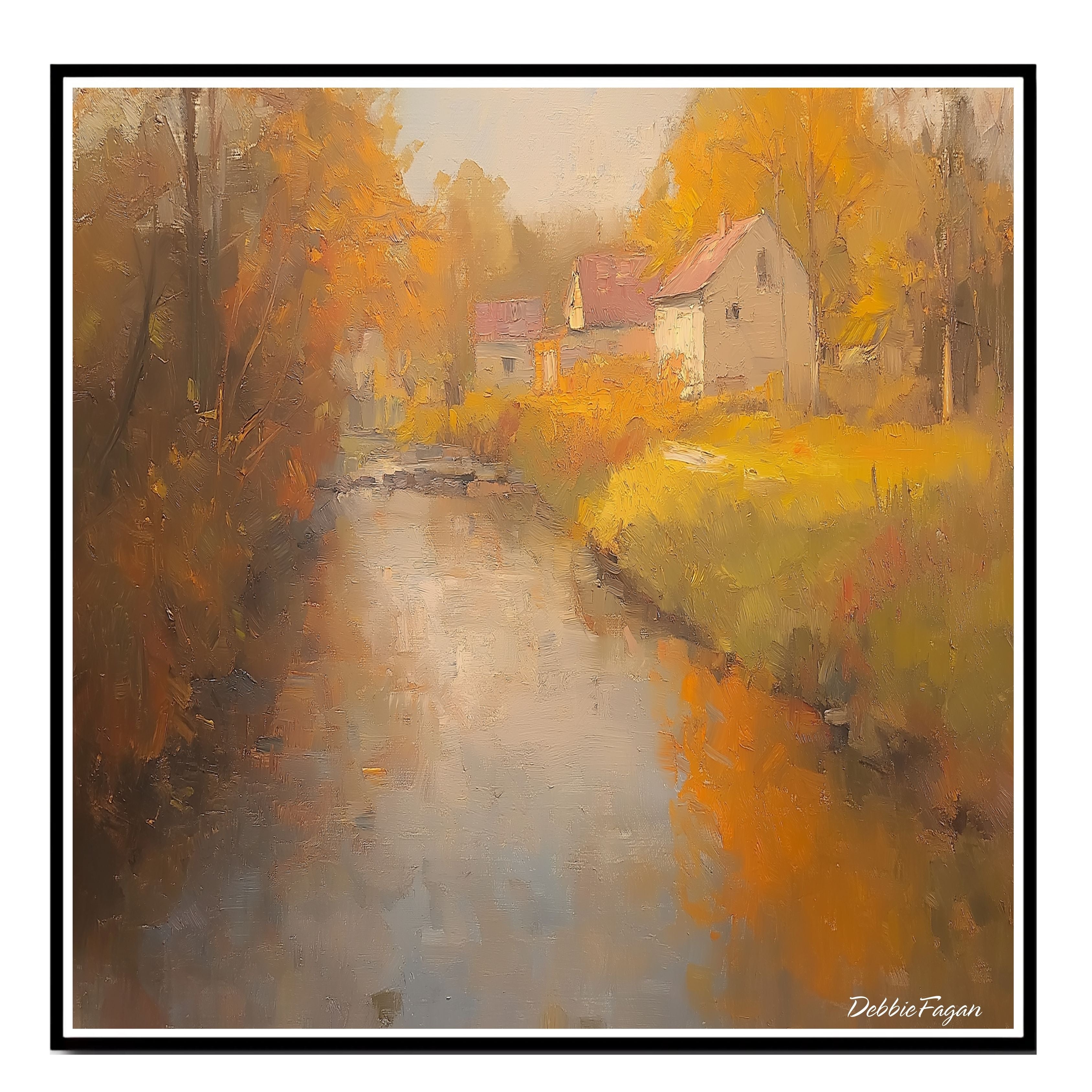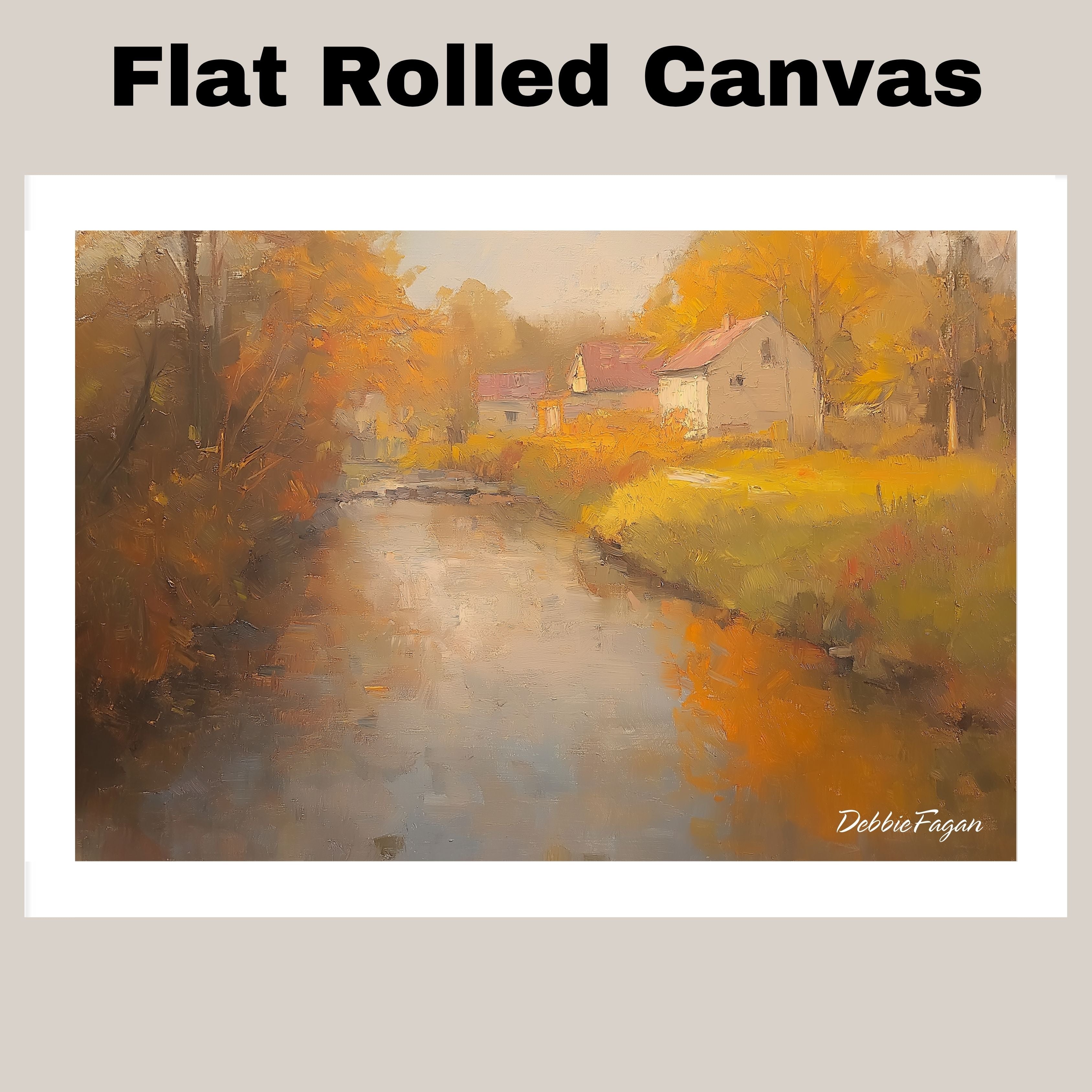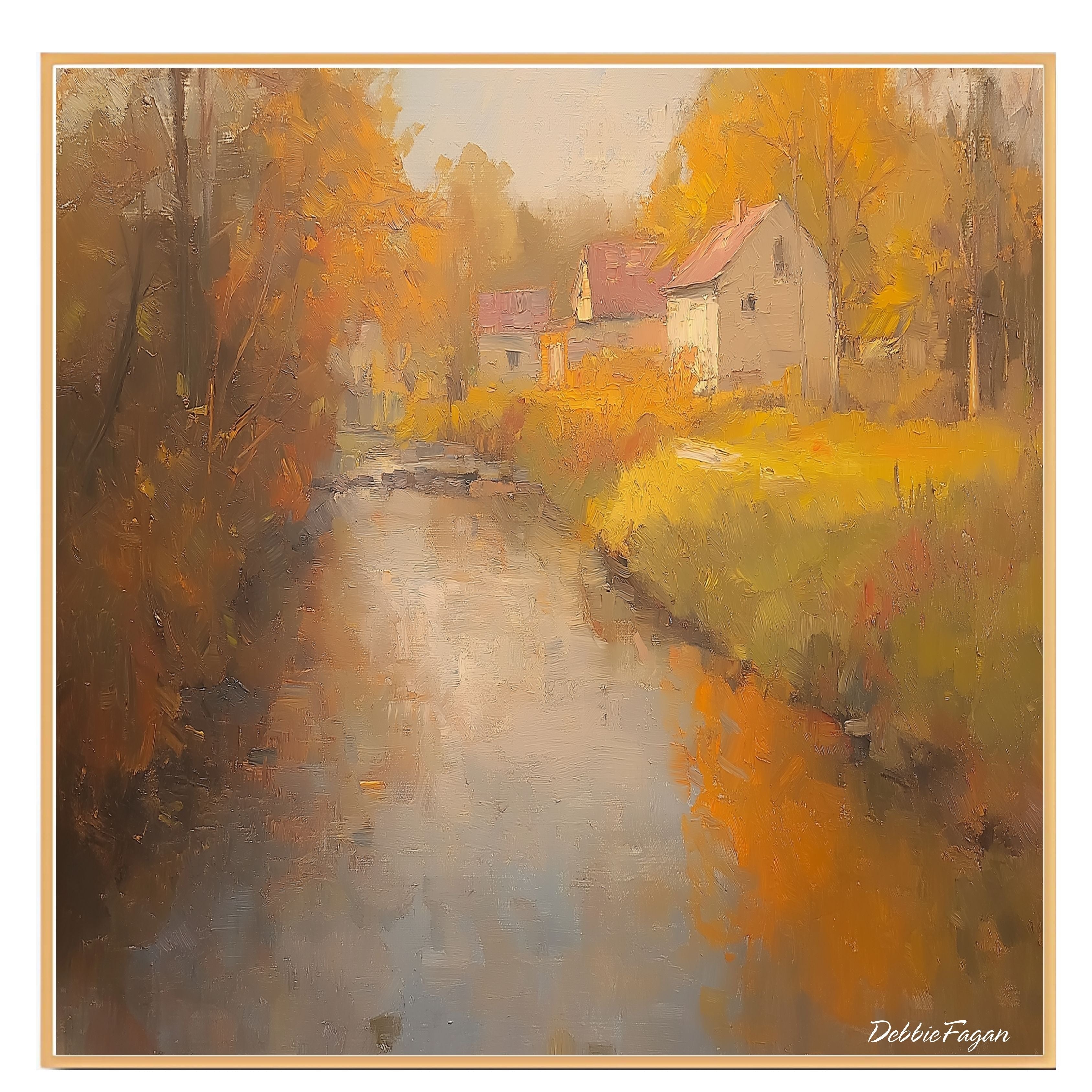 A peaceful autumn scene featuring a winding country road, flowing stream, and cozy cottages surrounded by fall foliage. This oil painting-style print brings warmth and rustic charm to any home.