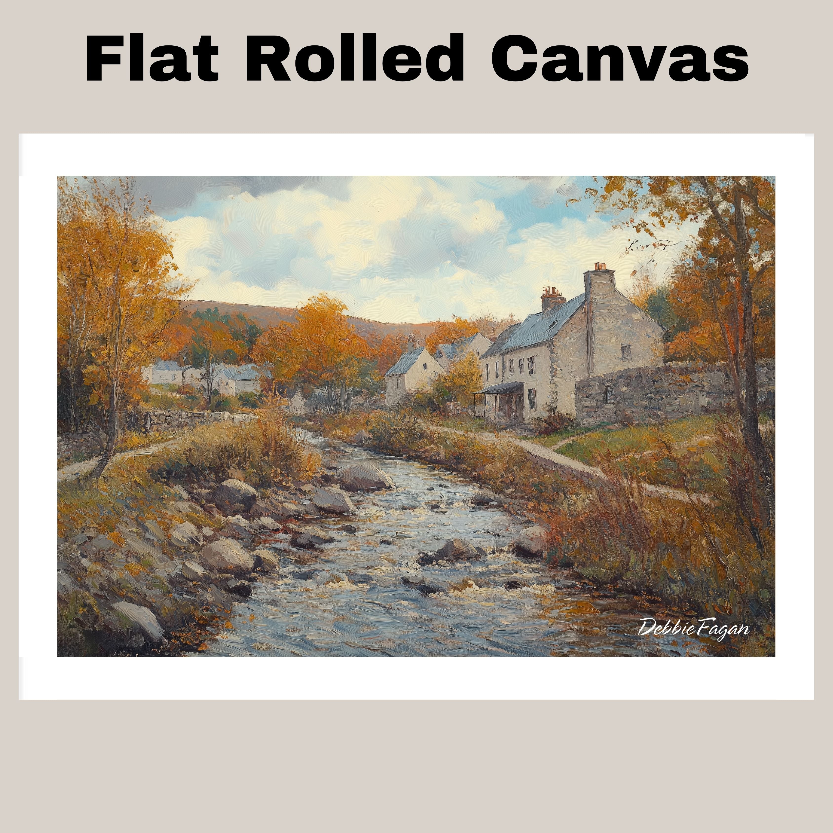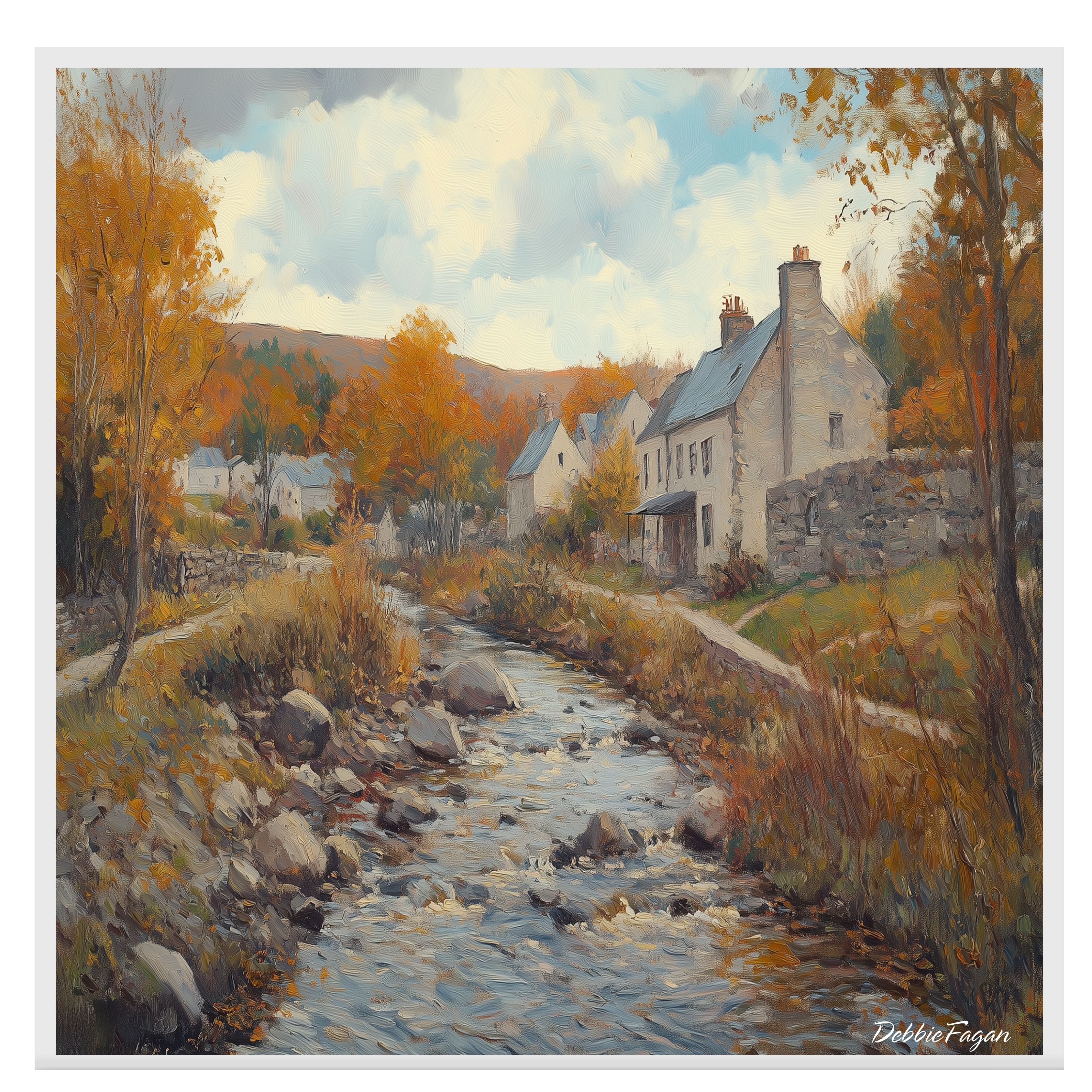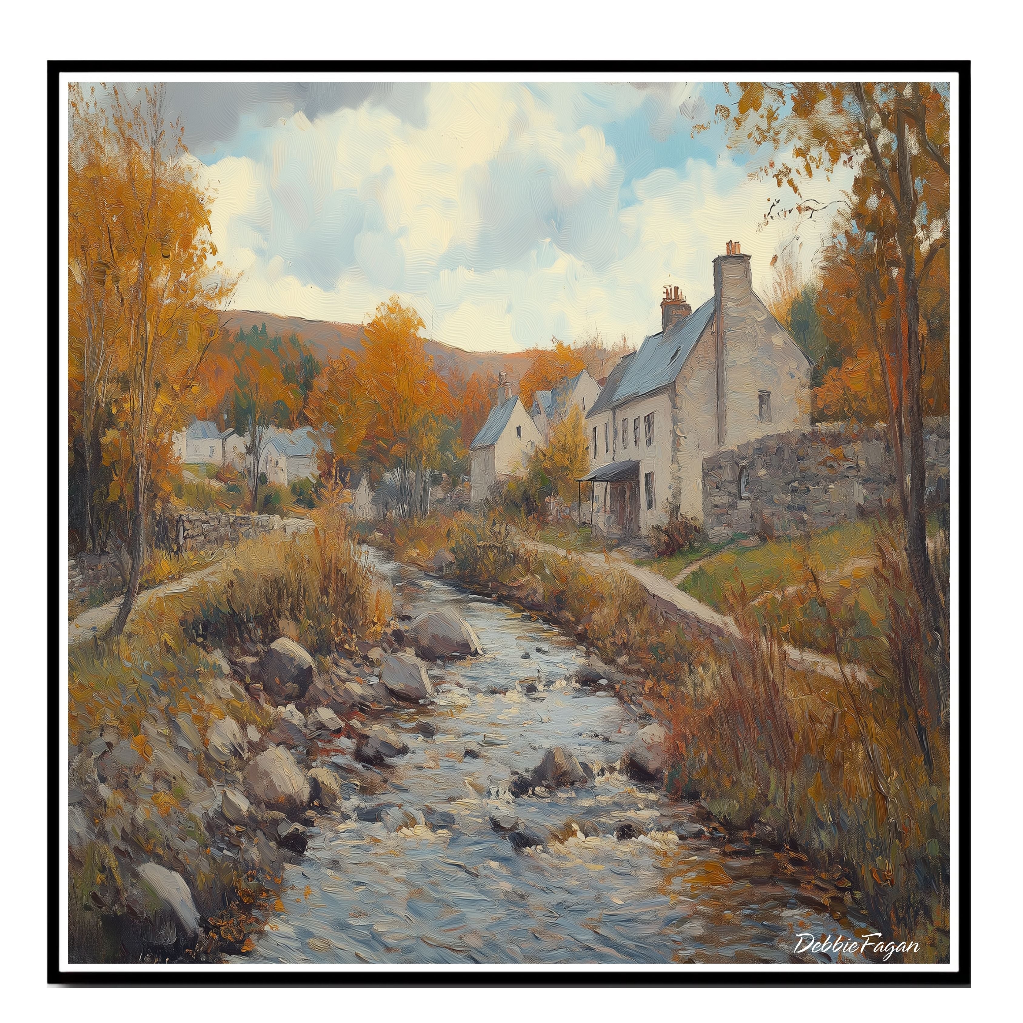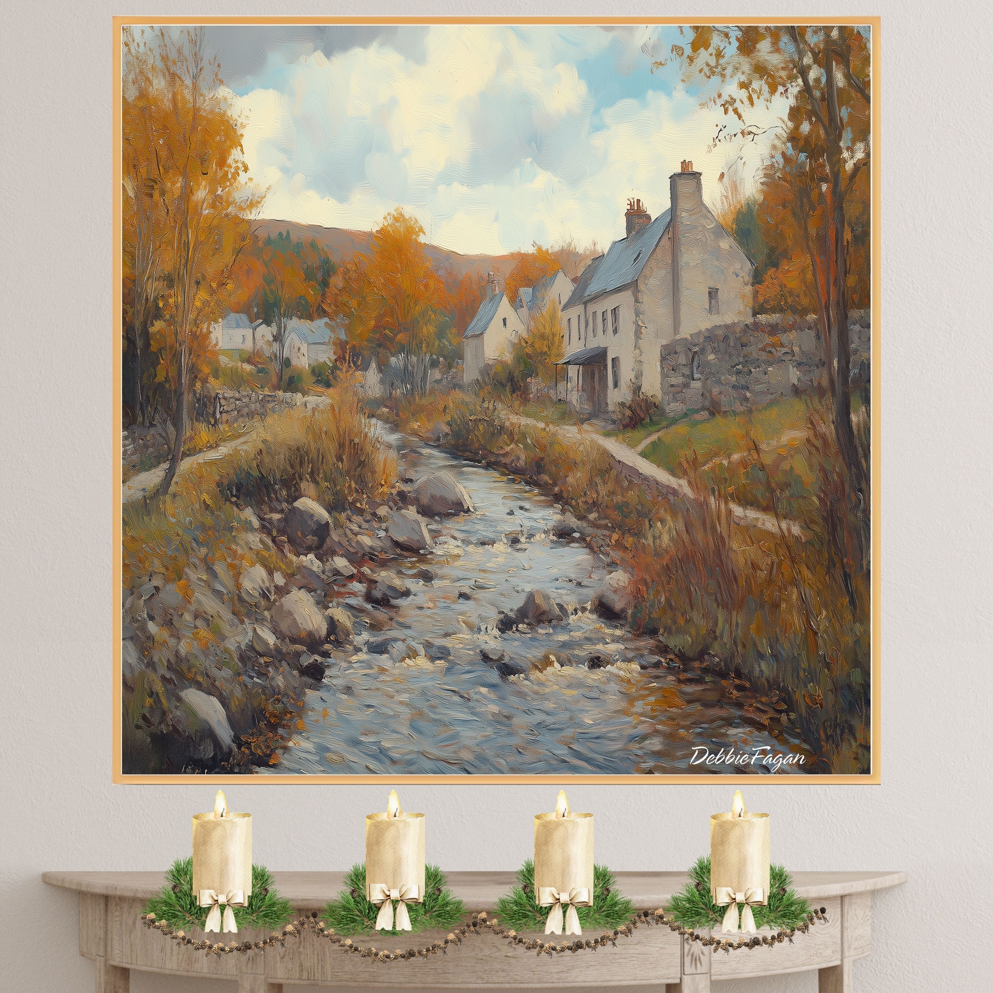 A peaceful autumn scene featuring a winding country road, flowing stream, and cozy cottages surrounded by fall foliage. This oil painting-style print brings warmth and rustic charm to any home.