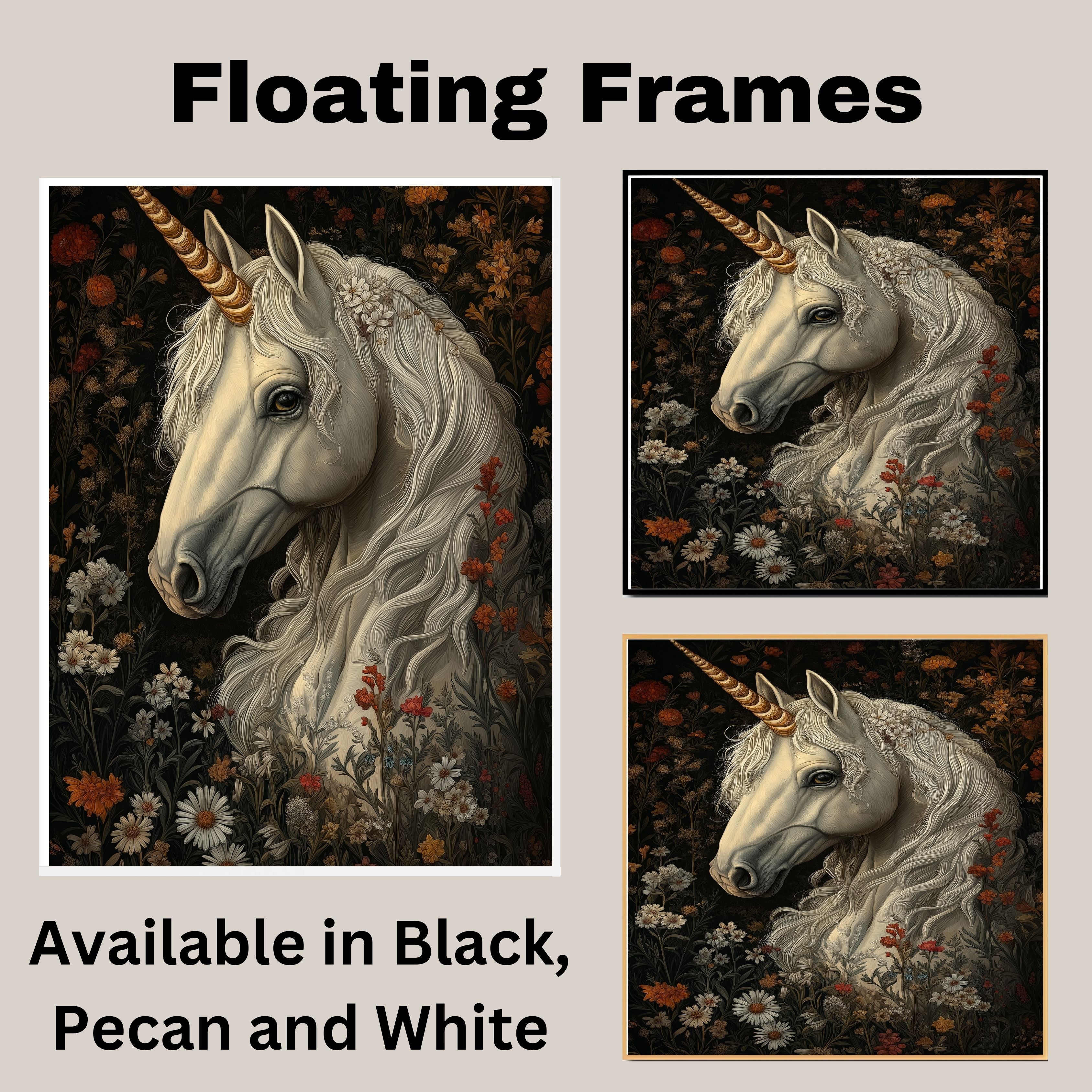 1.5" Thick Floating Framed Canvas: Available in Black, Pecan, and White Grain. Durable shrink-resistant frame. Comes with easy-to-install hanging kits, ready for immediate display.