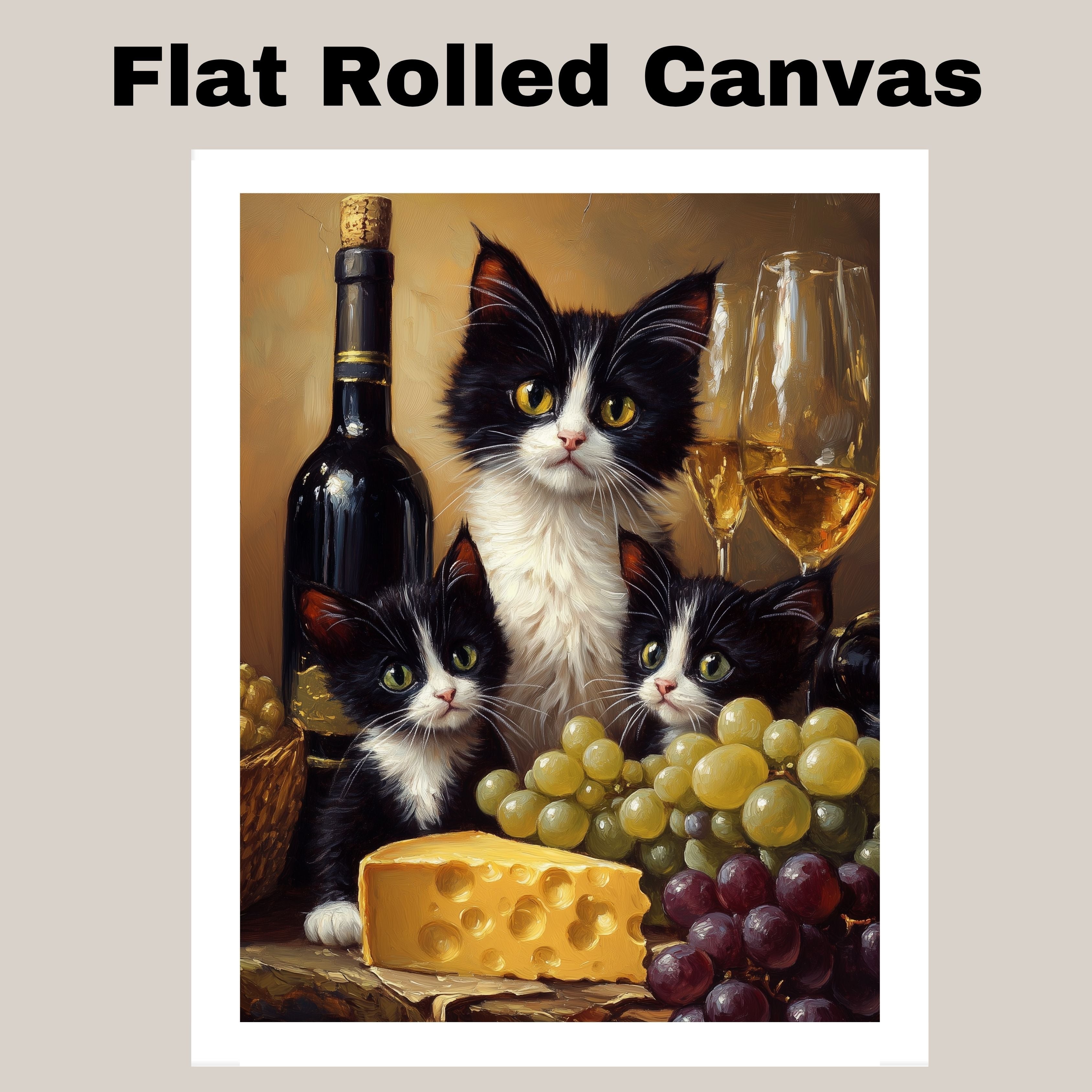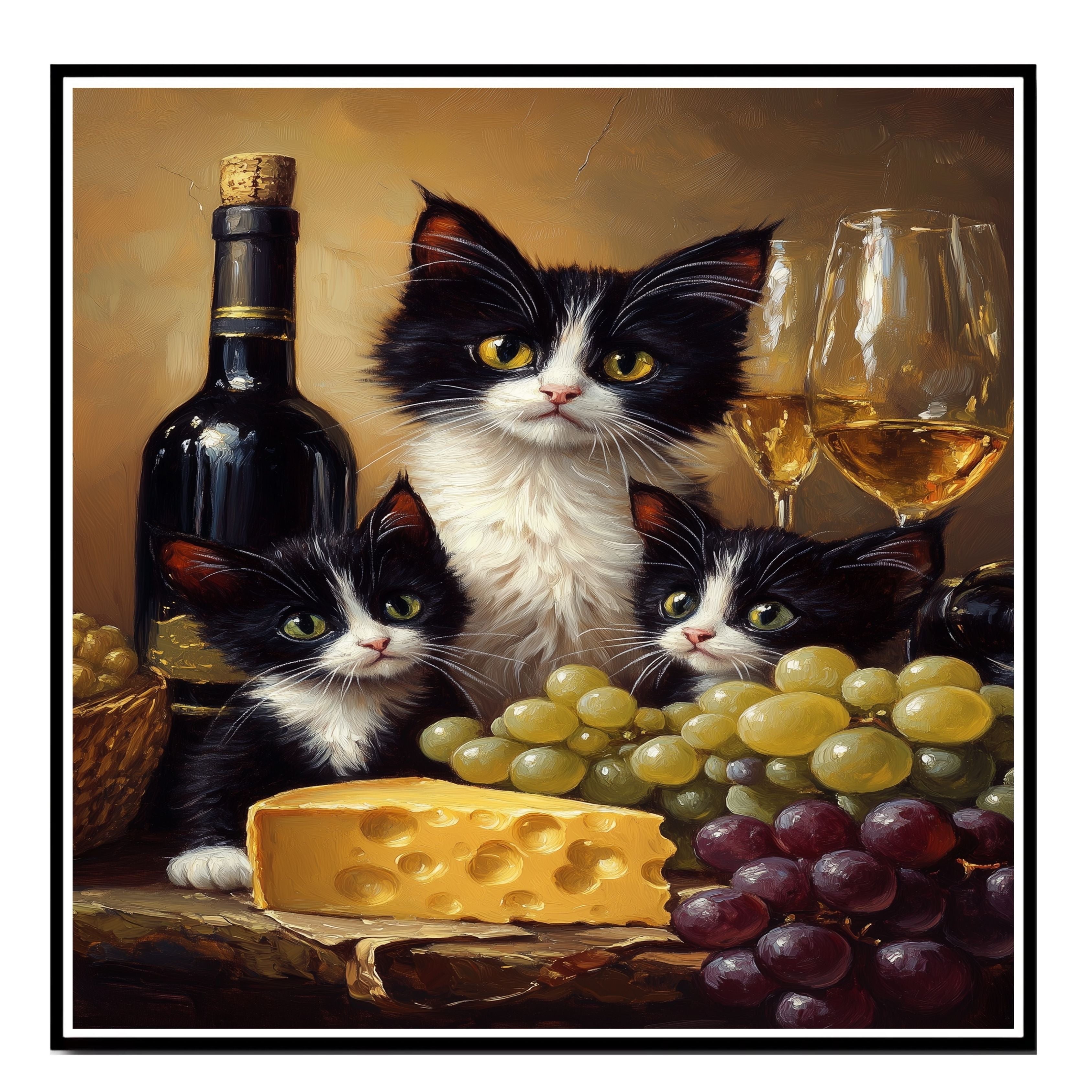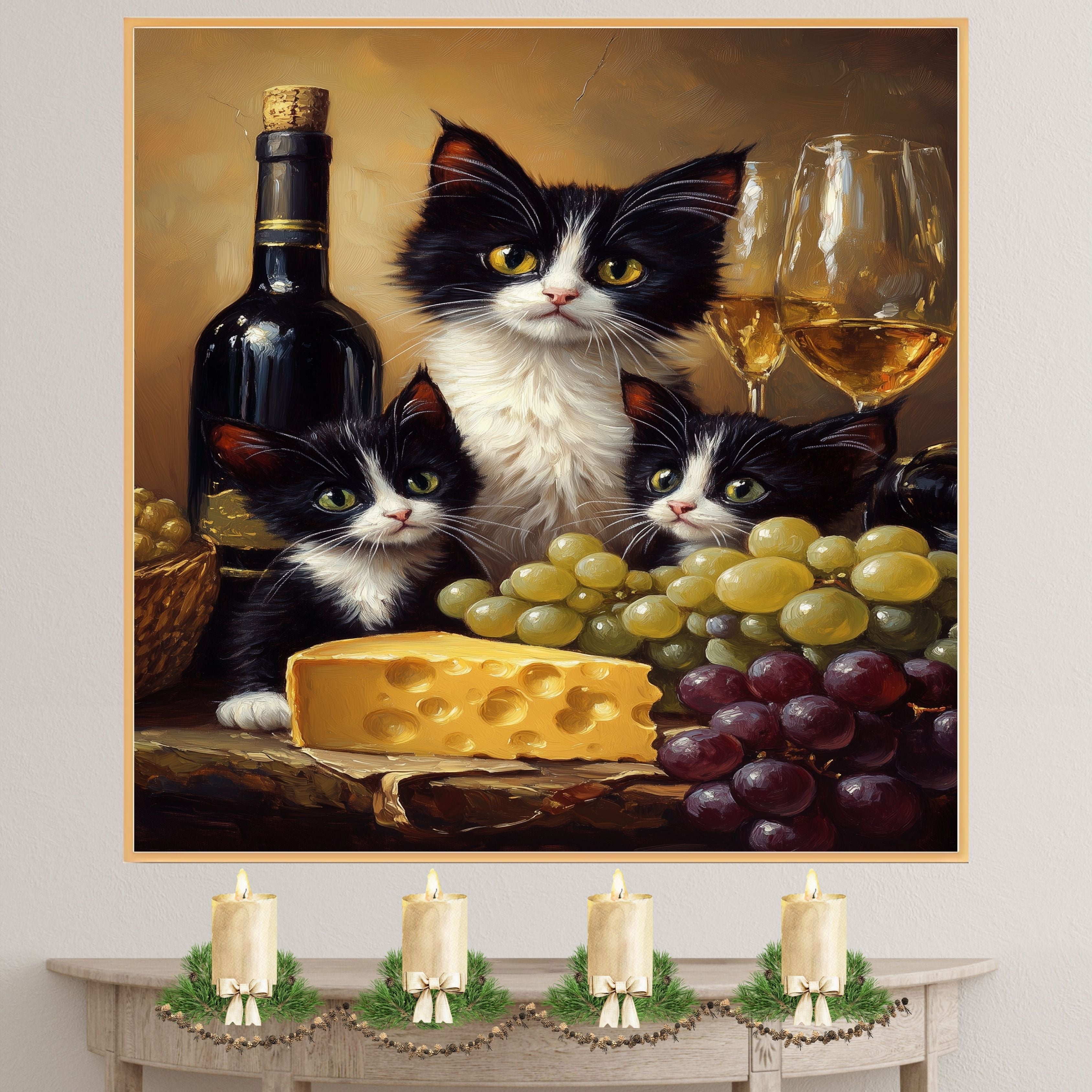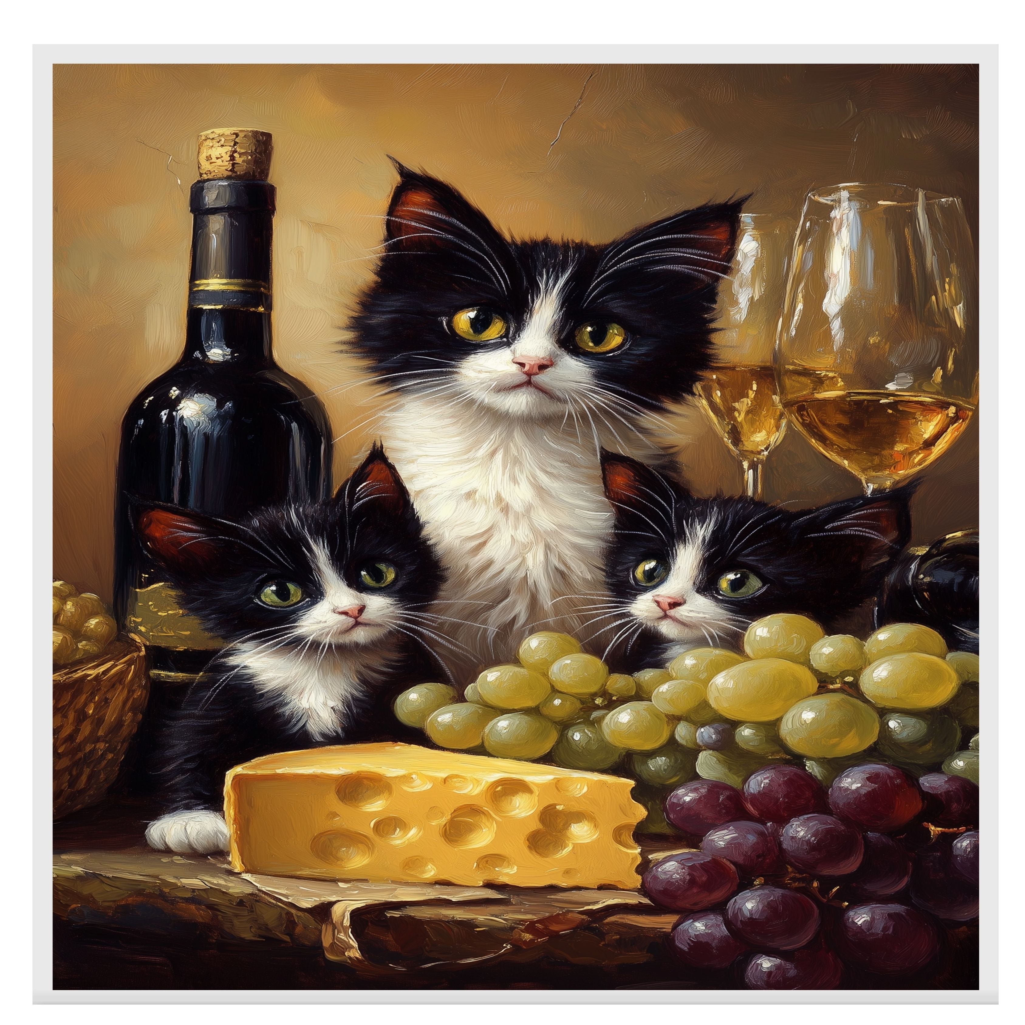 "Wine and Whiskers" Canvas showcases a tuxedo cat mom and her kittens playfully nestled among grapes and cheese, evoking the charm of a cozy vineyard gathering. With rich colors and a touch of feline mischief, this whimsical artwork is perfect for wine lovers and cat enthusiasts alike. Available on 1.5" thick canvas wrap, floating framed canvas, or flat rolled canvas.